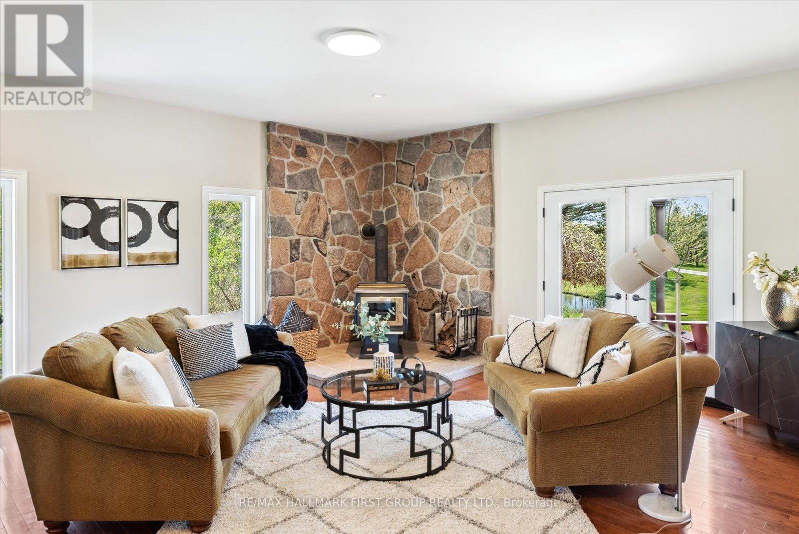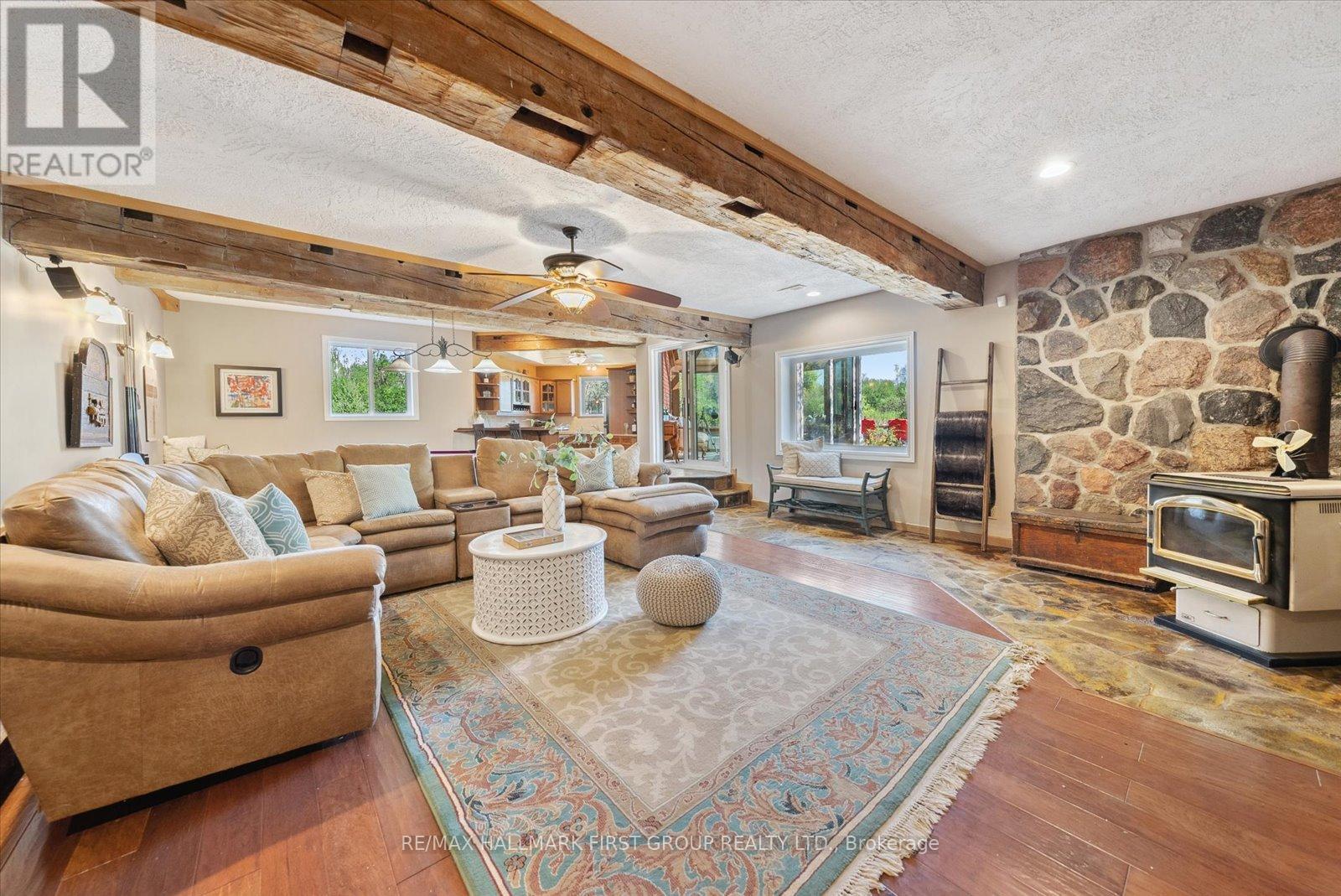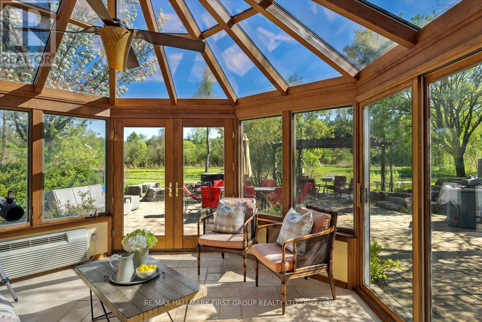 Welcome to refined country living on 15 acres of private, picturesque countryside in rural Pickering. This custom-built 4-bedroom estate offers nearly 6,000 sq ft of thoughtfully designed living space, blending warmth, comfort, and timeless luxury-just minutes from modern conveniences. The main floor is designed for both everyday living and effortless entertaining, featuring hardwood floors, expansive windows, and sweeping views of the surrounding landscape. The dining area is warm and inviting, while the chef-inspired kitchen boasts built-in double ovens, a gas cooktop on the centre island, and seamless flow into the sunken living room. A wood-burning fireplace anchors the space, creating a cozy yet elevated atmosphere. A private main-floor office with custom built-ins provides the perfect work-from-home retreat. Upstairs, the primary suite is a private escape, complete with a walk-in closet, spa-like ensuite with soaker tub and separate shower, and a walkout to a private balcony overlooking the fully stocked trout pond. Three additional bedrooms offer generous space for family, guests, or flexible use. The full walk-out basement extends the living space with a large recreation area, sound-proof media room, kitchenette, and access to a bright glass-enclosed sunroom-ideal for year-round enjoyment. Notable upgrades include a new high-efficiency heat pump, all new high-end Energy Star windows in a custom colour, stained fibreglass entry door system, garden doors, and retractable Mirage screens. The outdoor setting is beyond impressive, featuring an in-ground pool, Arctic Spa hot tub, electronic gated entry with outdoor lighting, apple trees, a fully stocked trout pond, and acres of open space to explore. Peaceful and private, yet only 7 minutes to the 407.A rare opportunity to enjoy space, privacy, and lifestyle-without compromise. (id:64974)