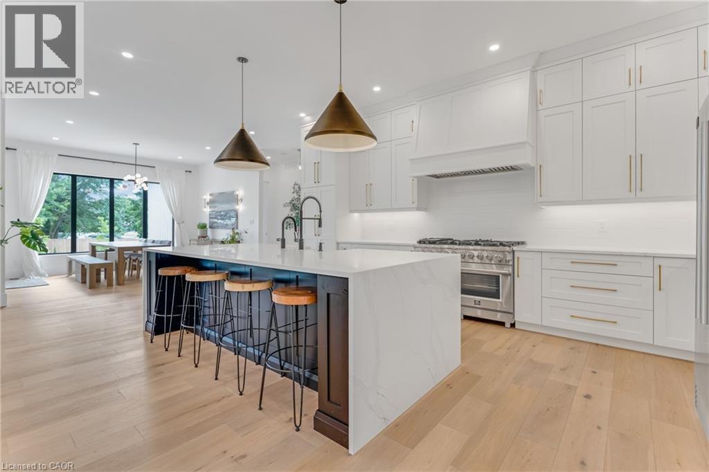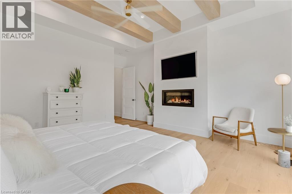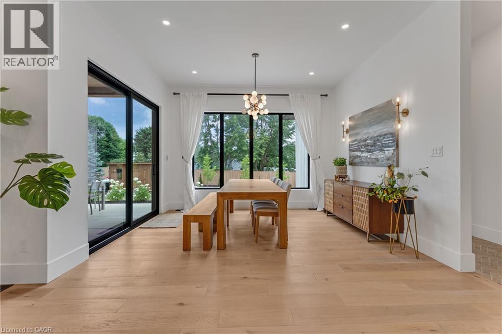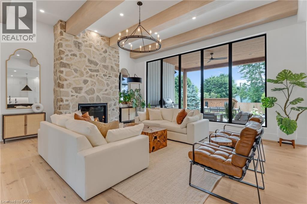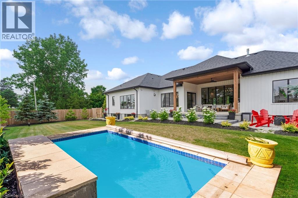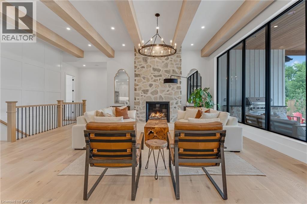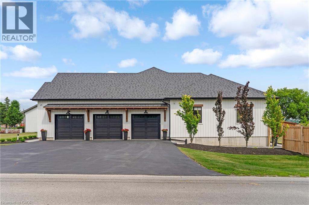 This exceptional custom bungalow, offers nearly 6,000 sq ft of finished living space on a serene country lot under an acre. With 6 bedrooms, 4 bathrooms, and an oversized 3-car garage with parking for 6 more, this home is ideal for large or multigenerational families. Inside, 10' ceilings throughout the main floor and a vaulted 12' great room with a floor-to-ceiling natural stone fireplace create an open, airy feel. White oak engineered hardwood spans both levels, adding warmth and elegance. The chef’s kitchen features a double waterfall island, top-of-the-line appliances, an oversized built-in fridge/freezer, and connects to a stunning walk-through pantry with second fridge, white oak counters, and custom cabinetry. The dining area leads to a covered concrete porch with built in natural stone outdoor BBQ, perfect for entertaining. The primary suite includes white oak beam accents, a gas fireplace, luxurious ensuite, custom walk-in closet, and direct access to the laundry room. A finished basement adds more bedrooms, bathrooms, and versatile space for guests, teens, or recreation. Large windows throughout flood the home with natural light. The backyard has plenty of room to add a pool. Located 12 Minutes to St,Jacobs, 13 Minutes to the Farmers Market, 14 Minutes to Waterloo and 22 Minutes to Kitchener. This is a rare opportunity to enjoy refined country living close to the city. (id:64974)
