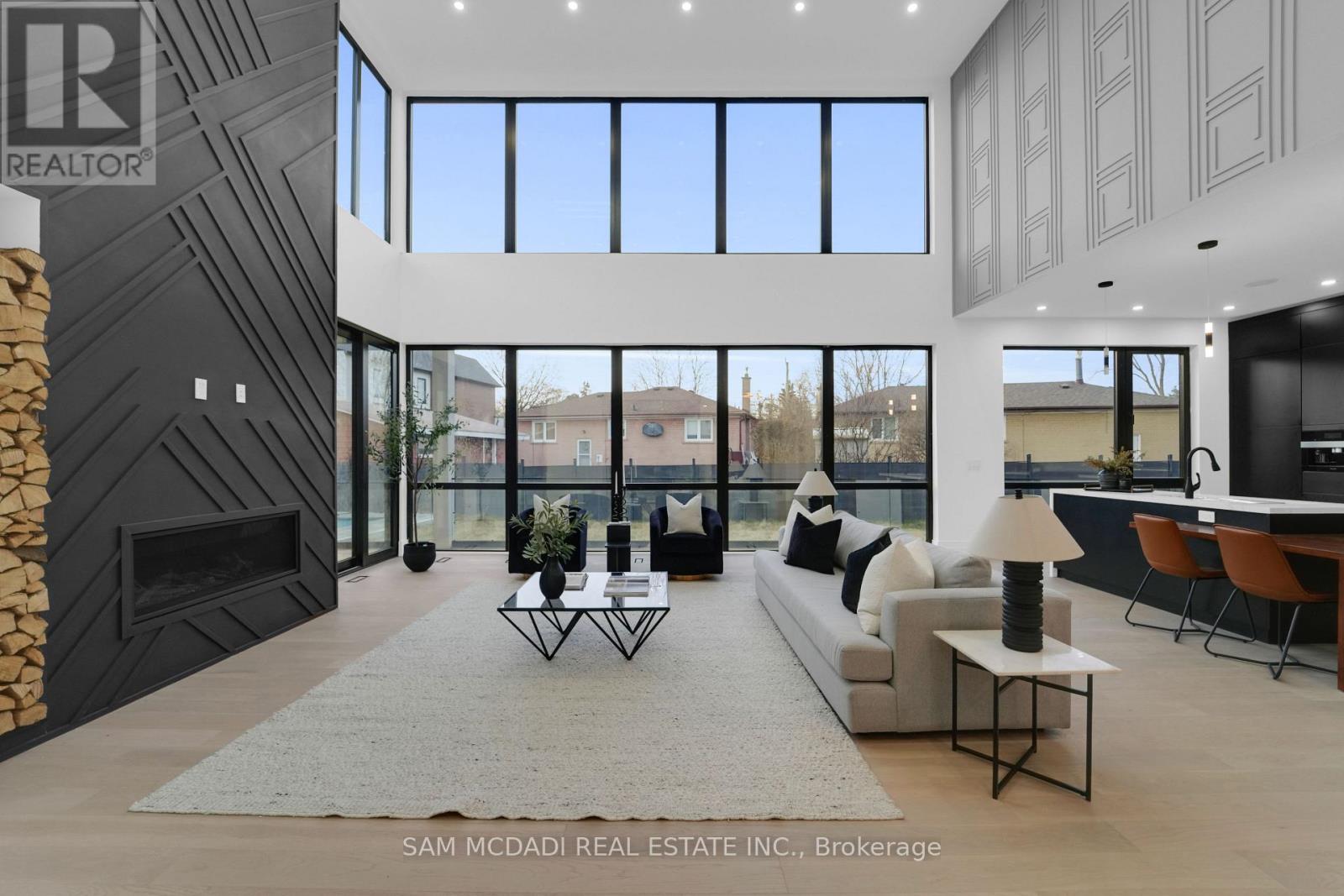 Discover the epitome of upscale living in this contemporary masterpiece nestled in the heart of West Oakville. Offering an exquisitely finished space, this custom home features 5 spacious bedrooms, 6 luxurious bathrooms, and thoughtful details throughout including a dedicated pet spa. Designed for both luxurious everyday living and unforgettable entertaining, the grand foyer flows seamlessly into a breathtaking open-concept living area. Soaring 23-foot floor-to-ceiling windows fill the space with natural light, framed by premium German hardware systems and high-end aluminum gliding windows. Engineered white oak hardwood floors and ambient pot lighting enhance the homes bright, airy atmosphere. The chef-inspired kitchen is a true showpiece, featuring top-of-the-line Dacor appliances, custom cabinetry, a sleek waterfall island, and generous space for casual meals or elegant dinner parties. Striking feature walls add architectural interest and modern artistry throughout the home. Relax by the Napoleon fireplaces in both the living and family rooms, or host guests comfortably in the main-floor bedroom complete with a private ensuite; ideal for visitors or multi-generational living. A Cambridge hydraulic elevator provides seamless, wheelchair-accessible access to all levels. Upstairs, you'll find three serene bedrooms, each with spa-like ensuite bathrooms and walk-in closets. The beautifully finished lower level features radiant heated floors, an oversized cold room, and a walkout to the backyard, offering even more space to unwind or entertain. Additional highlights include a Control4 automation system, central vacuum, walkout basement, swimming pool, aluminum and glass fencing, and so much more. Every detail of this home reflects exceptional craftsmanship and timeless contemporary elegance. (id:64974)