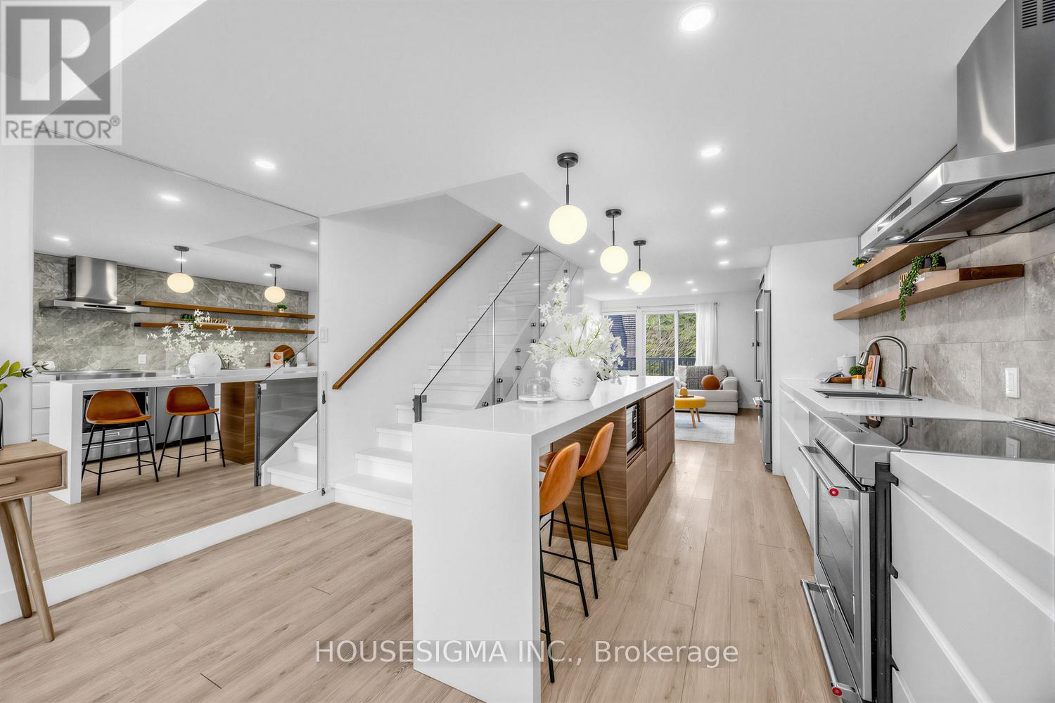This is downtown living done right. A fully upgraded, multi-level townhouse that checks every box, with the space, style, and amenities to match. The main floor is designed to impress, featuring a sleek open-concept layout with a modern kitchen, oversized island, and seamless flow into expansive living and dining areas, perfect for entertaining or everyday comfort. Custom built-ins and a statement fireplace elevate the space while maximizing storage. Step outside to your private balcony overlooking the outdoor pool and BBQ area below, your own summer escape in the city. The grounds are meticulously maintained year-round, with snow removal in winter and landscaping care throughout the summer months.Upstairs, versatile rooms and a flexible loft-style layout offer endless possibilities, ideal for a primary retreat, home office, gym, or additional living space. The second bedroom features a Murphy bed with built-in shelving, maximizing both space and functionality.This highly desirable, amenity-rich community has it all: indoor and outdoor pools, outdoor BBQ area and playground, fitness centre, four squash courts, hot tub, sauna, movie theatre, games room, and party room, 24-hour concierge and complimentary visitor parking, everything you need for active living and relaxation, year-round.Unbeatable location just steps from the streetcar, with convenient city rental bikes at your doorstep and the upcoming King-Bathurst subway station set to bring even greater connectivity to the neighbourhood. (id:64974)