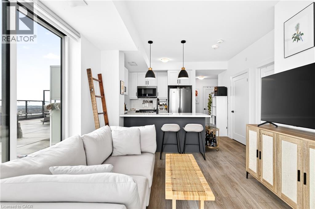 Stylish upgraded 2-bedroom, 1-bathroom condo for lease in the heart of Waterdown. This bright, carpet-free unit features an open-concept layout, a modern kitchen with quartz countertops, backsplash, and upgraded appliances, plus in-suite laundry and contemporary finishes throughout. Enjoy exceptional outdoor living with an oversized private terrace (28'11 x 20'5) plus a second balcony! Residents have access to premium amenities including rooftop terraces with BBQs, fitness centres, party rooms, and visitor parking. Ideally located close to highways, Aldershot GO Station, shopping, dining, parks, and top-rated schools. This is modern condo living at its best. (id:64974)