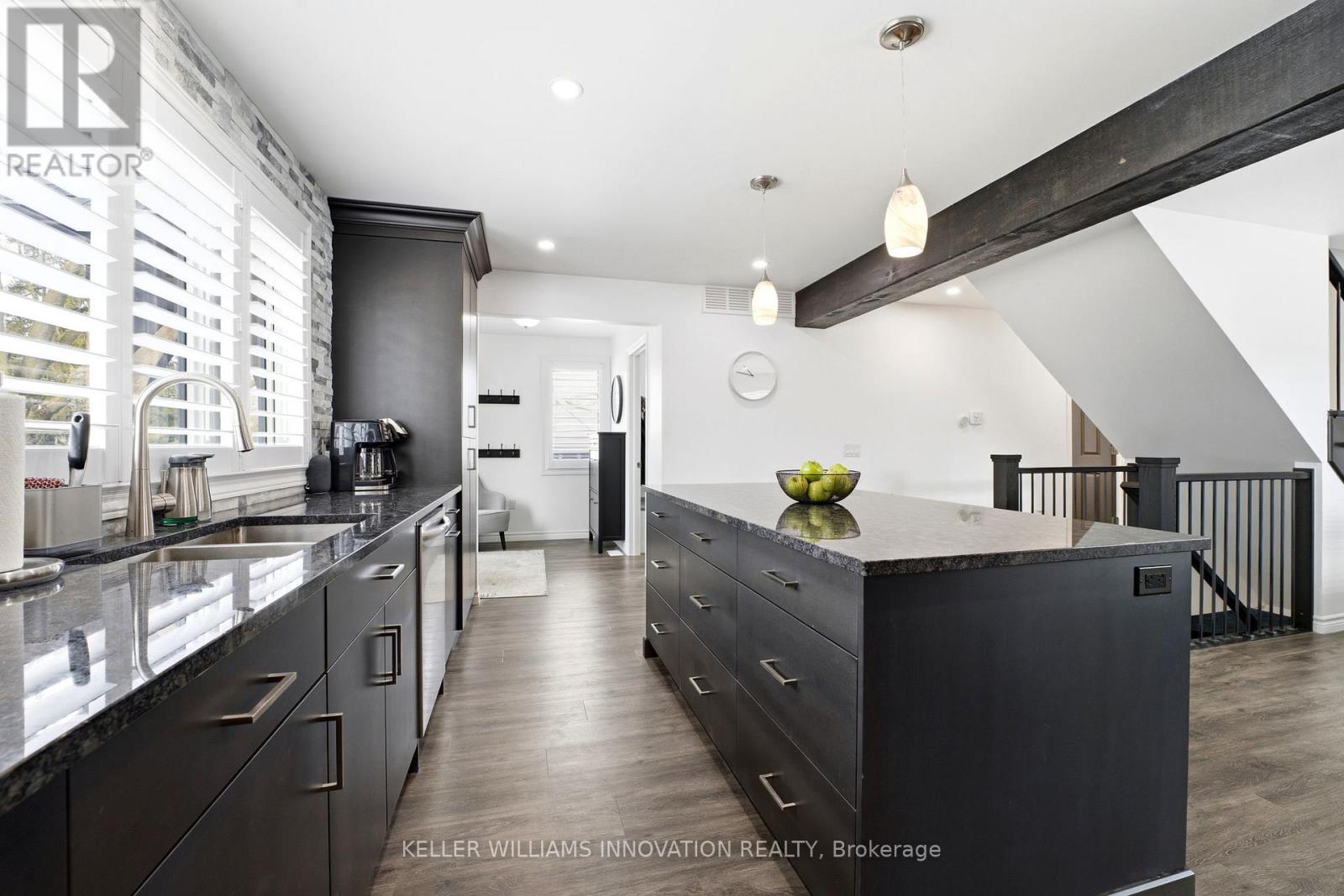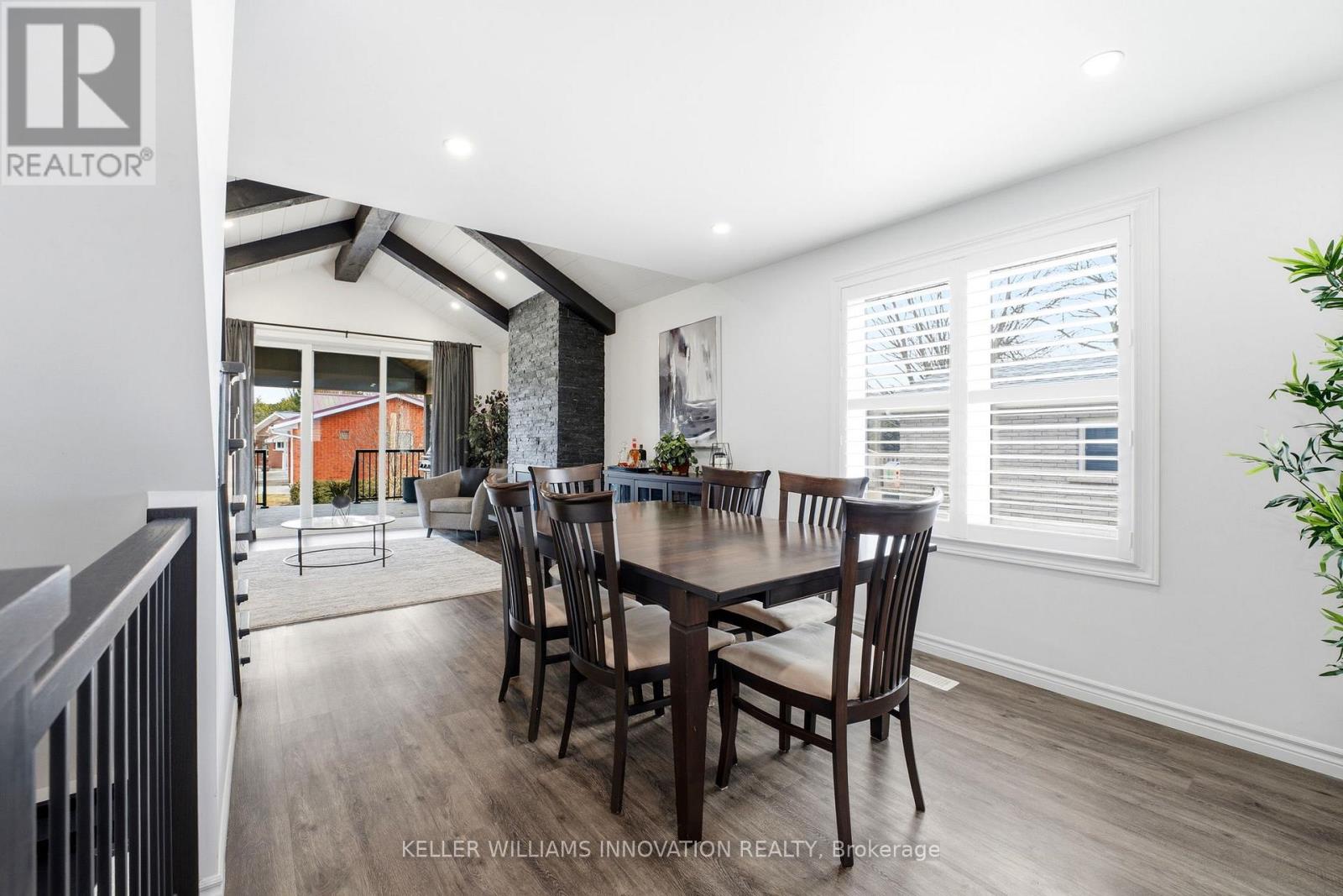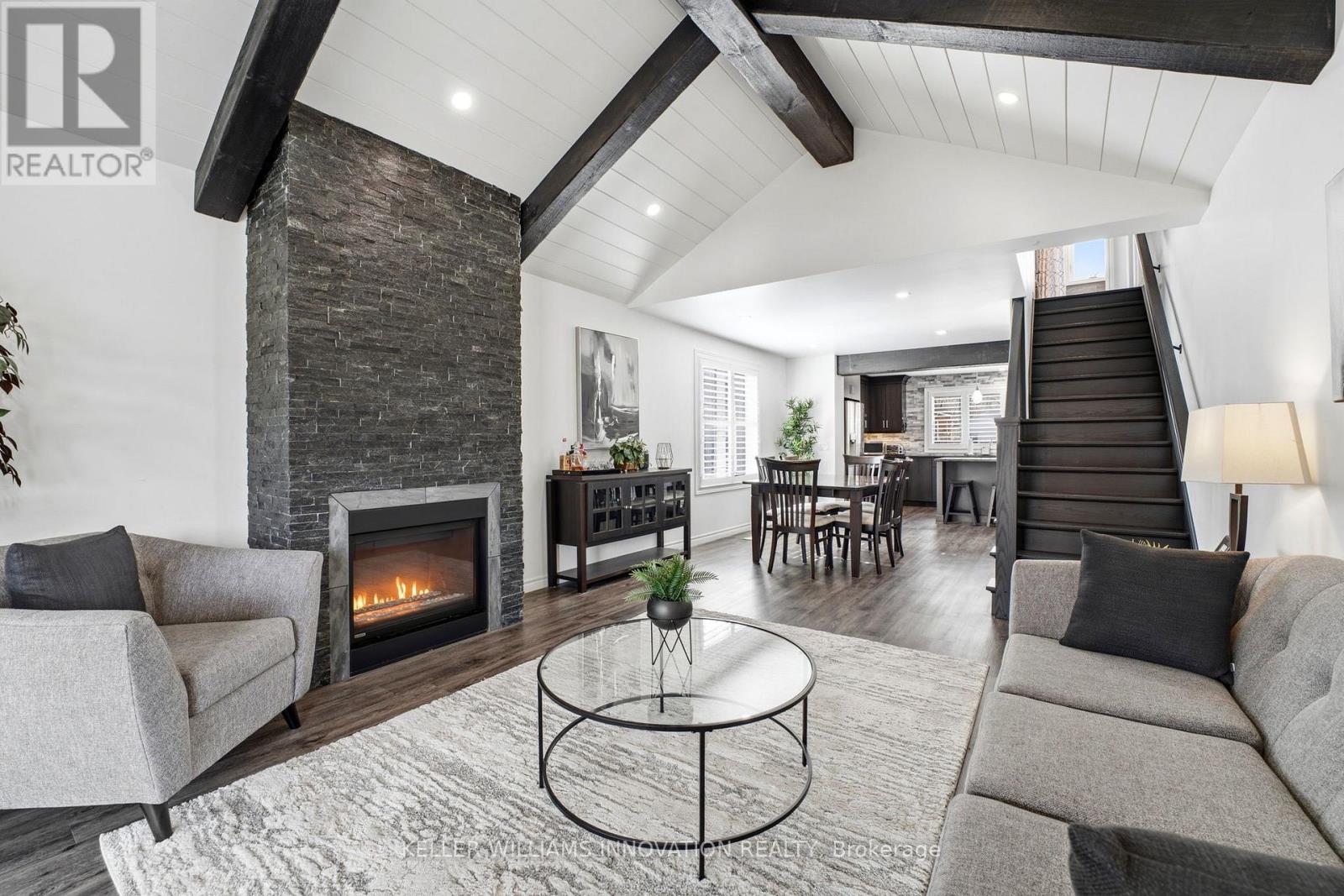 VAULTED CEILING, OVERSIZED KITCHEN, AMPLE BEDROOMS. Set on a quiet corner lot, this inviting home at 475 Campbell St W offers comfort, charm, and plenty of space for everyday living. A welcoming front porch sets the tone, while major updates-including the roof, windows, appliances, bathrooms, kitchen, and A/C-have all been completed within the past 5-6 years. Inside, the warm and cozy vaulted living room features exposed beams and a striking stone fireplace. Massive sliding doors open onto a covered back deck, creating a seamless blend of indoor and outdoor living. Large windows throughout the home fill the space with an abundance of natural light. The oversized kitchen is both functional and inviting, complete with ample cabinetry, an eat-in island, and newer appliances. Windows overlooking the front of the home add even more brightness to this central gathering space. A main floor bedroom and laundry add everyday convenience and flexibility. The second level offers two bedrooms and a full bathroom, and in total, the home features five bedrooms and three full bathrooms-ideal for a growing family or hosting guests. The finished basement includes two additional bedrooms, a spacious rec room, and a cozy electric fireplace, perfect for movie nights or relaxed weekends. Outside, the corner lot provides extra room and privacy on a peaceful street, along with a concrete driveway for added convenience. Located in Listowel, you're close to schools, trails, and local shops and restaurants-everything you need for comfortable small-town living. (id:64974)