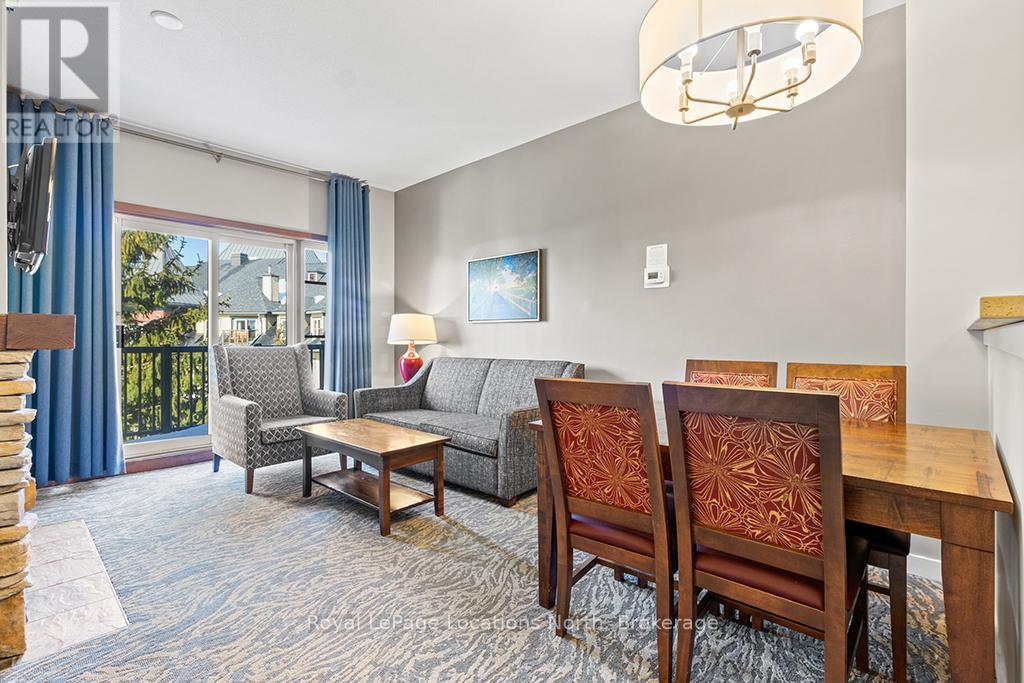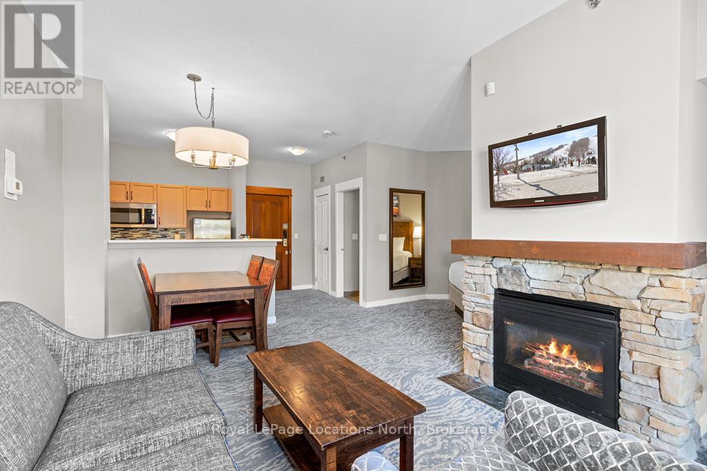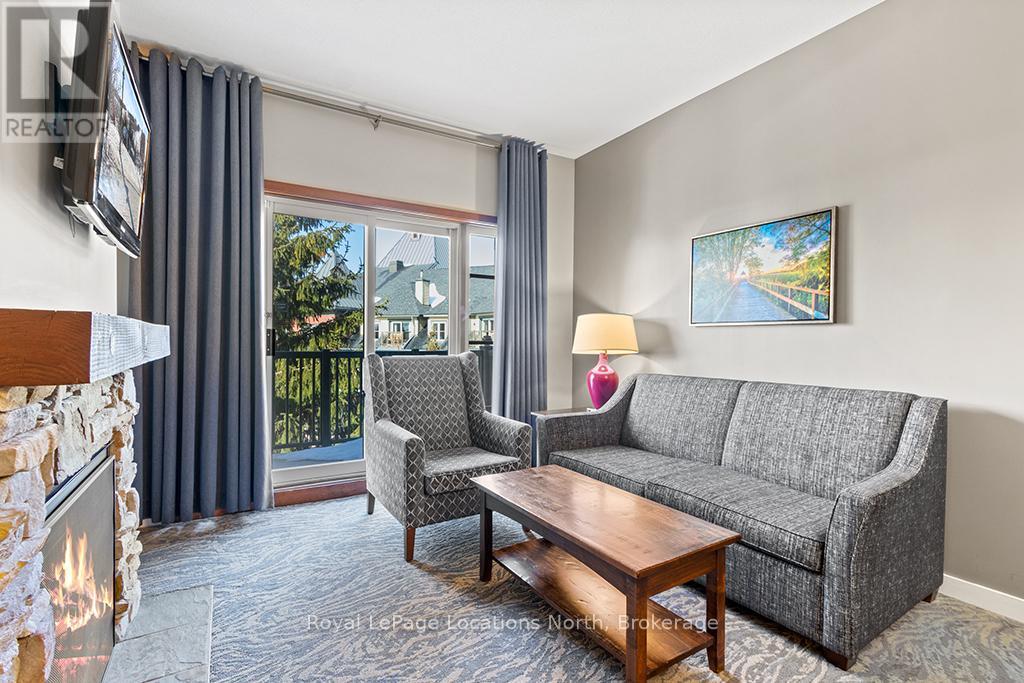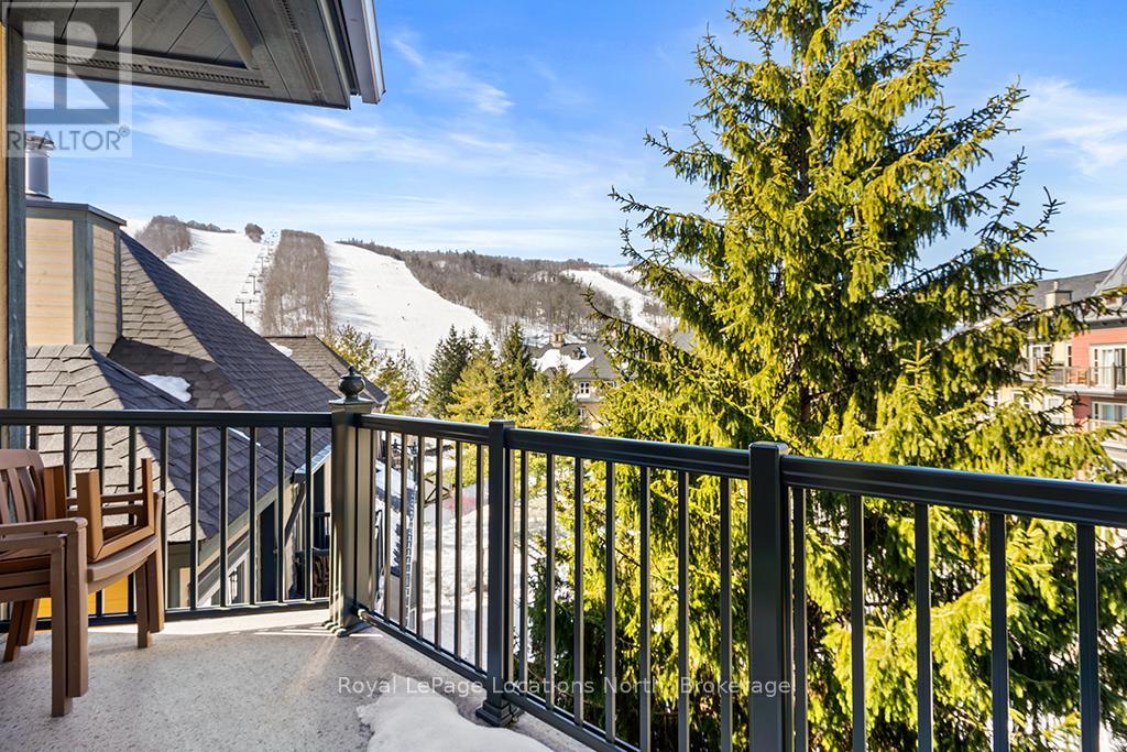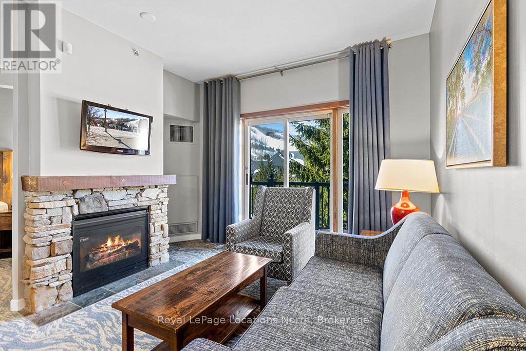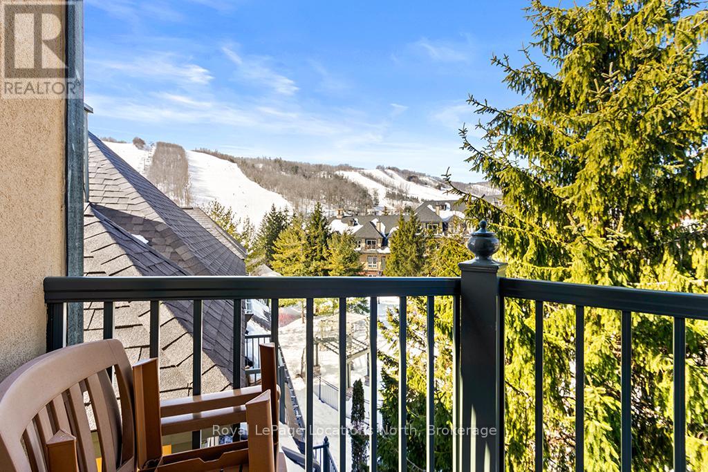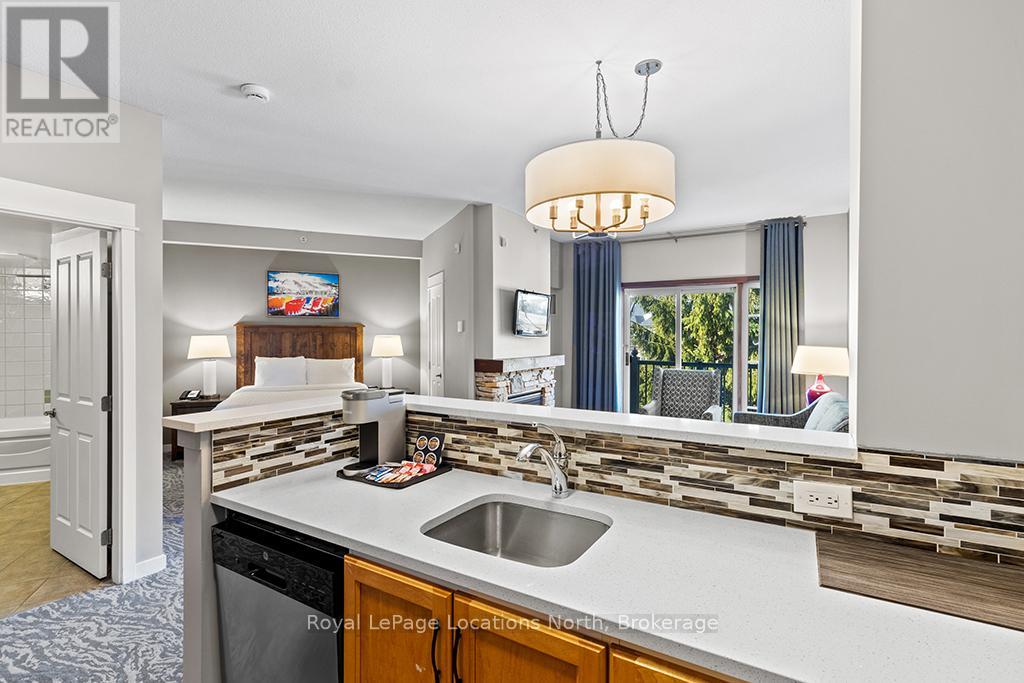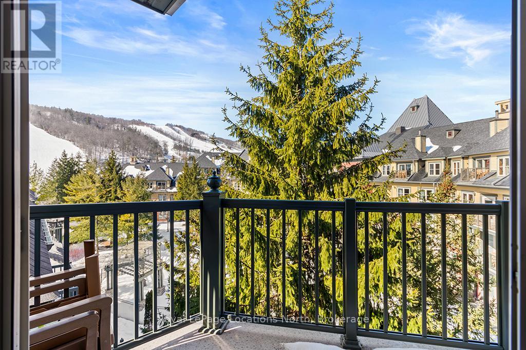 Enjoy the mountain view in this SUPERIOR OVERSIZED BACHELOR RESORT CONDOMINIUM. Welcome to the sought-after Alcove Model in The Grand Georgian, ideally located at the base of the ski slopes in Ontario's premier four-season resort, Blue Mountain Village. This fully furnished bachelor suite features a full kitchen and a thoughtfully designed alcove sleeping area that creates a spacious and functional layout. Enjoy your private balcony overlooking the courtyard - a perfect place to unwind after a day on the slopes or trails. The Grand Georgian offers outstanding amenities including a seasonal outdoor pool, two oversized year-round hot tubs, sauna, fitness room, owners' lounge, private ski locker, and two levels of heated underground parking. Ownership includes participation in the Blue Mountain Resort rental management program, providing income potential while allowing for personal use. Step outside to enjoy year-round activities, events, restaurants, cafés, boutique shopping, spa services, skiing, golfing, and mountain biking. Just minutes to Collingwood, Georgian Bay, marinas, and the sandy shores of Wasaga Beach. Condo fees include utilities. HST is applicable to the purchase price but may be deferred. BMVA fees apply, including a one-time membership fee of 2% + HST of the purchase price and an annual fee of $1.08 + HST per square foot. A TURNKEY OPPORTUNITY in one of Ontario's most desirable resort destinations. (id:64974)