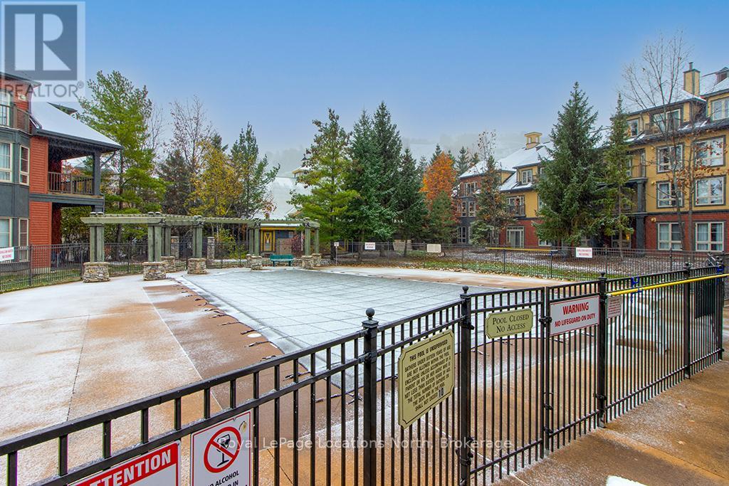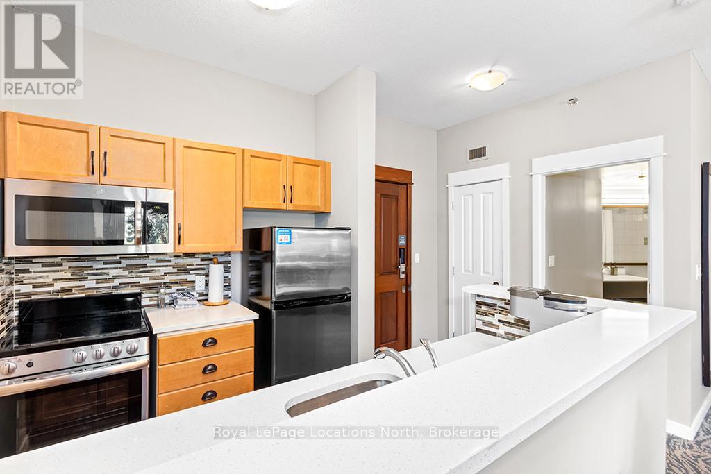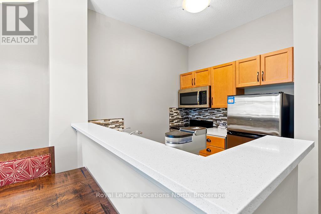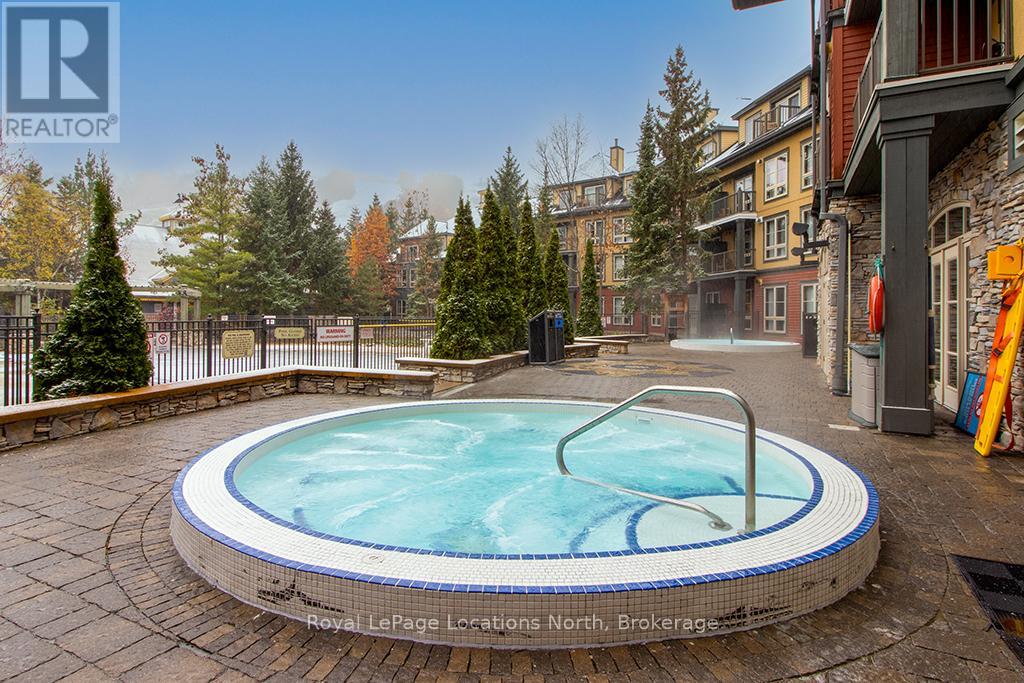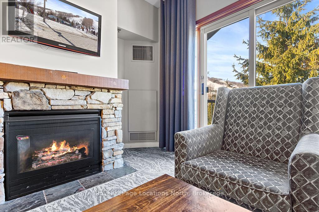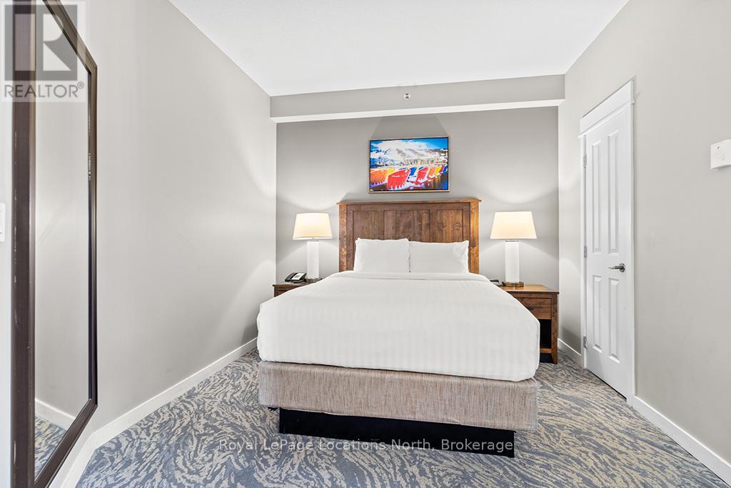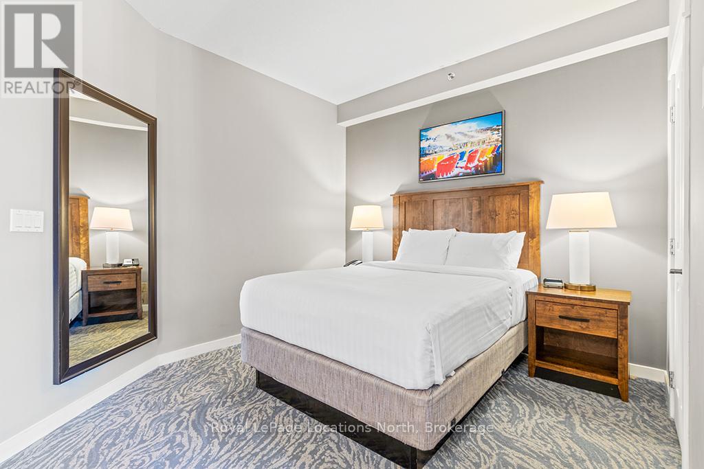 Enjoy the mountain view in this SUPERIOR OVERSIZED BACHELOR RESORT CONDOMINIUM. Welcome to the sought-after Alcove Model in The Grand Georgian, ideally located at the base of the ski slopes in Ontario's premier four-season resort, Blue Mountain Village. This fully furnished bachelor suite features a full kitchen and a thoughtfully designed alcove sleeping area that creates a spacious and functional layout. Enjoy your private balcony overlooking the courtyard - a perfect place to unwind after a day on the slopes or trails. The Grand Georgian offers outstanding amenities including a seasonal outdoor pool, two oversized year-round hot tubs, sauna, fitness room, owners' lounge, private ski locker, and two levels of heated underground parking. Ownership includes participation in the Blue Mountain Resort rental management program, providing income potential while allowing for personal use. Step outside to enjoy year-round activities, events, restaurants, cafés, boutique shopping, spa services, skiing, golfing, and mountain biking. Just minutes to Collingwood, Georgian Bay, marinas, and the sandy shores of Wasaga Beach. Condo fees include utilities. HST is applicable to the purchase price but may be deferred. BMVA fees apply, including a one-time membership fee of 2% + HST of the purchase price and an annual fee of $1.08 + HST per square foot. A TURNKEY OPPORTUNITY in one of Ontario's most desirable resort destinations. (id:64974)