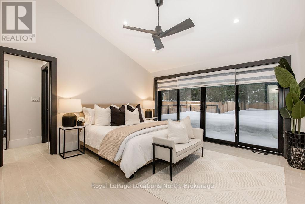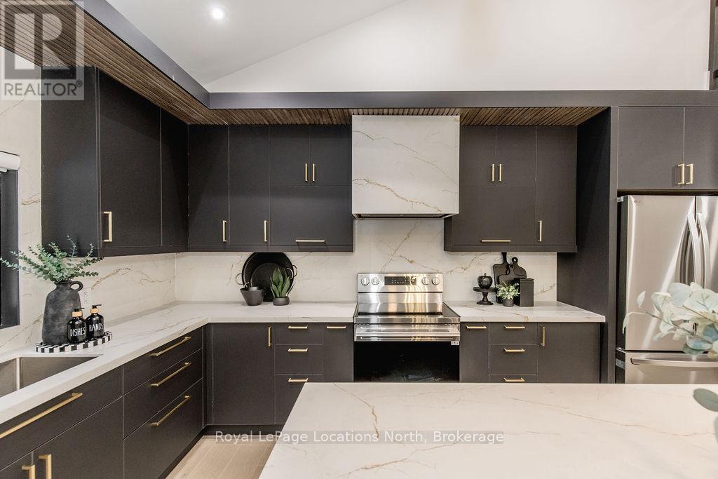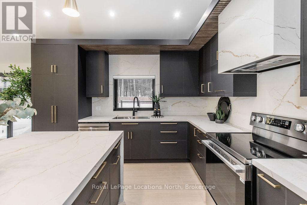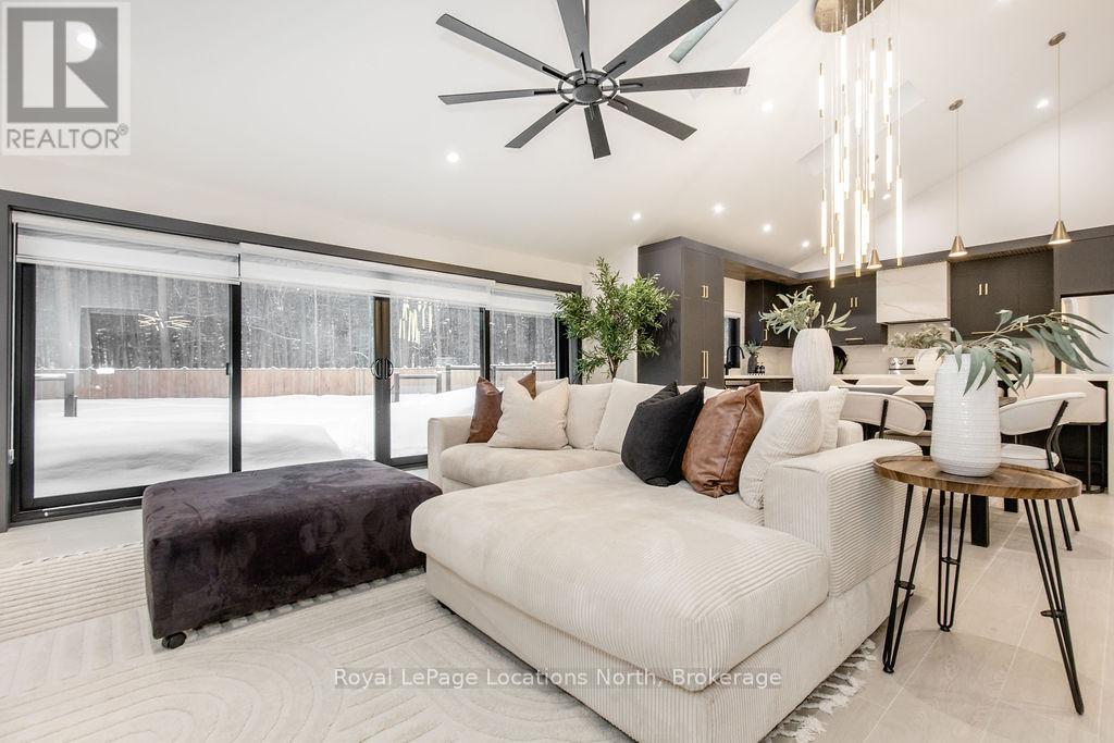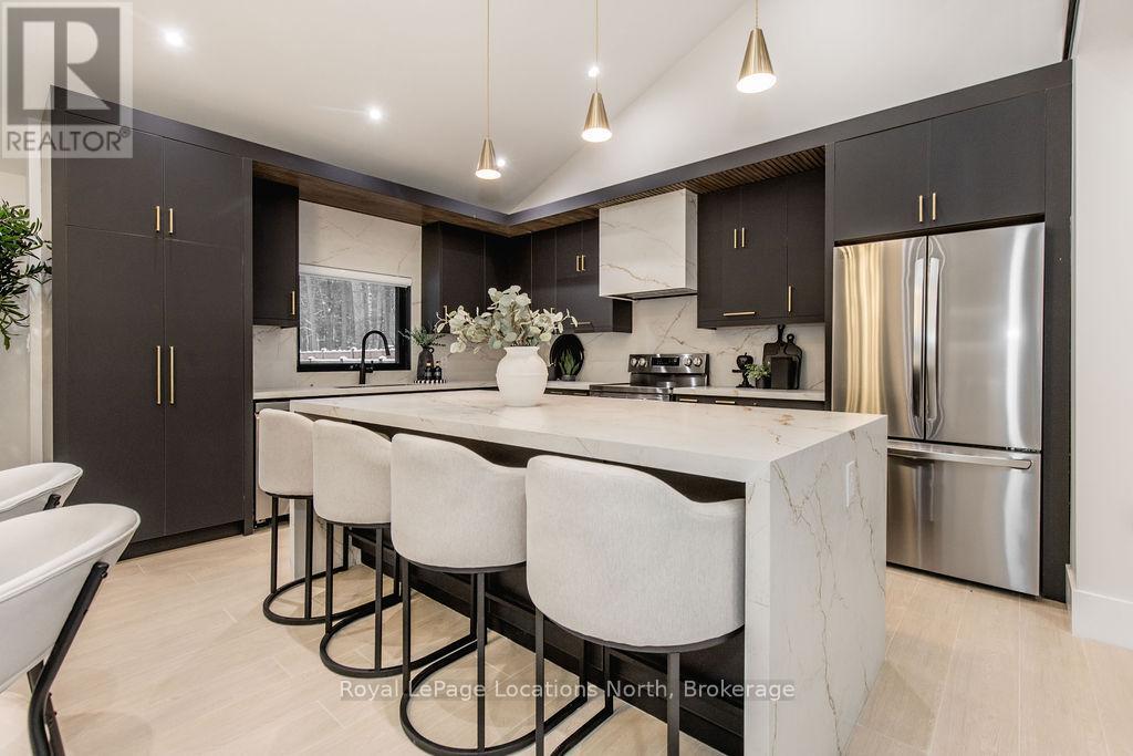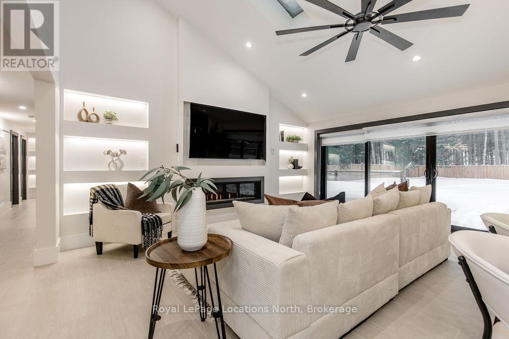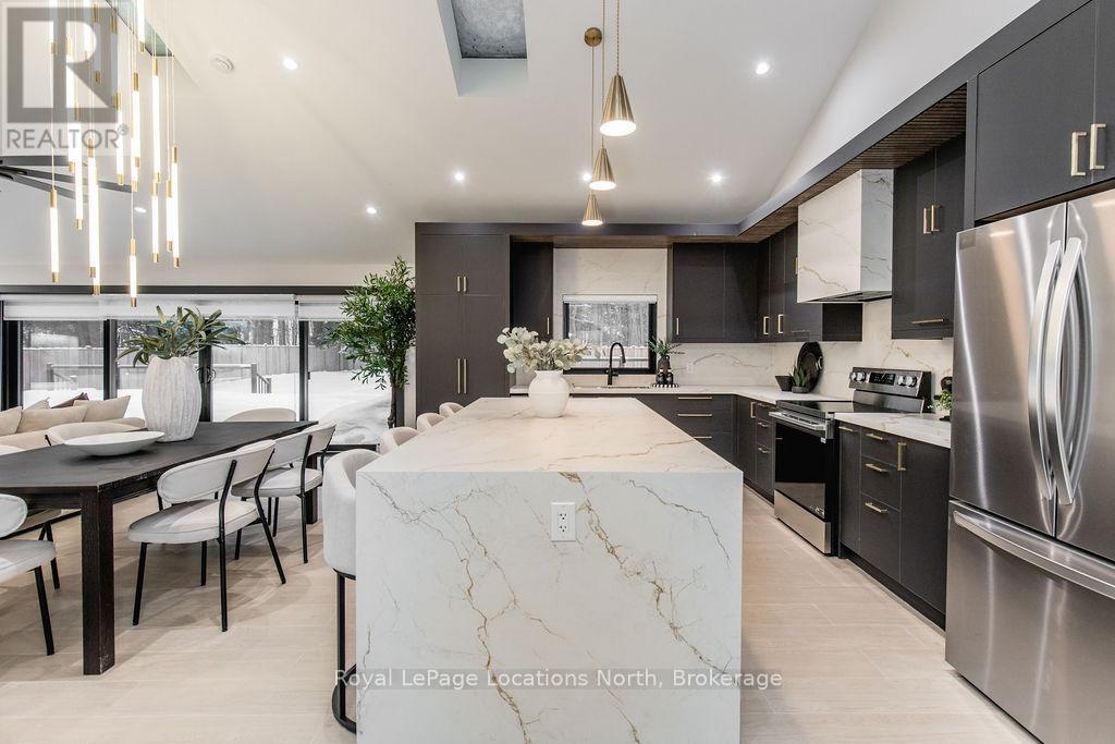 This true ranch-style bungalow offers effortless, stair-free living with oversized sliding glass doors stretching across the family room, framing views of a large, fully fenced backyard that backs directly onto 56 acres of Crown land. With no rear neighbours, this is a rare setting where privacy, nature, and everyday convenience meet.The home offers over 2,300 sqft of living space on a generous 100' x 200' lot. An oversized garage with inside entry, paired with an open concept layout, makes this an ideal forever home. Outdoor enthusiasts will love the location- snowmobile trails just down the road, Marlwood Golf Course across the street, nearby hiking/snowshoeing trails and the world's longest freshwater beach only a 7-min drive. The primary bedroom is a true retreat, featuring vaulted ceilings, a cozy fireplace, sliding doors leading directly to the rear deck, and a high-end ensuite complete with a glass shower, floating soaker tub, and walk-in closet.The home has undergone extensive renovations throughout, including a brand new roof, soffits, fascia, exterior siding, windows, garage doors, and a new high-efficiency furnace with in-floor heating. Electrical, lighting, pot lights, and all interior flooring have been fully updated.The renovated kitchen showcases quartz countertops/backsplash, oversized island, custom cabinetry with pull-out organizers, a dedicated coffee bar, a built-in full-size wine fridge, and all new stainless steel appliances. Every bathroom has been fully renovated with modern fixtures and finishes.Upgrades include expansive new rear sliding doors, custom blinds, upgraded main-floor laundry with inside entry to garage, loft with a full bathroom and second family room with new TVs, an updated fireplace with custom built-ins, cathedral ceilings, skylights, and brand new tiered decks spanning the entire back of the home. The property is fully fenced with custom stone walkways, creating a private outdoor retreat you'll enjoy year-round. (id:64974)