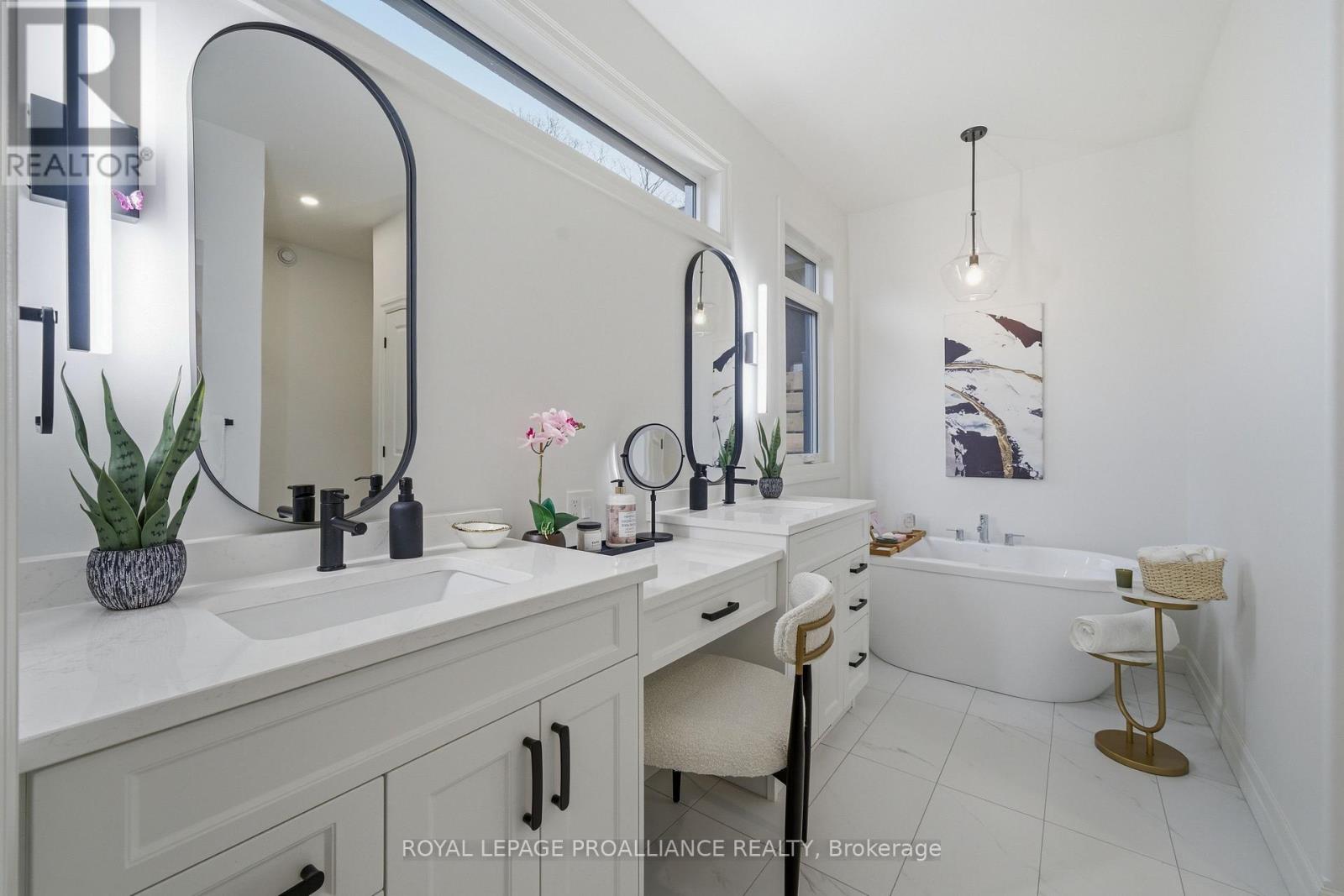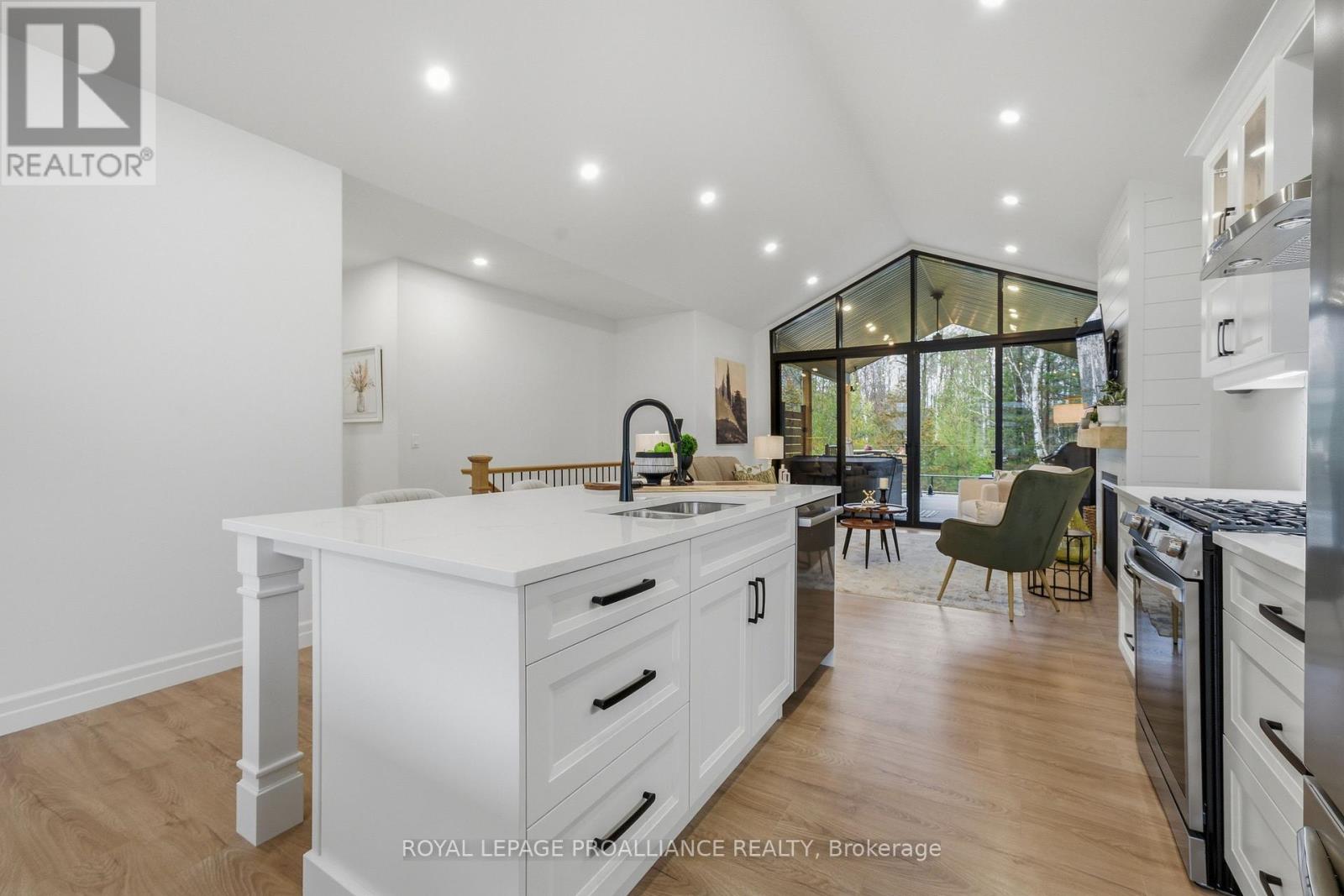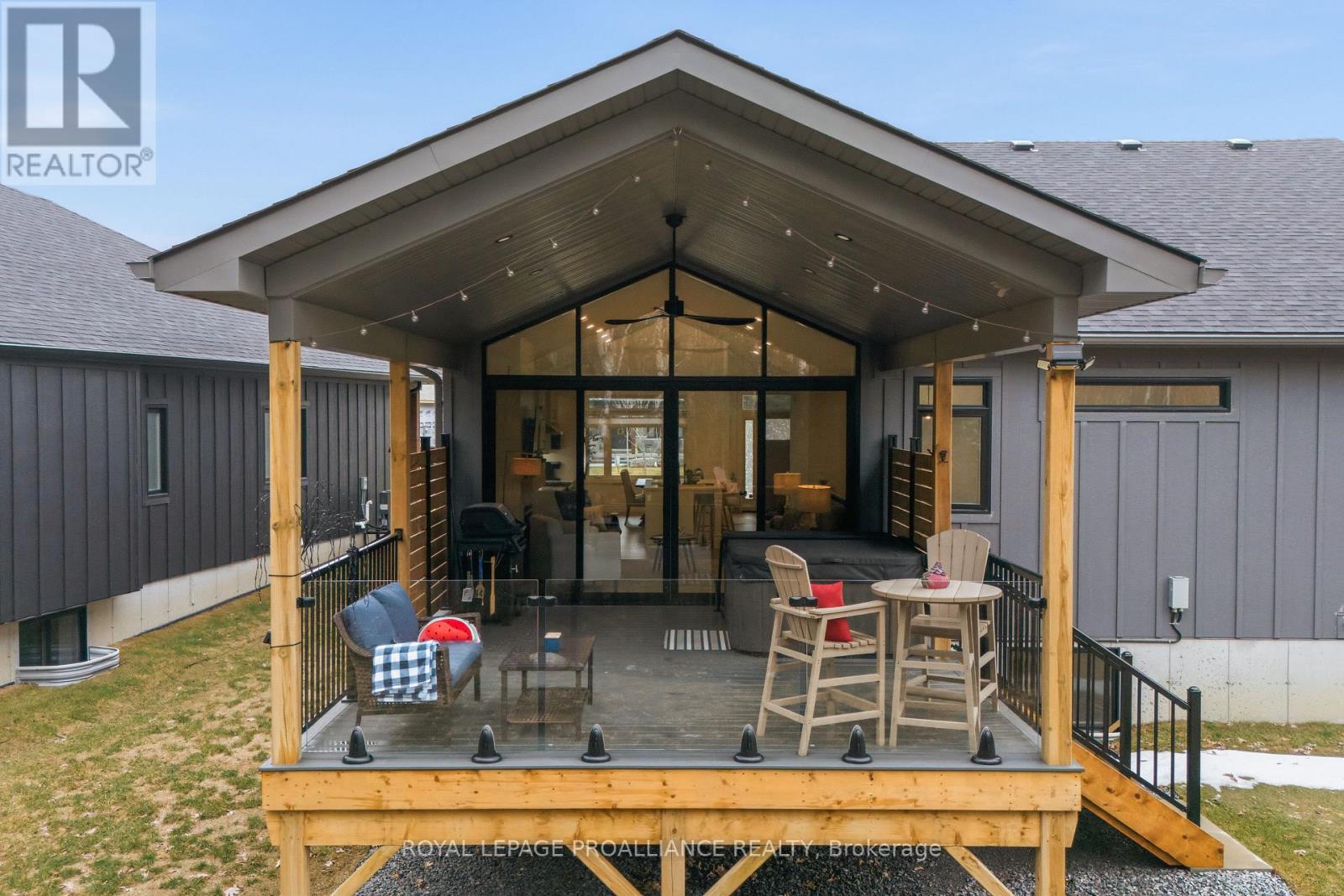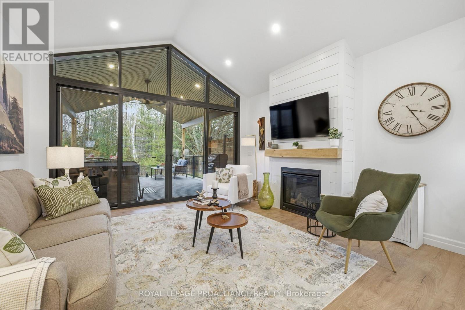 Welcome to 48 Deerview Drive in Quinte West-where modern comfort meets a peaceful, nature-inspired setting just minutes from the 401. Perfectly positioned in a sought-after neighbourhood west of Trenton, this newer home offers full city services, including Bell Fibe, while delivering a rare sense of privacy with protected green space behind-no rear neighbours, just trees and tranquility. Step inside and you're immediately drawn to the stunning wall of windows that frames the backyard like artwork, filling the home with natural light. The open-concept main floor features vaulted ceilings, upgraded flooring, and a warm, inviting living space anchored by a gas fireplace. The kitchen and living area flow seamlessly, ideal for both everyday living and entertaining. Designed with comfort in mind, the home includes a heated ensuite bathroom floor, a main floor office (or optional second bedroom), and a spacious primary retreat. Downstairs, the fully finished basement expands your living space with a large rec room, second gas fireplace, additional bedroom, and full bathroom-perfect for guests or extended family visits. Outdoor living is just as impressive, with composite decking, sleek glass railings with built-in blue lighting, a hot tub, and a beautifully landscaped yard featuring an in-ground sprinkler system in the front yard. This is a home for those looking to simplify without compromise-offering style, function, and a peaceful backdrop to enjoy for years to come. (id:64974)