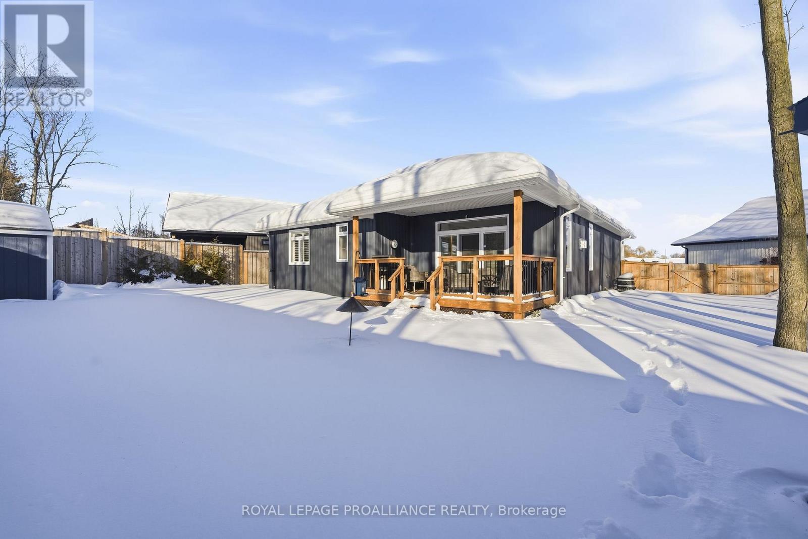 Welcome to 48 Schmidt Way, a beautifully maintained 3 Bed, 2 Bath, 1658sf bungalow set on a premium oversized, pie-shaped cul de sac lot. Curb appeal shines with stone accents and board & batten vinyl siding, all just minutes from shopping, parks and everyday amenities. Step inside from the covered front porch into a welcoming foyer that leads to a stunning kitchen/dining area. Enjoy quartz countertops, stylish backsplash & lighting, ample pantry storage with slide out drawers, newer appliances and large island. Open living area features a cozy gas fireplace, ideal for relaxing evenings, and oversized patio doors with a transom window that open to a generous covered deck-an ideal space for entertaining and BBQing year-round while overlooking the expansive backyard. The fully fenced backyard offers exceptional privacy with mature trees, lush landscaping, paved walkway to front driveway and a new large storage shed-perfect for gardening tools and extra outdoor storage. The main floor offers a functional and flexible layout with three bedrooms and two bathrooms. Bedrooms easily serve as a den or home office with fibre internet available. Primary suite includes a WI closet and a well-appointed ensuite with double quartz vanity and a WI glass/tile shower. Main floor laundry features custom cabinetry and convenient access to the oversized double car garage, which is fully insulated, drywalled and heated. Lower level provides excellent potential for future living space, storage or a hobby area. Additional upgrades and features include 9ft ceilings, California blinds, leaf guards, quality hand-scraped laminate floors, owned On Demand Hot Water. Located in a friendly, walkable neighbourhood close to parks, downtown, conservation trails, the Bay of Quinte and a short drive to Prince Edward County's wineries, breweries & sandy beaches - this home offers comfort, convenience and lifestyle in one exceptional package...New construction feel, with LOADS of enhanced features! (id:64974)