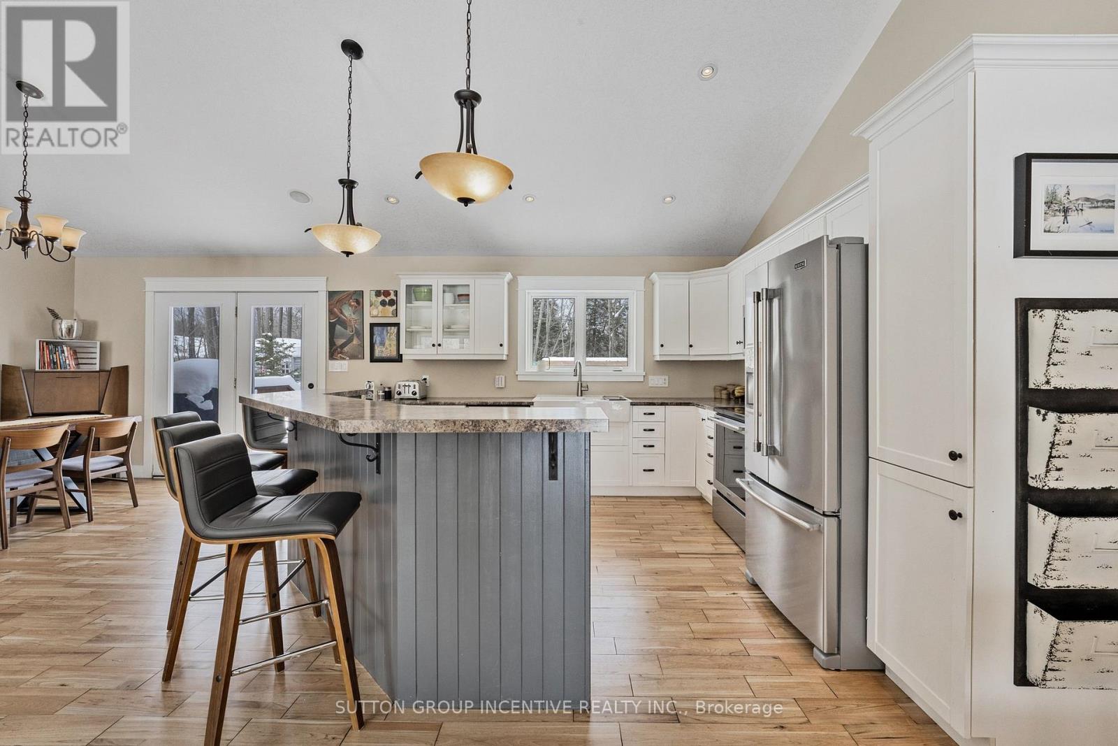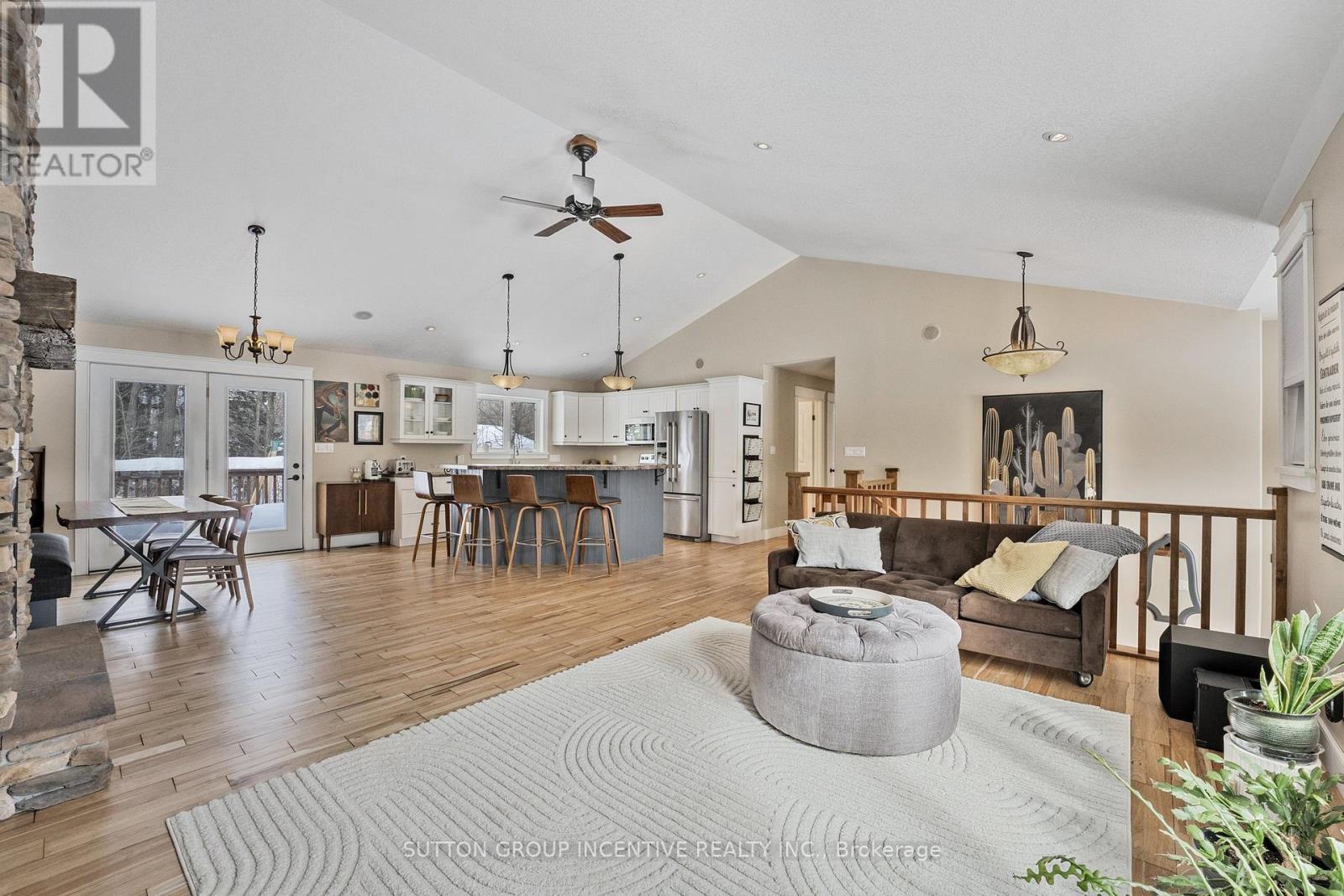 This stunning, custom-built raised bungalow boasts 4 spacious bedrooms & 2 bathrooms, offering over 2500 sq ft of thoughtfully designed living space. Set on a premium, beautifully landscaped estate lot in the scenic Tiny Township, this home is a true gem. From the moment you enter, the attention to detail is evident, with a seamless blend of modern decor & functionality throughout. The main level features an open-concept layout, where a striking floor-to-ceiling gas fireplace takes center stage in the expansive living area, complemented by sleek pot-lights & soaring vaulted ceilings. The cozy family room provides a perfect retreat, while the kitchen, complete with a large island, adds a touch of elegance. A bright & airy breakfast nook leads out to an enormous deck, perfect for outdoor dining or relaxing, with views of the private, treed backyard, offering peace & tranquility. The primary bedroom is a private sanctuary, featuring a walk-in closet & semi-ensuite privileges. Two additional well-sized bedrooms & a stylish 4-pc bathroom with a separate shower & luxurious soaker tub provide ample space for family and guests. Hardwood floors flow seamlessly throughout the main level, enhancing the homes elegant feel. On the lower level, you'll find a massive rec room ideal for entertaining, along with a 4th bedroom, a convenient laundry room, & a 3-pc bathroom. The mudroom, with its separate entrance leading to the garage, adds both functionality & convenience. The garage itself is fully equipped with a storage loft, two man doors, two garage door openers, & hot and cold water. Additional features include central vac, central air conditioning, a sprinkler system, & built-in Felton speakers on the main level. A natural gas line is ready for your BBQ, & soffit lighting adds a charming touch to the exterior. All of this is ideally located just moments from the beaches & breathtaking shores of Georgian Bay, offering the perfect blend of privacy, luxury, & nature. (id:64974)