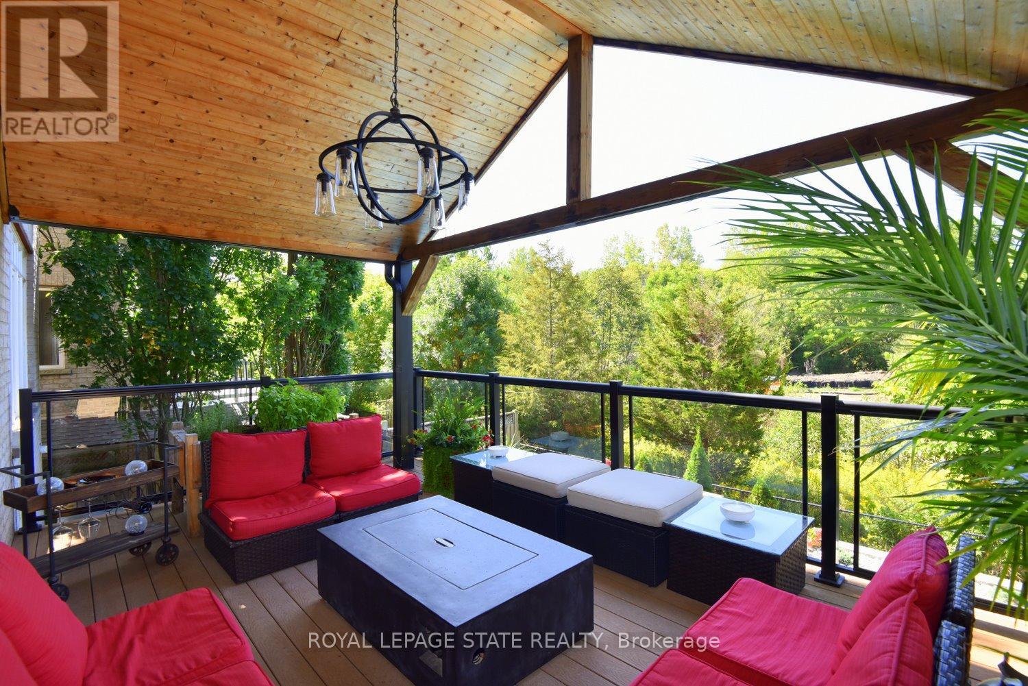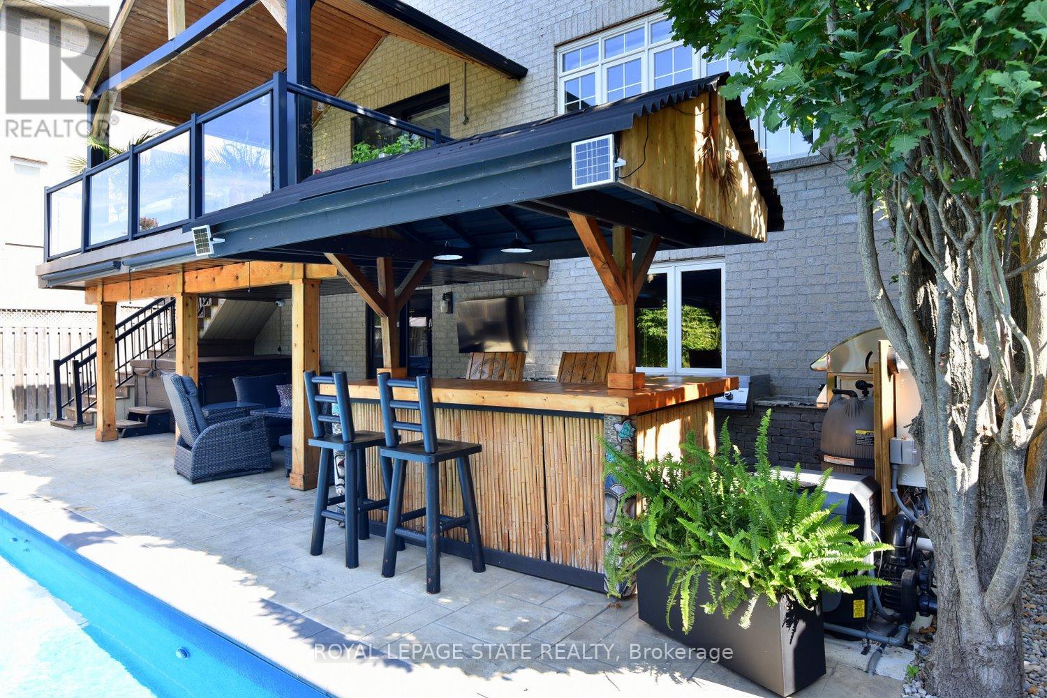 Stunning 4-bed home in Ancaster's coveted Parkview Heights with an incredible backyard oasis featuring a heated inground saltwater pool. hot tub, tiki bar, covered decks, and sunny patios overlooking greenspace, pond, and woods. Inside, a soaring foyer leads to the chef's kitchen with maple cabinetry, gas cooktop, double wall ovens, pantry, and 8' island, open to the breakfast area and covered deck. The family room offers a modern gas fireplace, built-ins, hardwood floors, and automated blinds. Dining room with tray ceiling, office with California shutters, laundry, and powder room complete the main level. The spacious principal suite includes a walk-in closet and ensuite with glass shower, separate tub, and double vanities plus serene views. Three additional bedrooms and full bath serve the family. The finished walk-out basement adds a second kitchen, large family room with gas fireplace, gym area, 3-pc bath, and storage. Outdoor living shines with multiple covered spaces and a resort-style pool and hot tub. A rare offering in a premium location .RSA Don't delay, arrange your viewing today! (id:64974)