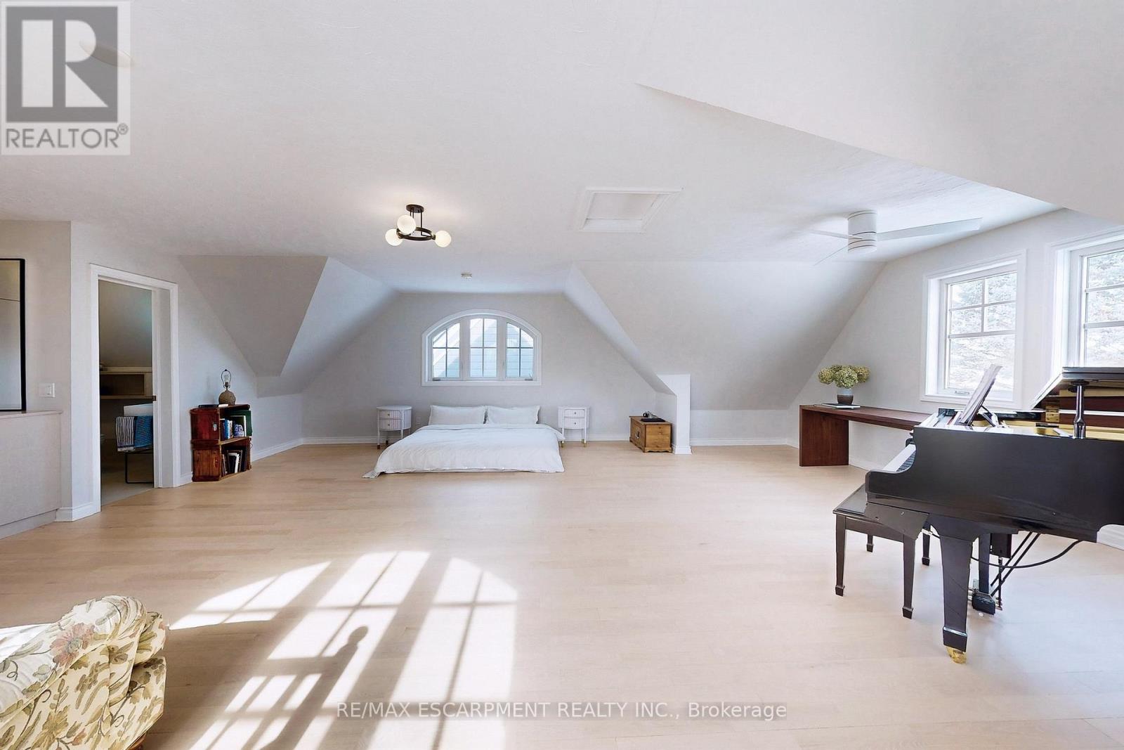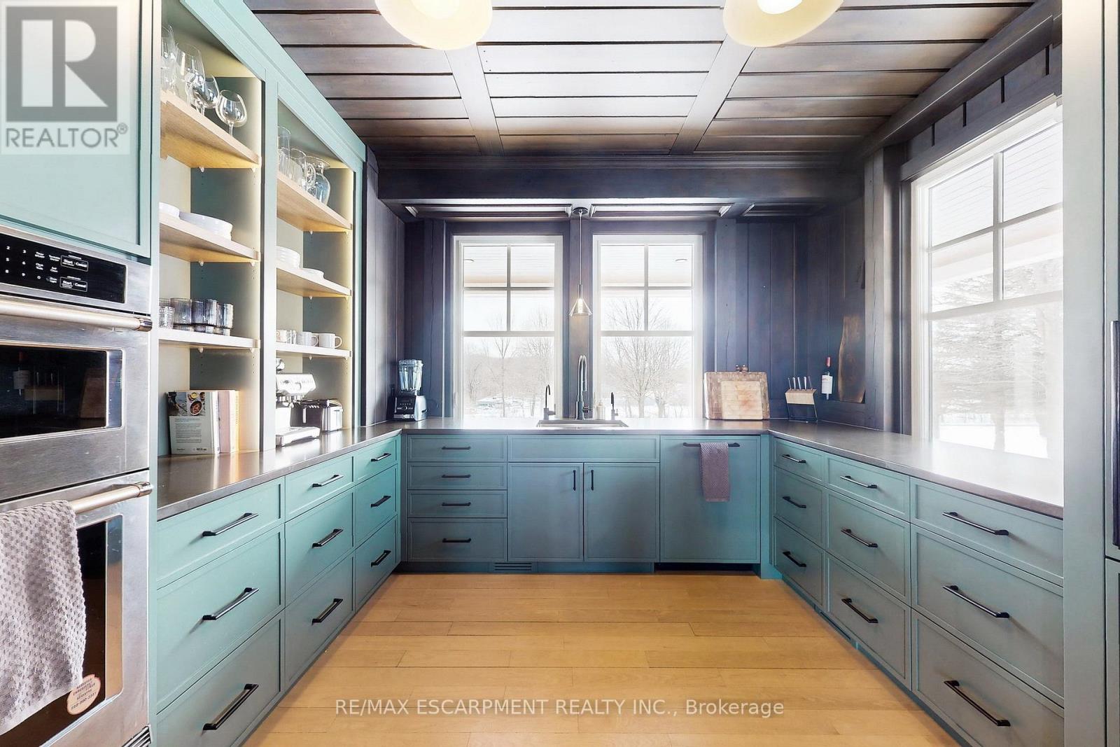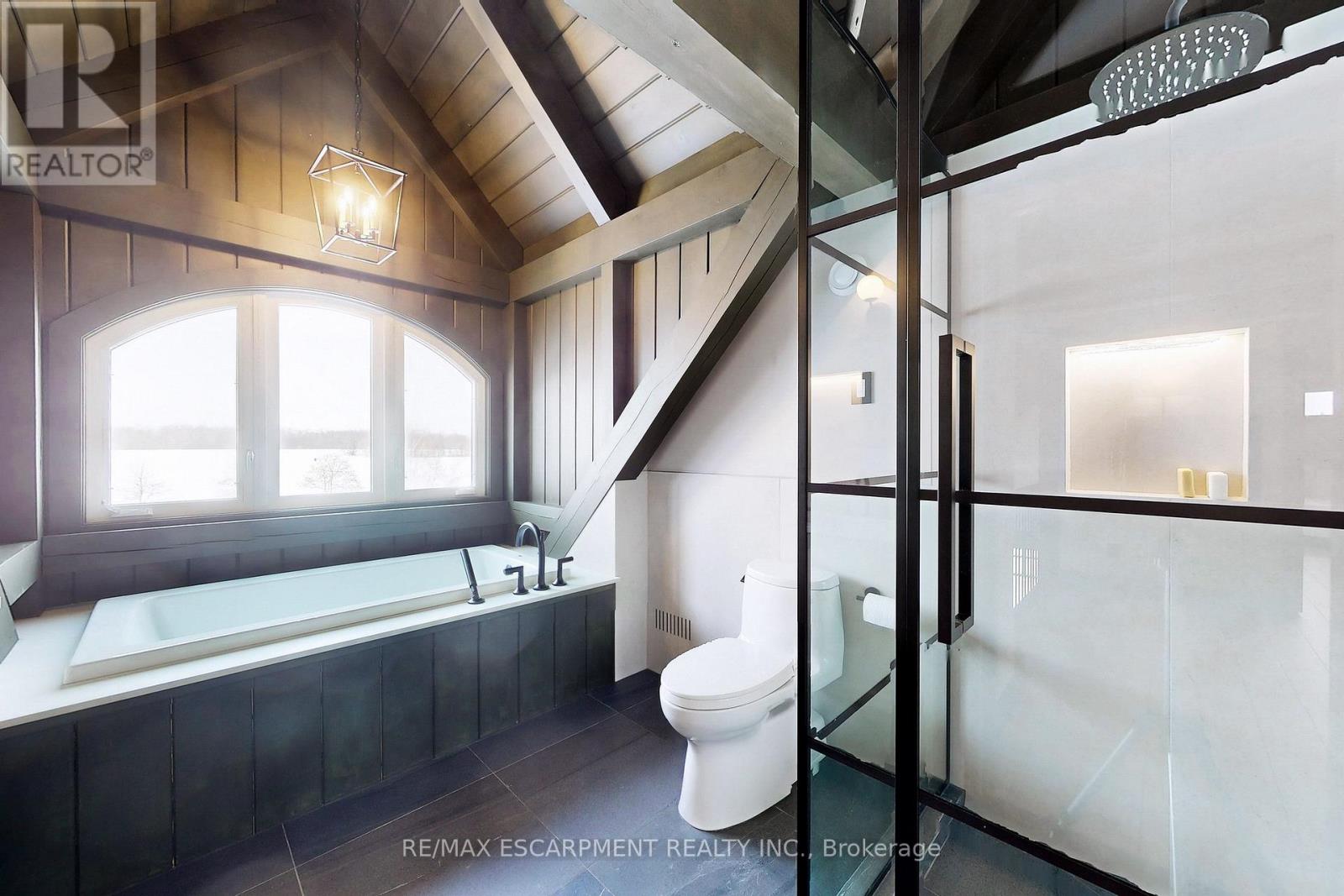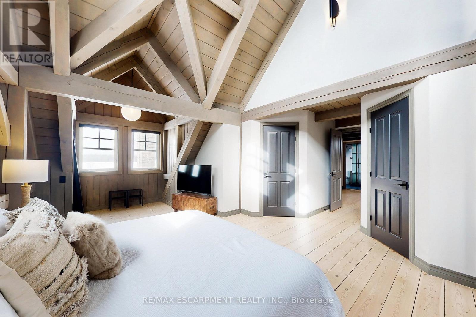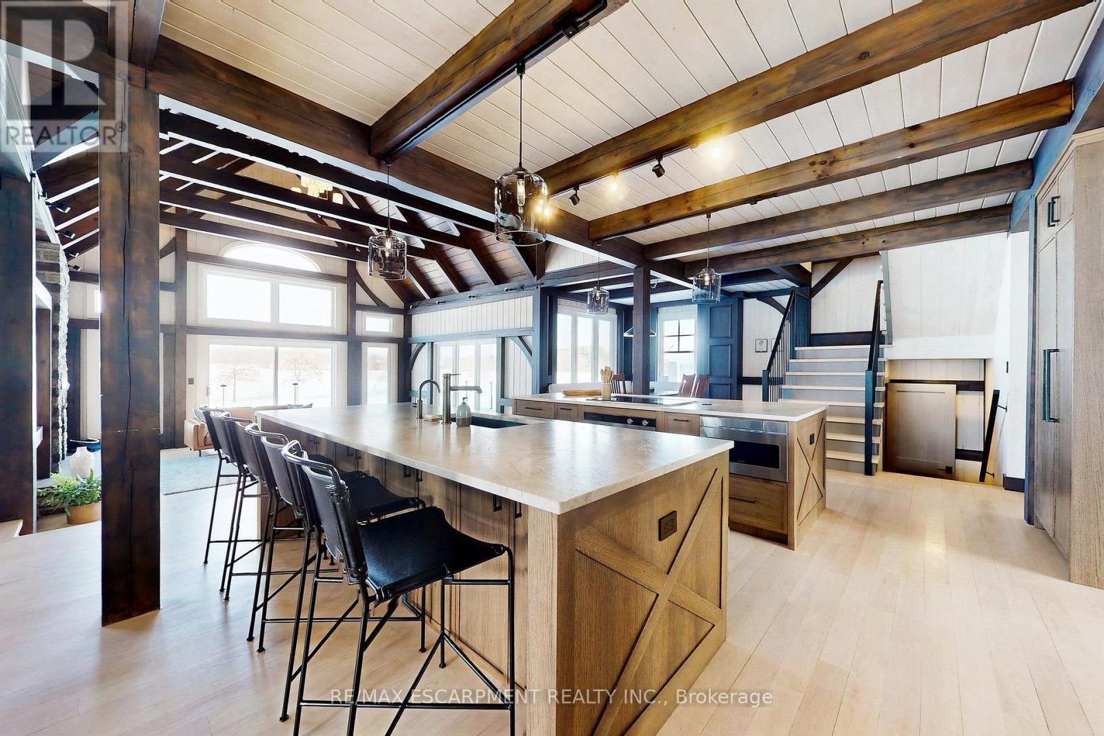 Experience the ultimate country living dream home at 485 Concession 5 Rd E-where refined luxury, beauty, and everyday ease come together, just a 4-minute drive to downtown Waterdown. Set on a breathtaking 91.6-acres of rolling farmland, mature woodlands, and a serene spring-fed pond, this property offers exceptional privacy, calm and a restorative lifestyle. The land has been organically farmed, blending sustainability with long-term peace of mind. The property includes 63 acres of actively farmed/leased farmland with Farm Property Class tax status, offering substantially reduced prop. taxes (approx. 25% of the residential rate on eligible farmland). The current farmer pays approx. $12,000 /yr to lease, helping offset ownership costs while preserving the landscape. The fully renovated 2.5-storey, 6-bed, 6-bath main residence with attached 2-bed, 2-bath guest house was exquisitely remodelled by Neven Custom Homes (2022/23) with $2M+ in premium renovations. Exceptional craftsmanship throughout, including a DaVinci composite shake roof, Gentek siding, custom windows and doors, and beautifully curated finishes. A wrap-around veranda and glass-railed deck create effortless indoor-outdoor living. The heart of the home is the stunning, highly functional chef's kitchen with two expansive islands, luxury appliances, abundant storage, and a separate prep kitchen, ideal for daily living and entertaining. Spa-inspired bathrooms, 20'8"ceilings in the great room, and a stone fireplace elevate comfort and elegance. The primary suite features timber accents and a luxurious 5-piece ensuite. The lower level is ideal for extended family, while the guest house offers privacy, high-end finishes, and panoramic views. Additional features incl a 30'x90' Quonset hut, 800+ evergreen trees, two septic systems, and two geothermal systems. Close to amenities yet worlds away, this is a rare, thoughtfully designed country estate built for living well. LUXURY CERTIFIED. (id:64974)