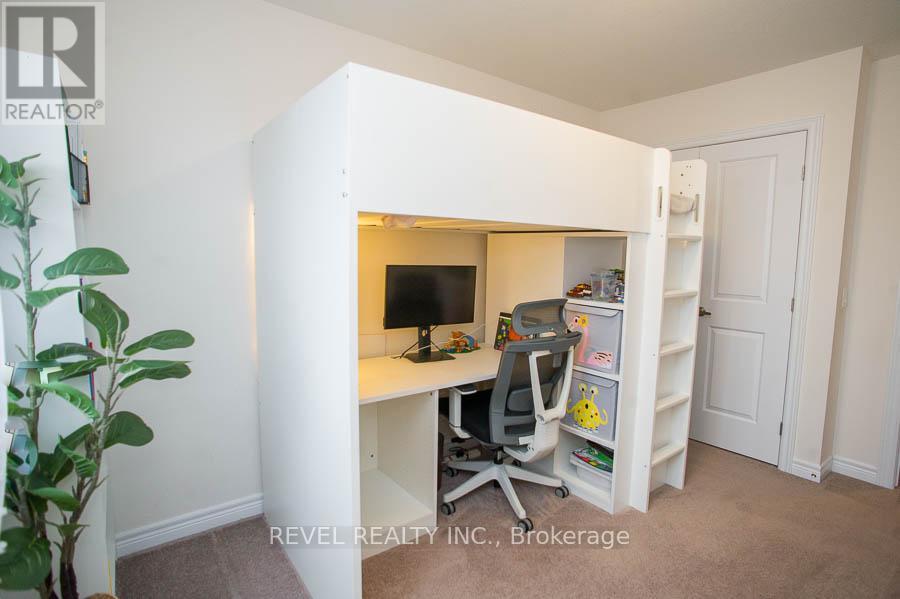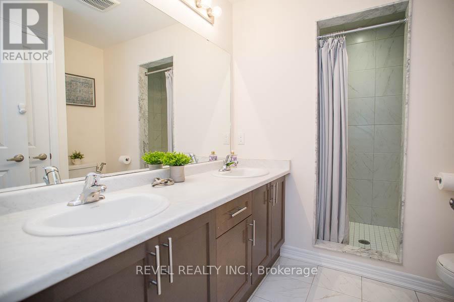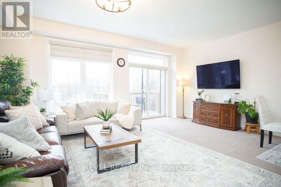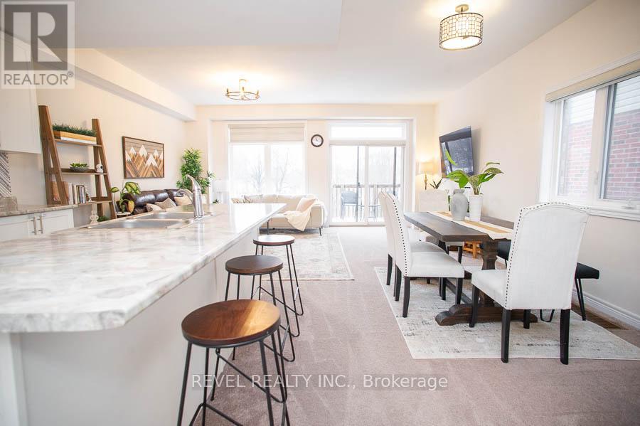 49-77 Diana Avenue is a beautifully maintained end-unit, two-storey townhouse offering 3 bedrooms, 2.5 bathrooms, and a rare walk-out basement backing onto peaceful green space. Built in 2020, this home features an open-concept main floor with 9-foot ceilings, neutral paint colours throughout, updated light fixtures, and zebra blinds. The kitchen overlooks the living and dining areas and showcases white shaker cabinetry with upgraded hardware, stainless steel Whirlpool appliances, a large centre island, and excellent flow for everyday living and entertaining. The spacious living room is filled with natural light and features patio doors that lead to an upper-level deck with serene views ofthe surrounding green space. Upstairs, the primary bedroom includes a walk-in closet with custom organizers and a private ensuite with a double vanity and a standalone shower. Two additional bedrooms offer generous closet space and large windows, complemented by a full main bathroom and convenient laundry facilities located on the bedroom level. The walk-out basement provides a large rec room, access to a lower patio, and a rough-in for a future bathroom. This move-in-ready home offers a functional layout, modern finishes, and a desirable setting backing onto green space. (id:64974)