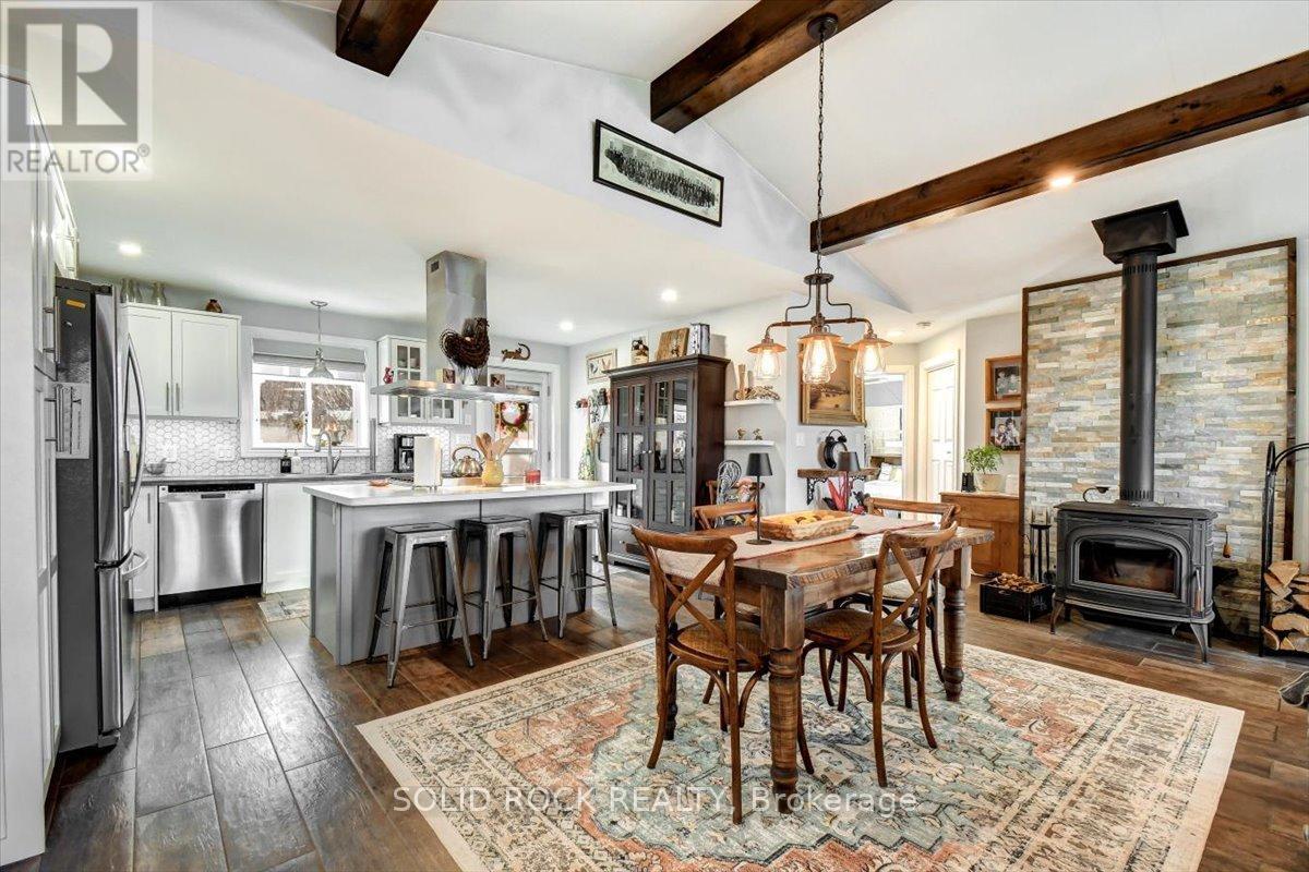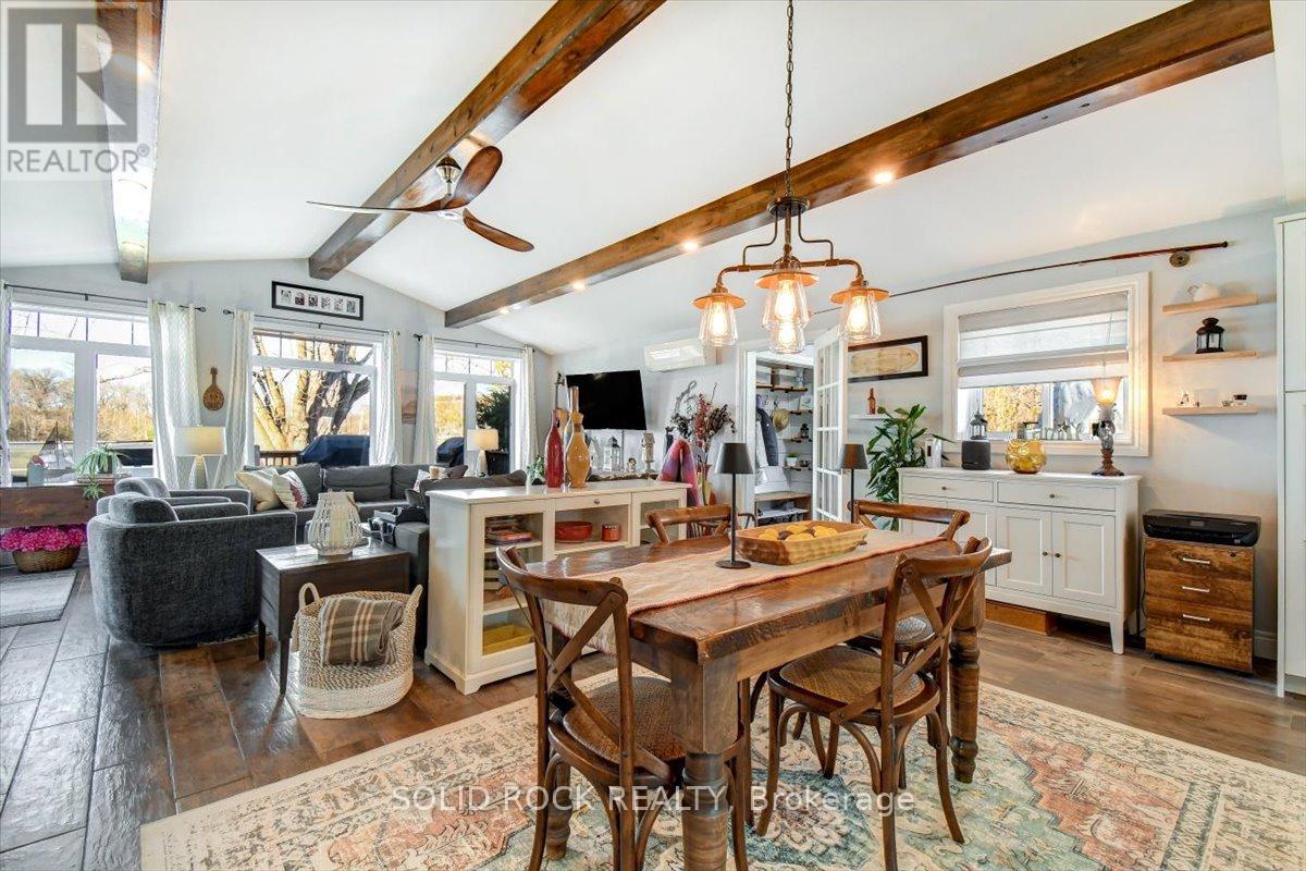 Welcome to this exceptional waterfront property, offering the perfect blend of comfort, charm, and year-round relaxation. This well maintained 2-bedroom, 2-bath home sits on just over .5 acre landscaped lot with breathtaking sunset views and direct access to the water, allowing you to enjoy peaceful living and fishing right from your own dock. Step inside to an inviting open-concept kitchen, dining, and living area designed for effortless flow and natural light. The kitchen features stainless steel appliances, abundant cabinetry, and generous counter space. Striking wood beams add warmth and character, while porcelain flooring runs throughout the main living area for durability and style. A cozy wood stove creates the perfect ambiance on cooler evenings. The spacious primary bedroom boasts a private 3-piece ensuite and direct patio access, making it an ideal space for quiet mornings or enjoying fresh air before bed. The second bedroom is conveniently located next to main bathroom providing function and practicality which includes the laundry facilities, adding to the home's thoughtful layout. A practical mudroom provides additional organization and storage. Outdoor living is truly exceptional here. Relax and unwind on the deck, complete with a hot tub, or gather around the fire pit for evenings under the stars. The property also includes a charming screened-in gazebo, perfect for bug-free summer nights, as well as a workshop and a delightful she shed-ideal for hobbies, storage, or creative space. The beautifully landscaped grounds enhance the home's tranquil atmosphere, with open sightlines to the water and incredible sunset views that never gets old. Whether you're looking for a year-round residence or a peaceful getaway, this property offers unmatched comfort, charm, and riverside living. Don't miss the opportunity to make this stunning waterfront home your own. (id:64974)