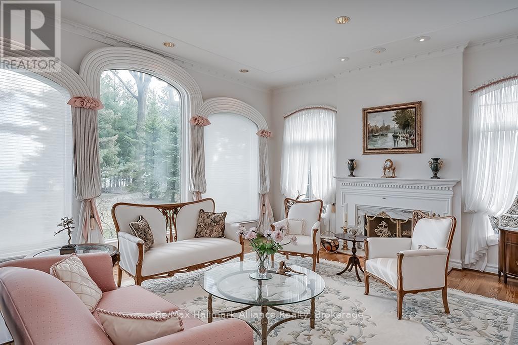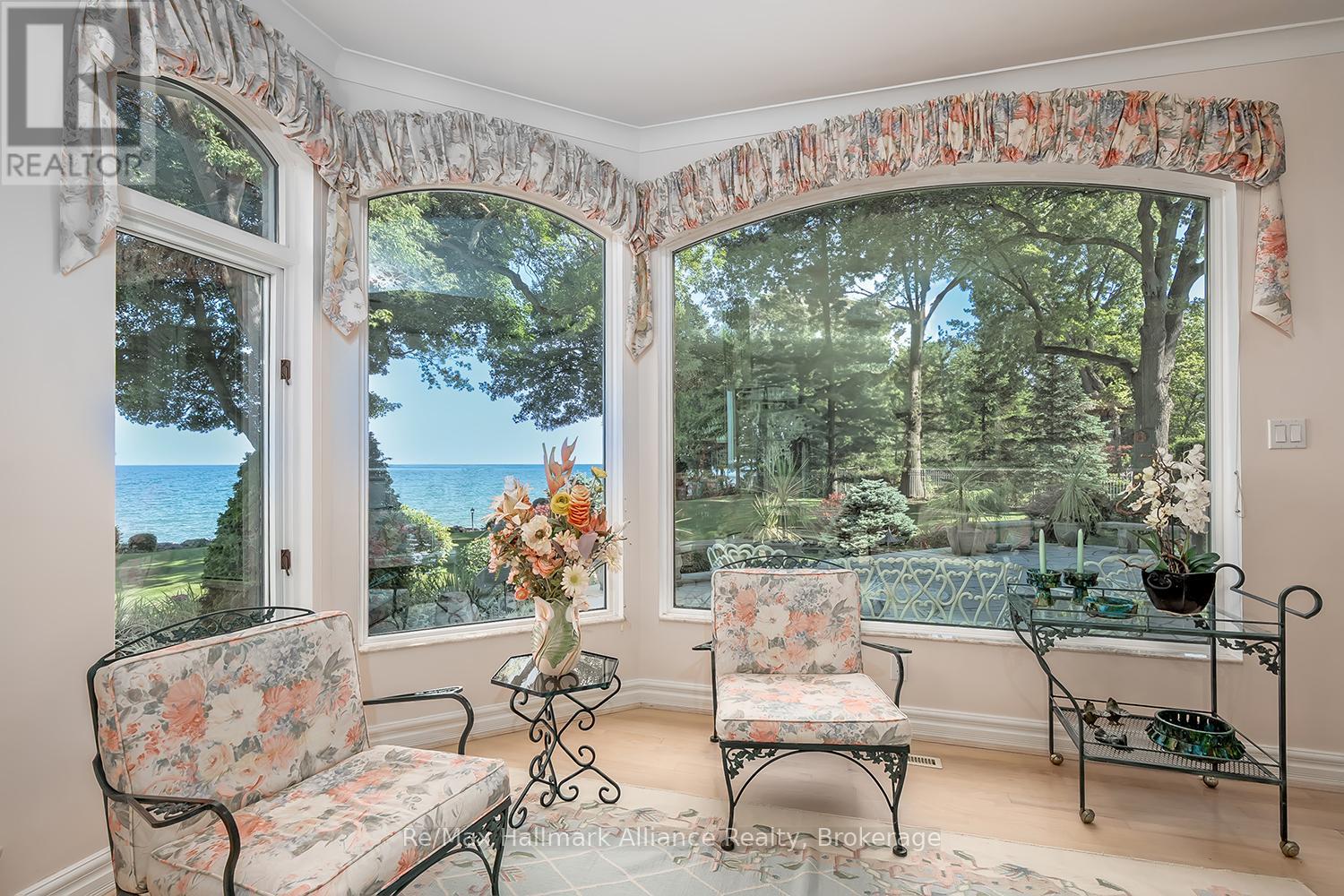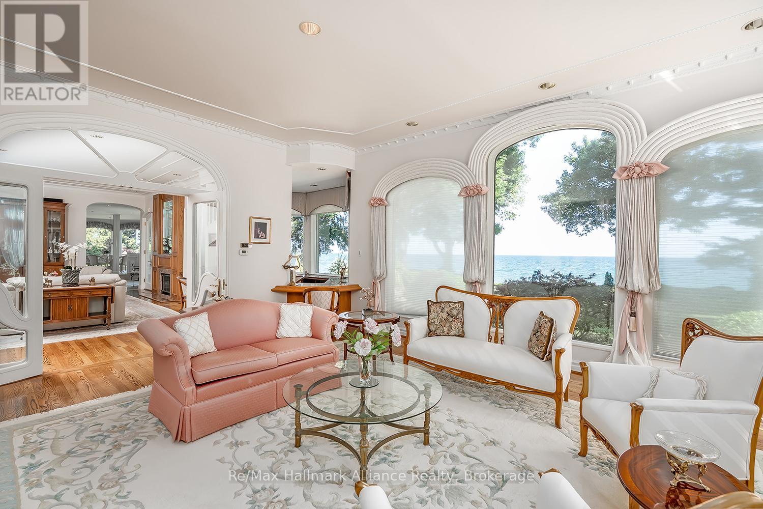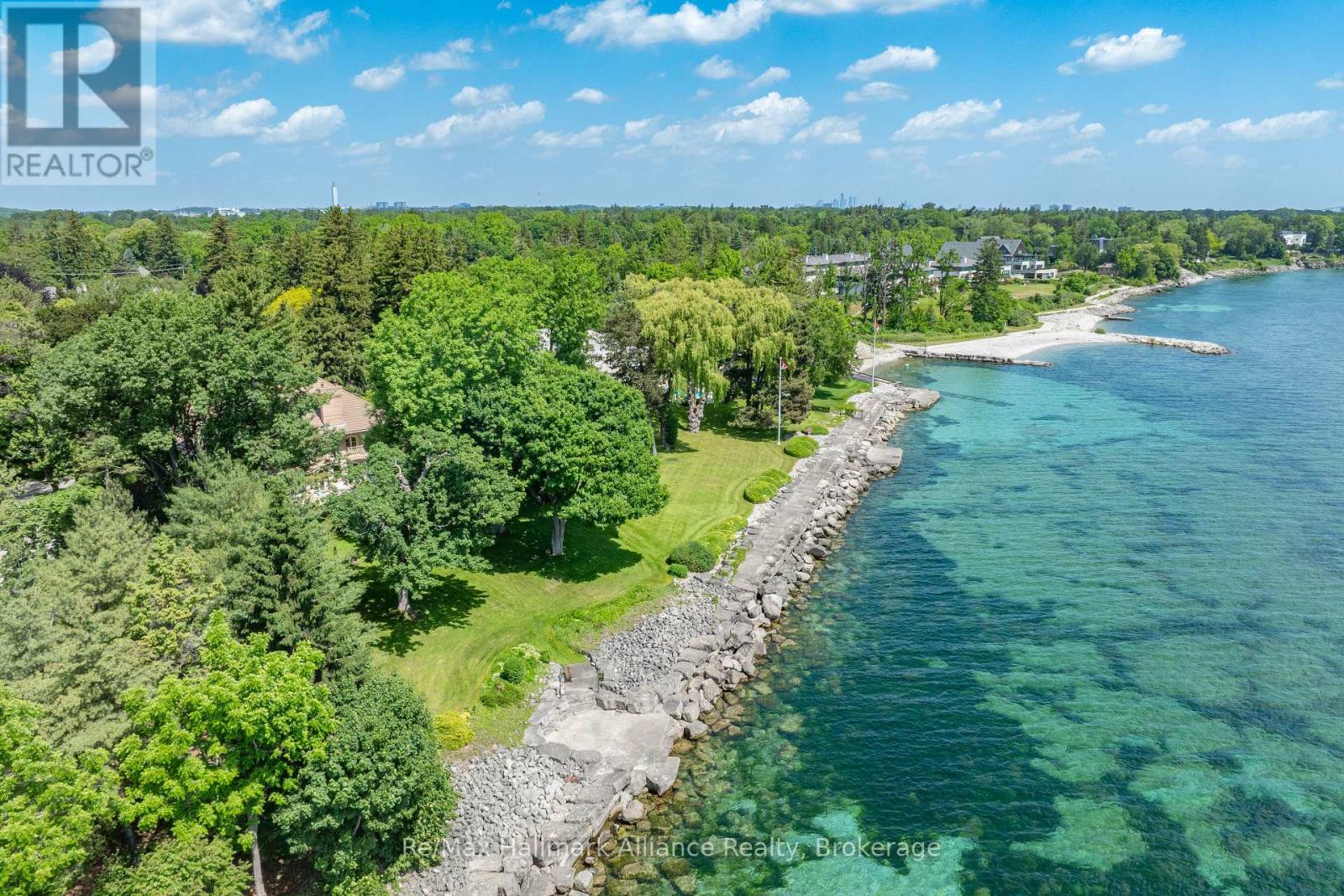 Welcome to an exceptional waterfront residence on one of South East Oakville's most private and prestigious streets. Set on a quiet cul-de-sac with full riparian rights, this landmark estate offers nearly 9,300 square feet of finished living space and stunning lake views from almost every room. A long, gated drive leads to manicured grounds, mature trees and a sun-filled backyard with pool, multiple terraces and direct access to the lake. Designed for both everyday living and elegant entertaining, the main level features a grand foyer, formal living and dining rooms, a lake-facing great room with fireplace and a bright kitchen and breakfast area that open to the terrace. The upper level is highlighted by a private primary suite with balcony, sitting area, walk-in closet and spa-like ensuite overlooking the water. Three additional bedrooms on this level offer ensuite or semi-ensuite access and either lake or garden views. A main floor bedroom provides ideal guest or in-law accommodation. The fully finished lower level includes a spacious recreation room, games area, wine cellar, sauna, full bathroom and a walk-out to the backyard and pool. A lower-level guest suite with ensuite offers additional privacy for extended family or visitors. This rare property combines lakefront living with proximity to the best of Oakville. Walking distance to top-rated public and private schools, close to downtown shops, restaurants, marinas, parks and highways. A unique opportunity to own on the water in Eastlake-where privacy, scale and views come together in one of Oakville's finest settings. (id:64974)