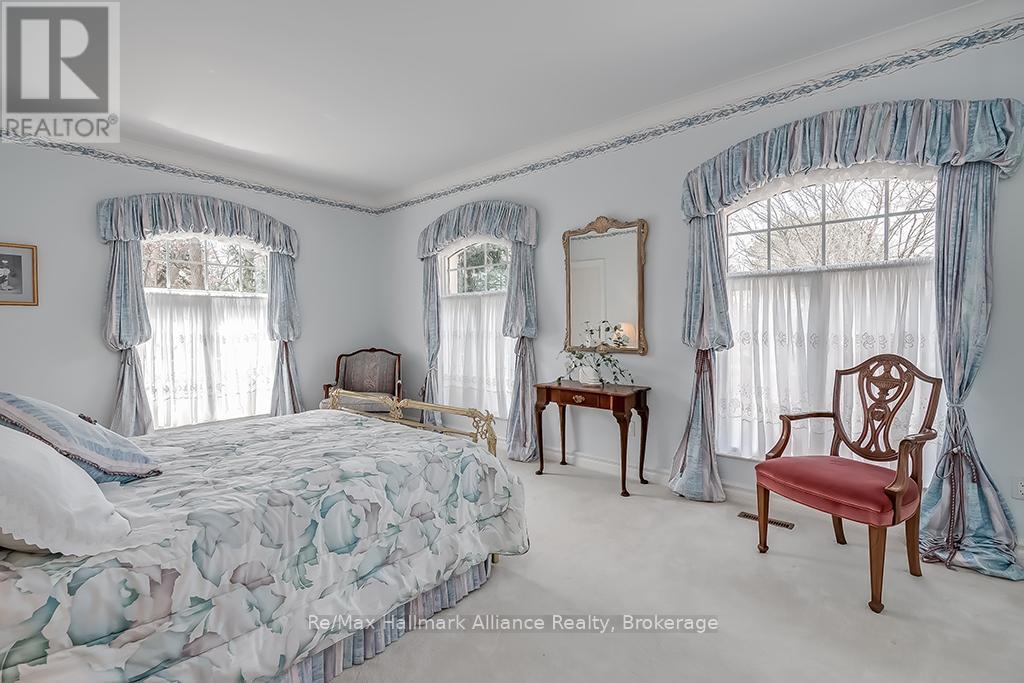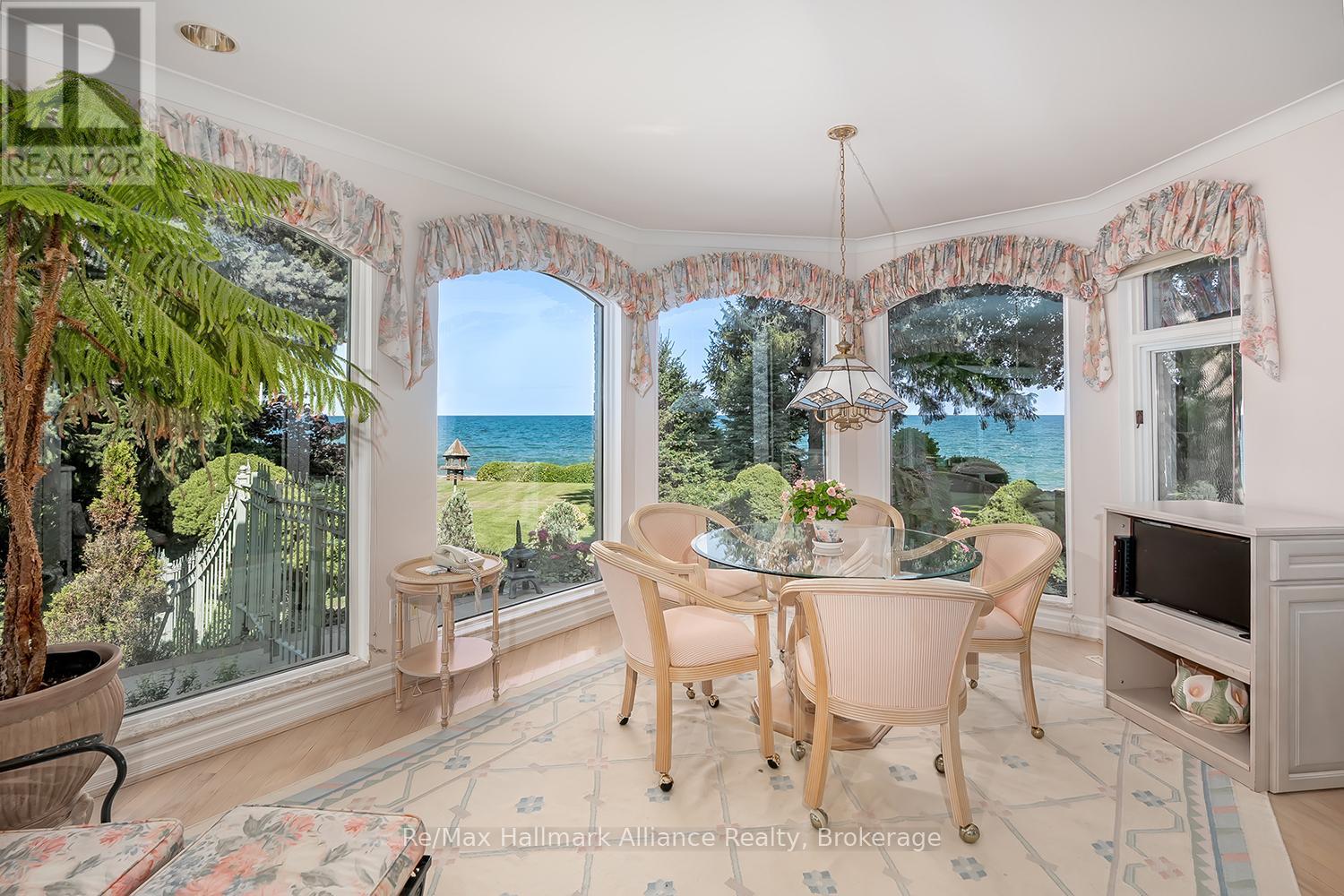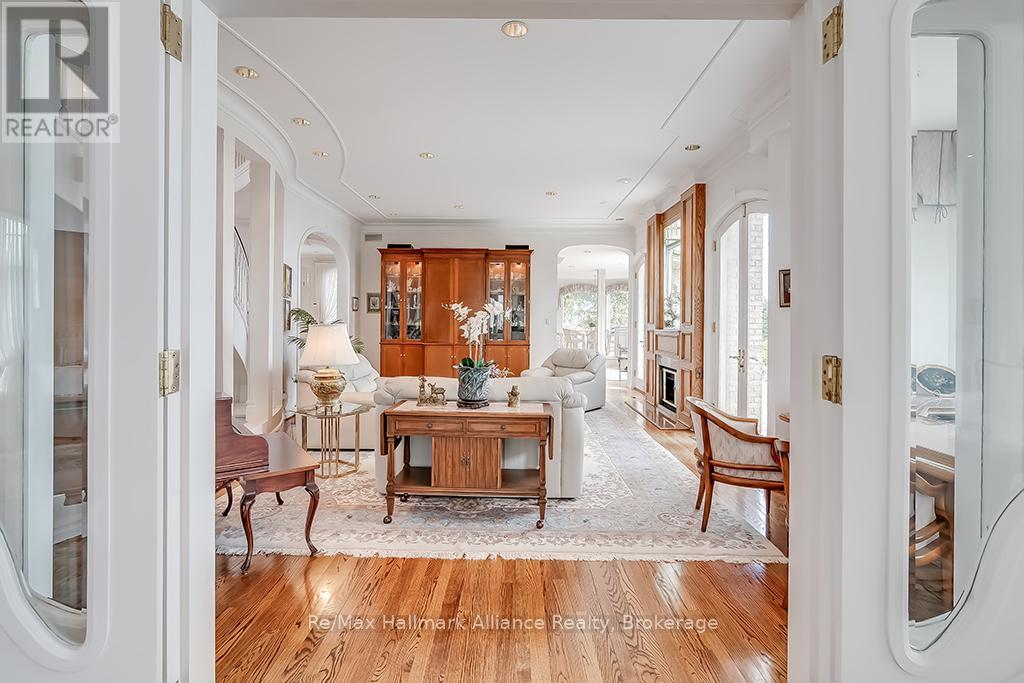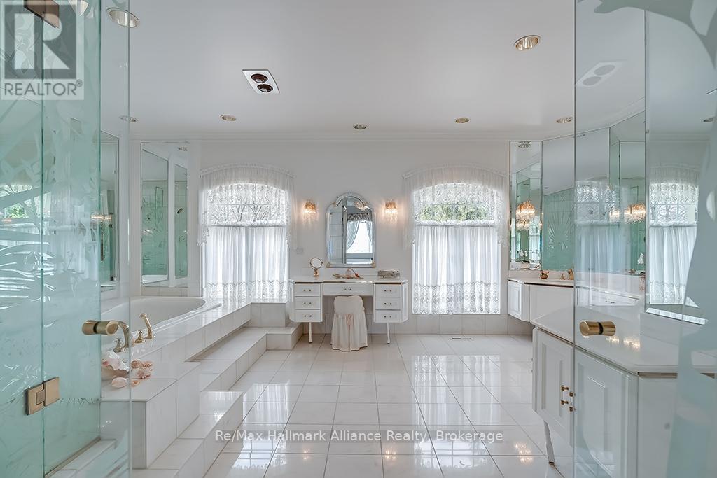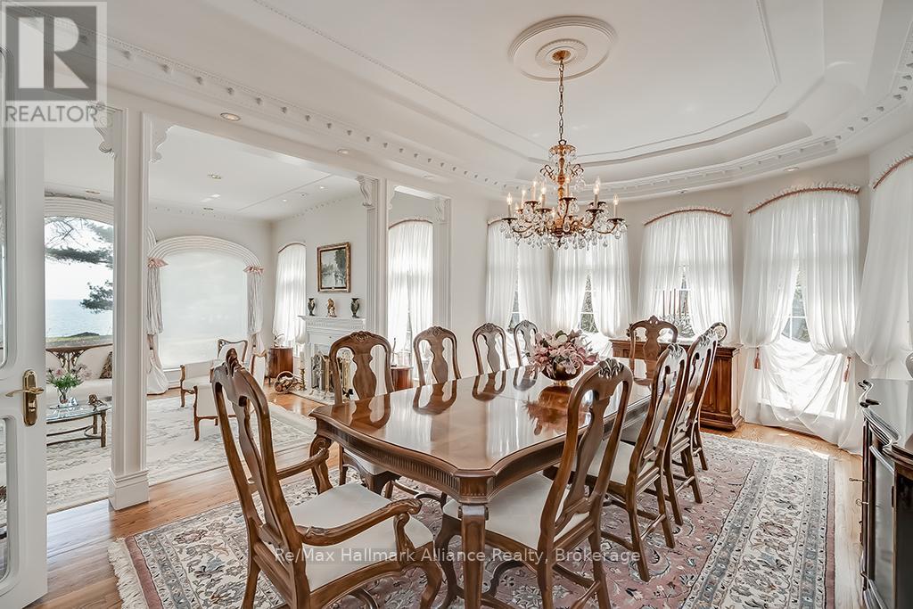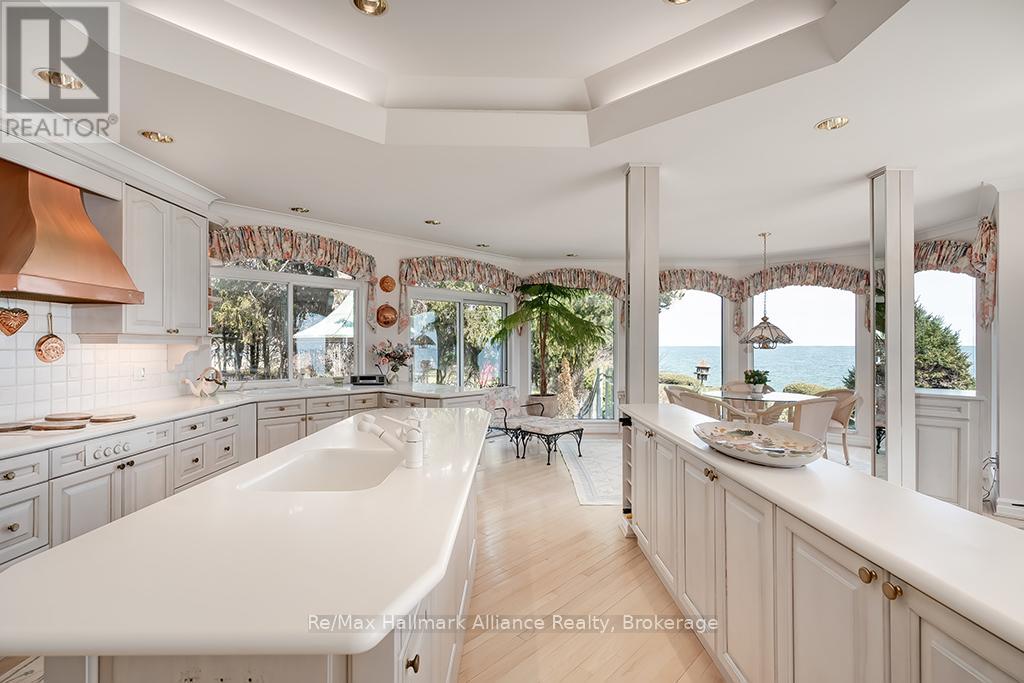 Welcome to an exceptional waterfront residence on one of South East Oakville's most private and prestigious streets. Set on a quiet cul-de-sac with full riparian rights, this landmark estate offers nearly 9,300 square feet of finished living space and stunning lake views from almost every room. A long, gated drive leads to manicured grounds, mature trees and a sun-filled backyard with pool, multiple terraces and direct access to the lake. Designed for both everyday living and elegant entertaining, the main level features a grand foyer, formal living and dining rooms, a lake-facing great room with fireplace and a bright kitchen and breakfast area that open to the terrace. The upper level is highlighted by a private primary suite with balcony, sitting area, walk-in closet and spa-like ensuite overlooking the water. Three additional bedrooms on this level offer ensuite or semi-ensuite access and either lake or garden views. A main floor bedroom provides ideal guest or in-law accommodation. The fully finished lower level includes a spacious recreation room, games area, wine cellar, sauna, full bathroom and a walk-out to the backyard and pool. A lower-level guest suite with ensuite offers additional privacy for extended family or visitors. This rare property combines lakefront living with proximity to the best of Oakville. Walking distance to top-rated public and private schools, close to downtown shops, restaurants, marinas, parks and highways. A unique opportunity to own on the water in Eastlake-where privacy, scale and views come together in one of Oakville's finest settings. (id:64974)