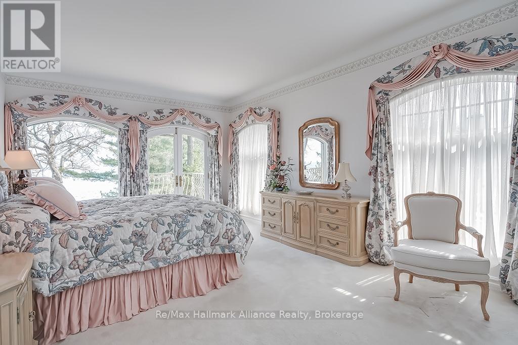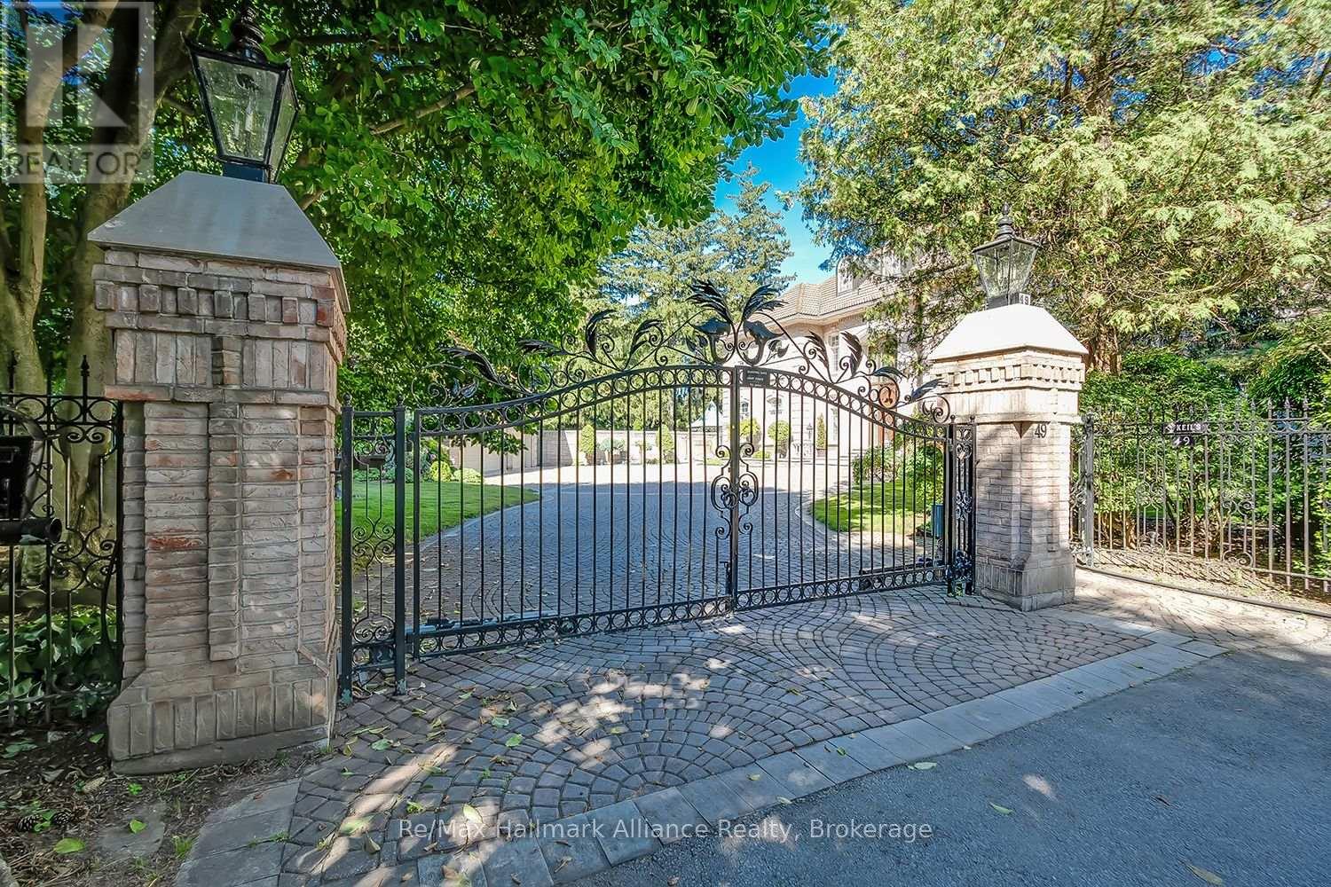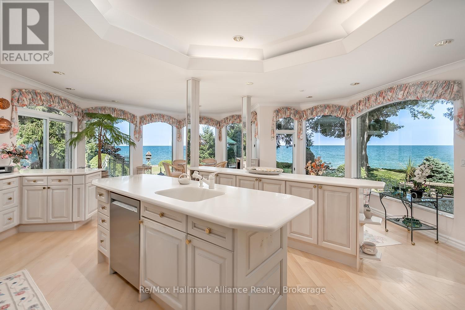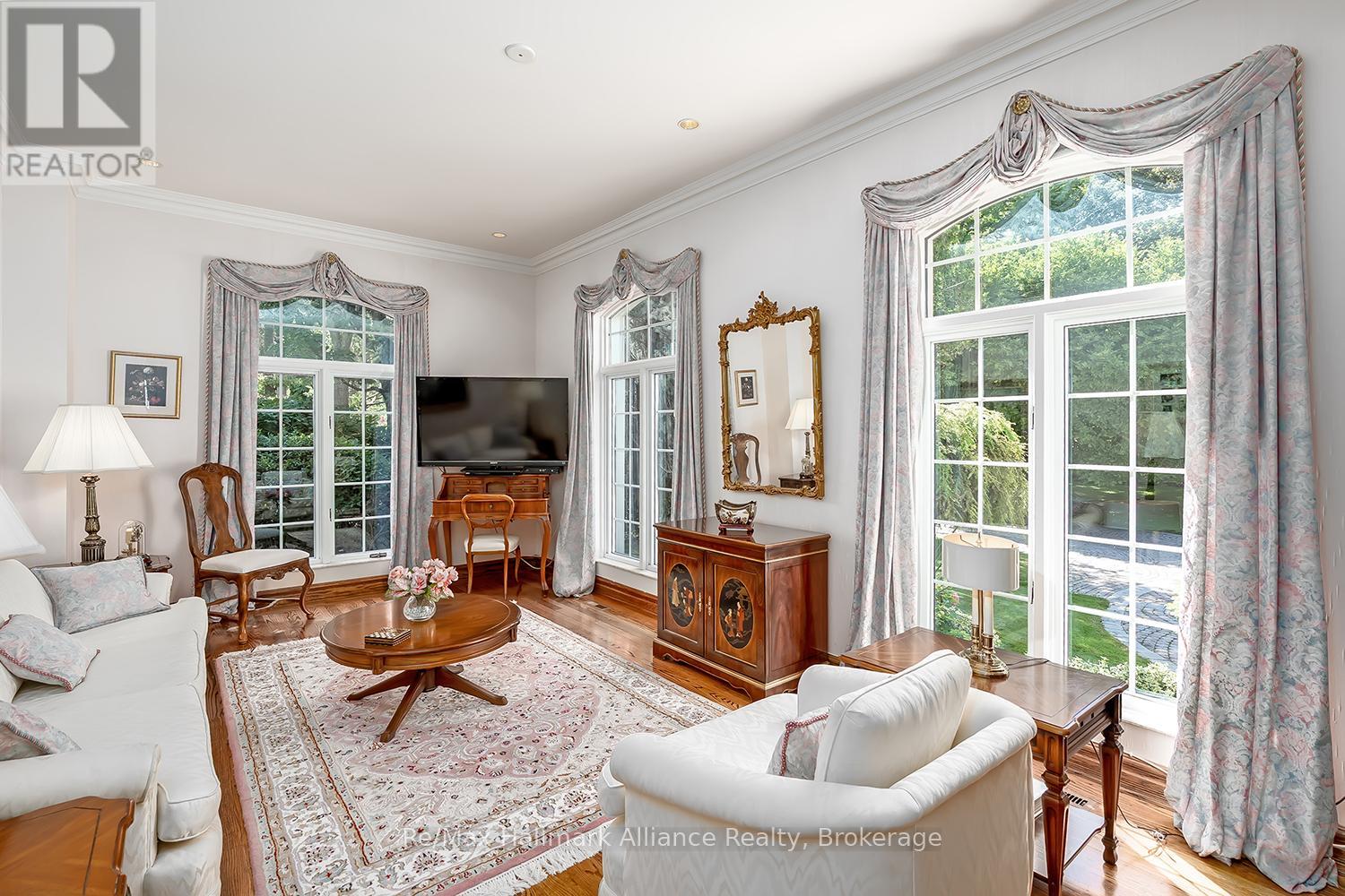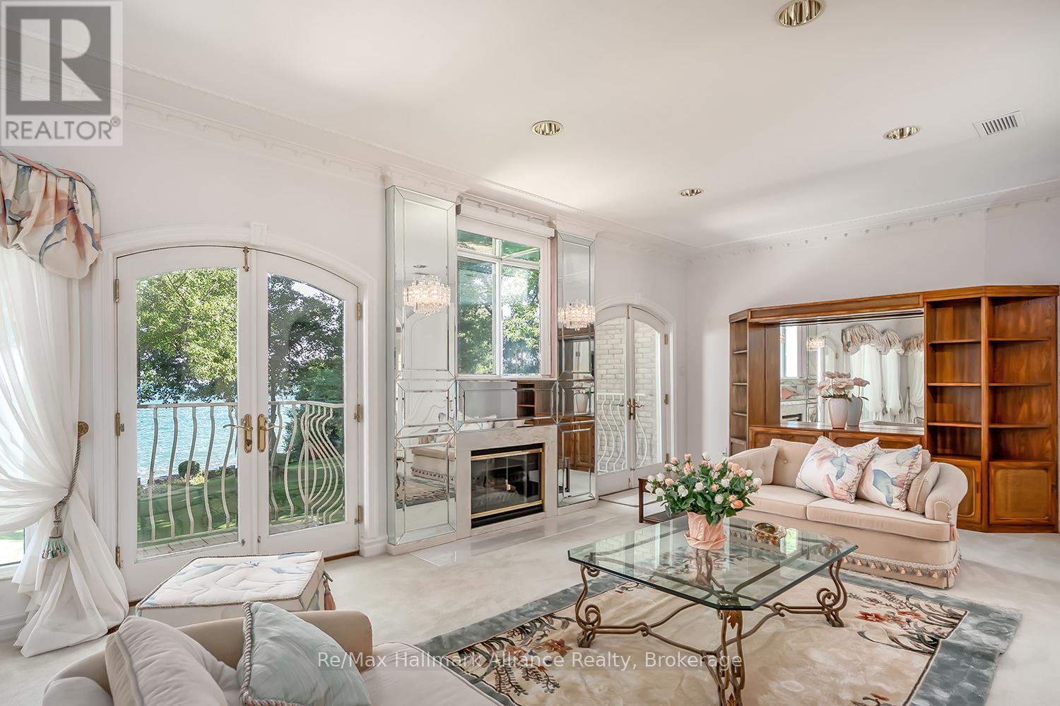 Welcome to an exceptional waterfront residence on one of South East Oakville's most private and prestigious streets. Set on a quiet cul-de-sac with full riparian rights, this landmark estate offers nearly 9,300 square feet of finished living space and stunning lake views from almost every room. A long, gated drive leads to manicured grounds, mature trees and a sun-filled backyard with pool, multiple terraces and direct access to the lake. Designed for both everyday living and elegant entertaining, the main level features a grand foyer, formal living and dining rooms, a lake-facing great room with fireplace and a bright kitchen and breakfast area that open to the terrace. The upper level is highlighted by a private primary suite with balcony, sitting area, walk-in closet and spa-like ensuite overlooking the water. Three additional bedrooms on this level offer ensuite or semi-ensuite access and either lake or garden views. A main floor bedroom provides ideal guest or in-law accommodation. The fully finished lower level includes a spacious recreation room, games area, wine cellar, sauna, full bathroom and a walk-out to the backyard and pool. A lower-level guest suite with ensuite offers additional privacy for extended family or visitors. This rare property combines lakefront living with proximity to the best of Oakville. Walking distance to top-rated public and private schools, close to downtown shops, restaurants, marinas, parks and highways. A unique opportunity to own on the water in Eastlake-where privacy, scale and views come together in one of Oakville's finest settings. (id:64974)