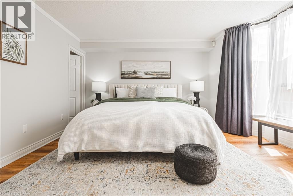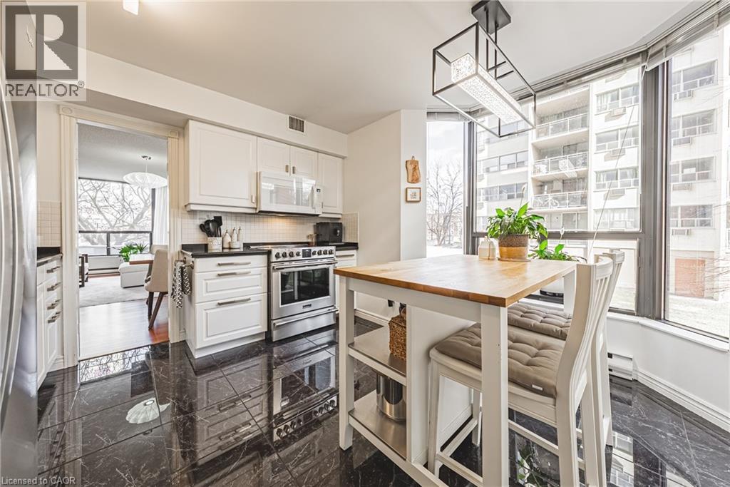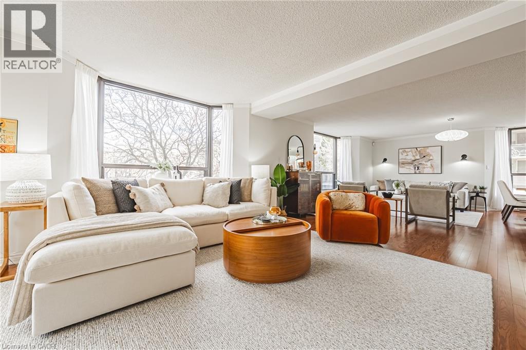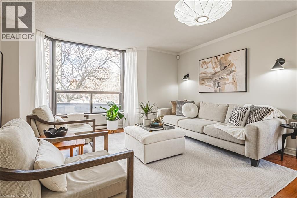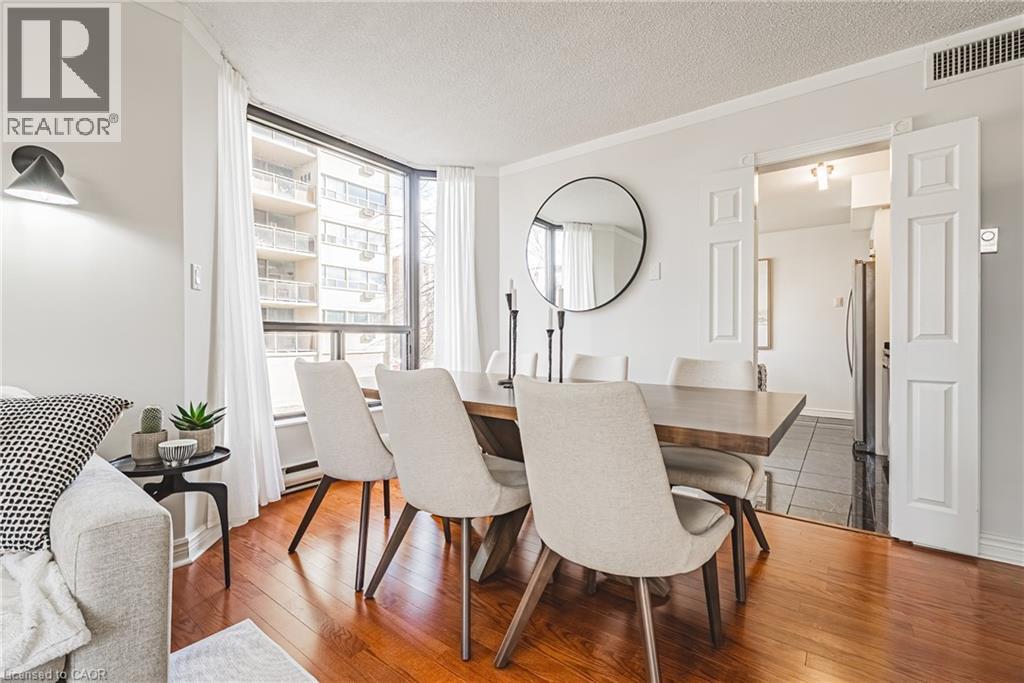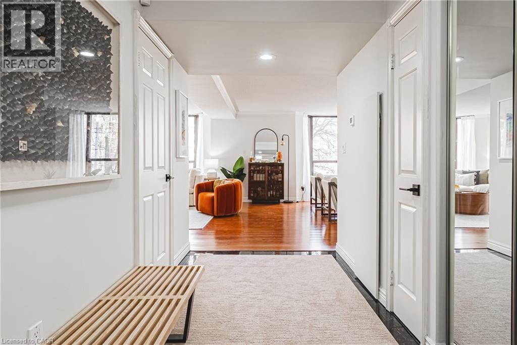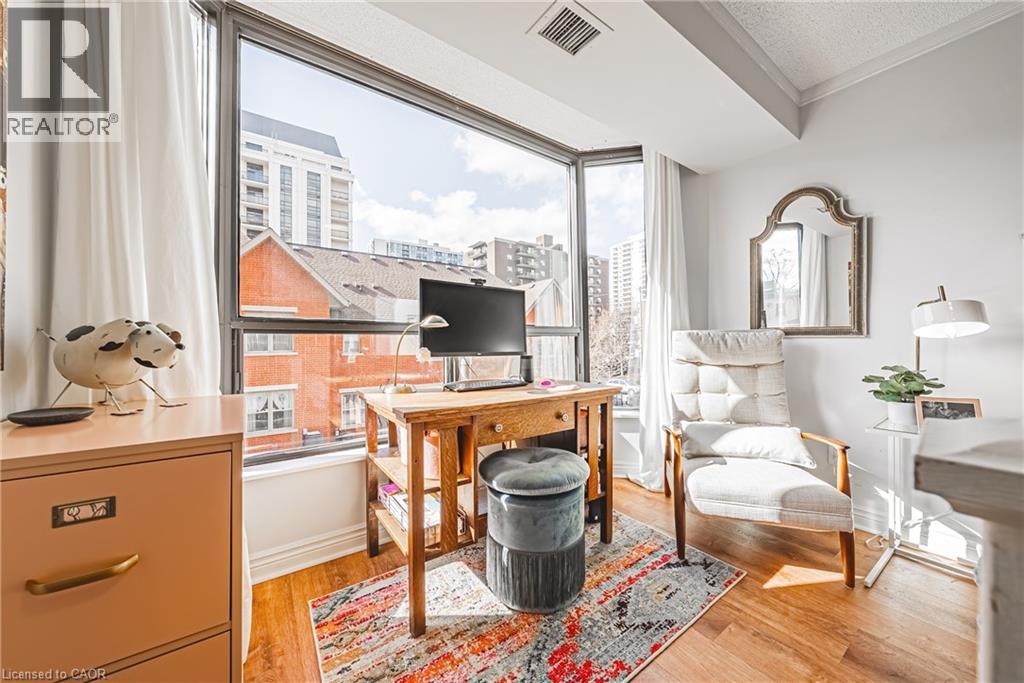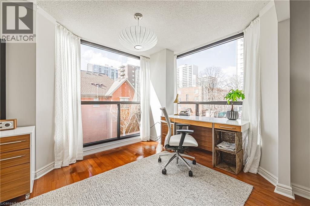 Nearly 1,900 sq. ft. of house-sized living with only two suites per floor — a rare boutique condo opportunity in the heart of downtown Hamilton. Welcome to The Garrison, an exclusive residence offering exceptional privacy and space rarely found in condominium living. This beautifully proportioned corner suite opens through double doors into a gracious centre-hall layout, with expansive principal rooms designed for both comfortable everyday living and effortless entertaining. Bay windows and wall-to-wall glass capture east, west and north exposures, flooding the home with natural light. The grand living and dining areas comfortably host everything from intimate dinners to large holiday gatherings, offering the scale and flexibility often missing from condo living. The well-appointed kitchen features granite countertops, newer appliances (2021–2023), and an instant hot water tap. The private bedroom wing includes a spacious primary suite with a corridor of closets and ensuite bath, while the generous second bedroom, full guest bath, and separate den/office provide flexibility for guests or working from home. Rich hardwood floors and thoughtful updates reflect meticulous care throughout. Ideally located steps to St. Joseph’s Hospital and within walking distance to Locke Street boutiques, Augusta cafés and wine bars, and Hess Village nightlife, this home offers a vibrant urban lifestyle. Parking is a rare luxury downtown. The suite includes one owned underground space and currently rents two additional spaces for just $50/month each. A rare opportunity for house-sized living without the maintenance in one of Hamilton’s most exclusive boutique buildings. (id:64974)
