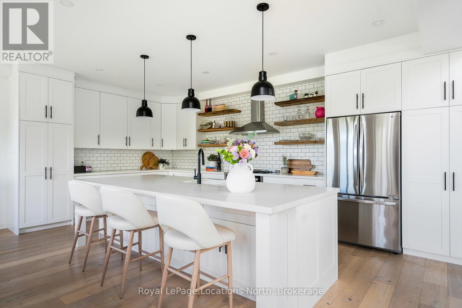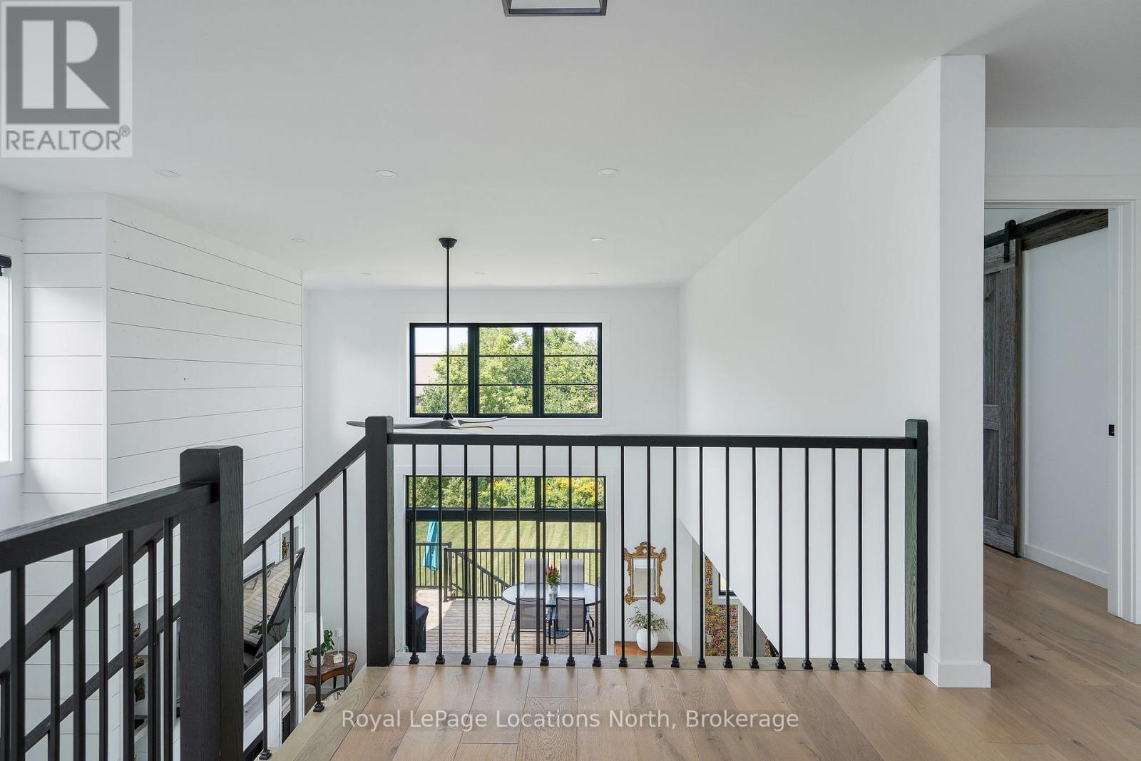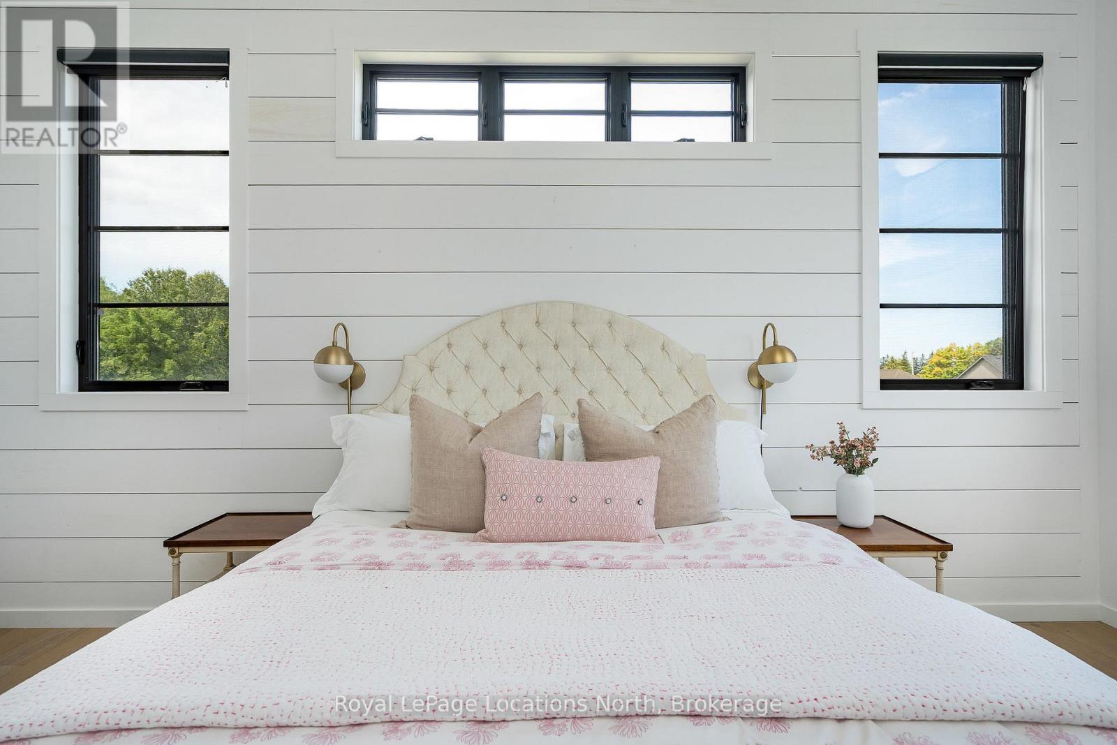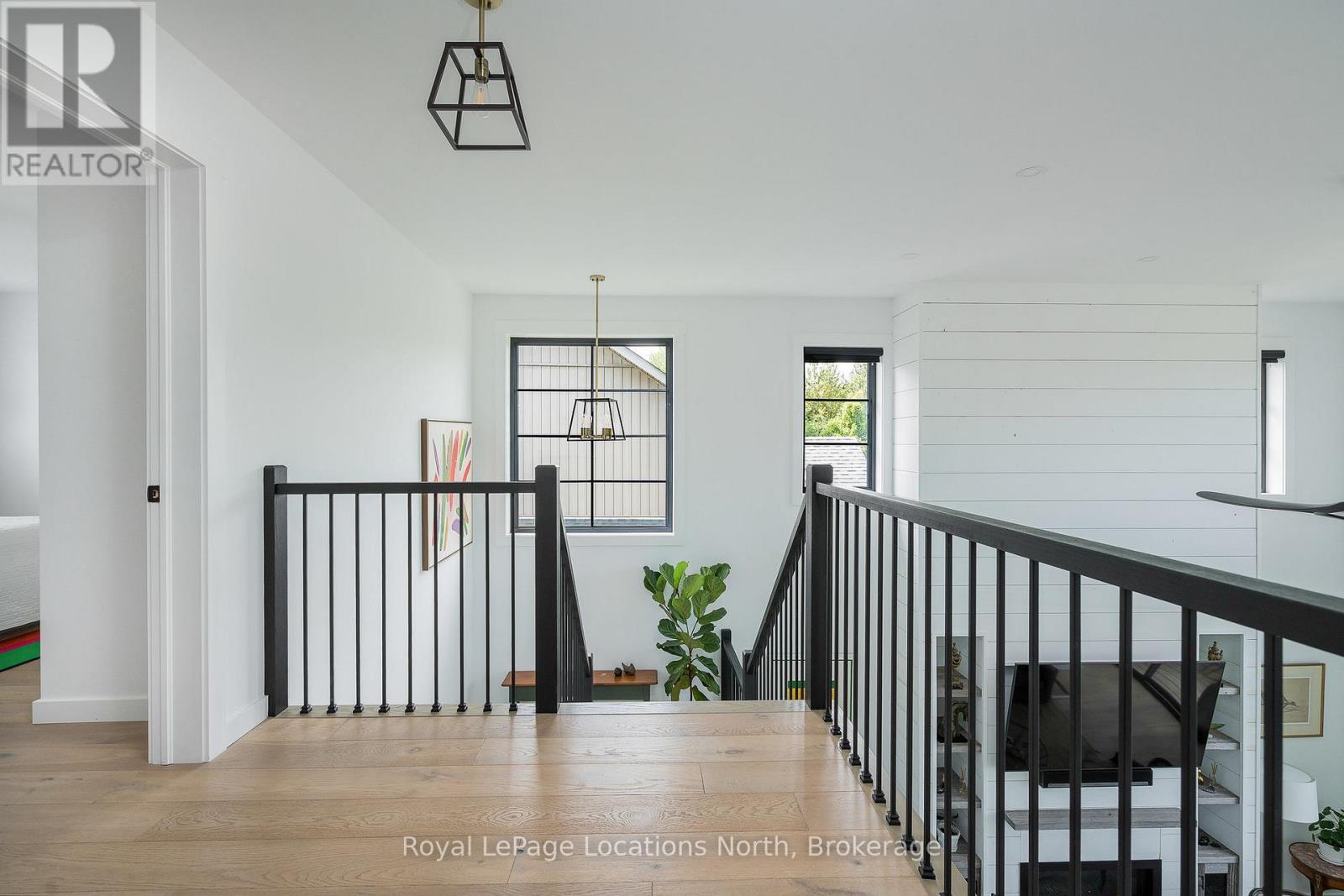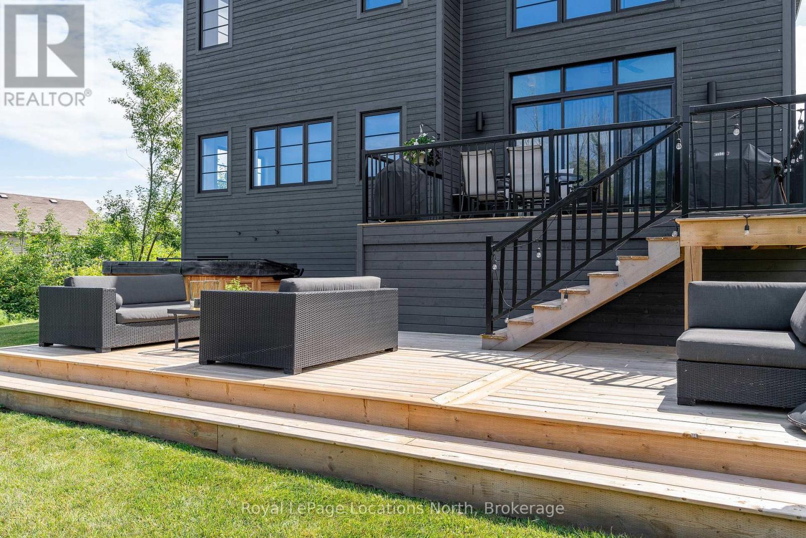 Welcome to one of Collingwood's most exclusive addresses, where elegance and comfort blend seamlessly in this custom-built two-storey home. Set on an impressive 66 x 167 ft full town lot, this residence offers over 3,700 sq ft of beautifully finished living space, with 5 bedrooms and 4 bathrooms designed for modern family living and entertaining. From the moment you step inside, soaring ceilings and sun-filled windows create a sense of openness and light. The main floor showcases wide-plank white oak engineered hardwood and thoughtful details throughout. At the heart of the home, the gourmet kitchen invites gathering with its quartz countertops, oversized island, and high-end appliances. The living room makes a statement with its dramatic 20-ft ceiling, cozy gas fireplace, and expansive sliding doors that lead to a private and peaceful backyard. Upstairs, retreat to the luxurious primary suite with remote-controlled blinds, a spacious walk-in closet, and a spa-inspired ensuite featuring double sinks, glass shower, and soaker tub. Two additional spacious bedrooms share a stylish Jack & Jill bathroom, perfect for family or guests. The fully finished lower level extends the living space with a generous recreation room, two more bedrooms, and a five-piece bath. Modern touches like shiplap and barnboard accents bring warmth and character throughout. Outdoors, enjoy a two-tiered deck and hot tub surrounded by nature. The large, private yard would be perfect for a pool. With amazing neighbours, a walkable location to Collingwood's best schools and downtown, and endless style and comfort, this home is truly a must see. (id:64974)