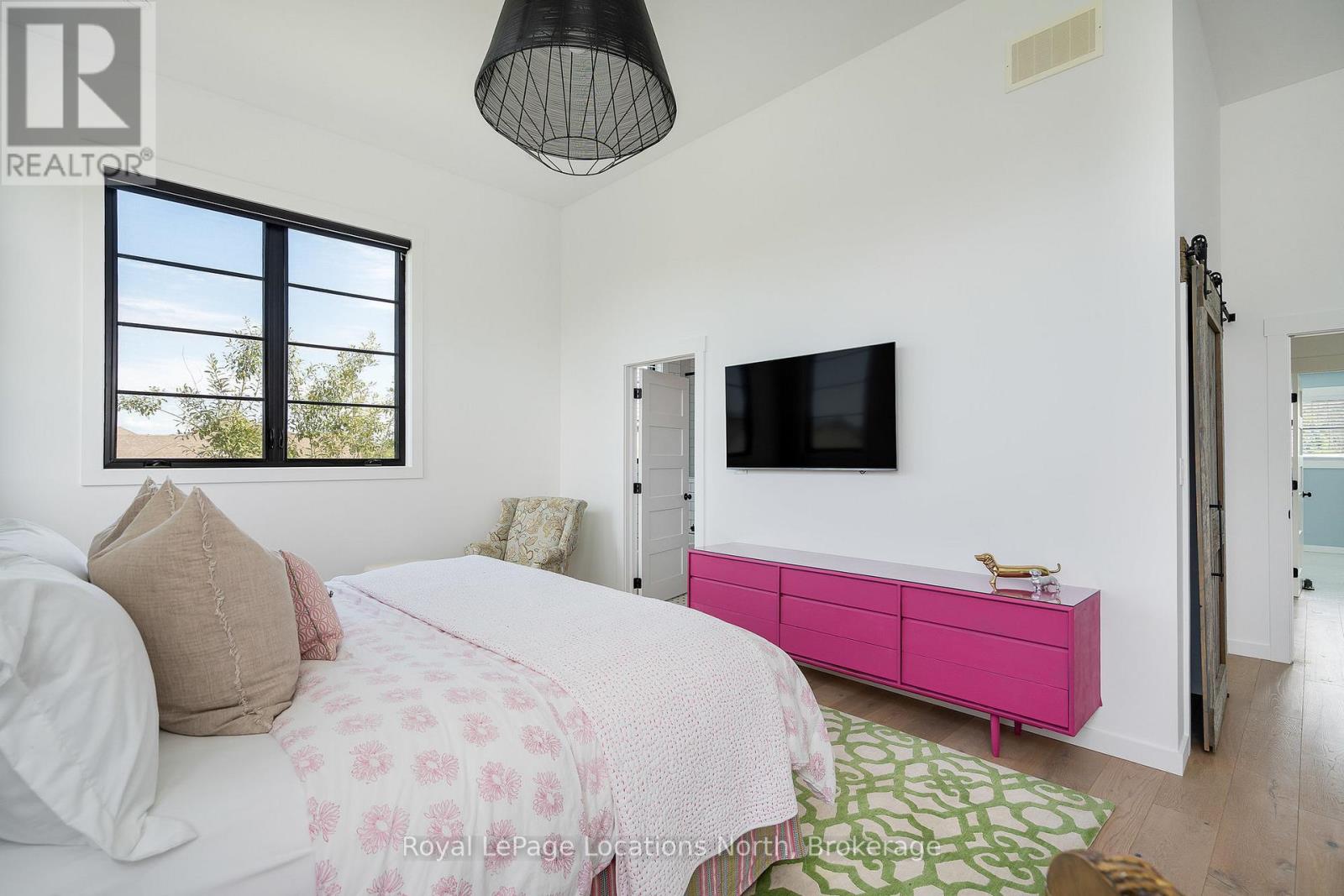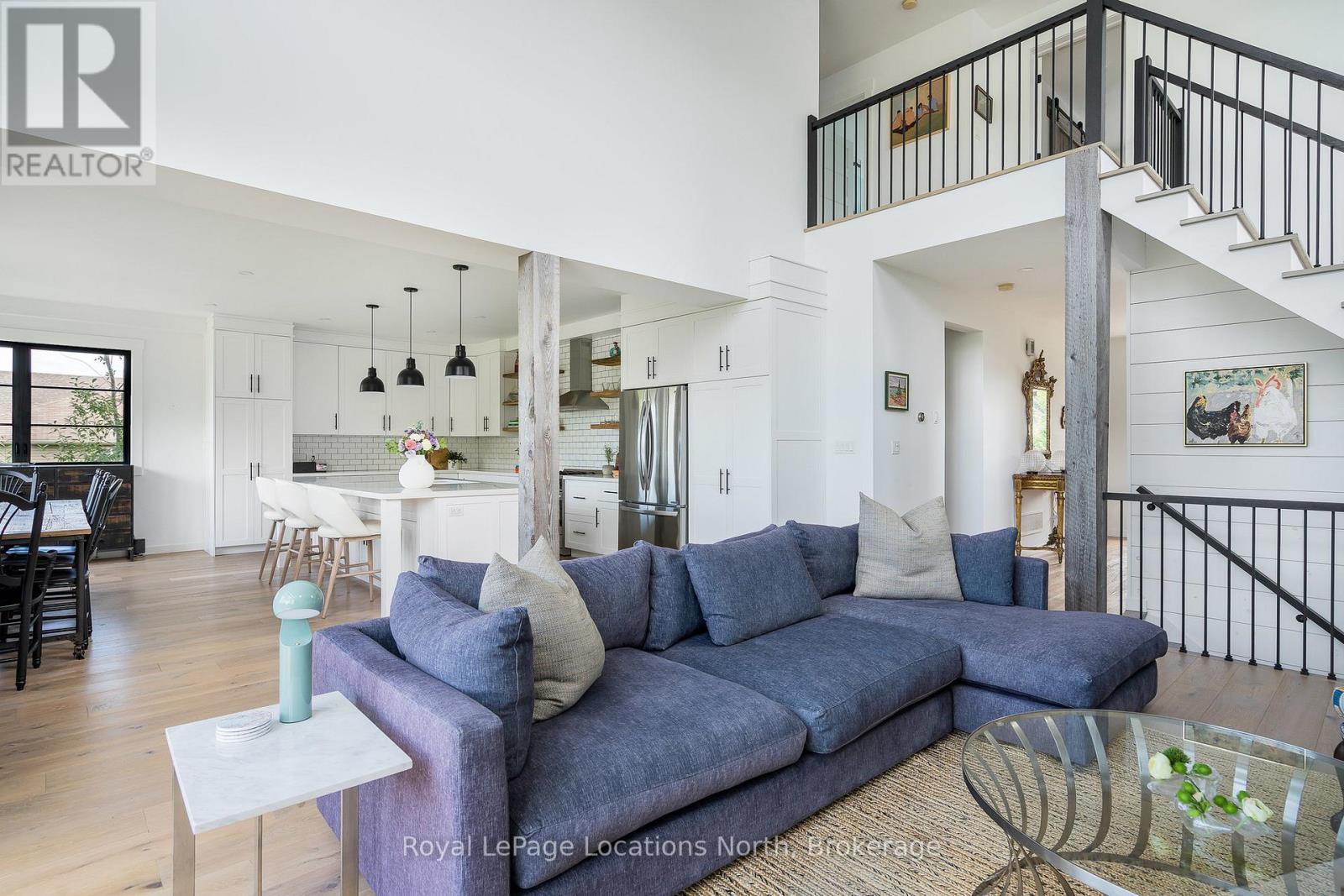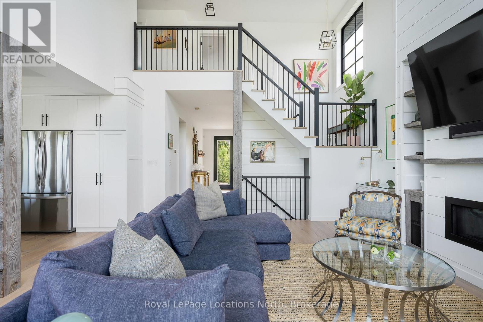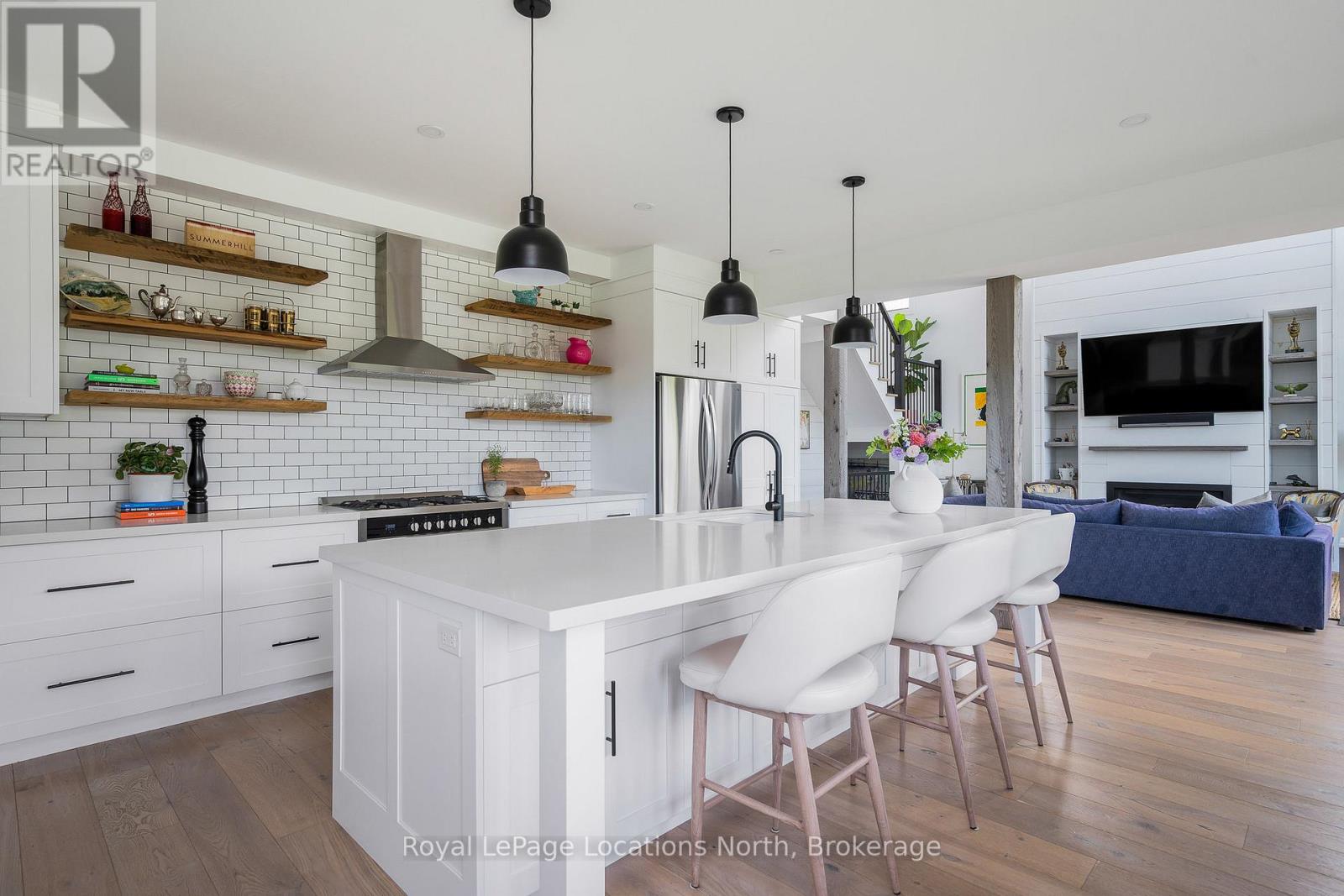 Welcome to one of Collingwood's most exclusive addresses, where elegance and comfort blend seamlessly in this custom-built two-storey home. Set on an impressive 66 x 167 ft full town lot, this residence offers over 3,700 sq ft of beautifully finished living space, with 5 bedrooms and 4 bathrooms designed for modern family living and entertaining. From the moment you step inside, soaring ceilings and sun-filled windows create a sense of openness and light. The main floor showcases wide-plank white oak engineered hardwood and thoughtful details throughout. At the heart of the home, the gourmet kitchen invites gathering with its quartz countertops, oversized island, and high-end appliances. The living room makes a statement with its dramatic 20-ft ceiling, cozy gas fireplace, and expansive sliding doors that lead to a private and peaceful backyard. Upstairs, retreat to the luxurious primary suite with remote-controlled blinds, a spacious walk-in closet, and a spa-inspired ensuite featuring double sinks, glass shower, and soaker tub. Two additional spacious bedrooms share a stylish Jack & Jill bathroom, perfect for family or guests. The fully finished lower level extends the living space with a generous recreation room, two more bedrooms, and a five-piece bath. Modern touches like shiplap and barnboard accents bring warmth and character throughout. Outdoors, enjoy a two-tiered deck and hot tub surrounded by nature. The large, private yard would be perfect for a pool. With amazing neighbours, a walkable location to Collingwood's best schools and downtown, and endless style and comfort, this home is truly a must see. (id:64974)