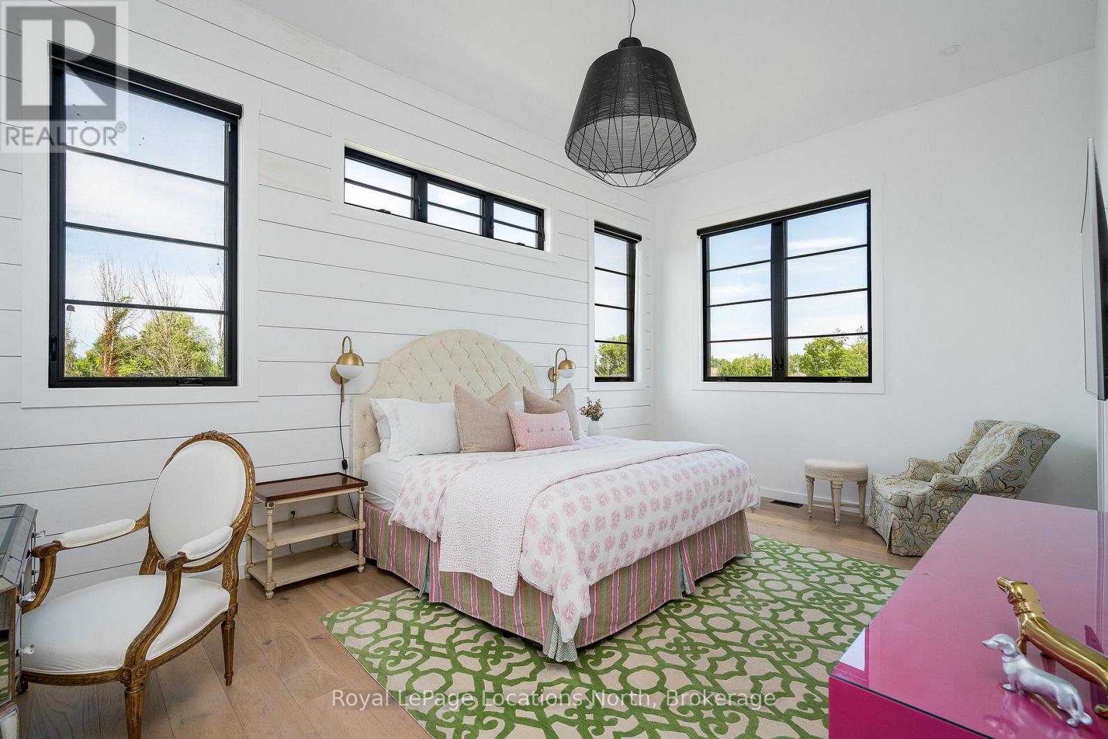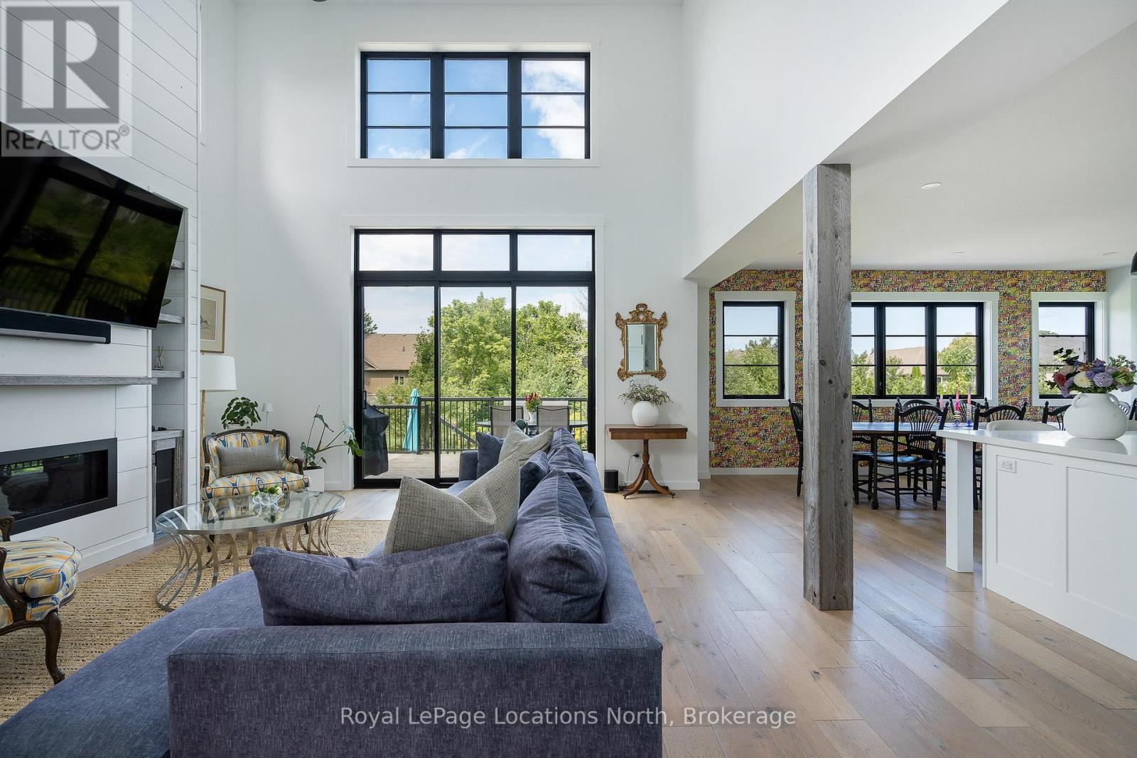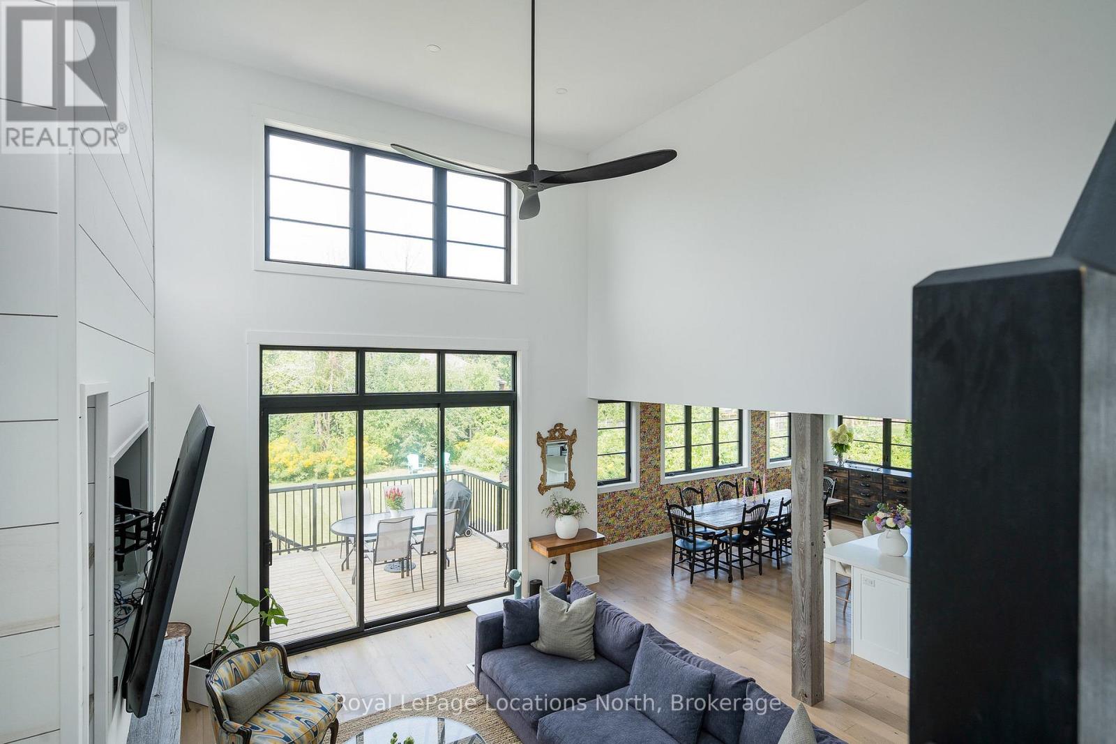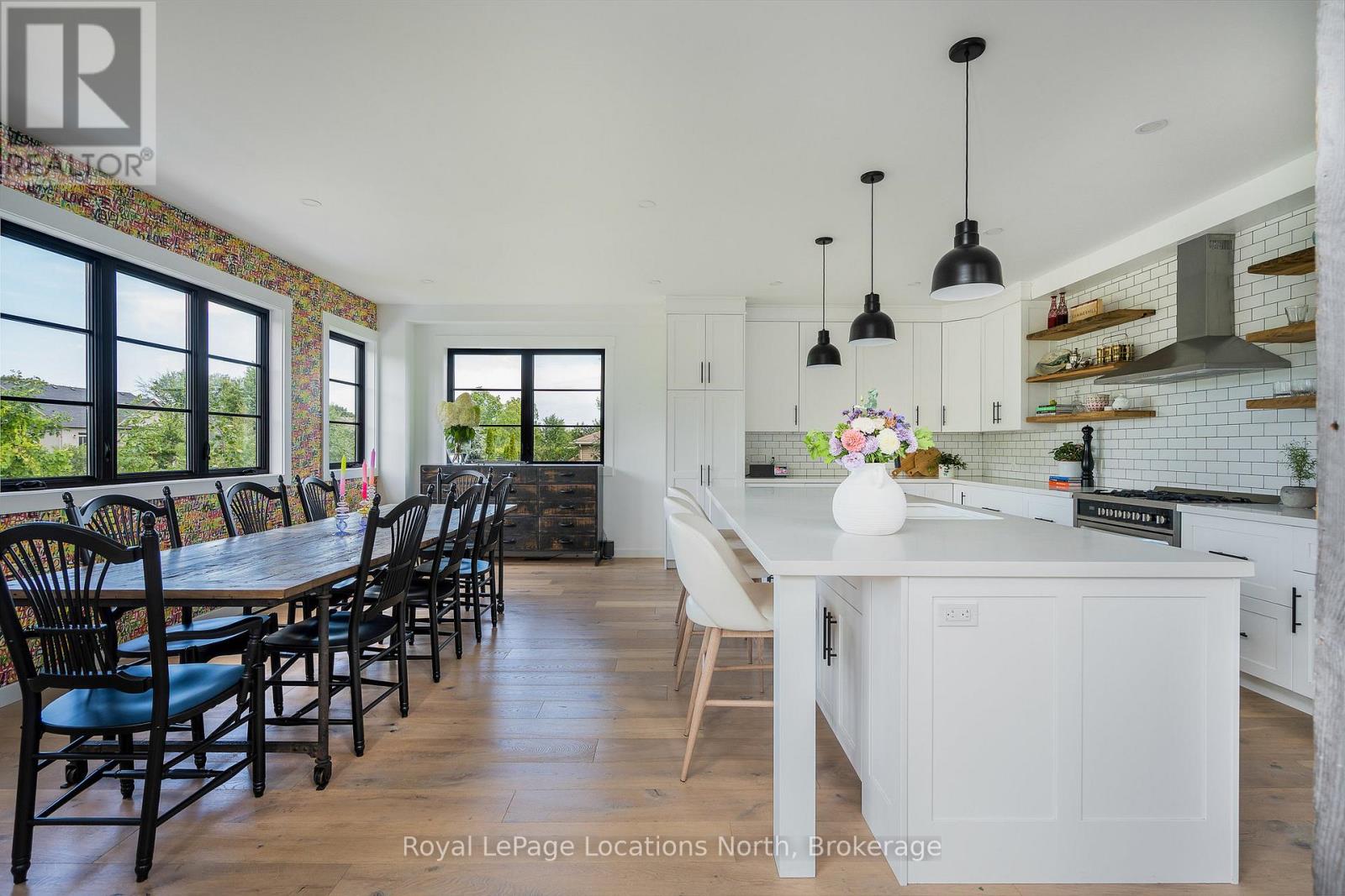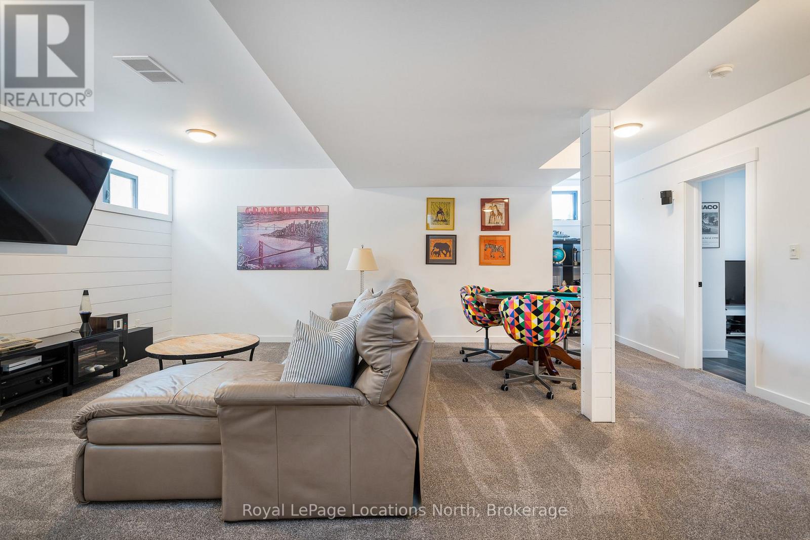 Welcome to one of Collingwood's most exclusive addresses, where elegance and comfort blend seamlessly in this custom-built two-storey home. Set on an impressive 66 x 167 ft full town lot, this residence offers over 3,700 sq ft of beautifully finished living space, with 5 bedrooms and 4 bathrooms designed for modern family living and entertaining. From the moment you step inside, soaring ceilings and sun-filled windows create a sense of openness and light. The main floor showcases wide-plank white oak engineered hardwood and thoughtful details throughout. At the heart of the home, the gourmet kitchen invites gathering with its quartz countertops, oversized island, and high-end appliances. The living room makes a statement with its dramatic 20-ft ceiling, cozy gas fireplace, and expansive sliding doors that lead to a private and peaceful backyard. Upstairs, retreat to the luxurious primary suite with remote-controlled blinds, a spacious walk-in closet, and a spa-inspired ensuite featuring double sinks, glass shower, and soaker tub. Two additional spacious bedrooms share a stylish Jack & Jill bathroom, perfect for family or guests. The fully finished lower level extends the living space with a generous recreation room, two more bedrooms, and a five-piece bath. Modern touches like shiplap and barnboard accents bring warmth and character throughout. Outdoors, enjoy a two-tiered deck and hot tub surrounded by nature. The large, private yard would be perfect for a pool. With amazing neighbours, a walkable location to Collingwood's best schools and downtown, and endless style and comfort, this home is truly a must see. (id:64974)