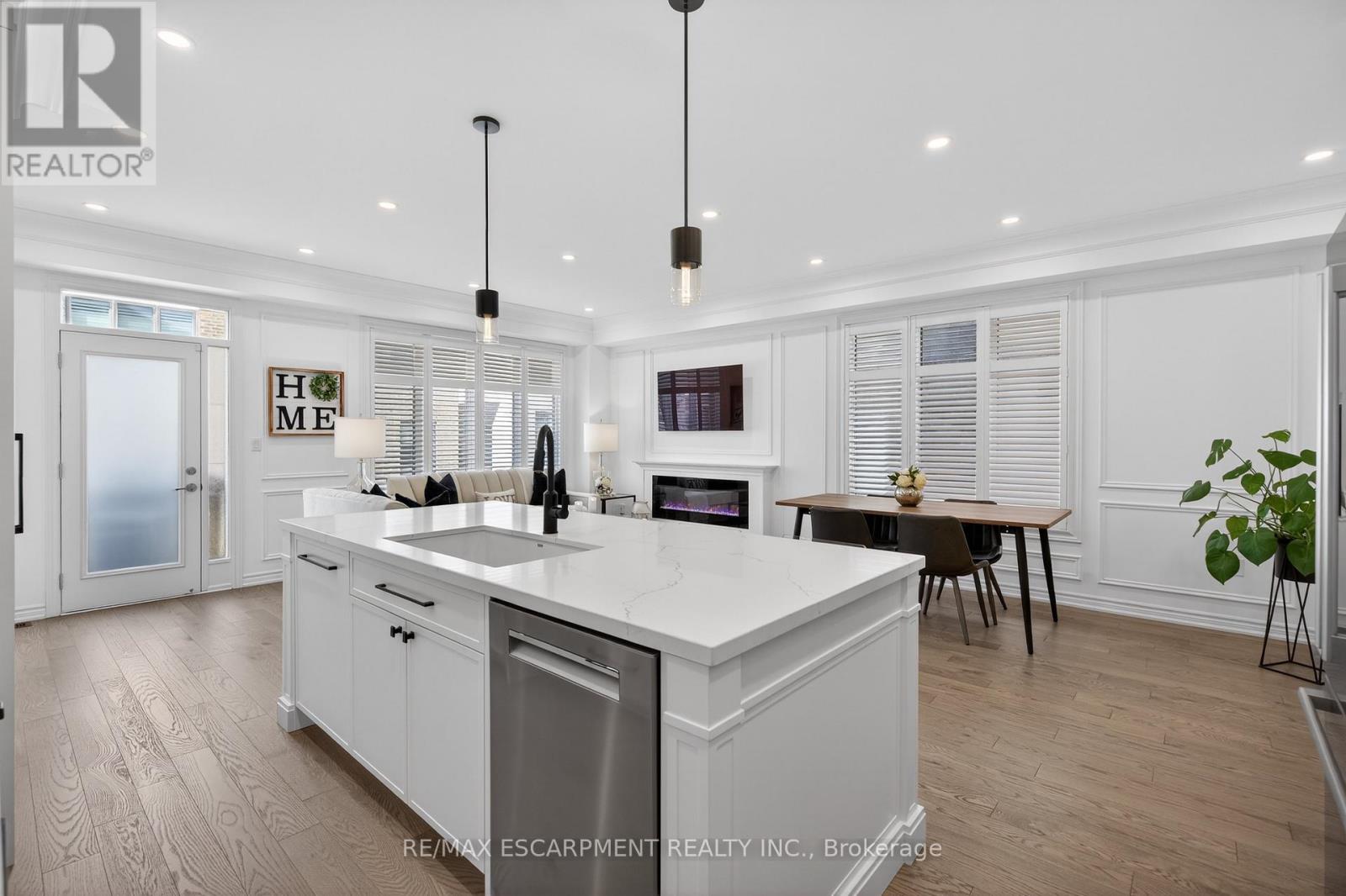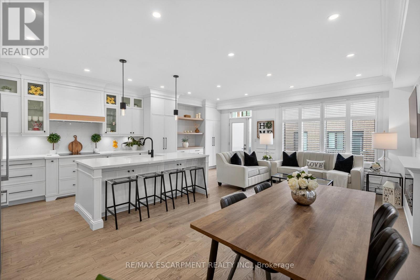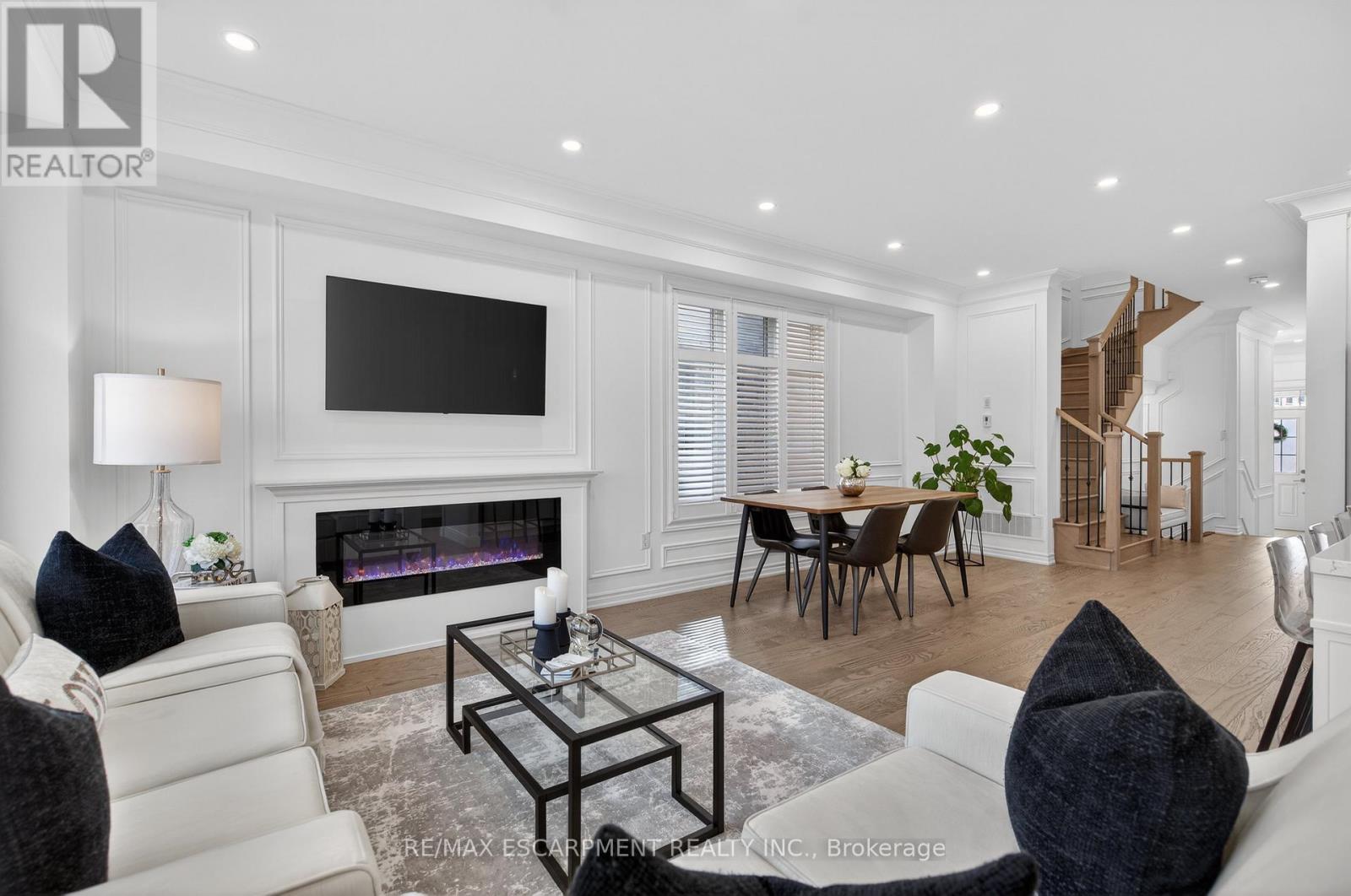 Welcome to this gorgeous, one-of-a-kind 4-bedroom end-unit townhome, ideally located on a quiet street in the highly sought-after South West Walkers community. Thoughtfully designed and meticulously maintained, this home showcases upscale finishes and a functional, modern layout perfect for families and entertainers alike. Main Level Open-concept layout with smooth ceilings, elegant crown moulding, and custom wainscoting, Upgraded engineered hardwood flooring and California shutters throughout , Pot lights and an electric fireplace add a ambiance to the spacious living area, Renovated Chef inspired kitchen featuring a full wall of sleek cabinetry with glass inserts, Large pantry and quartz countertops, Generous island with breakfast bar, Under-cabinet lighting, stylish backsplash, and built-in stainless steel appliances, elegant oak staircase with iron pickets leads to upper level, Four generously sized bedrooms including a Luxurious primary retreat complete with walk-in closet and spa-like ensuite, featuring a glass shower, soaker tub, and double sinks, upper level laundry, main bath has double sinks, Located minutes from top-rated schools, Walker Park, scenic trails, Hwy 401 & 407, Milton Sports Centre, Sherwood Community Centre, Milton District Hospital, Rattlesnake Point Golf Club, and so much more. Don't miss your chance to own this exceptional home in a vibrant, family-friendly neighbourhood! (id:64974)