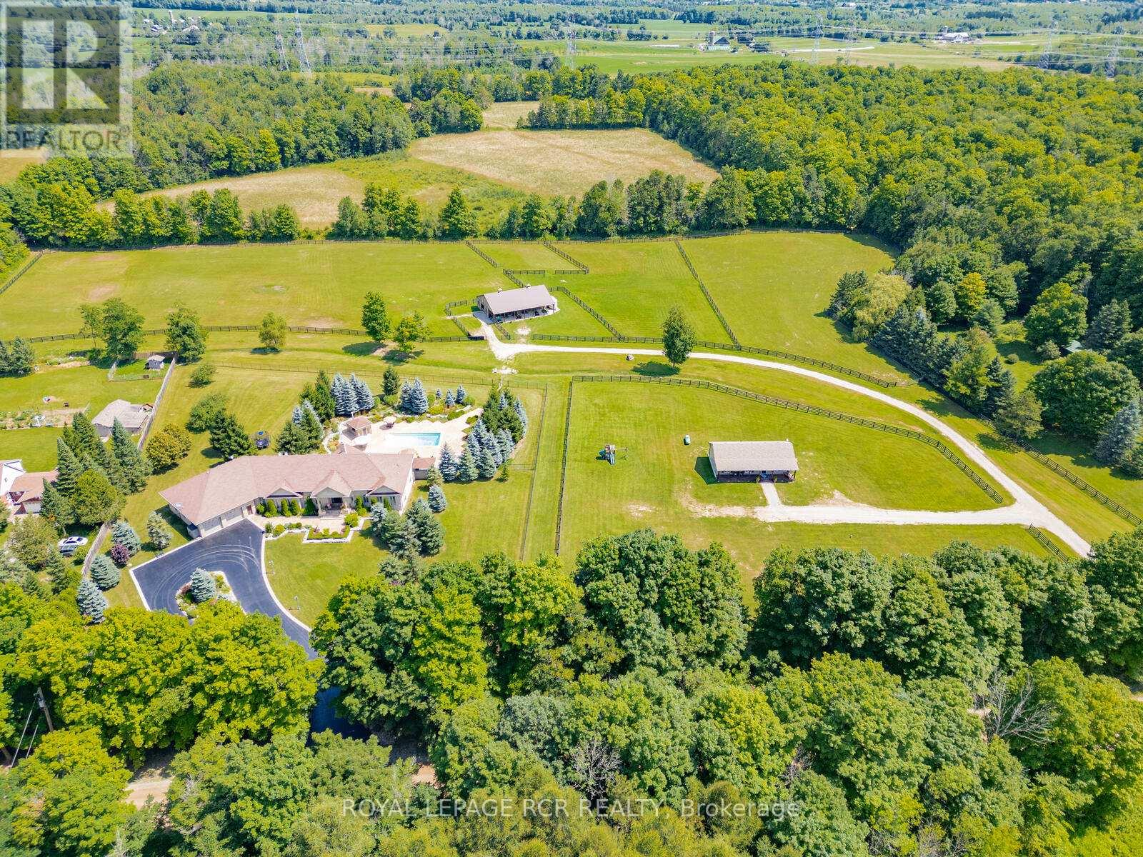 Welcome to this stunning multi-generational country property situated on 44 acres near Acton. Enter the main house through automated electronic front entry gates. Features of the main house include nearly 5000 sq. ft. of luxury living. Maple kitchen w/ granite countertop and backsplash overlooking a large eat-in area with walk-out to large deck overlooking the pool and backyard. Thermador and Miele s/s appliances. Separate and formal open-concept dining room. Open-concept living room w/ cathedral ceiling and wood burning fireplace. Main floor office. Primary bedroom w/ walk-in closet 4 pc ensuite and walk-out to deck overlooking the 18 x 36 heated salt water pool w/ electric pool cover. Main floor laundry and a second laundry in the basement. Huge 9 car attached garage with access to the house and backyard. Fully finished walk-out basement set up as an in-law suite with full kitchen with granite countertop and centre island, large and bright bedroom with 3 pc semi-ensuite bath, , living , dining and games room and tons of storage. Gorgeous backyard with extensive wrought iron fencing. Multiple dining areas. 10 x 10 pool cabana. Approximate 4000 sq. ft. of stone decking with extensive landscaping and stunning gardens. 12 zone, 60 head sprinkler system for front and rear gardens. New roof 2025. 30 x 60 Gara Farm Structures barn with 6 System Fencing stalls, separate tack room and large hay storage area. 5 large oak-board paddocks with room for more and a separate driveway to the barn. Lots of room to add an indoor arena if desired. Updates include new geo-thermal furnace in 2022, new pool pump 2024, new pool heater and chimney 2023, Miele dishwasher 2024, Miele induction stove-top and wine fridge 2023. Generator for the full main house. The secondary dwelling features 3 +2 bedrooms. 2.5 baths, partially finished basement. Main floor laundry. Large eat-in kitchen. Separate septic system and drilled well. Propane furnace & central air conditioning. Built in 2018. (id:64974)