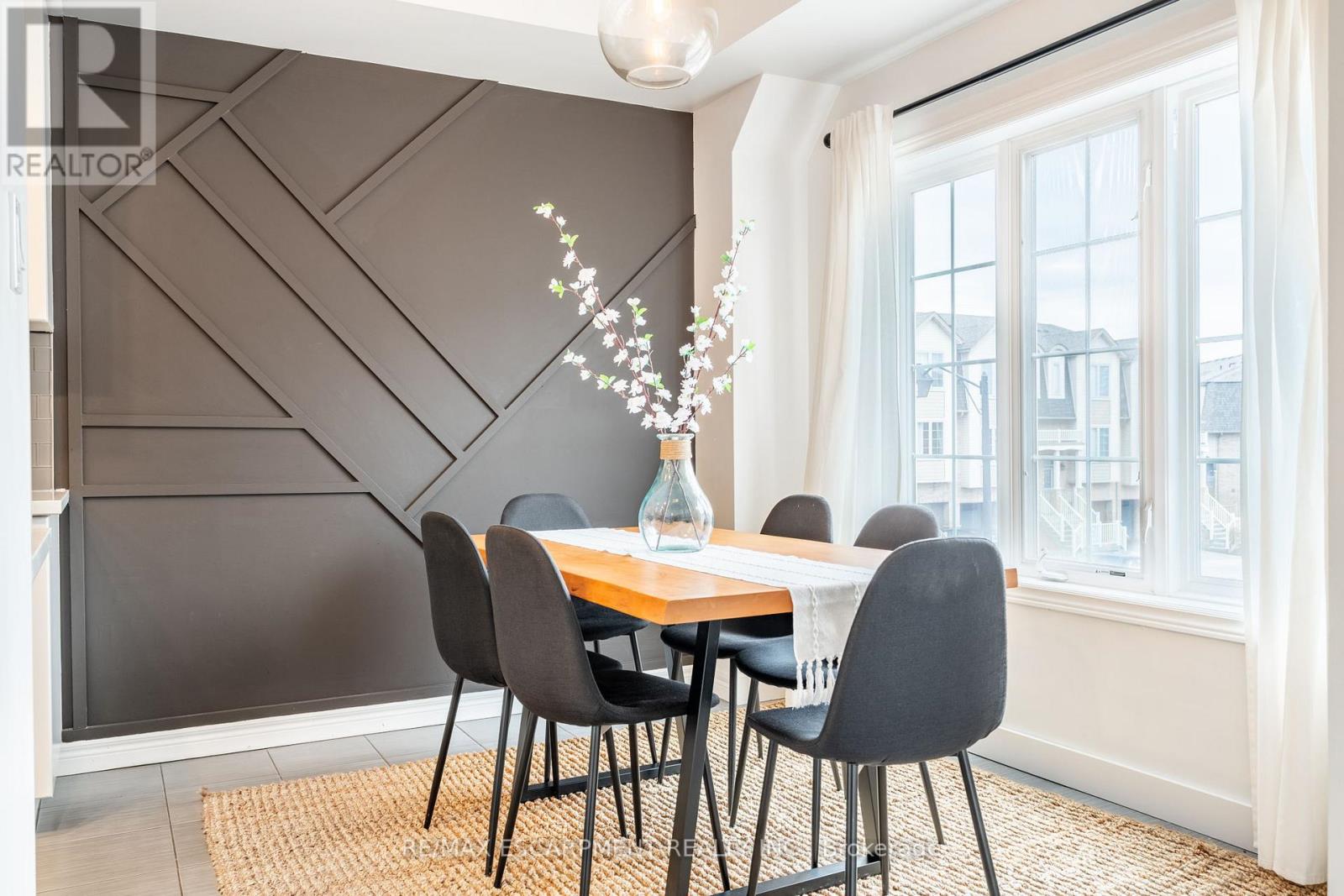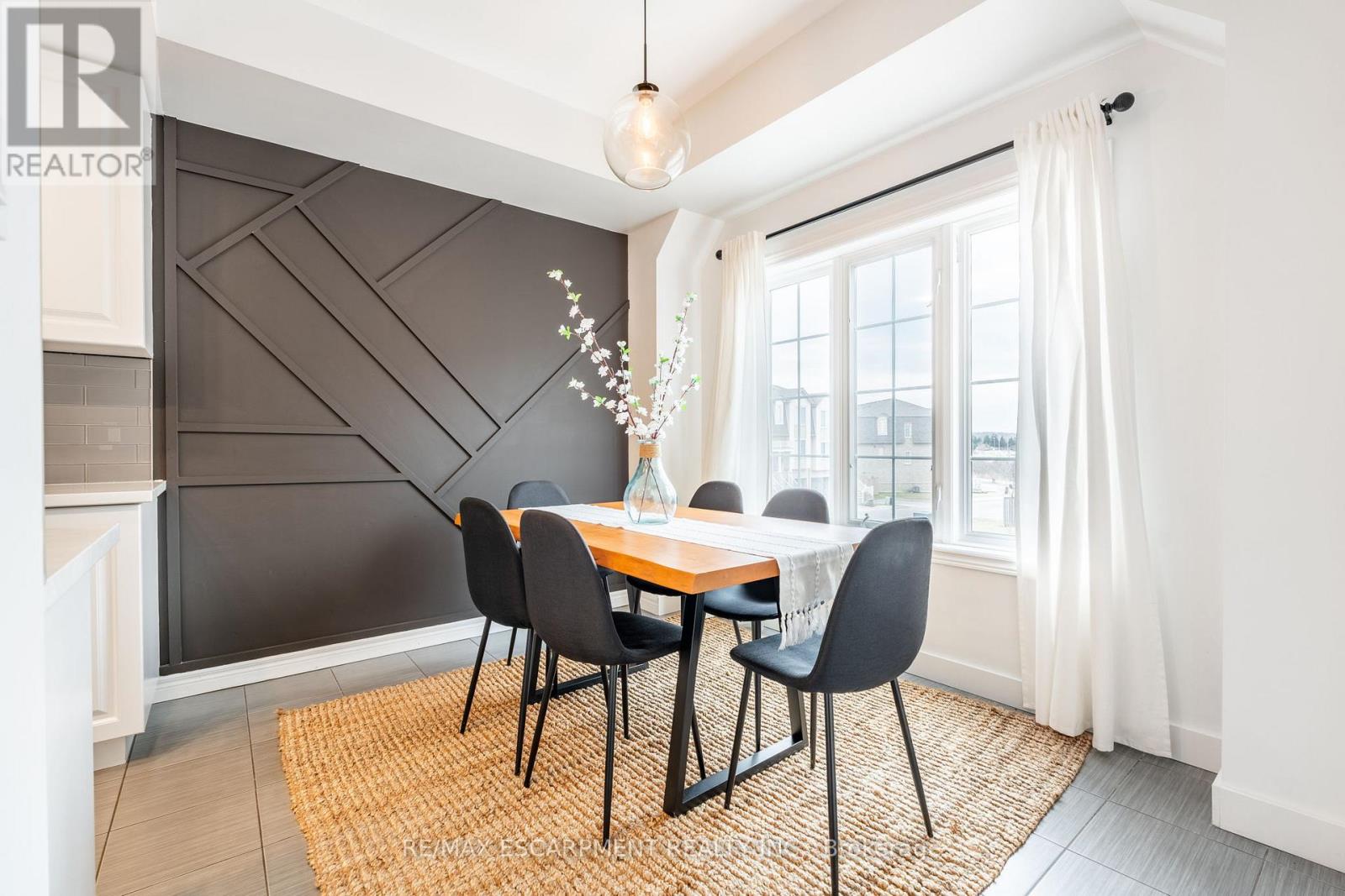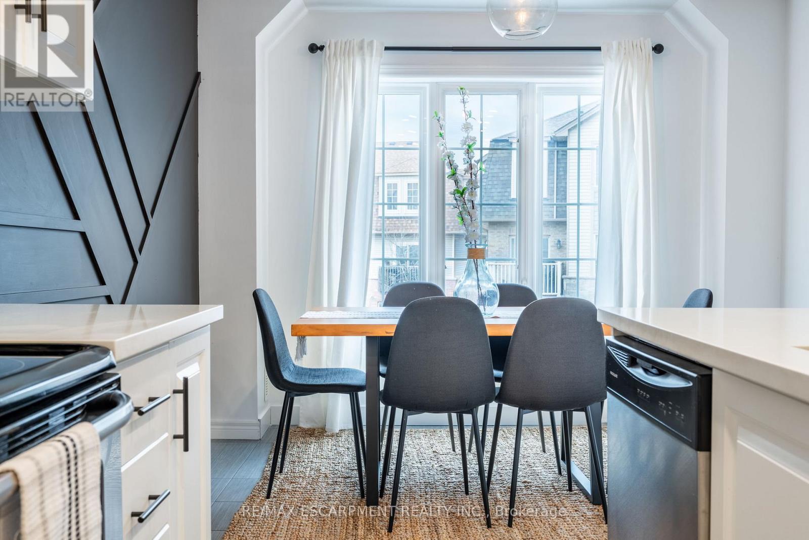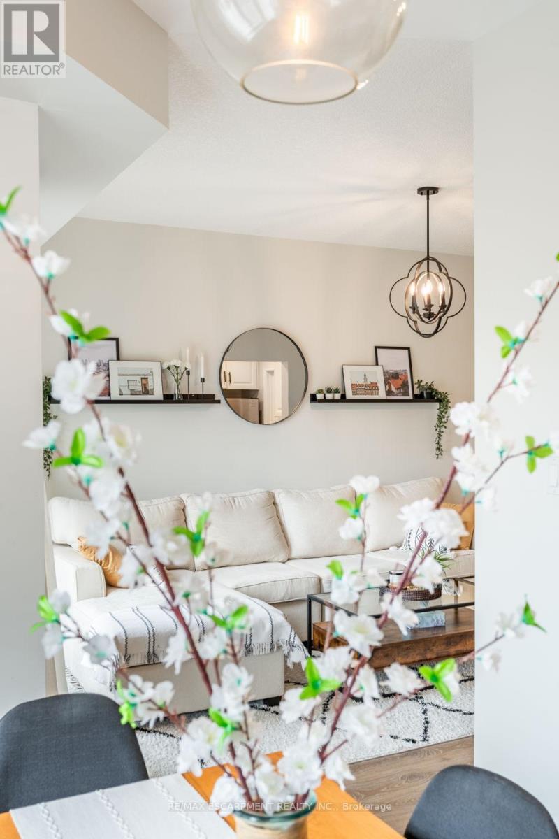 Feel immediately at home. This thoughtfully designed entryway sets the tone with its charcoal accent wall and bright natural light streaming through flanking windows. Cool-toned tile flooring flows underfoot, while a built-in nook offers the perfect spot to drop your keys and settle in. Every detail speaks to the care and attention invested in this Stoney Creek gem. Laminate floors stretch across this sun-filled living space, creating an open canvas for your daily life. The built-in media niche with its contrasting accent wall becomes a natural gathering point, while sculptural pendant lighting adds character overhead. Balcony access invites fresh air and natural light to flow freely, making this the kind of space where you'll actually want to spend your evenings unwinding. The dining room transforms ordinary meals into occasions worth savouring. The accent wall with geometric panelling creates an intimate backdrop, while expansive windows frame neighbourhood views and flood the space with daylight. Positioned perfectly between kitchen and windows, this spot becomes the heart of your home-where morning coffee tastes better and dinner conversations last longer. Stunning kitchen delivers everything you need without the fuss. Crisp white shaker cabinets pair with stainless steel appliances and gleaming quartz countertops, while grey subway tile backsplash adds subtle sophistication. Modern black hardware and thoughtful recessed lighting make meal prep a pleasure, and the open connection to your dining area means you're never cooking alone. Your primary bedroom wraps you in calm with its soothing sage green accent wall and warm laminate underfoot. The walk-in closet keeps everything organized and out of sight, while layered window treatments let you control the light exactly how you want it. Clean, functional, and thoughtfully updated bathrooms make daily routines feel less like chores. This one stands out from the rest - not to be overlooked! (id:64974)