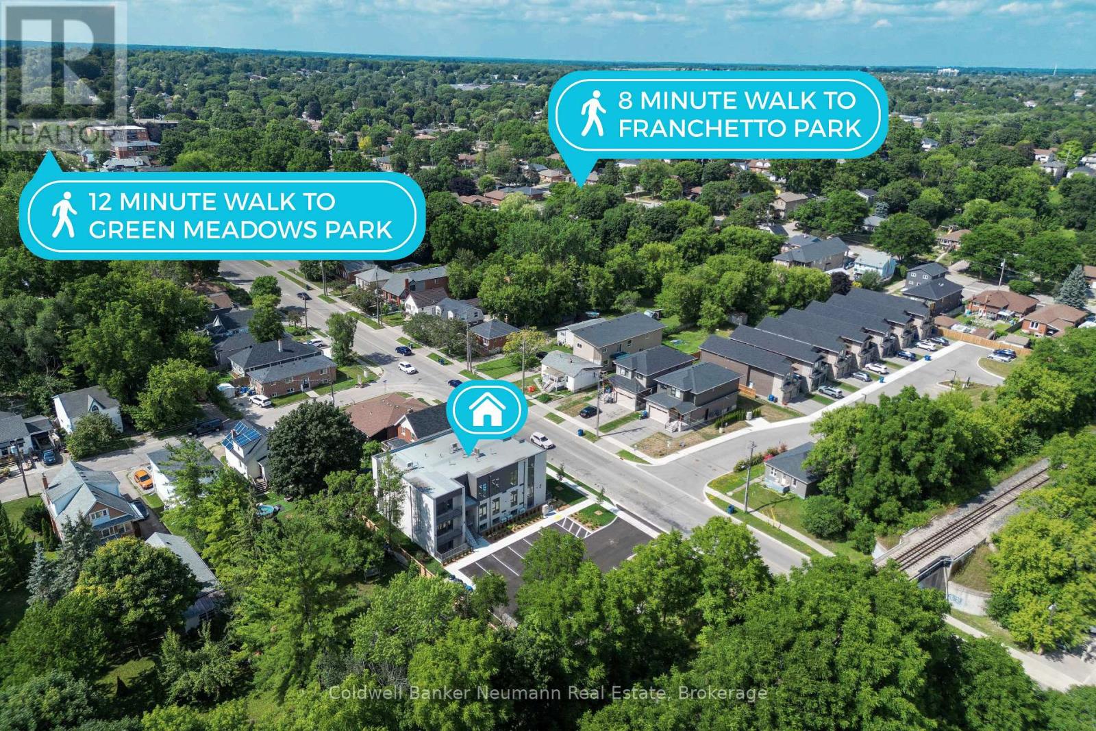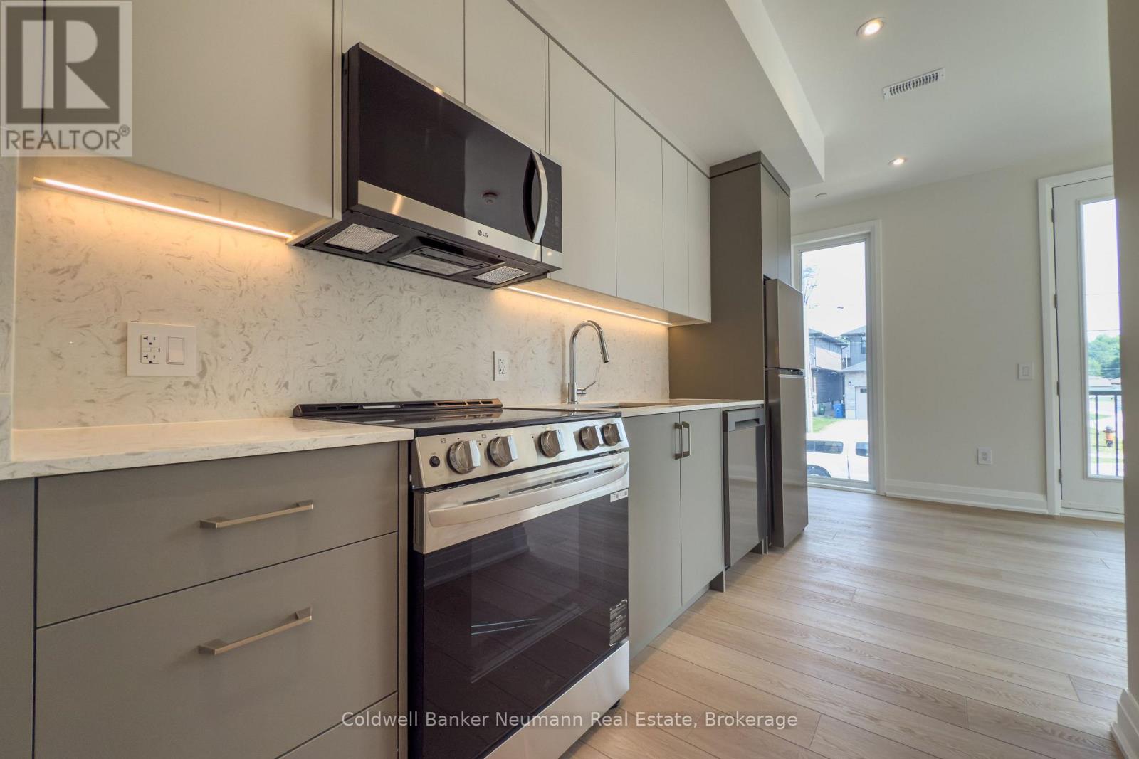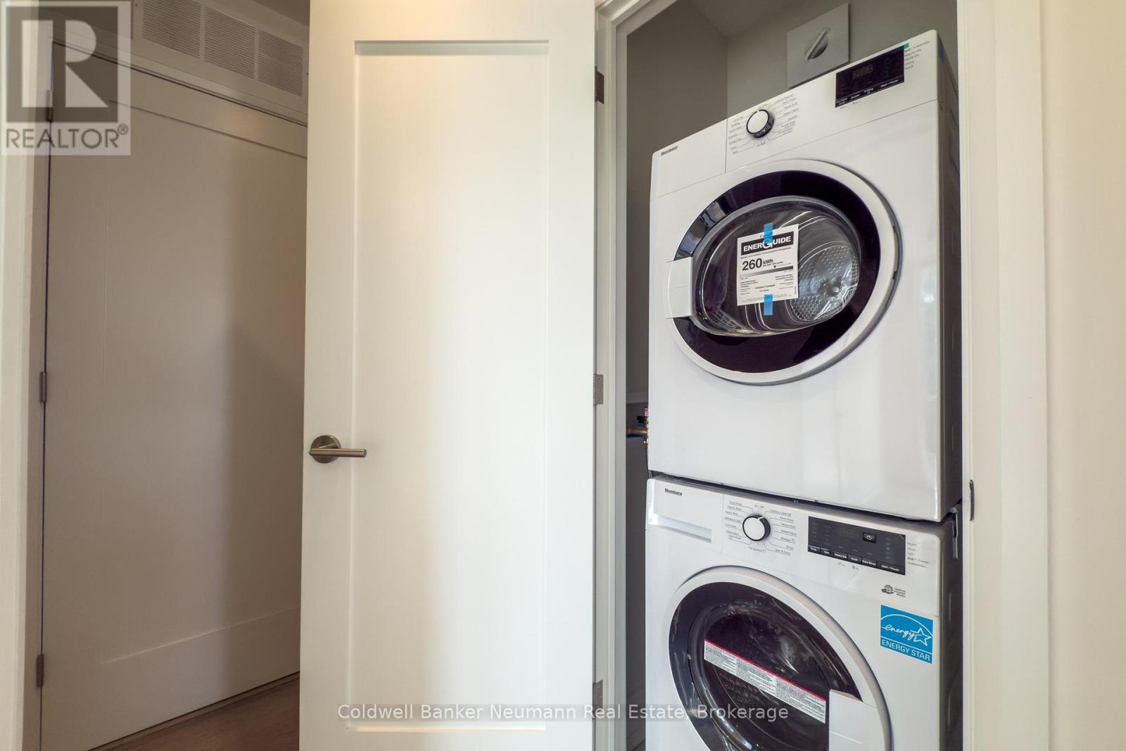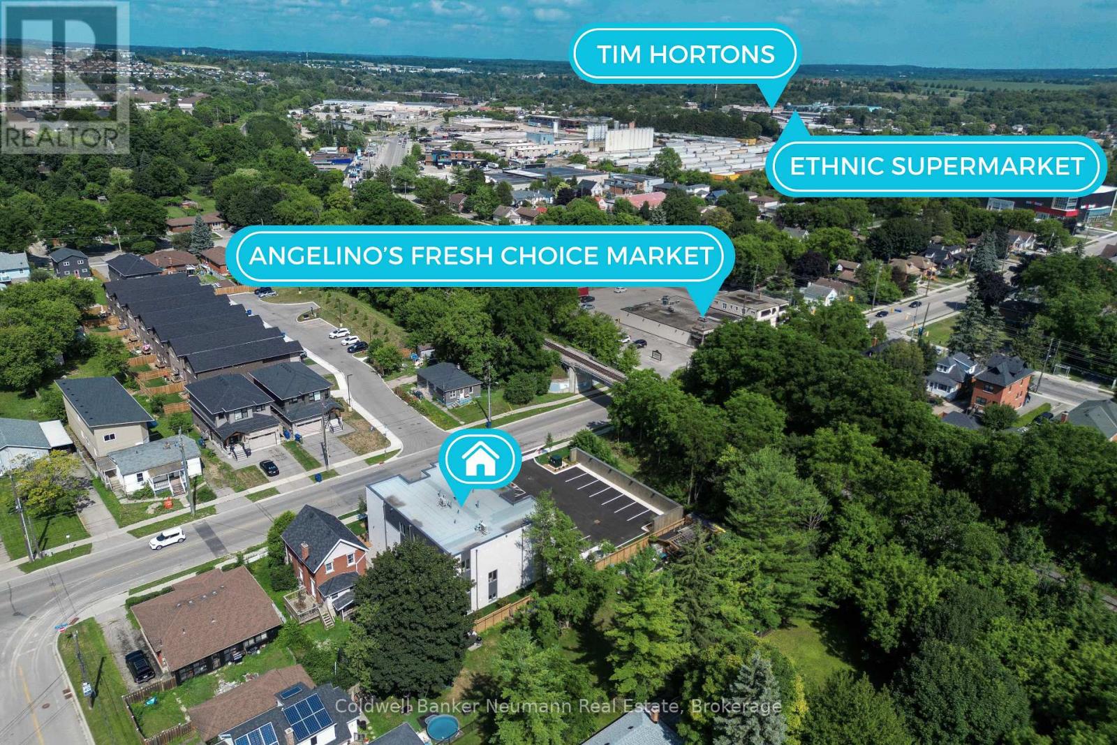 Welcome to this new 1-bedroom, 1-bathroom condo in the heart of Guelph, never lived in and finished with modern, neutral tones throughout. The stylish kitchen features quartz countertops, sleek cabinetry, full-size stainless steel appliances, and under-cabinet lighting, flowing seamlessly into a bright, open-concept living space with walkout to a private balcony. Enjoy the convenience of in-suite laundry and a thoughtfully designed layout that maximizes both comfort and functionality. Ideally located just steps to Angelino's Market, a well-established hair salon, and minutes from downtown Guelph, St. George's Park, the Italian Canadian Club, Zehrs, Ethnic Supermarket, and GoodLife Fitness, this is an excellent opportunity to enjoy low-maintenance living in a highly connected neighbourhood. (id:64974)