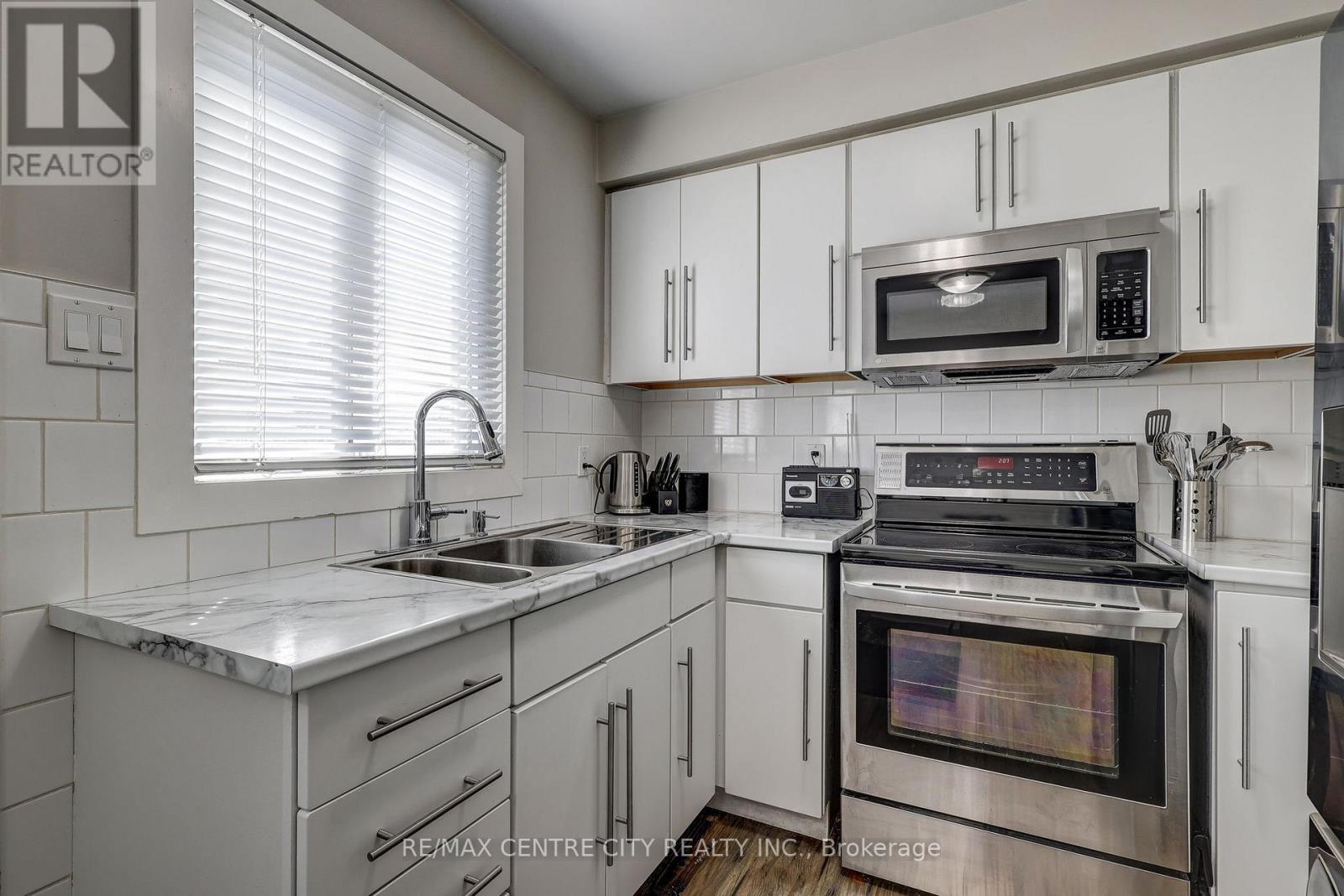 Welcome to 1443 Huron St. This fully renovated 3-bedroom townhome combines modern style, comfort, and functionality in a prime location. Thoughtfully updated throughout, it features 1.5 contemporary baths and a finished basement with radiant in-floor heating, pot lights, built-in speakers, and ample storage a versatile space ideal for family living or entertaining. At the heart of the home is the beautiful eat-in kitchen, highlighted by an island with a built-in dishwasher, newer stainless steel appliances, and a convenient water line to the fridge. Step directly outside to your private fenced patio with raised garden beds, built-in seating, and space for a BBQ the perfect spot to relax, garden, or host friends. The spacious living and dining room boasts a bright, open layout designed for everyday living and gatherings alike. Recent updates include fresh paint, new flooring, trim, upgraded electrical outlets with USB ports, light fixtures, sleek ceiling fans, and an owned hot water tank (2024) offering both style and peace of mind. Located close to shopping, restaurants, Stronach Community Recreation Centre (featuring a swimming pool, Arena, Baseball Diamonds, skate park, lots of green space to run around and play) and Fanshawe College, this property is ideal for first-time buyers, families, or investors seeking a turnkey opportunity. Don't miss your chance to move right in and enjoy a modern, low-maintenance lifestyle in an unbeatable location! (id:64974)