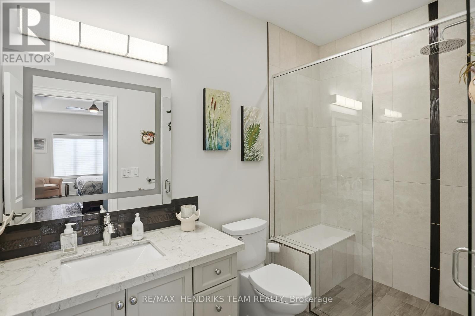 Beautifully upgraded end unit bungalow townhome by Grey Forest Homes in sought-after Fonthill. A covered porch leads into a bright foyer with coffered 10 foot ceilings, while the main floor showcases impressive 9 to 12 ft ceiling heights, wide plank engineered hardwood, high-end ceiling fans and light fixtures, and dual-function sheer blinds throughout. The front hall offers direct access into the double car garage with insulated door and LiftMaster opener.The guest bedroom, currently used as an office, features a cathedral ceiling and transom windows. Nearby is a stunningly upgraded 3pc bath with freestanding soaker tub, beautiful floor-to-ceiling tiled feature walls, and waterfall-edge vanity, along with a convenient oversized laundry closet. The living room impresses with vaulted ceilings, pot lighting, and a floor-to-ceiling stone gas fireplace. The extended kitchen features quartz counters, a waterfall island, tiled backsplash, valance lighting, and upgraded Samsung graphite appliances. Step out from the dining area to a 16x12 composite deck with power awning and gas bbq line, overlooking a lower patio area. The primary suite offers coffered ceilings, walk-in closet, and a private ensuite with quartz counters, towel storage shelving, and a glass/tiled shower with bench. An open railing staircase leads to a bright lower level featuring oversized windows, luxury vinyl plank flooring, a huge family room with home office area, a large 3rd bedroom with double closet, 3pc bath with step-in shower, and a storage room. Includes 200amp service, C/A, HRV and superior wood I-beam floor joists. Enjoy a "lock & leave" lifestyle with low-maintenance living and a minimal condo fee covering landscaping and snow removal - offering strong value compared to traditional condo fees. Visitor parking is conveniently located across from the home. A rare blend of quality construction, thoughtful upgrades, and easy living in one of Niagara's most desirable small town feel communities! (id:64974)