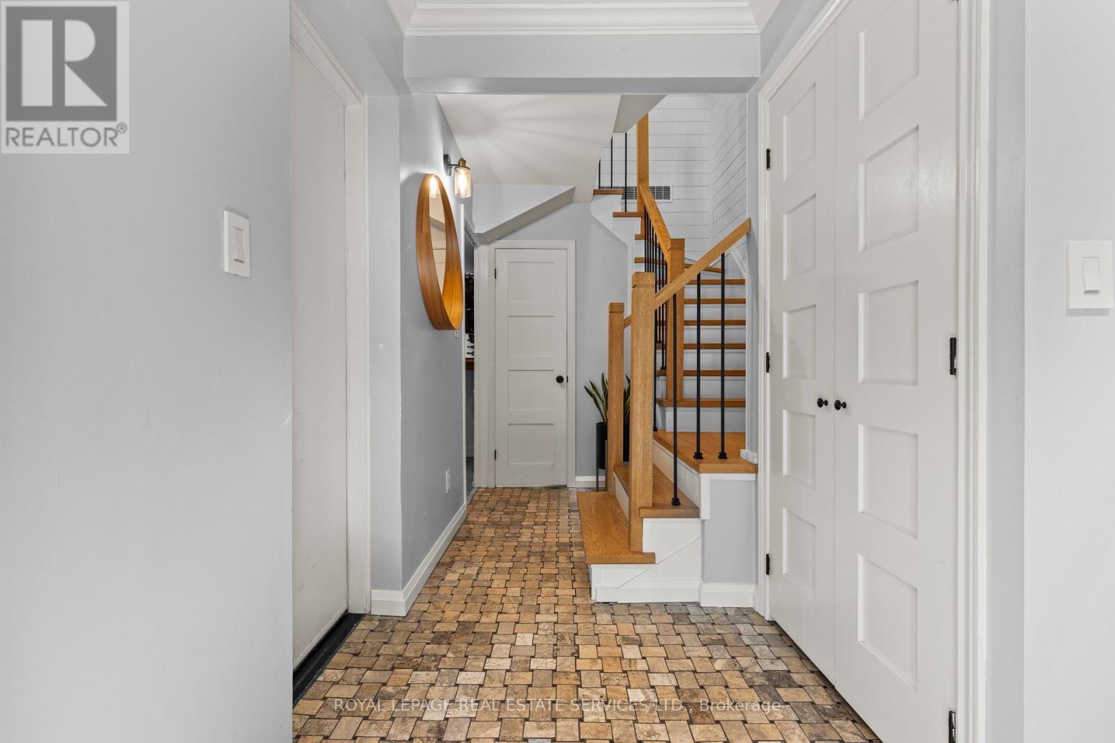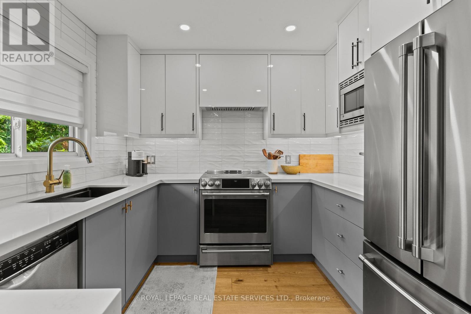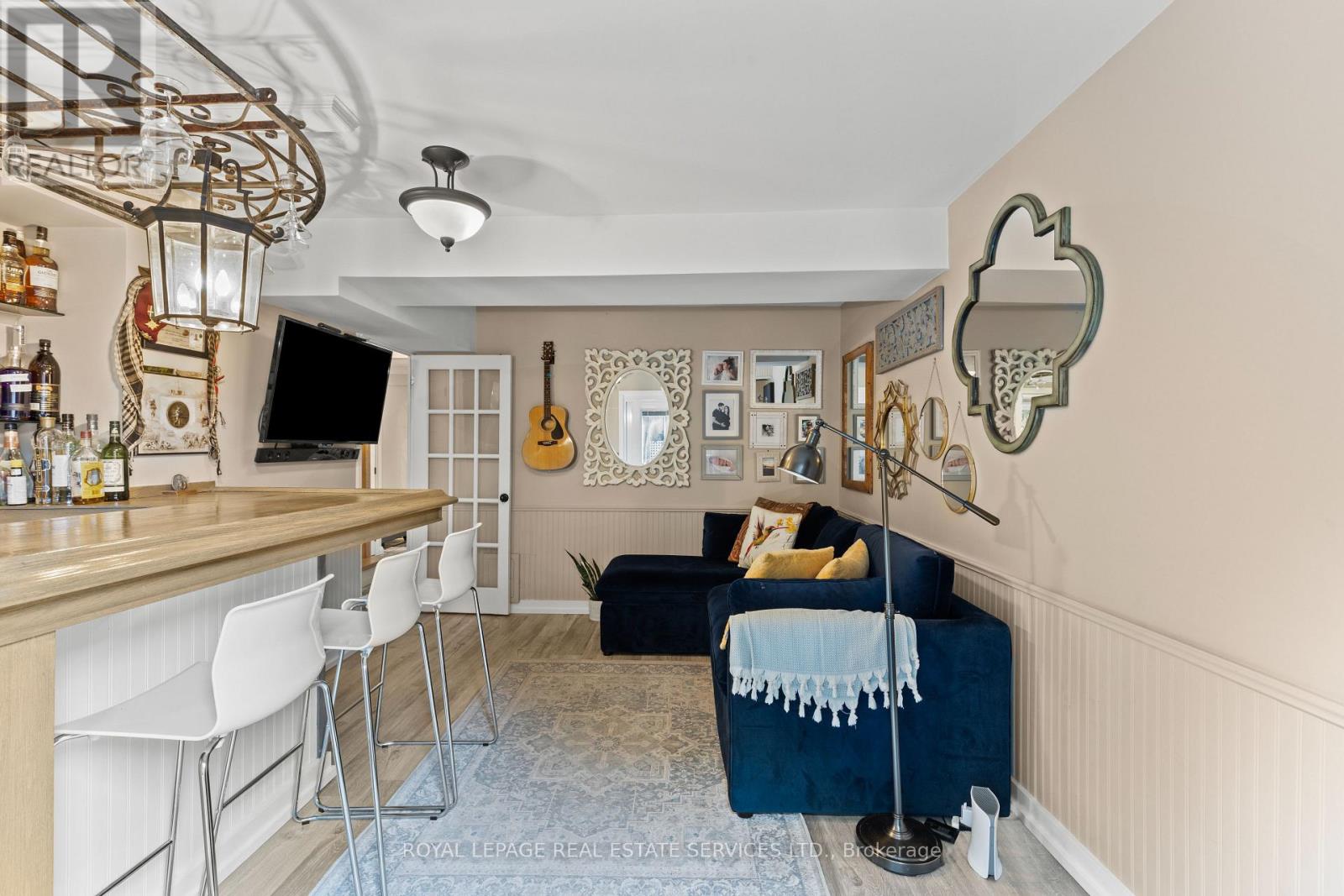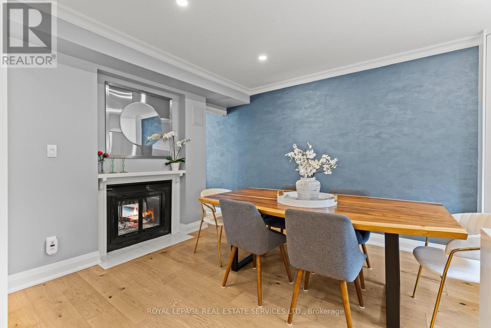 Beautiful Freehold End Unit Townhome in the Heart of Bronte. Welcome to 2303 Marine Drive, Unit5, a rare freehold end-unit townhome in the heart of Bronte Village. Just steps from the lake, marina, & the vibrant shops & restaurants of Bronte, this home offers a lifestyle that is both relaxing & connected. Unique from all the other units in the complex, this home has been extensively updated with stylish finishes & thoughtful design. A custom wood staircase, shiplap detailing, & a striking double-sided fireplace, accessible from both the living and dining rooms create warmth & character that truly set this property apart. A skylight floods the upper level with natural light, enhancing the bright, airy feel throughout. The updated kitchen (2023) features granite countertops & backsplash, while the primary suite is a true retreat with custom built-in double closets, additional storage, & a spa-inspired ensuite with heated floors. The family room is designed for entertaining with a custom bar, &the extended foyer offers an impressive welcome. Hardwood flooring, elegant window coverings, central vacuum, and an inground sprinkler system add both convenience & style. This home also offers two outdoor living spaces: a private back patio perfect for summer gatherings (2024), and a second patio above the garage with walkout access from the living room, the ideal spot for morning coffee, evening cocktails, or simply enjoying the breeze from the lake. Additional highlights include two fireplaces, quality appliances (2023), professional landscaping, an attached garage with inside entry, plus the peace of mind of a new furnace(2022), A/C (2022), tankless water heater (2022), windows (2022) and roof (2017). With just a $120/month maintenance fee, this property combines low-cost ownership with premium living. Dare to compare, this end-unit is truly one of a kind in Bronte. (id:64974)