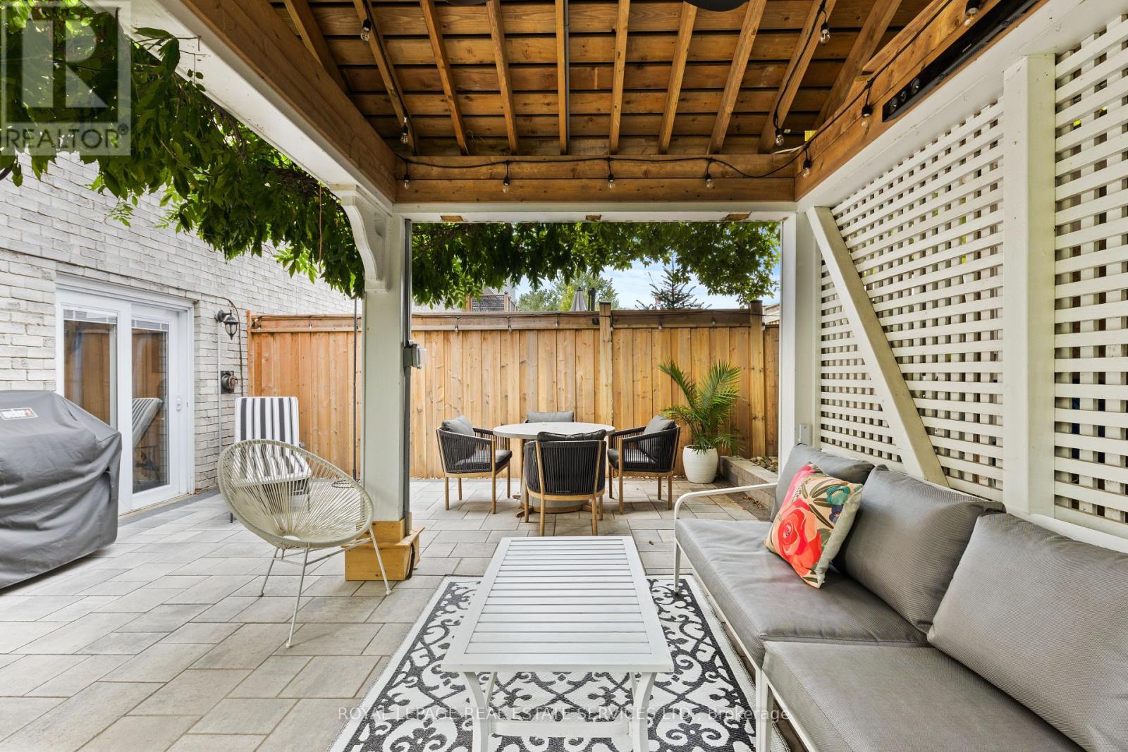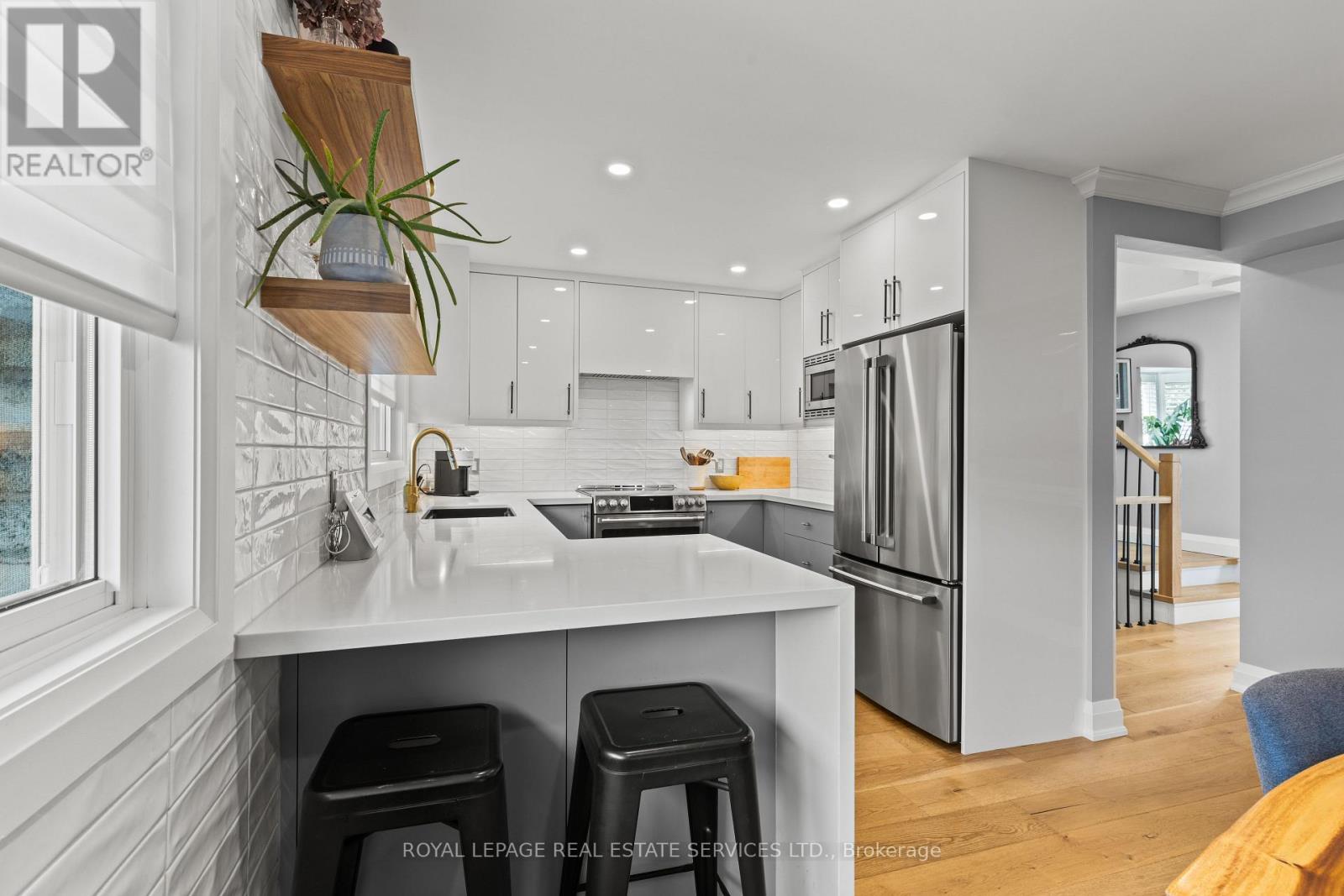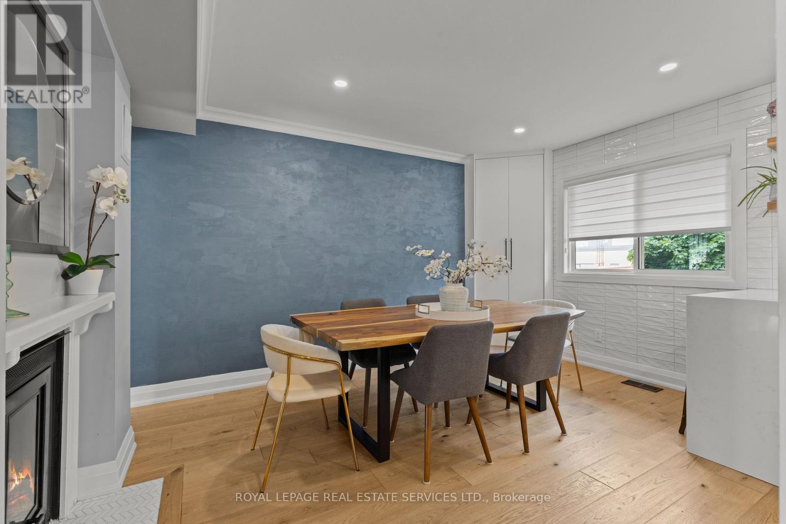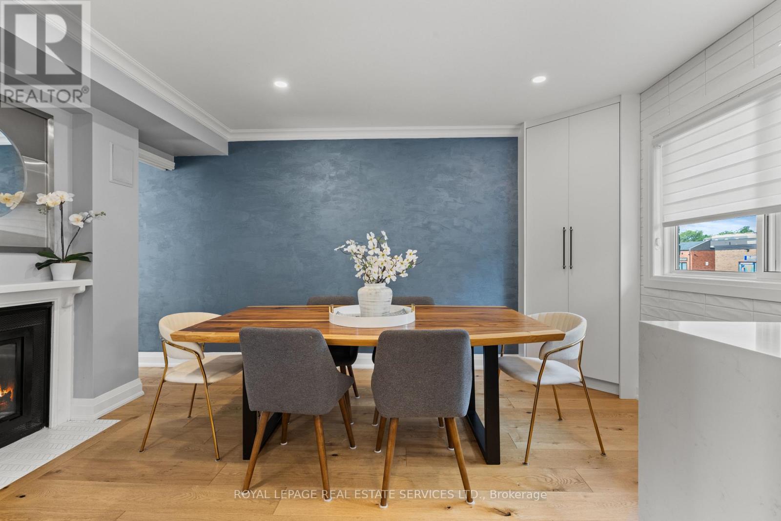 Beautiful Freehold End Unit Townhome in the Heart of Bronte. Welcome to 2303 Marine Drive, Unit5, a rare freehold end-unit townhome in the heart of Bronte Village. Just steps from the lake, marina, & the vibrant shops & restaurants of Bronte, this home offers a lifestyle that is both relaxing & connected. Unique from all the other units in the complex, this home has been extensively updated with stylish finishes & thoughtful design. A custom wood staircase, shiplap detailing, & a striking double-sided fireplace, accessible from both the living and dining rooms create warmth & character that truly set this property apart. A skylight floods the upper level with natural light, enhancing the bright, airy feel throughout. The updated kitchen (2023) features granite countertops & backsplash, while the primary suite is a true retreat with custom built-in double closets, additional storage, & a spa-inspired ensuite with heated floors. The family room is designed for entertaining with a custom bar, &the extended foyer offers an impressive welcome. Hardwood flooring, elegant window coverings, central vacuum, and an inground sprinkler system add both convenience & style. This home also offers two outdoor living spaces: a private back patio perfect for summer gatherings (2024), and a second patio above the garage with walkout access from the living room, the ideal spot for morning coffee, evening cocktails, or simply enjoying the breeze from the lake. Additional highlights include two fireplaces, quality appliances (2023), professional landscaping, an attached garage with inside entry, plus the peace of mind of a new furnace(2022), A/C (2022), tankless water heater (2022), windows (2022) and roof (2017). With just a $120/month maintenance fee, this property combines low-cost ownership with premium living. Dare to compare, this end-unit is truly one of a kind in Bronte. (id:64974)