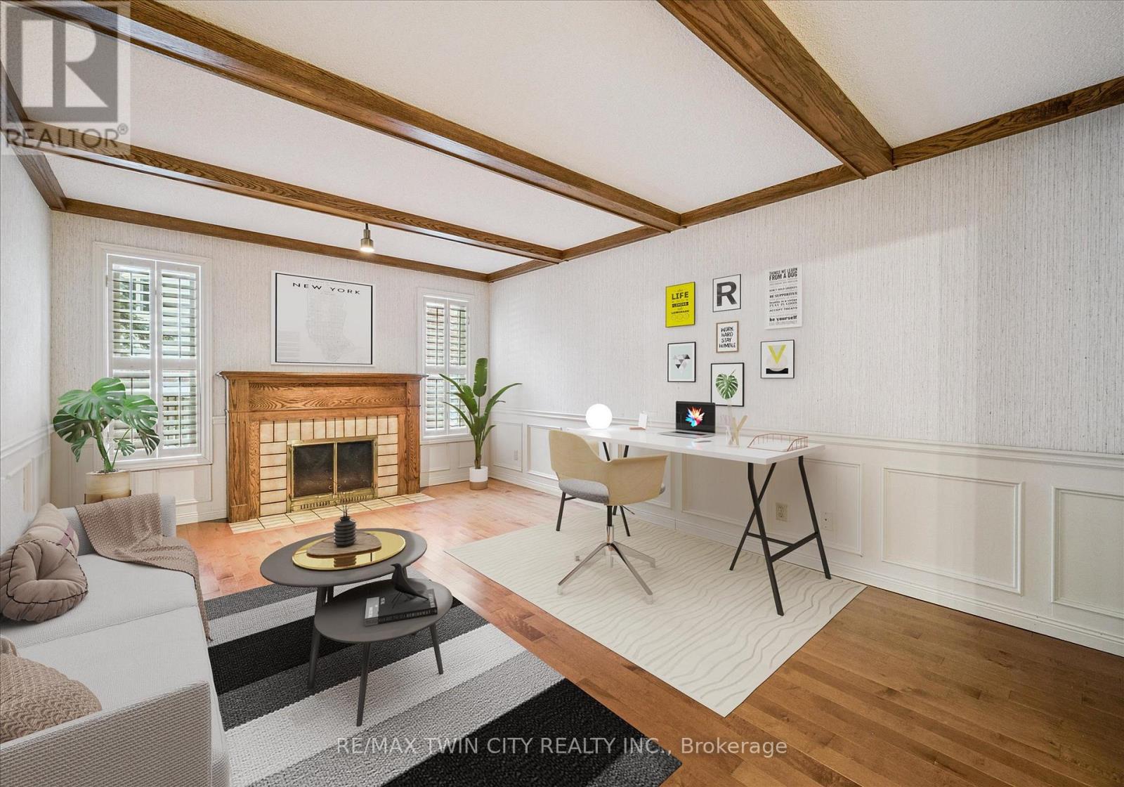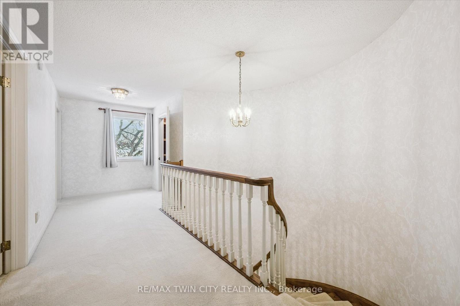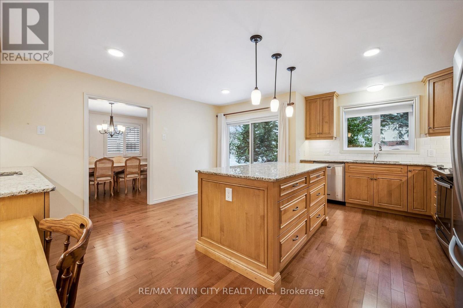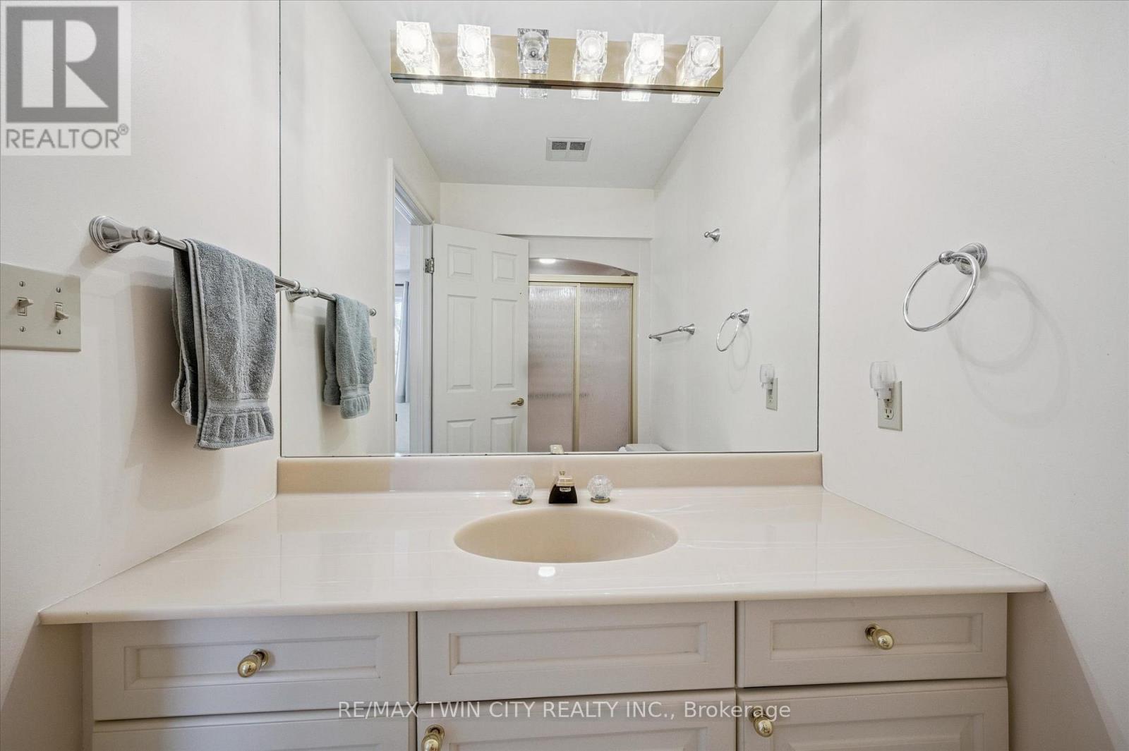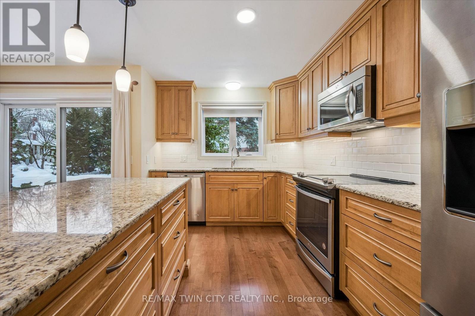 Custom-built executive condominium townhome in prestigious Westmount is one of just 8 units in the complex. It offers over 2600 sq.ft. plus a finished basement, a large 2-car garage, and interlock brick driveway. Ideal location with quick access to Belmont Village, Uptown Waterloo, and the Iron Horse Trail. This end unit, former builder's home, features a welcoming and spacious tiled foyer with sweeping staircase, updated hardwood flooring through the formal living room, dining room, and family room with gas fireplace. The updated kitchen has Brazilian granite counters, built-in appliances, a large island, and walkout to a private deck and landscaped yard. Upstairs you will find three generous bedrooms, including primary suite with walk-in closet and updated spa-like 5-pc ensuite that features a soaker tub, glass shower, and double vanity. Recent updates include newer roof (2017) and new windows throughout (2024). The finished lower level features a large rec room with wood-burning fireplace, 2-pc bath, workshop, and lots of storage. (id:64974)