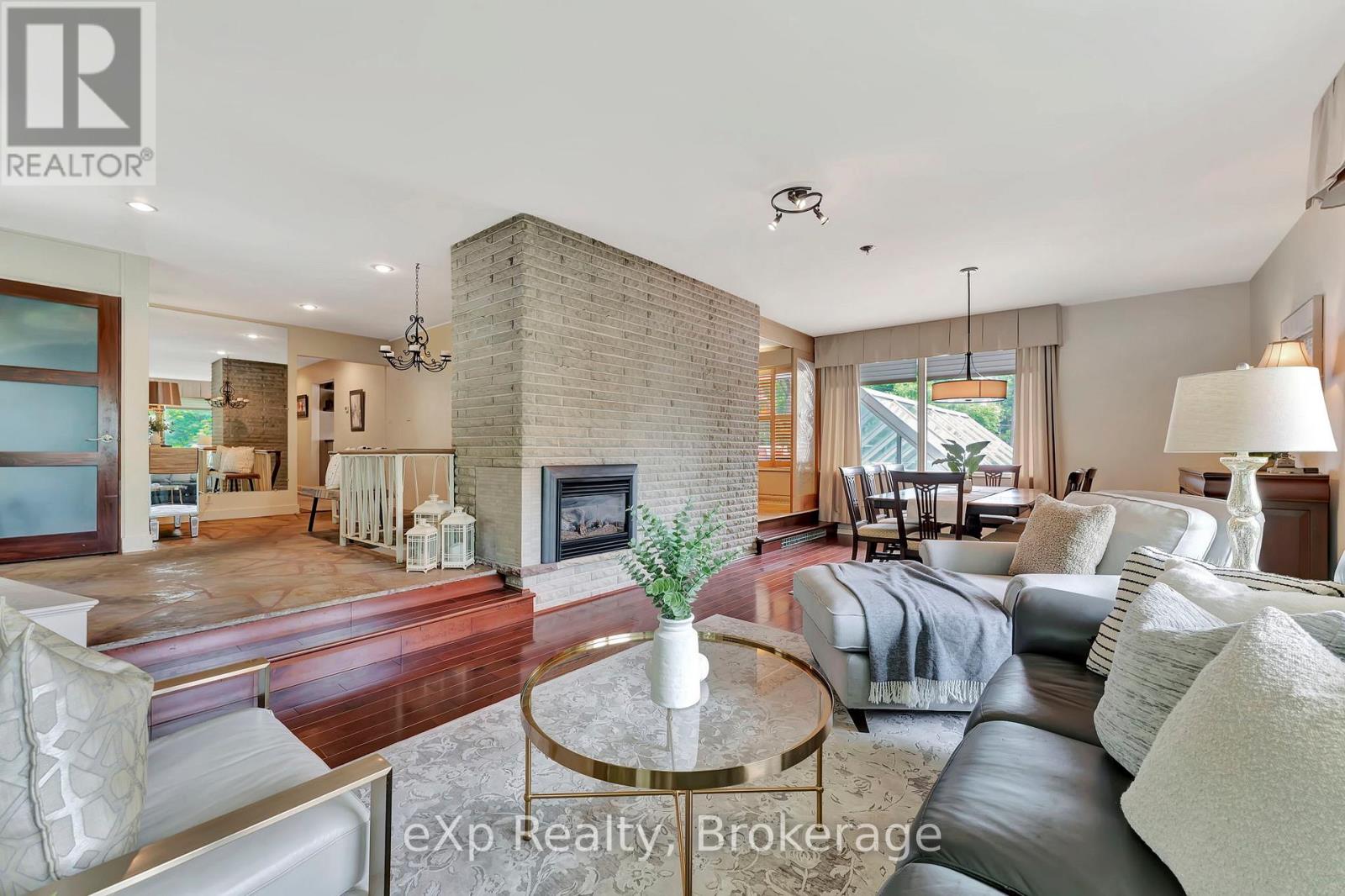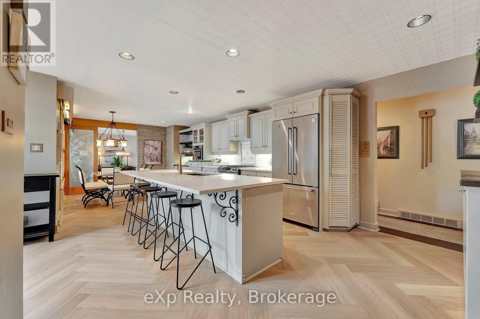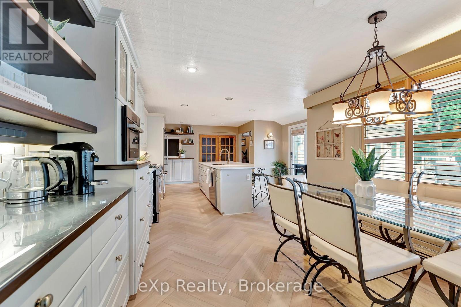 ***OPEN HOUSE SAT 2-4pm***SPRAWLING BUNGALOW WITH INDOOR POOL*** Nestled in one of Guelph's most desirable neighbourhoods and set on a beautifully landscaped 120 x 162 ft lot, this impressive 5-bedroom, 4-bath home offers a spacious layout designed for both everyday living and exceptional entertaining. A large, welcoming front porch sets the tone as you enter this charming home. At the heart of the main level is a chef-inspired kitchen featuring a large island, pantry, and high-end appliances, seamlessly flowing into a sunken dining area and an inviting living room with fireplace, while an additional family room opens to an expansive patio for effortless indoor-outdoor living. The main level offers 4 bedrooms, including a primary suite with walk-in closet and ensuite, complete with French doors leading to a private hot tub-your own personal retreat-along with a tucked-away laundry area for added convenience. The walk-out lower level further extends the living space with a spacious rec room, additional bedroom with wet bar and large bright windows, full bath, and direct pool access-ideal for entertaining or multi-generational living. Enjoy year-round relaxation with your own indoor pool and sauna, all within the comfort of home. Complete with a 3-car (2+1) garage and extended driveway, this home delivers an exceptional blend of space, comfort, and resort-style living in a truly beautiful setting. Call your REALTOR today for your own private viewing. ( (id:64974)