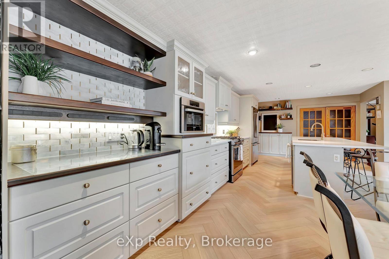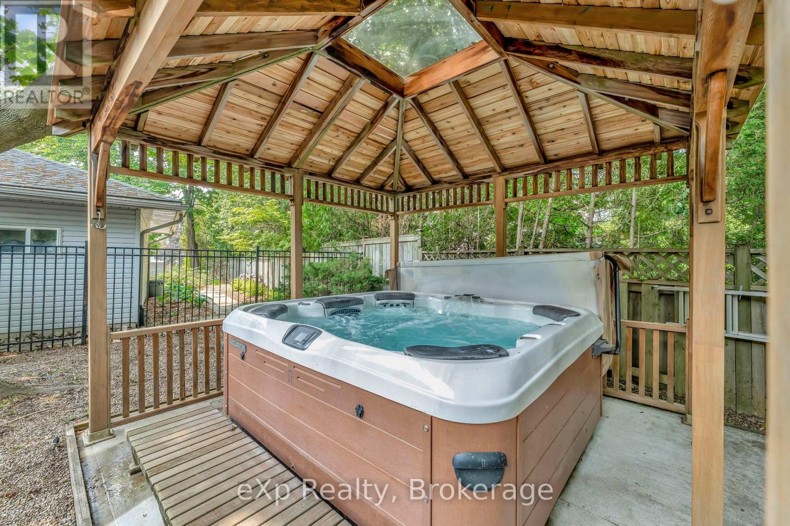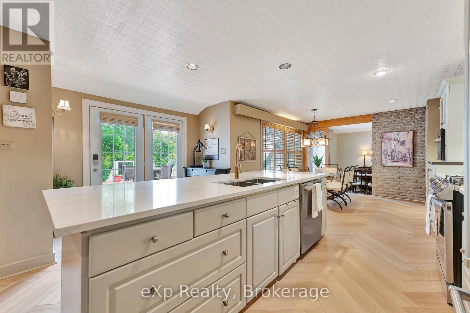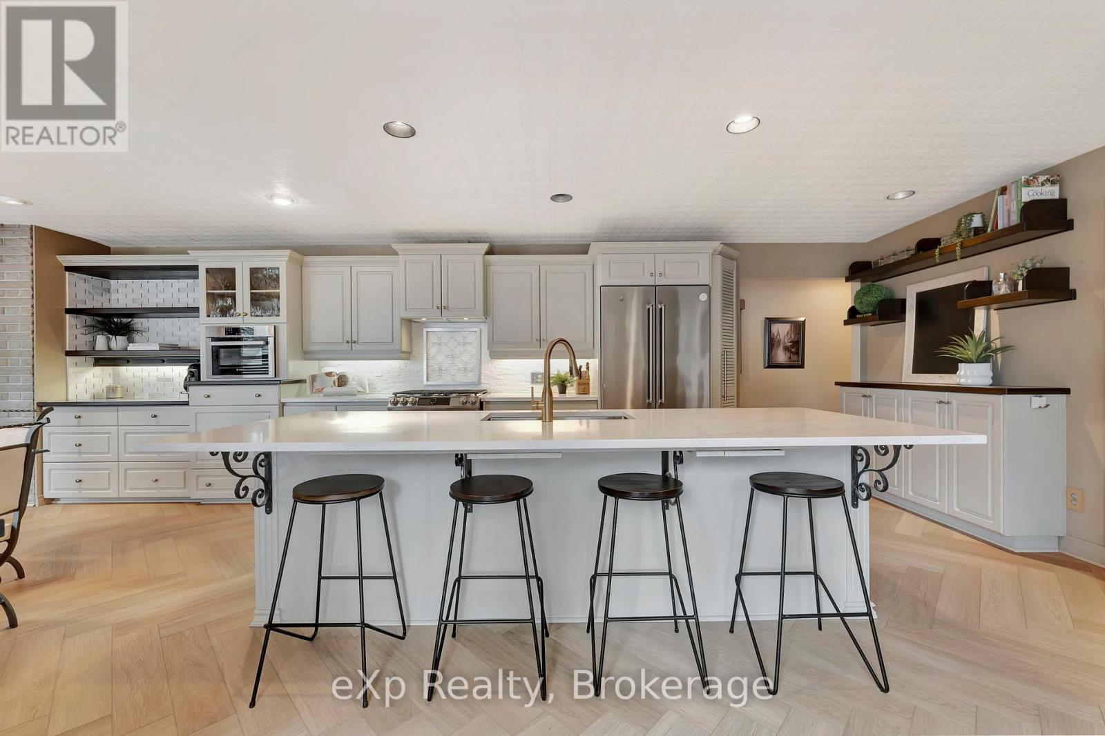 ***OPEN HOUSE SAT 2-4pm***SPRAWLING BUNGALOW WITH INDOOR POOL*** Nestled in one of Guelph's most desirable neighbourhoods and set on a beautifully landscaped 120 x 162 ft lot, this impressive 5-bedroom, 4-bath home offers a spacious layout designed for both everyday living and exceptional entertaining. A large, welcoming front porch sets the tone as you enter this charming home. At the heart of the main level is a chef-inspired kitchen featuring a large island, pantry, and high-end appliances, seamlessly flowing into a sunken dining area and an inviting living room with fireplace, while an additional family room opens to an expansive patio for effortless indoor-outdoor living. The main level offers 4 bedrooms, including a primary suite with walk-in closet and ensuite, complete with French doors leading to a private hot tub-your own personal retreat-along with a tucked-away laundry area for added convenience. The walk-out lower level further extends the living space with a spacious rec room, additional bedroom with wet bar and large bright windows, full bath, and direct pool access-ideal for entertaining or multi-generational living. Enjoy year-round relaxation with your own indoor pool and sauna, all within the comfort of home. Complete with a 3-car (2+1) garage and extended driveway, this home delivers an exceptional blend of space, comfort, and resort-style living in a truly beautiful setting. Call your REALTOR today for your own private viewing. ( (id:64974)