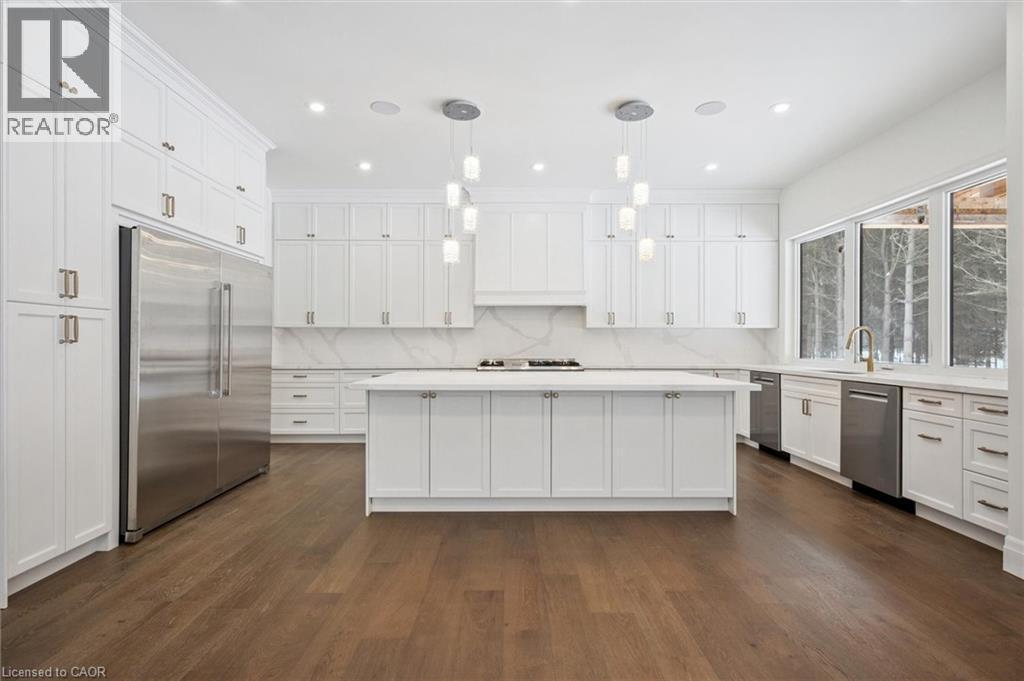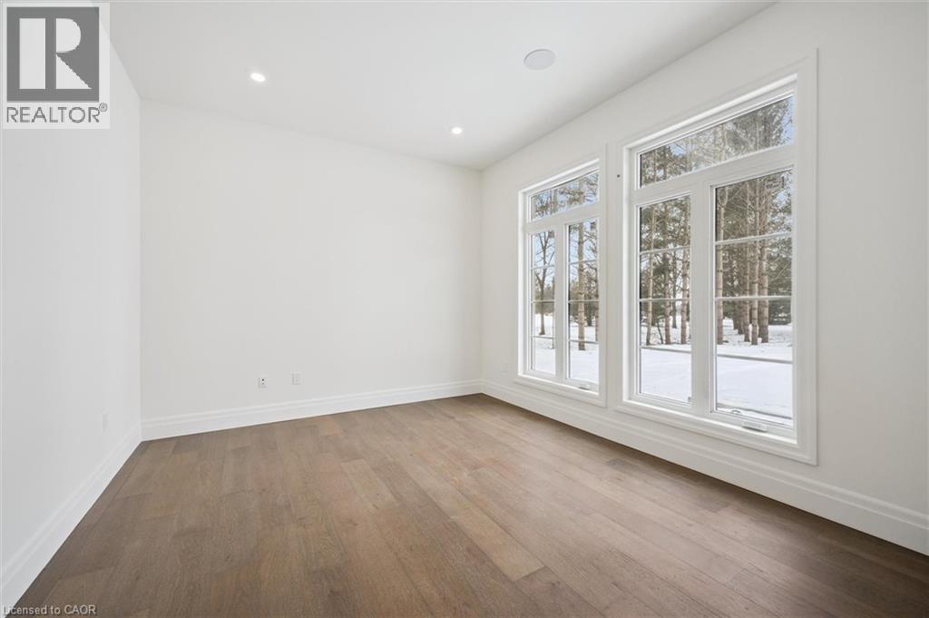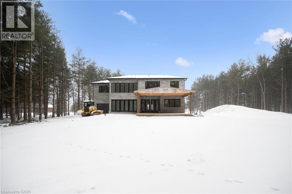 Tucked away in the quiet, tranquil outskirts of Brantford, this exceptional 5,000 sq. ft. new build sits on nearly 3 acres of land. Surrounded by towering evergreens and backing onto Fairchild Creek, 5 West Harris Rd. offers a rare sense of privacy and natural beauty—seamlessly paired with refined luxury living. The home features expansive living spaces with soaring cathedral ceilings, rich engineered hardwood flooring throughout, and modern finishes. Large windows frame breathtaking views of the private, wooded surroundings, creating a seamless connection to nature. Just off the front door, a dedicated home office provides a quiet workspace. A formal living room and separate formal dining room offer elegant spaces for entertaining, while the chef’s kitchen, designed for everyday living and gatherings, features high-end appliances, extensive cabinetry, a large centre island, a convenient servery, and an additional dining area opening effortlessly to the family room. Upstairs, four spacious bedrooms each feature their own private ensuite. The primary suite is a true retreat, complete with a generous bedroom, spa-inspired ensuite featuring a freestanding tub, a massive walk-in shower, and an expansive walk-in closet with a skylight that pours natural light into the space. The full basement provides a blank canvas to tailor to your lifestyle—ideal for a home theatre, gym, bar, or games room. Step outside to a pool-sized backyard with a covered outdoor living area, perfect for relaxing or entertaining while immersed in nature. (id:64974)