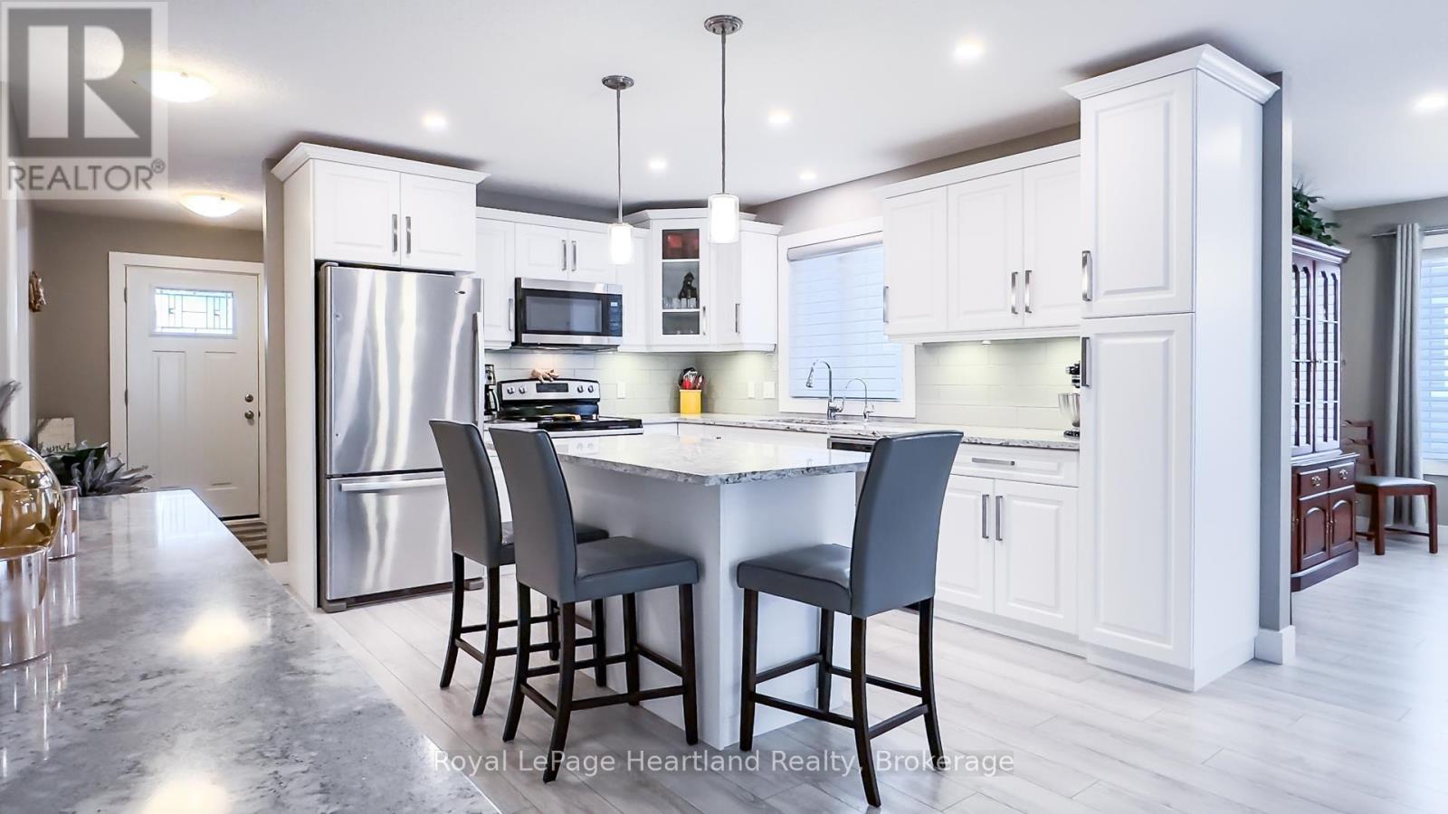 When proximity to Lake Huron sunsets, the beach, and community matters, wait no longer! This Lakeside with sunroom model is located in The Bluffs on Huron, offering a full crawl space for storage and a range of upgrades no longer available in later builds. The foyer is a welcome entrance with space right off the attached 2 car garage and main door where you have a full sized closet, room for an entrance table and bench to take your footwear off. A crisp white kitchen dazzles the critical eye featuring quartz countertops including the island and a custom oversized side table/hutch with matching quartz. Additional highlights include upgraded appliances, a pantry, crown moulding, pots-and-pans drawers in the island, undermount lighting, tiled backsplash, an oversized kitchen window, and a glass corner cabinet. The living room is a welcoming room with a gas fireplace with a tile inset, the perfect spot for snuggling in on the chilly evenings. The sunroom is a fantastic space for a second sitting room or alternative dining space. Take note of the upgraded interior doors and custom blinds which elevate the feel of the home.The Lakeside with Sunroom layout offers a generous guest bedroom and a main bathroom positioned at the front of the home. The privately located primary suite includes an ensuite with a 5' shower and a spacious walk-in closet. Outdoors, relax on the deck or install a hot tub on the concrete pad between the deck and garage, both with privacy fencing. Residents enjoy access to an 8,000-square-foot clubhouse featuring an indoor pool, gym, sauna, gathering rooms, and stunning views of Lake Huron, as well as pickleball courts and a dog park. All of this is just minutes from Goderich and local golf courses. (id:64974)