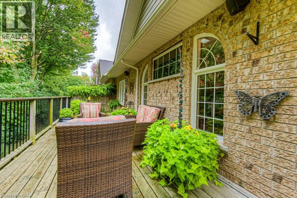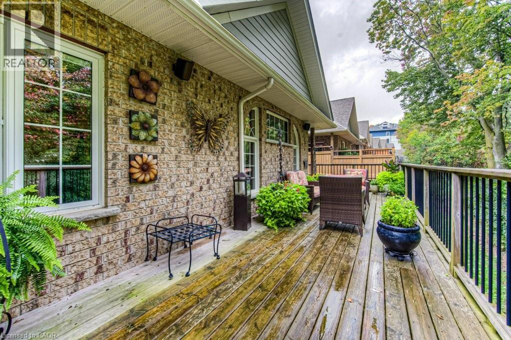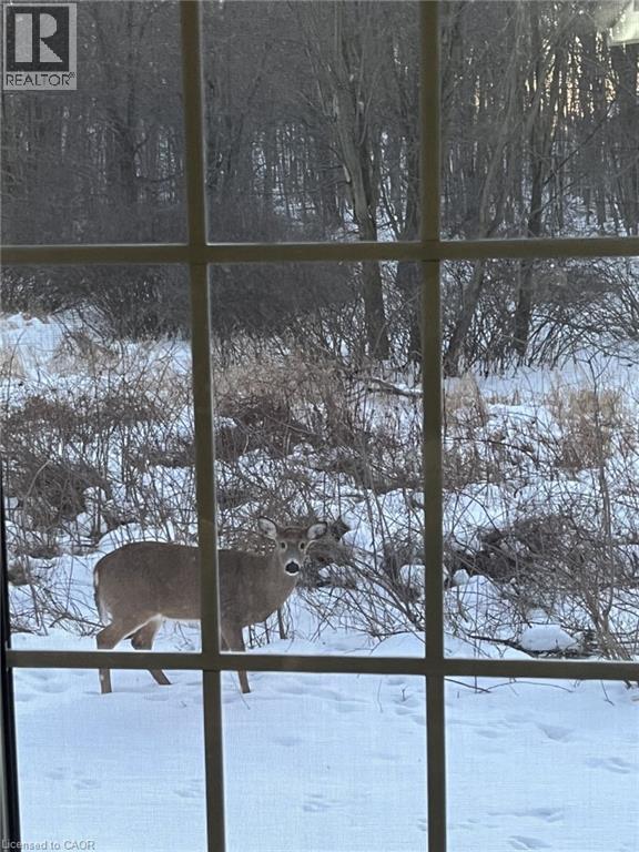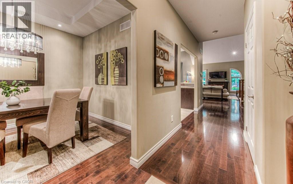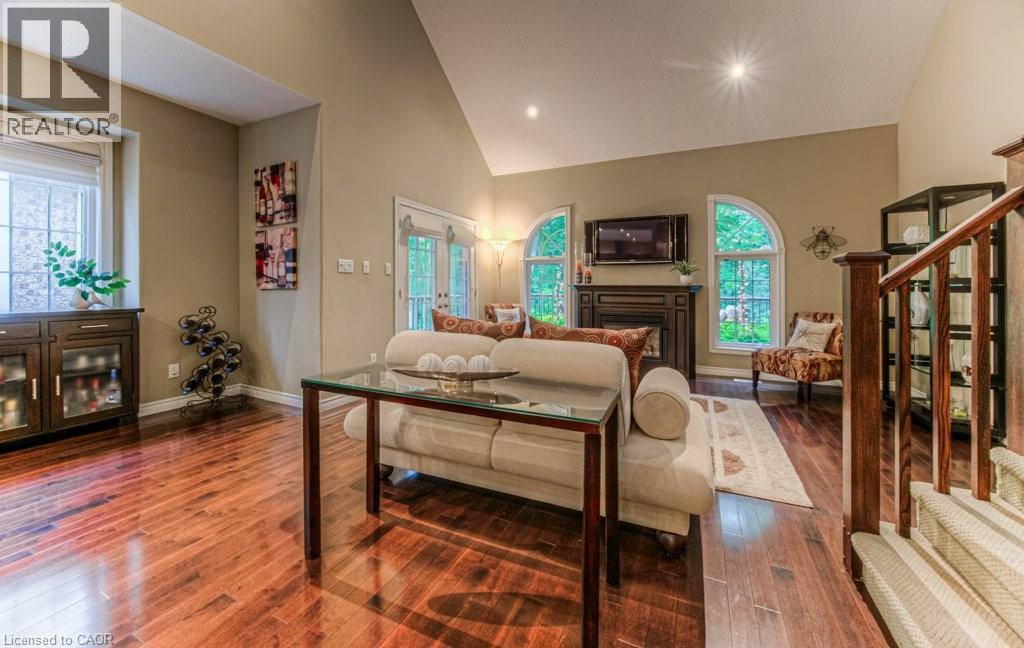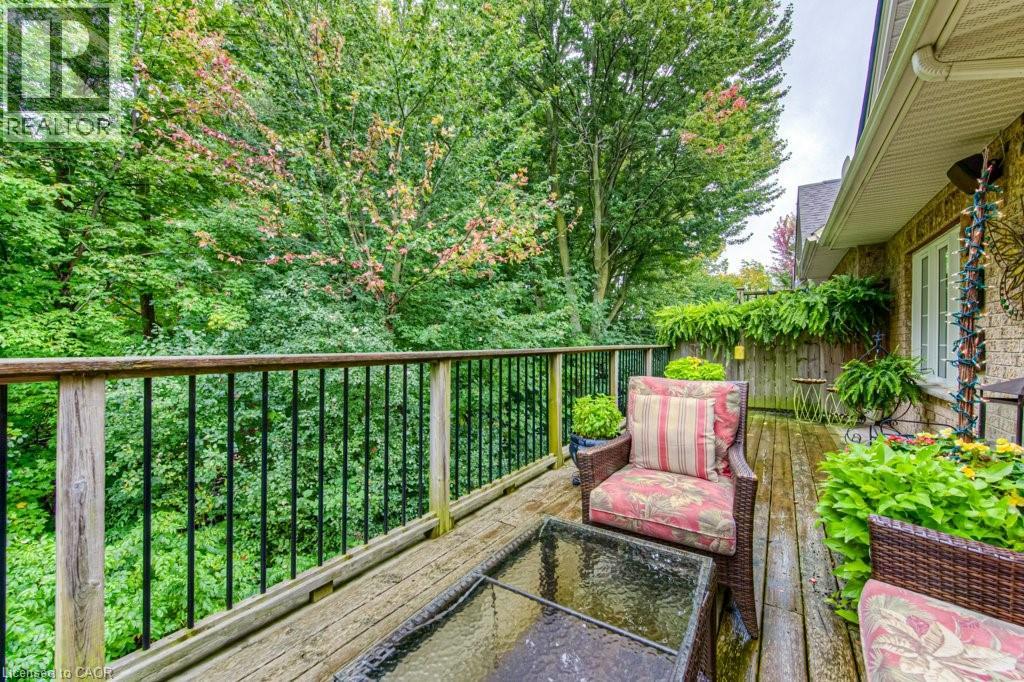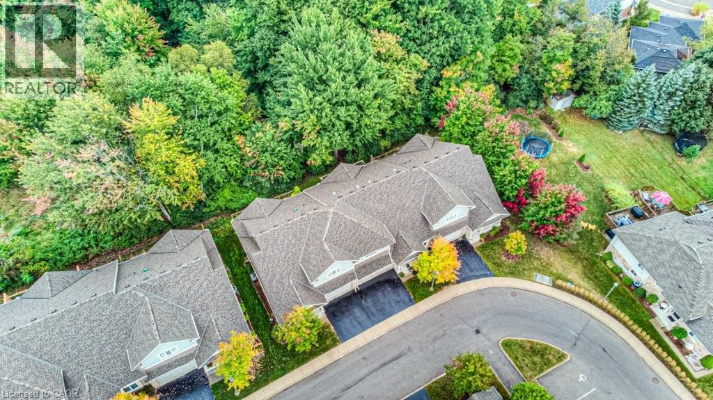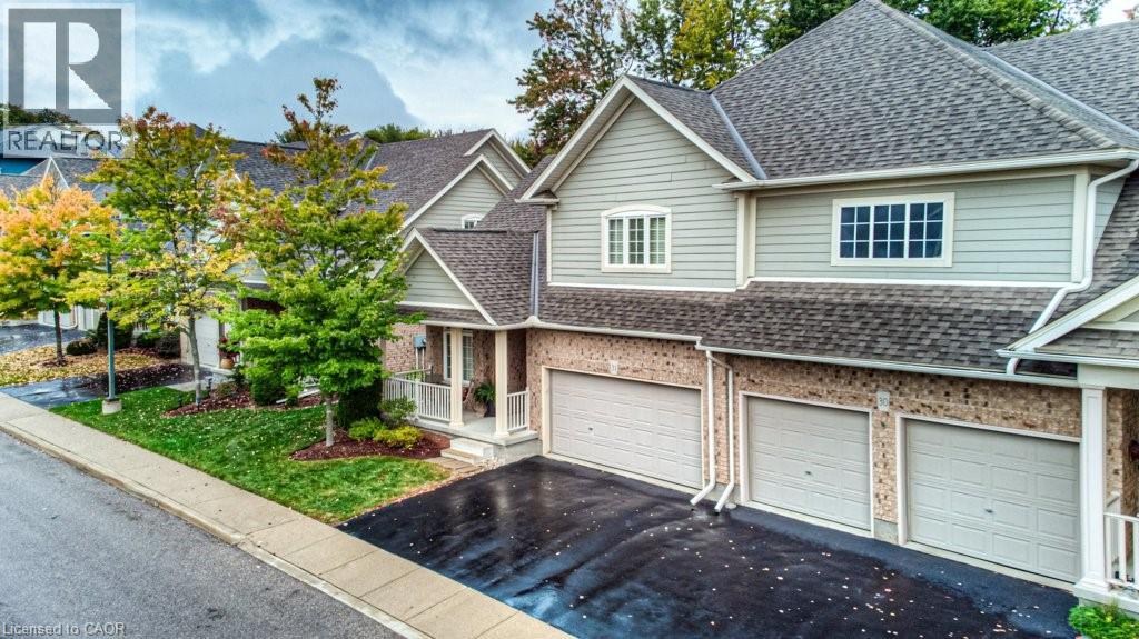Customized, original owner Aspen Woods bungaloft end unit townhouse condo with double garage, main floor primary suite backing on to the lush forest of Natchez Woods in southeast Kitchener. Welcoming covered porch is ready to sit & share coffee with a neighbour. Interior features include hardwood flooring throughout the main level with upgraded title in the bathrooms and kitchen. The dining room with coffered ceiling is suitable for use as an office/den. Fabulous kitchen with totally wide open concept view to the living room, the only unit in the complex with this expanded feature. Thick granite counters with curved breakfast bar, stainless appliances, double drawer dishwasher, Kohler cast iron sink with Grohe faucet plus three lazy Susan corner cupboards all combine to impress with above average working space for meal prep & entertaining. The spacious living room area with gas fireplace features a vaulted ceiling with numerous pot lights and side windows to enhance the space. A garden door walkout to the extended rear deck is a convenient access. Treat yourself to this primary bedroom suite with vaulted ceiling, walk-in closet, and enlarged 3pc ensuite having a clean tiled walk-in shower. The triple window view of the scenic trees will greet you each morning as you wake up in bed. Up the stairs to the family room/loft where the whole home audio/video system with cabinet is ready for you to relax and be entertained. Visiting grandchildren & guests will love the additional two bedrooms and 4pc bathroom with Kohler deep soaker tub too! Though the basement level with walkout to ground level is unfinished it does offer substantial storage space and the opportunity to complete to your quality level & design in the future. Walking trails. shopping amenities, access to the Breslau International Airport, Chicopee Ski Hill and other venues makes this a wonderful area to experience and explore. A Natural move for those looking to downsize with reasonable fees. (id:64974)
