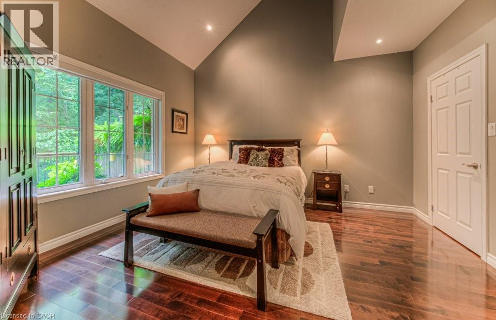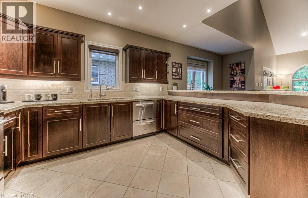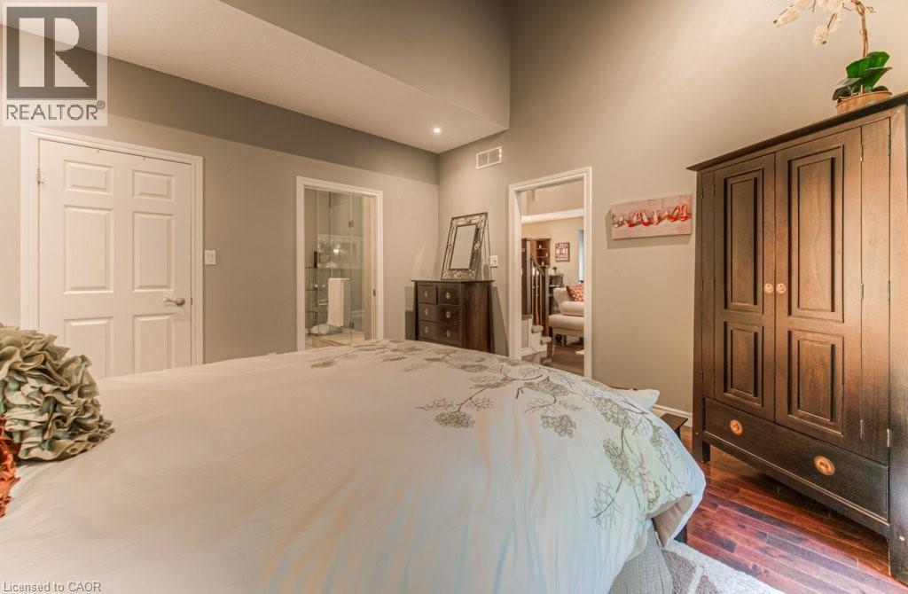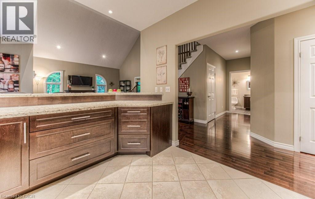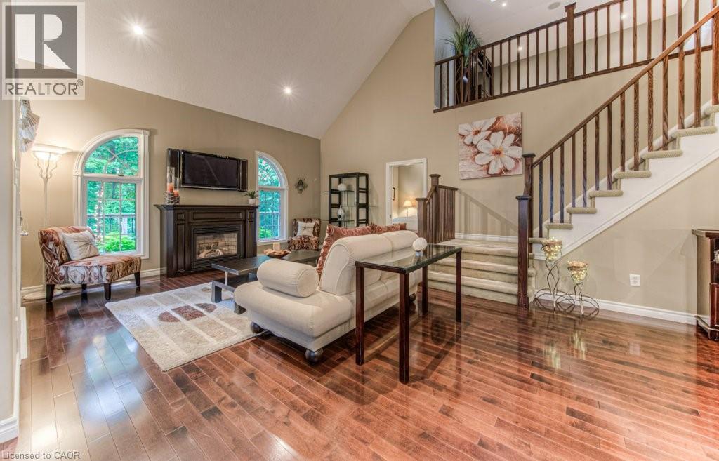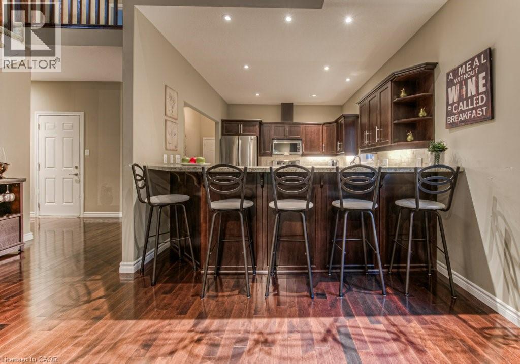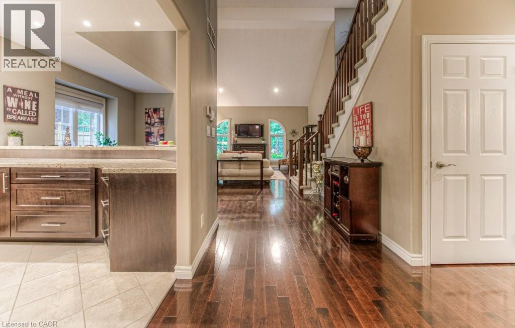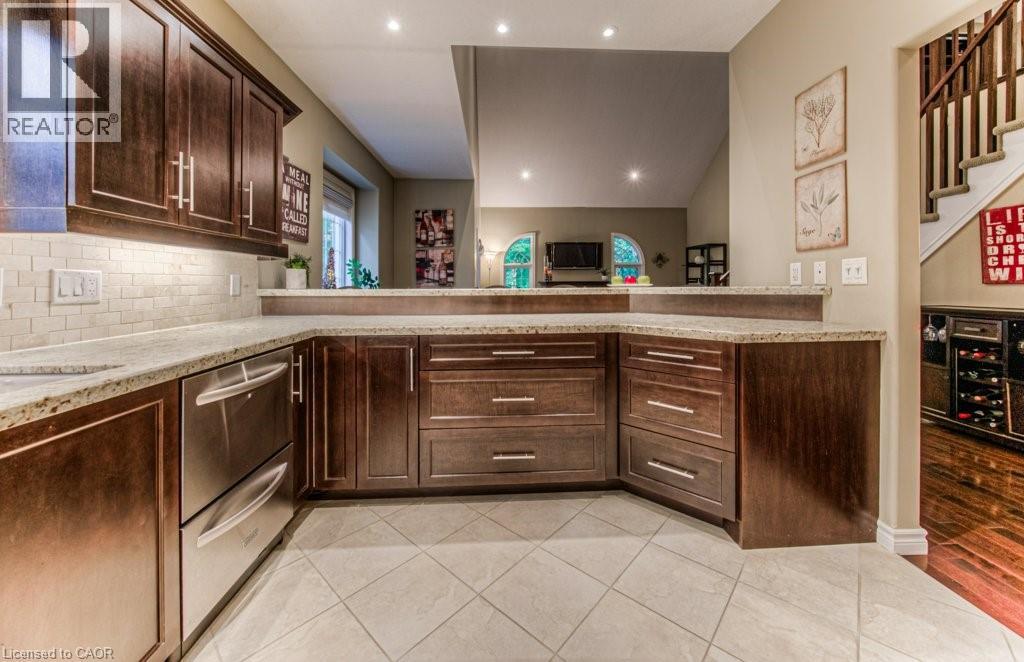 Customized, original owner Aspen Woods bungaloft end unit townhouse condo with double garage, main floor primary suite backing on to the lush forest of Natchez Woods in southeast Kitchener. Welcoming covered porch is ready to sit & share coffee with a neighbour. Interior features include hardwood flooring throughout the main level with upgraded title in the bathrooms and kitchen. The dining room with coffered ceiling is suitable for use as an office/den. Fabulous kitchen with totally wide open concept view to the living room, the only unit in the complex with this expanded feature. Thick granite counters with curved breakfast bar, stainless appliances, double drawer dishwasher, Kohler cast iron sink with Grohe faucet plus three lazy Susan corner cupboards all combine to impress with above average working space for meal prep & entertaining. The spacious living room area with gas fireplace features a vaulted ceiling with numerous pot lights and side windows to enhance the space. A garden door walkout to the extended rear deck is a convenient access. Treat yourself to this primary bedroom suite with vaulted ceiling, walk-in closet, and enlarged 3pc ensuite having a clean tiled walk-in shower. The triple window view of the scenic trees will greet you each morning as you wake up in bed. Up the stairs to the family room/loft where the whole home audio/video system with cabinet is ready for you to relax and be entertained. Visiting grandchildren & guests will love the additional two bedrooms and 4pc bathroom with Kohler deep soaker tub too! Though the basement level with walkout to ground level is unfinished it does offer substantial storage space and the opportunity to complete to your quality level & design in the future. Walking trails. shopping amenities, access to the Breslau International Airport, Chicopee Ski Hill and other venues makes this a wonderful area to experience and explore. A Natural move for those looking to downsize with reasonable fees. (id:64974)