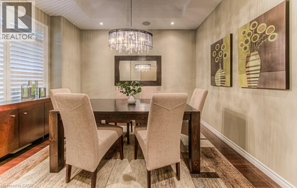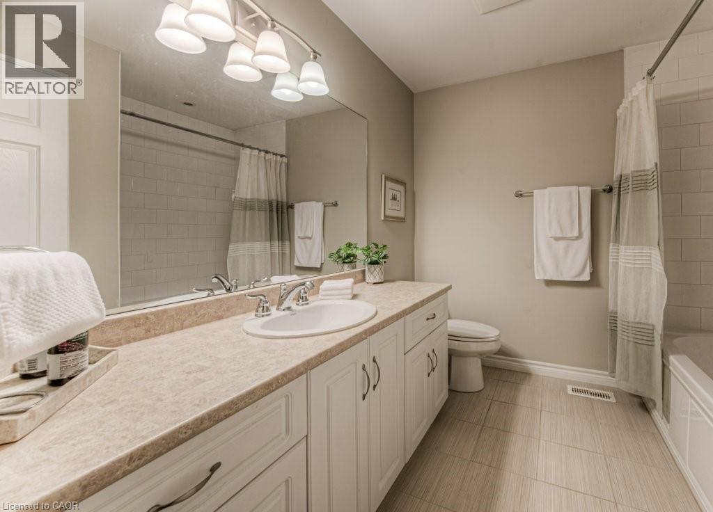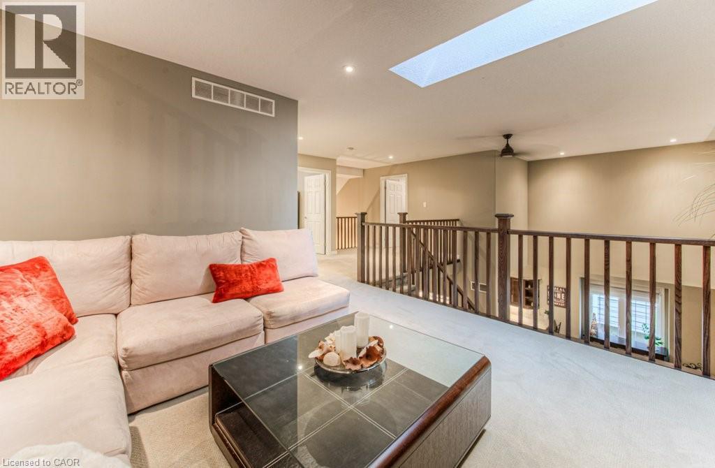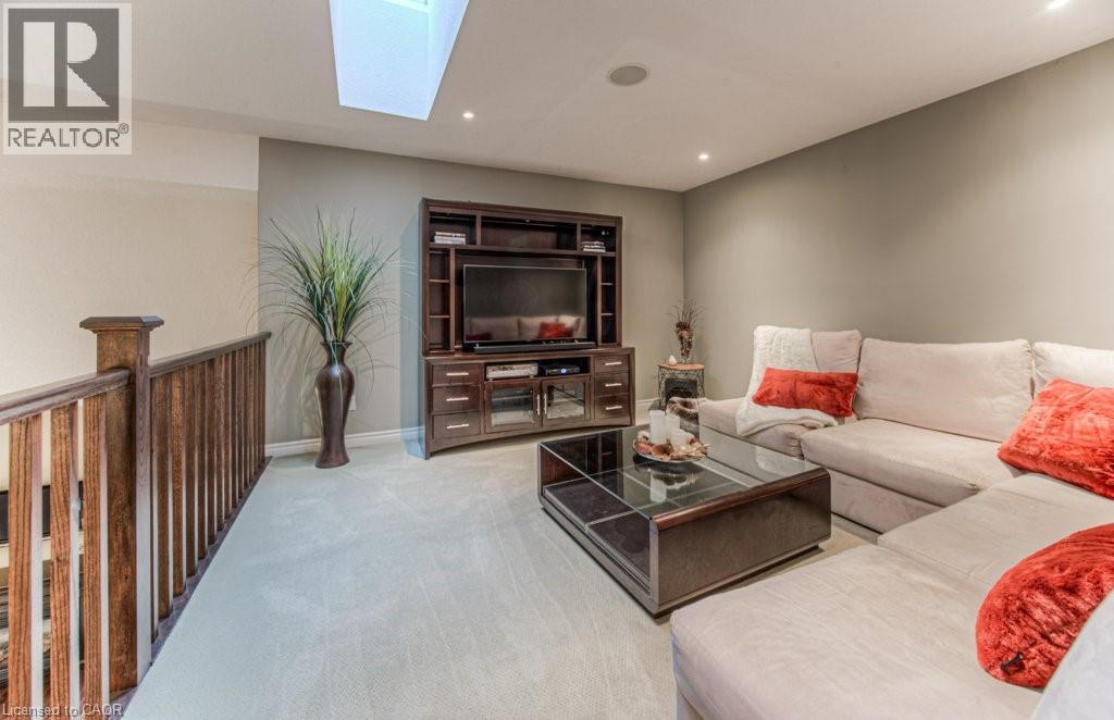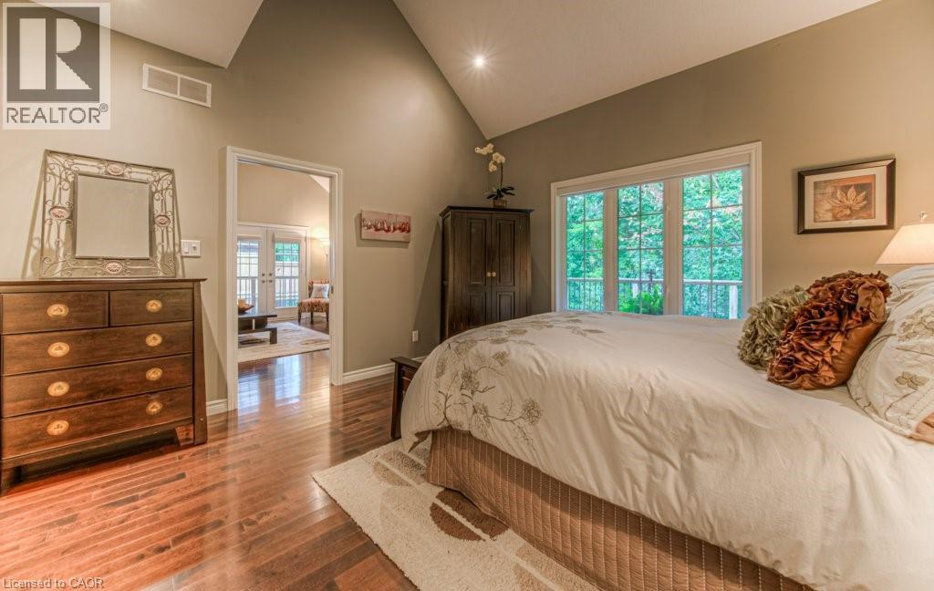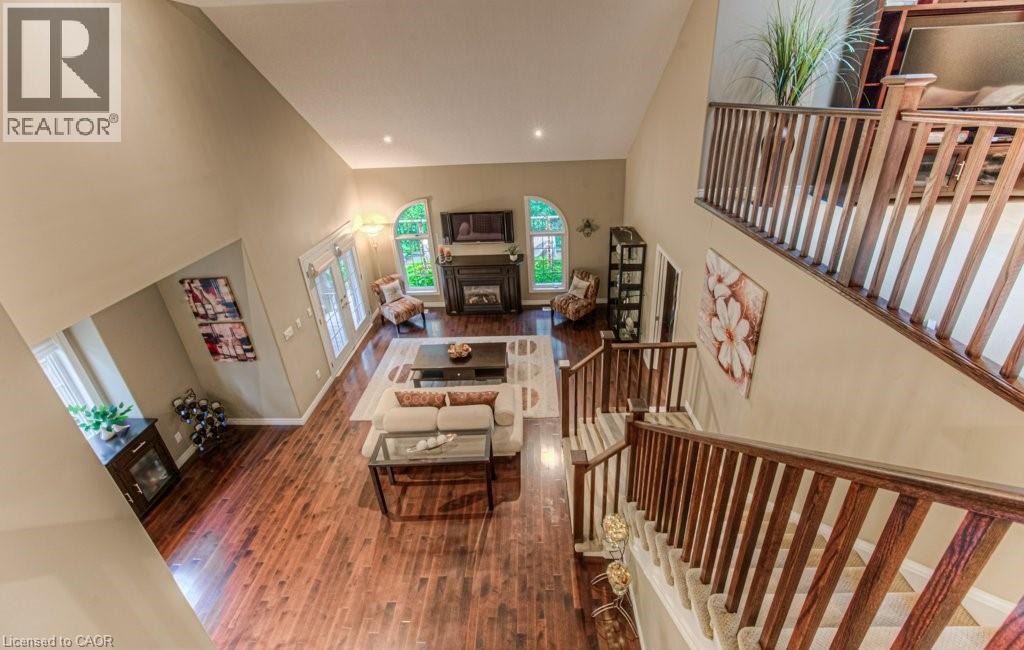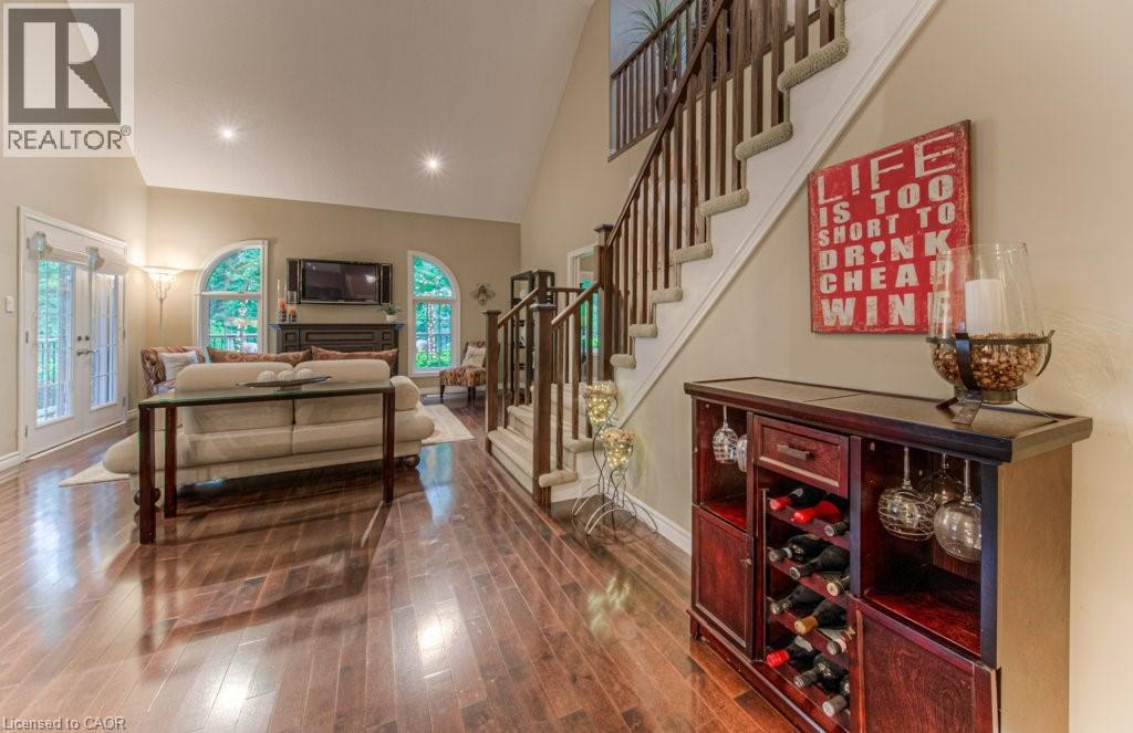 Customized, original owner Aspen Woods bungaloft end unit townhouse condo with double garage, main floor primary suite backing on to the lush forest of Natchez Woods in southeast Kitchener. Welcoming covered porch is ready to sit & share coffee with a neighbour. Interior features include hardwood flooring throughout the main level with upgraded title in the bathrooms and kitchen. The dining room with coffered ceiling is suitable for use as an office/den. Fabulous kitchen with totally wide open concept view to the living room, the only unit in the complex with this expanded feature. Thick granite counters with curved breakfast bar, stainless appliances, double drawer dishwasher, Kohler cast iron sink with Grohe faucet plus three lazy Susan corner cupboards all combine to impress with above average working space for meal prep & entertaining. The spacious living room area with gas fireplace features a vaulted ceiling with numerous pot lights and side windows to enhance the space. A garden door walkout to the extended rear deck is a convenient access. Treat yourself to this primary bedroom suite with vaulted ceiling, walk-in closet, and enlarged 3pc ensuite having a clean tiled walk-in shower. The triple window view of the scenic trees will greet you each morning as you wake up in bed. Up the stairs to the family room/loft where the whole home audio/video system with cabinet is ready for you to relax and be entertained. Visiting grandchildren & guests will love the additional two bedrooms and 4pc bathroom with Kohler deep soaker tub too! Though the basement level with walkout to ground level is unfinished it does offer substantial storage space and the opportunity to complete to your quality level & design in the future. Walking trails. shopping amenities, access to the Breslau International Airport, Chicopee Ski Hill and other venues makes this a wonderful area to experience and explore. A Natural move for those looking to downsize with reasonable fees. (id:64974)