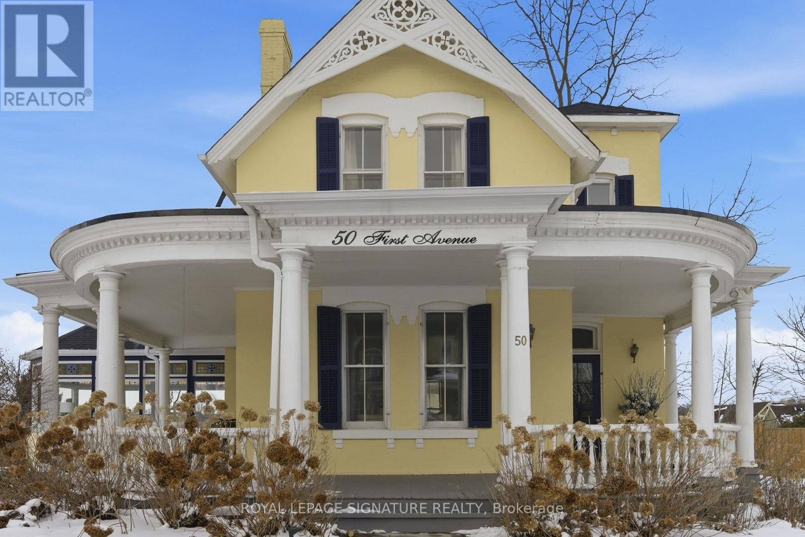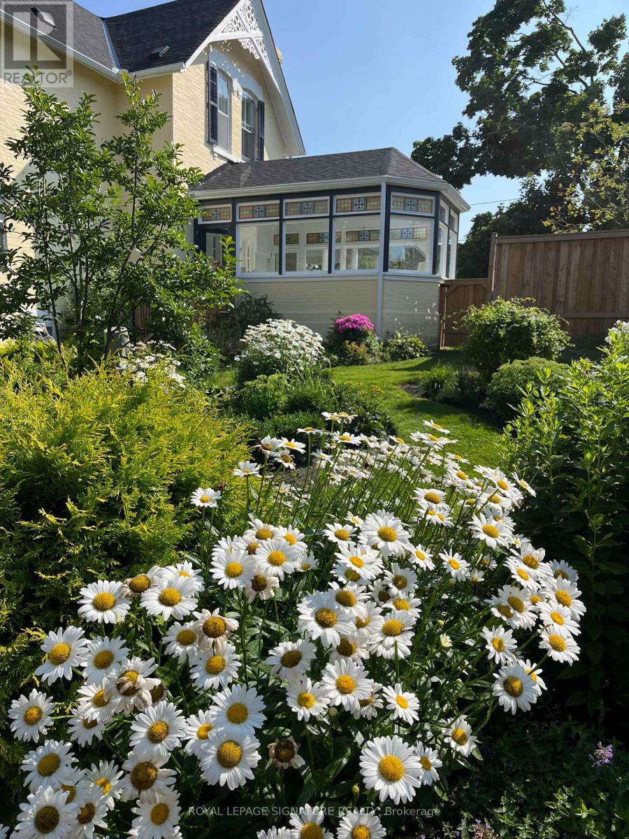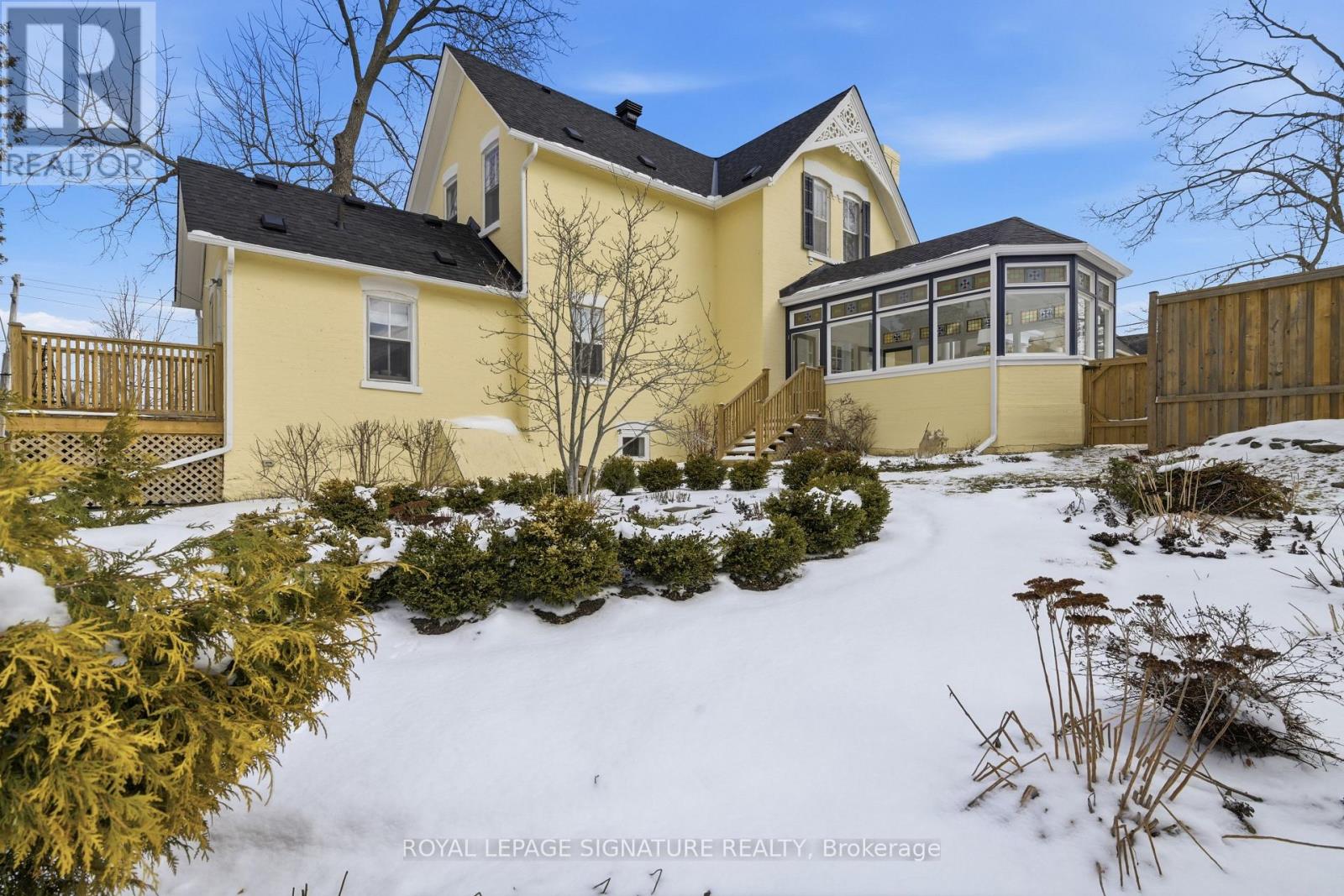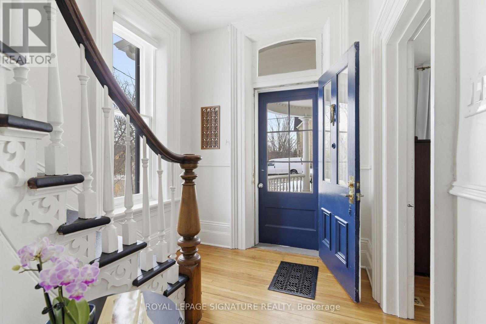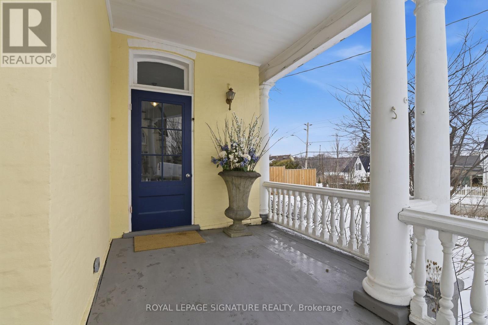 This beautifully preserved circa 1880 century home is set on a prominent corner lot along one of the town's most picturesque streets. Offering over 3,200 sq ft, the property balances architectural character with thoughtful modern upgrades, including a newer roof and furnace. Exceptional curb appeal is defined by extensive gardens, a wraparound porch, decorative trim, and classic shutters that speak to the craftsmanship of its era. Inside, a grand foyer introduces a sweeping curved staircase accented by ornate millwork and soaring ceilings. The main floor features 10-foot ceilings and an abundance of original details, including oversized baseboards, period trim, tall windows with transoms, chair rails, and original cold air returns. Six well-defined living spaces offer both elegance and versatility: a formal living room with gas fireplace insert, central dining room, parlour with French doors, warm and inviting kitchen, private office with adjacent bathroom, and a beautifully rebuilt conservatory with original stained glass transoms providing a peaceful, light-filled retreat. The kitchen is anchored by a centre island with granite countertops and stainless steel appliances, and the main-floor office is ideal for a home-based workspace. Upstairs, 9.5-foot ceilings continue the sense of openness. A generous landing offers space for a reading nook. The principal bedroom features an electric fireplace, large walk-in closet with custom organizers, and excellent natural light. Two additional bedrooms are generously sized and complemented by a 3-piece bath with soaker tub and a second 3-piece bath with shower.The dry basement with 8' ceilings provides ample storage space, a washer, dryer, hot water heater (rented), owned water softener, and utility sink. Homes of this calibre and character rarely come to market. A true Uxbridge landmark, offering timeless beauty, thoughtful updates, and a setting that feels both special and welcoming. (id:64974)