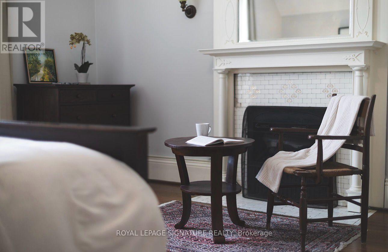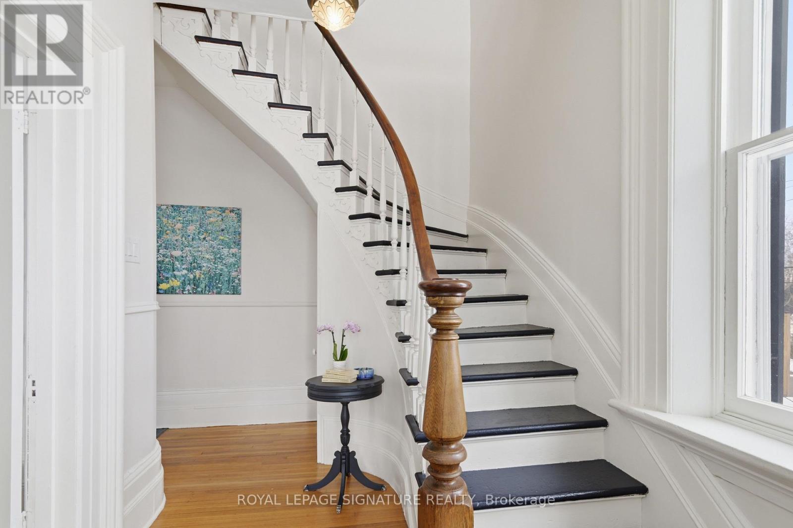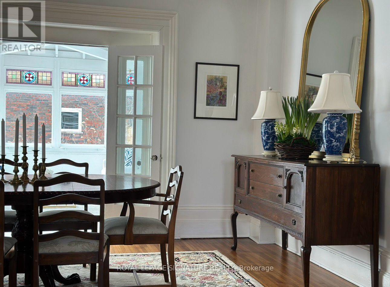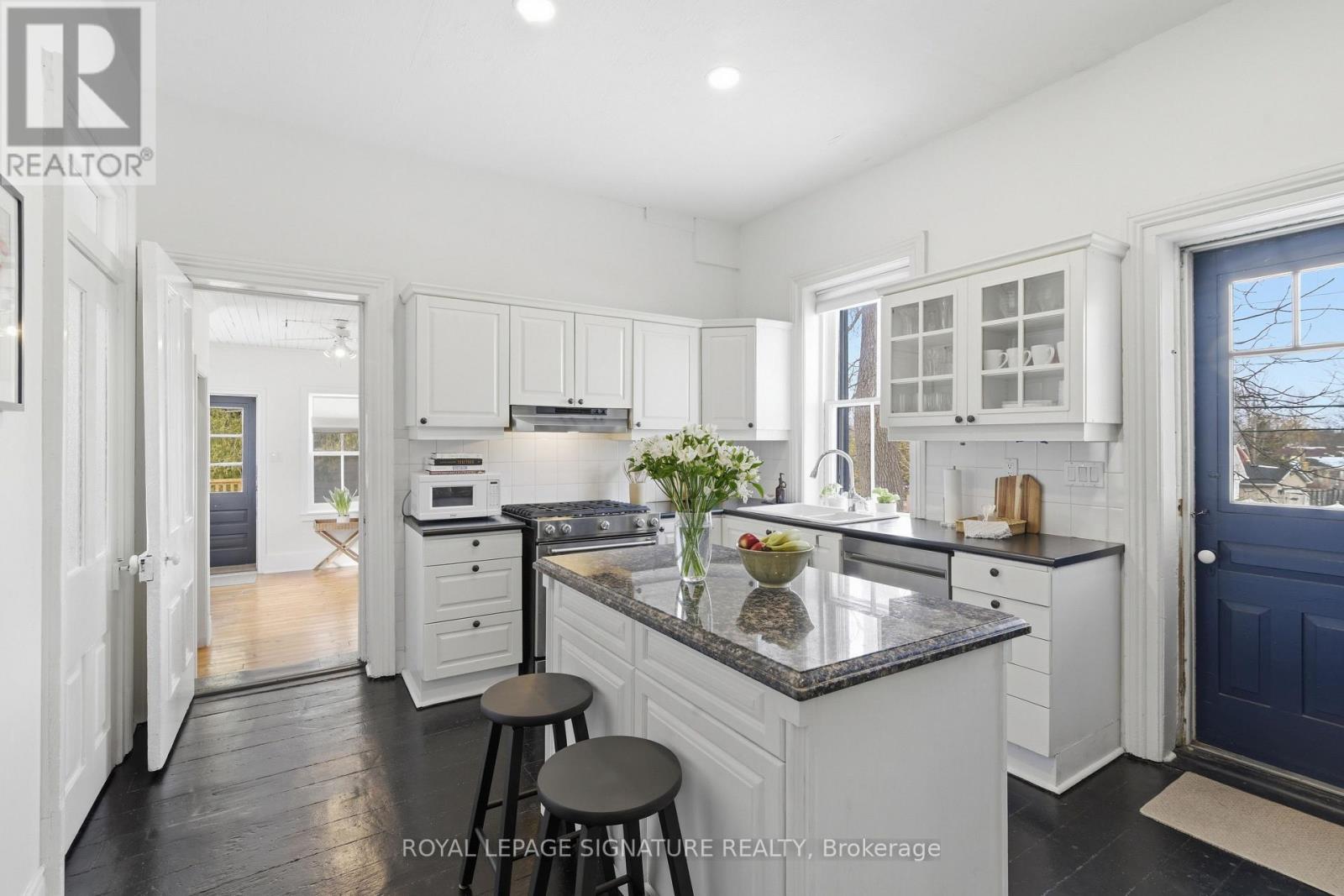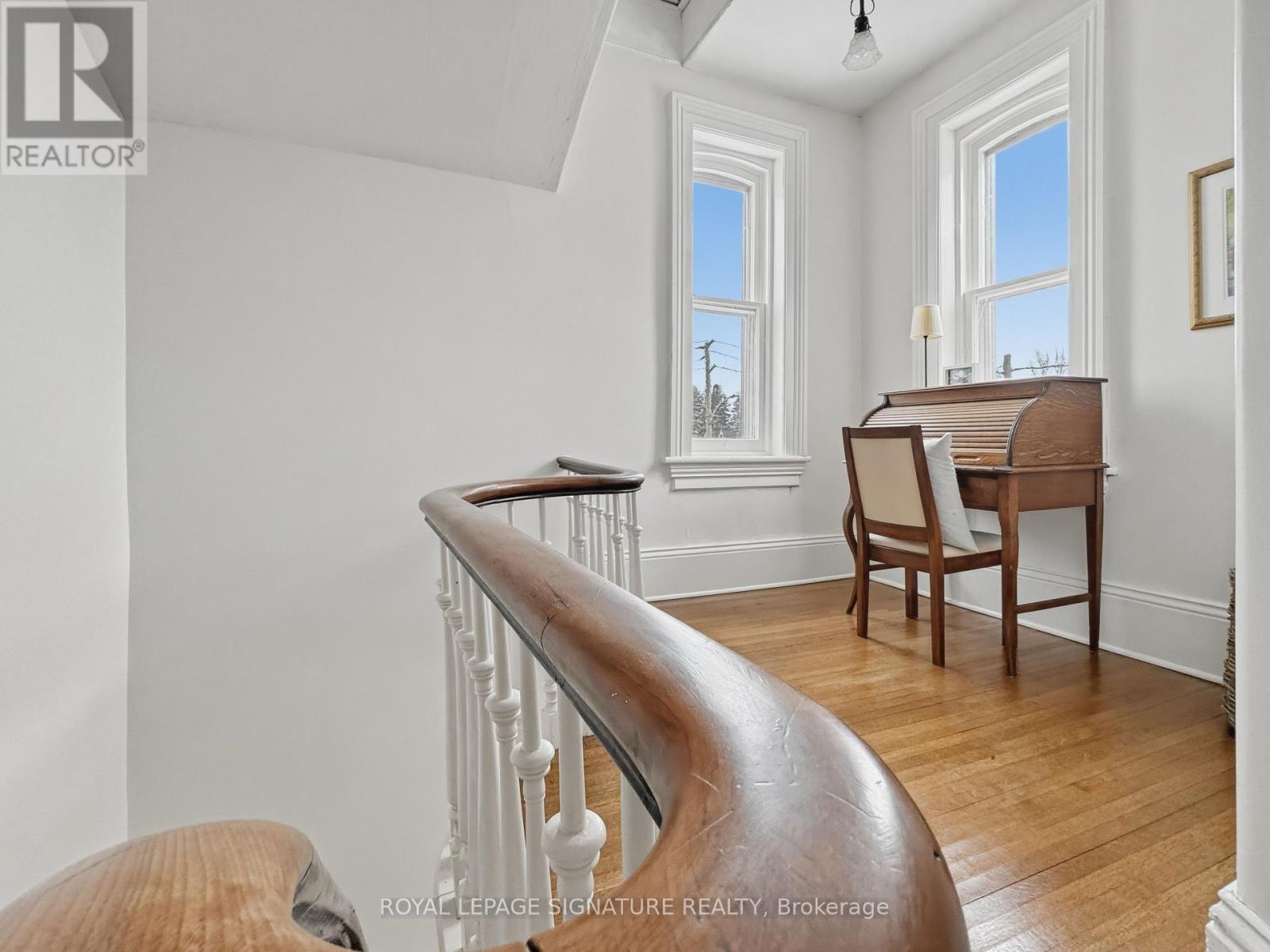 This beautifully preserved circa 1880 century home is set on a prominent corner lot along one of the town's most picturesque streets. Offering over 3,200 sq ft, the property balances architectural character with thoughtful modern upgrades, including a newer roof and furnace. Exceptional curb appeal is defined by extensive gardens, a wraparound porch, decorative trim, and classic shutters that speak to the craftsmanship of its era. Inside, a grand foyer introduces a sweeping curved staircase accented by ornate millwork and soaring ceilings. The main floor features 10-foot ceilings and an abundance of original details, including oversized baseboards, period trim, tall windows with transoms, chair rails, and original cold air returns. Six well-defined living spaces offer both elegance and versatility: a formal living room with gas fireplace insert, central dining room, parlour with French doors, warm and inviting kitchen, private office with adjacent bathroom, and a beautifully rebuilt conservatory with original stained glass transoms providing a peaceful, light-filled retreat. The kitchen is anchored by a centre island with granite countertops and stainless steel appliances, and the main-floor office is ideal for a home-based workspace. Upstairs, 9.5-foot ceilings continue the sense of openness. A generous landing offers space for a reading nook. The principal bedroom features an electric fireplace, large walk-in closet with custom organizers, and excellent natural light. Two additional bedrooms are generously sized and complemented by a 3-piece bath with soaker tub and a second 3-piece bath with shower.The dry basement with 8' ceilings provides ample storage space, a washer, dryer, hot water heater (rented), owned water softener, and utility sink. Homes of this calibre and character rarely come to market. A true Uxbridge landmark, offering timeless beauty, thoughtful updates, and a setting that feels both special and welcoming. (id:64974)