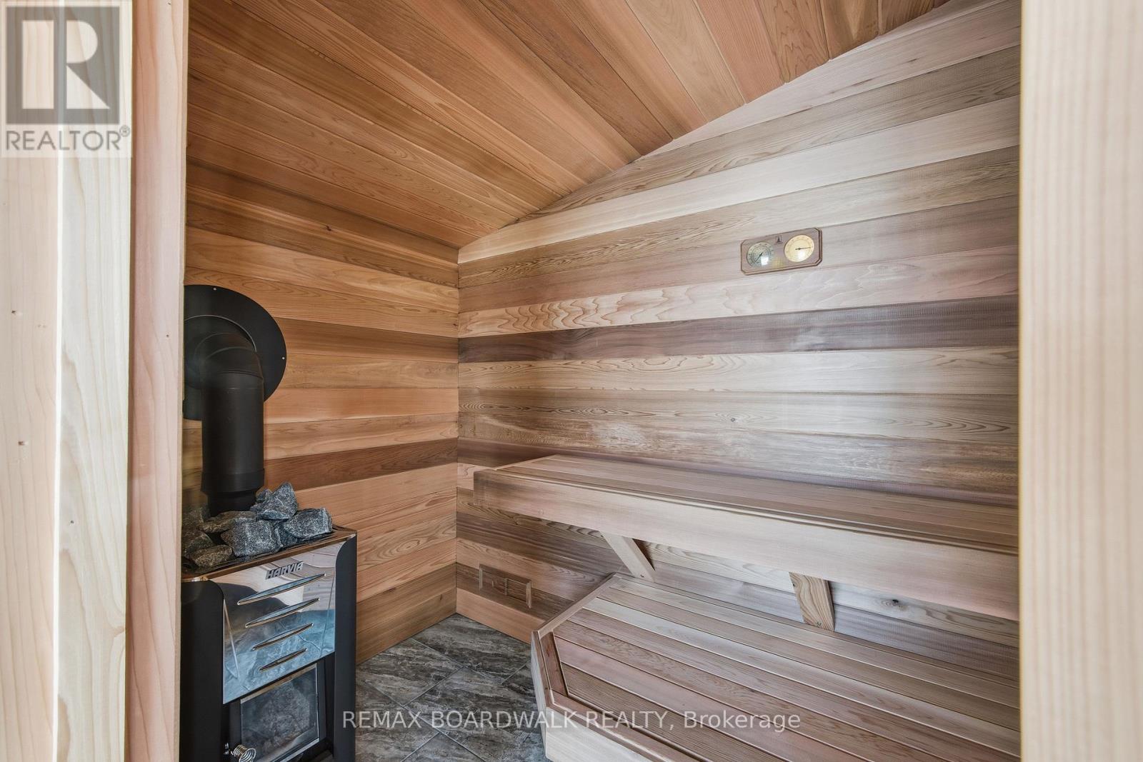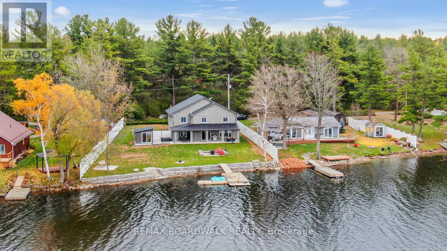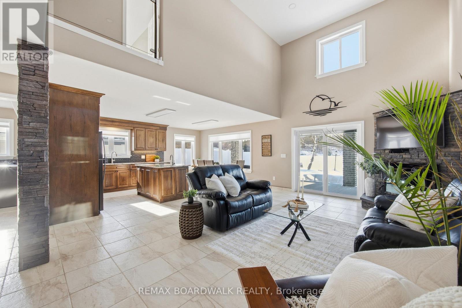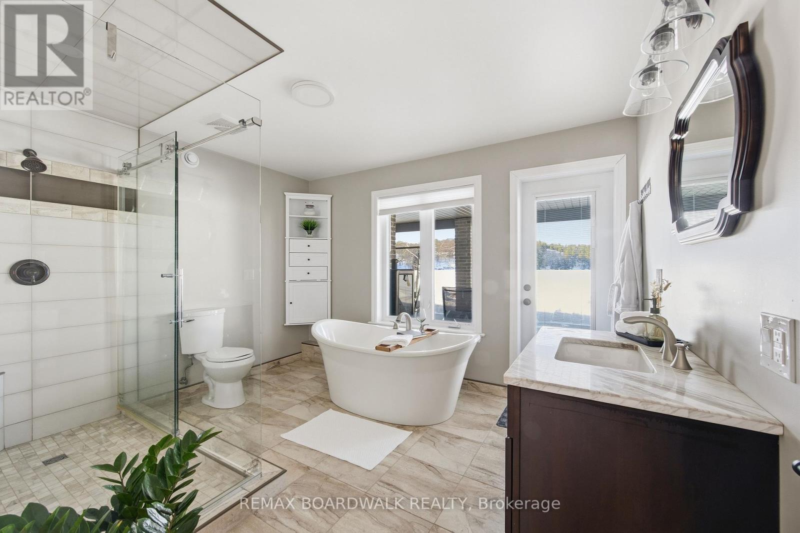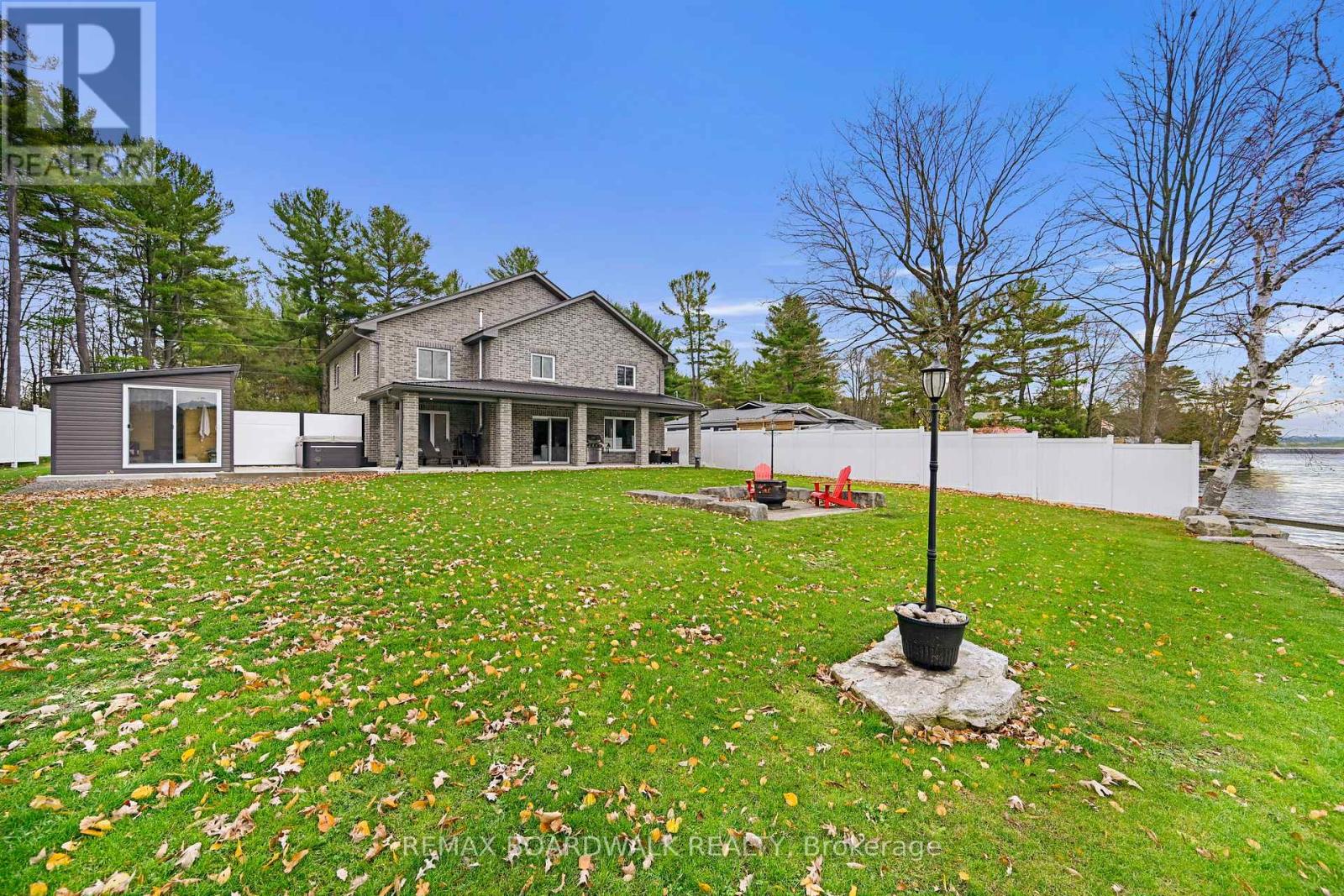 Welcome to this waterfront retreat on sought-after Graham Lake, where custom craftsmanship and luxury come together in perfect harmony. Built in 2018, this stunning full-brick residence with a steel roof has every detail carefully considered, with every finish selected for quality, comfort, and longevity. Step inside to an open-concept main floor highlighted by soaring two-story ceilings, engineered glass railings, and statement lighting that immediately sets the tone. The custom Hunt's kitchen is a showpiece, featuring hickory cabinetry, live-edge granite countertops with a life-proof seal, and premium finishes. The main-floor primary suite is a true sanctuary, offering a spa-inspired ensuite with a custom glass shower and soaker tub. Step directly outside to your hot tub, seamlessly connecting the indoors to your private outdoor area complete with your own personal sauna and relaxation room overlooking the lake, creating the ultimate space to unwind, recharge, and enjoy year-round wellness at home. Upstairs, you'll find three generous bedrooms, a three-piece bath, a bright den overlooking the main living space, and a versatile bonus room ideal for a home theatre, gym, or additional lounge. The home features radiant in-floor heating with individual room controls, an ICF foundation, premium insulation, on-demand hot water/boiler, a high-end water treatment system, and a fully automatic Generac generator. The heated garage offers hot & cold water, floor drains, and an automatic opener. Outdoors, enjoy pristine shoreline, a 24x10ft dock w/ swim platform & additional Seadoo dock. Thoughtfully designed exterior features include armor stone retaining wall and landscaping, a fire-pit area, power outlets for seasonal lighting, and expansive grounds perfect for entertaining or peaceful evenings by the water. This is more than a home-it's a lifestyle. A rare opportunity to own a waterfront property built to last, offering comfort, privacy, and unforgettable lakefront living. (id:64974)