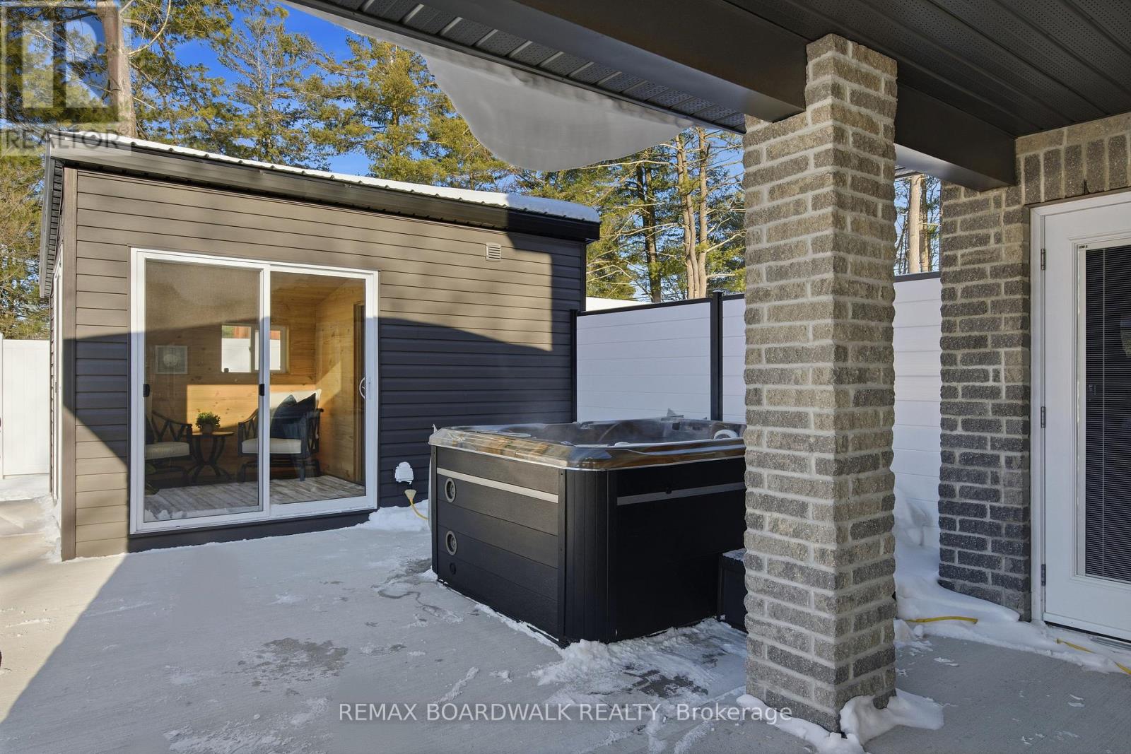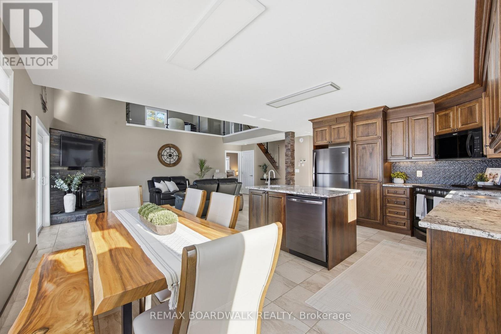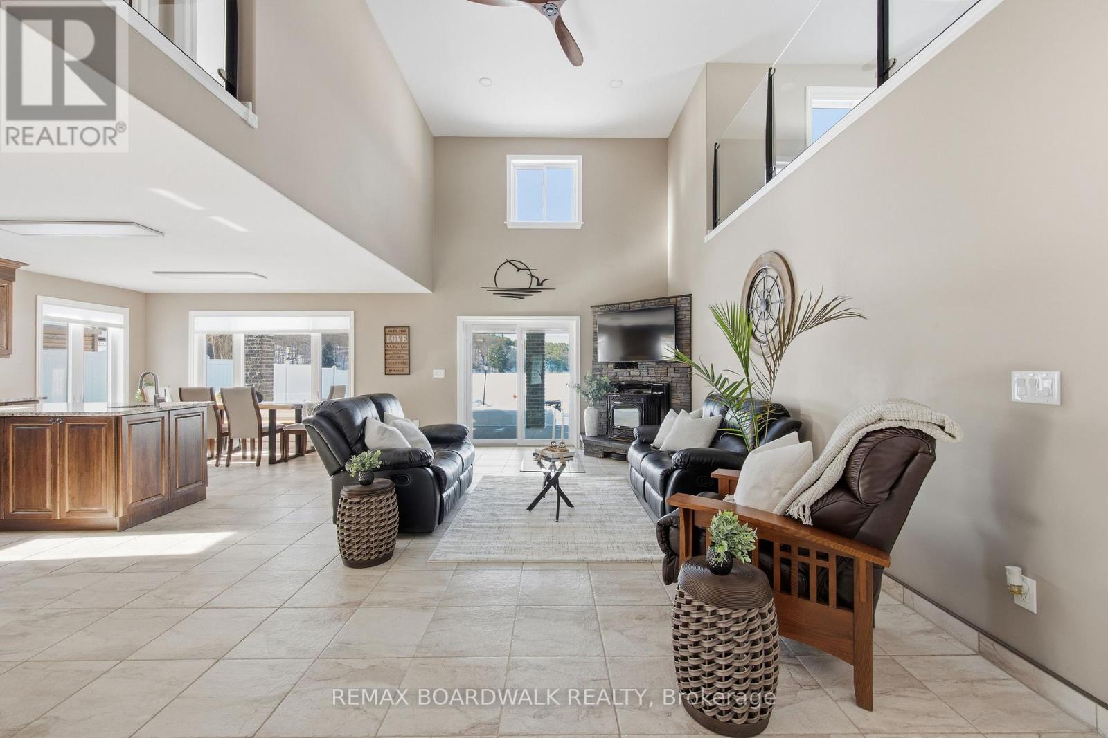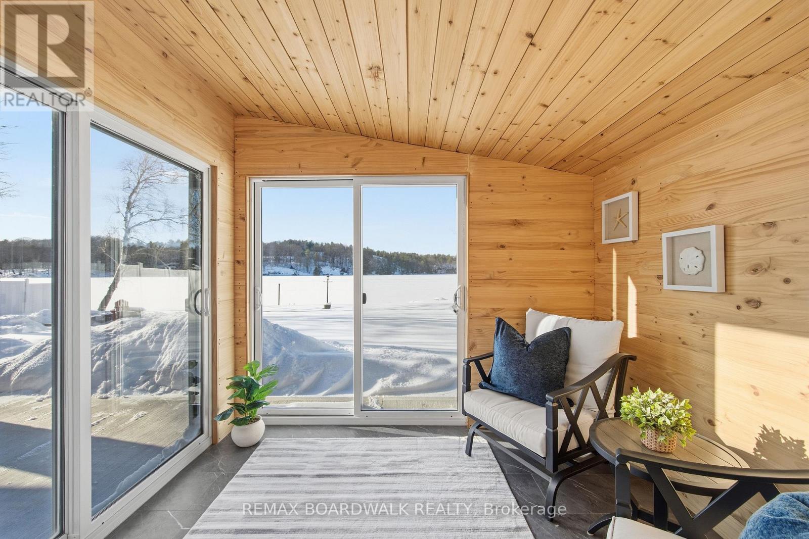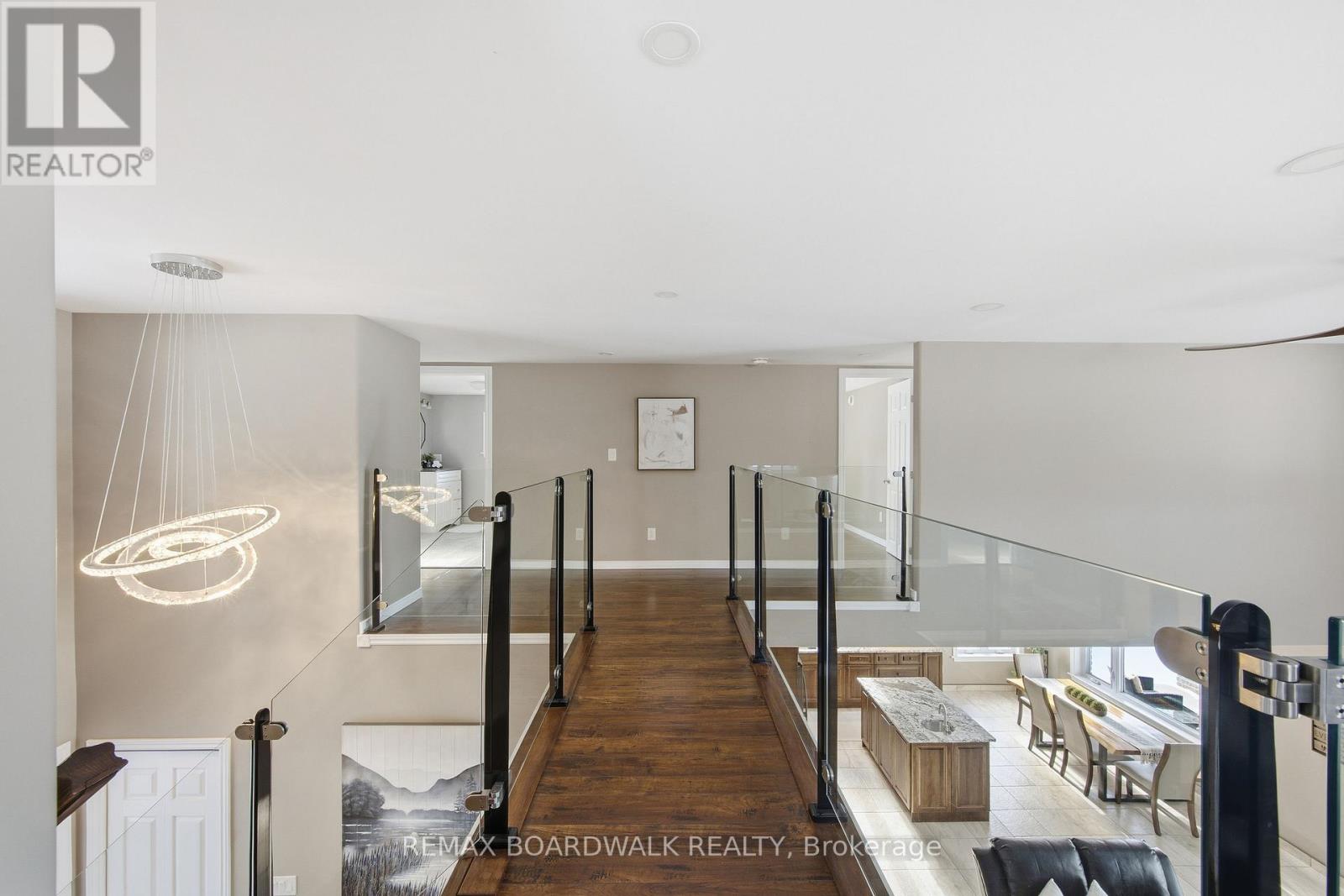 Welcome to this waterfront retreat on sought-after Graham Lake, where custom craftsmanship and luxury come together in perfect harmony. Built in 2018, this stunning full-brick residence with a steel roof has every detail carefully considered, with every finish selected for quality, comfort, and longevity. Step inside to an open-concept main floor highlighted by soaring two-story ceilings, engineered glass railings, and statement lighting that immediately sets the tone. The custom Hunt's kitchen is a showpiece, featuring hickory cabinetry, live-edge granite countertops with a life-proof seal, and premium finishes. The main-floor primary suite is a true sanctuary, offering a spa-inspired ensuite with a custom glass shower and soaker tub. Step directly outside to your hot tub, seamlessly connecting the indoors to your private outdoor area complete with your own personal sauna and relaxation room overlooking the lake, creating the ultimate space to unwind, recharge, and enjoy year-round wellness at home. Upstairs, you'll find three generous bedrooms, a three-piece bath, a bright den overlooking the main living space, and a versatile bonus room ideal for a home theatre, gym, or additional lounge. The home features radiant in-floor heating with individual room controls, an ICF foundation, premium insulation, on-demand hot water/boiler, a high-end water treatment system, and a fully automatic Generac generator. The heated garage offers hot & cold water, floor drains, and an automatic opener. Outdoors, enjoy pristine shoreline, a 24x10ft dock w/ swim platform & additional Seadoo dock. Thoughtfully designed exterior features include armor stone retaining wall and landscaping, a fire-pit area, power outlets for seasonal lighting, and expansive grounds perfect for entertaining or peaceful evenings by the water. This is more than a home-it's a lifestyle. A rare opportunity to own a waterfront property built to last, offering comfort, privacy, and unforgettable lakefront living. (id:64974)