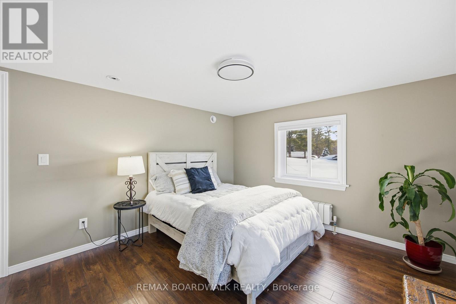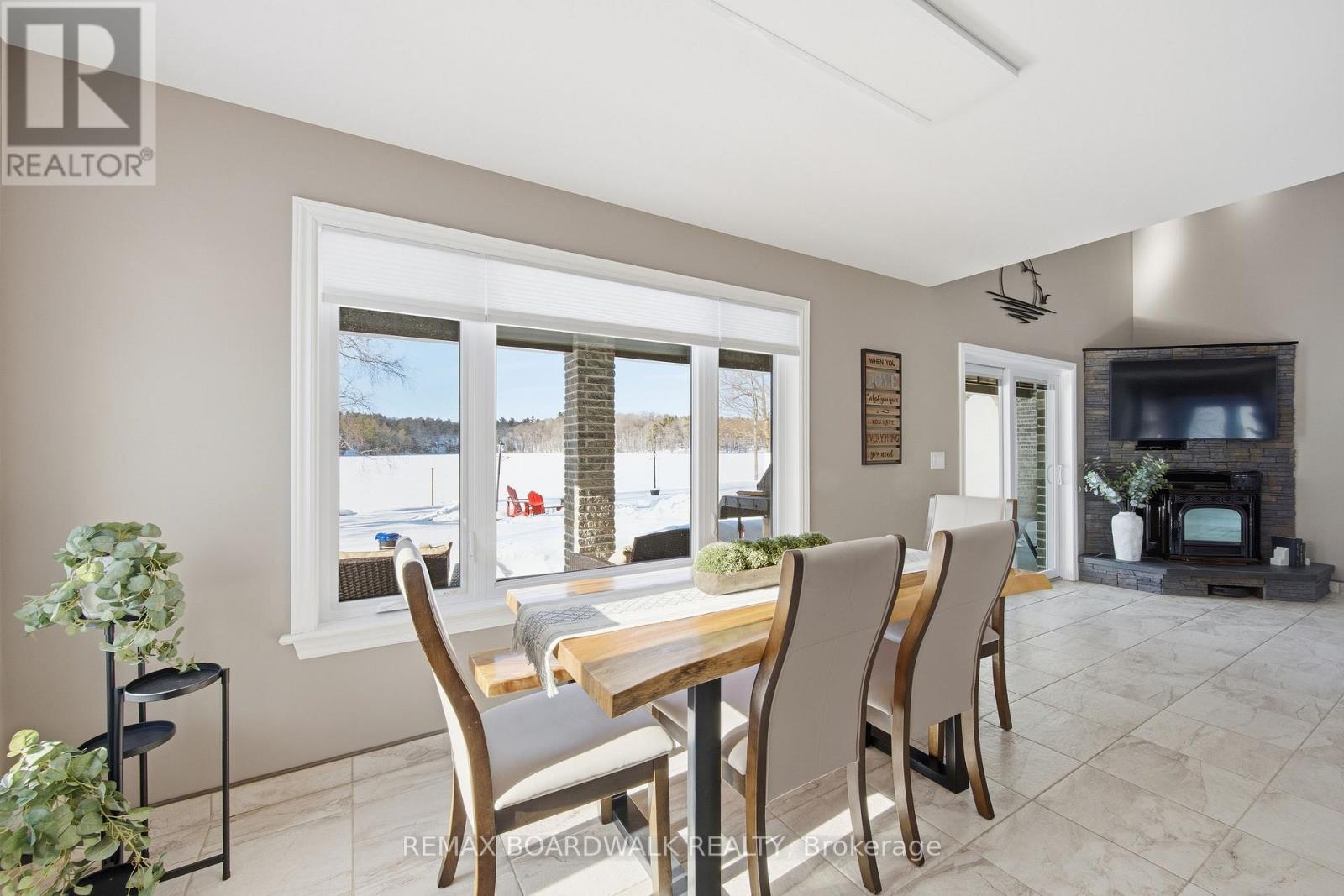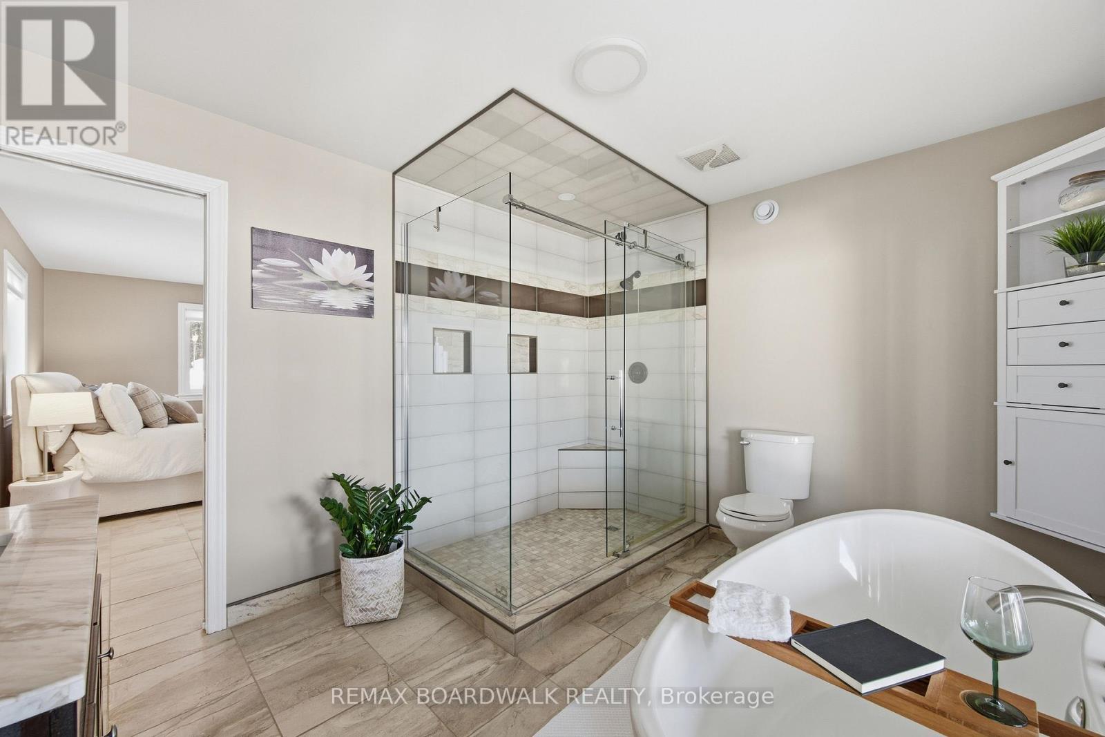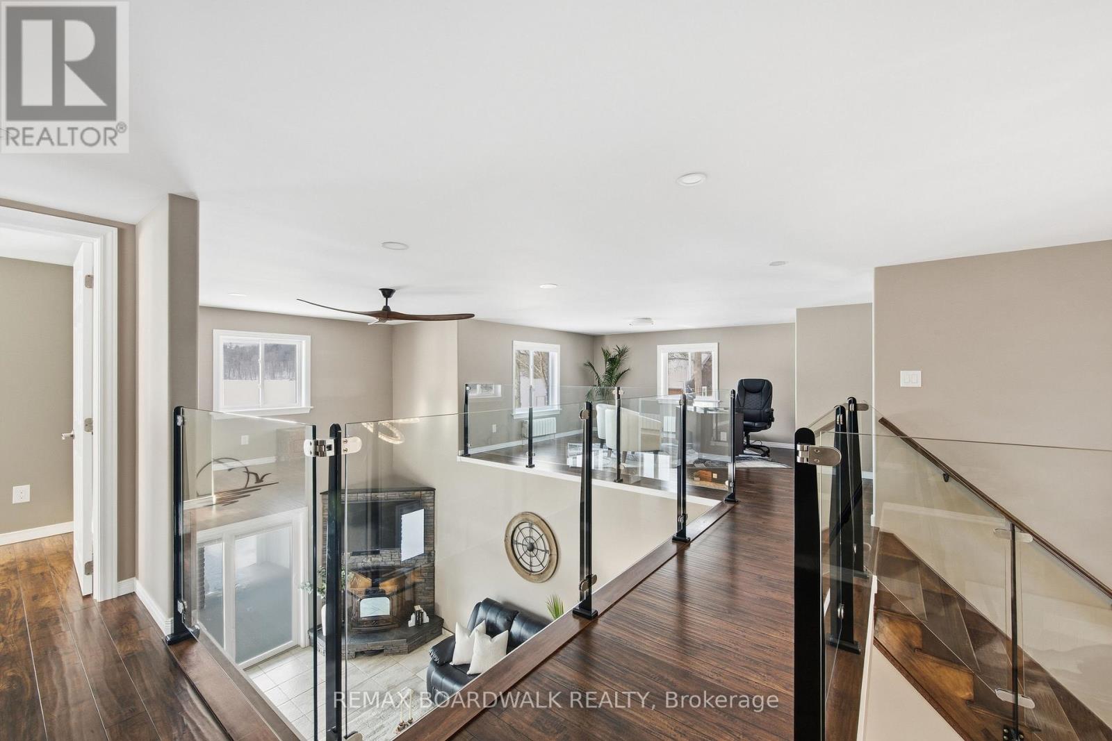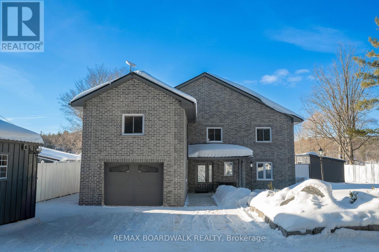 Welcome to this waterfront retreat on sought-after Graham Lake, where custom craftsmanship and luxury come together in perfect harmony. Built in 2018, this stunning full-brick residence with a steel roof has every detail carefully considered, with every finish selected for quality, comfort, and longevity. Step inside to an open-concept main floor highlighted by soaring two-story ceilings, engineered glass railings, and statement lighting that immediately sets the tone. The custom Hunt's kitchen is a showpiece, featuring hickory cabinetry, live-edge granite countertops with a life-proof seal, and premium finishes. The main-floor primary suite is a true sanctuary, offering a spa-inspired ensuite with a custom glass shower and soaker tub. Step directly outside to your hot tub, seamlessly connecting the indoors to your private outdoor area complete with your own personal sauna and relaxation room overlooking the lake, creating the ultimate space to unwind, recharge, and enjoy year-round wellness at home. Upstairs, you'll find three generous bedrooms, a three-piece bath, a bright den overlooking the main living space, and a versatile bonus room ideal for a home theatre, gym, or additional lounge. The home features radiant in-floor heating with individual room controls, an ICF foundation, premium insulation, on-demand hot water/boiler, a high-end water treatment system, and a fully automatic Generac generator. The heated garage offers hot & cold water, floor drains, and an automatic opener. Outdoors, enjoy pristine shoreline, a 24x10ft dock w/ swim platform & additional Seadoo dock. Thoughtfully designed exterior features include armor stone retaining wall and landscaping, a fire-pit area, power outlets for seasonal lighting, and expansive grounds perfect for entertaining or peaceful evenings by the water. This is more than a home-it's a lifestyle. A rare opportunity to own a waterfront property built to last, offering comfort, privacy, and unforgettable lakefront living. (id:64974)