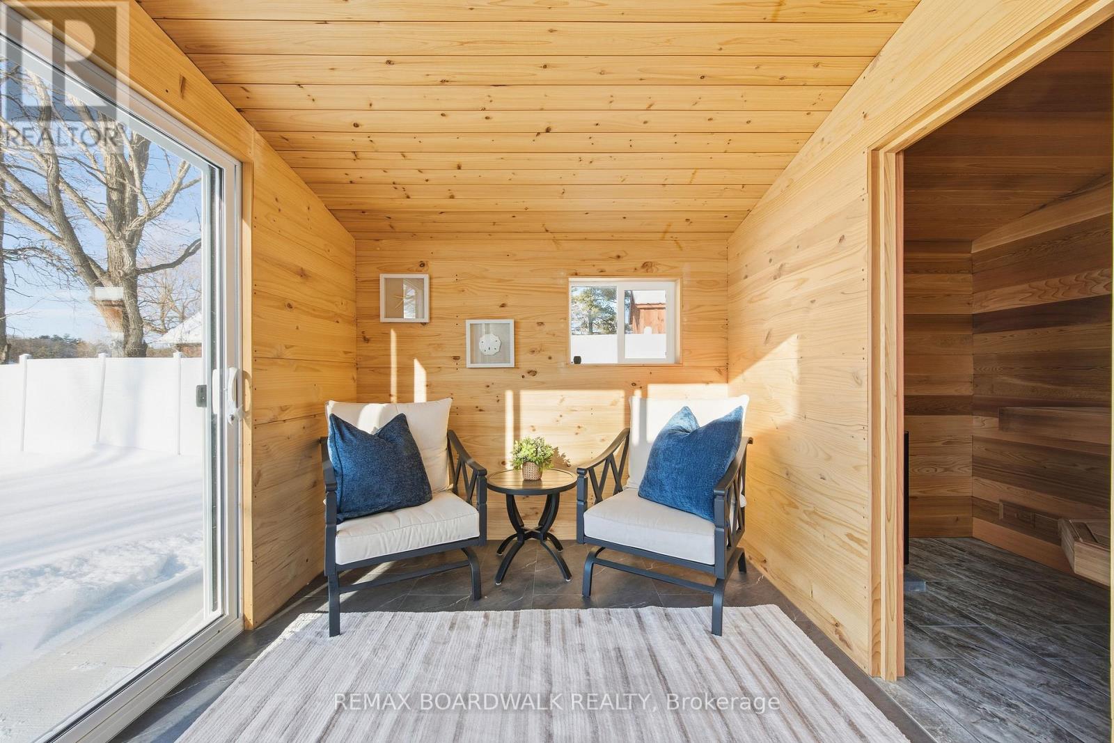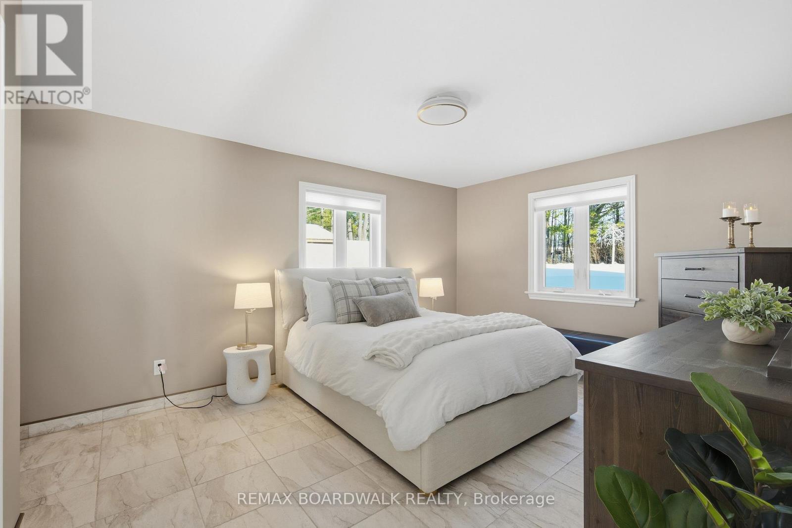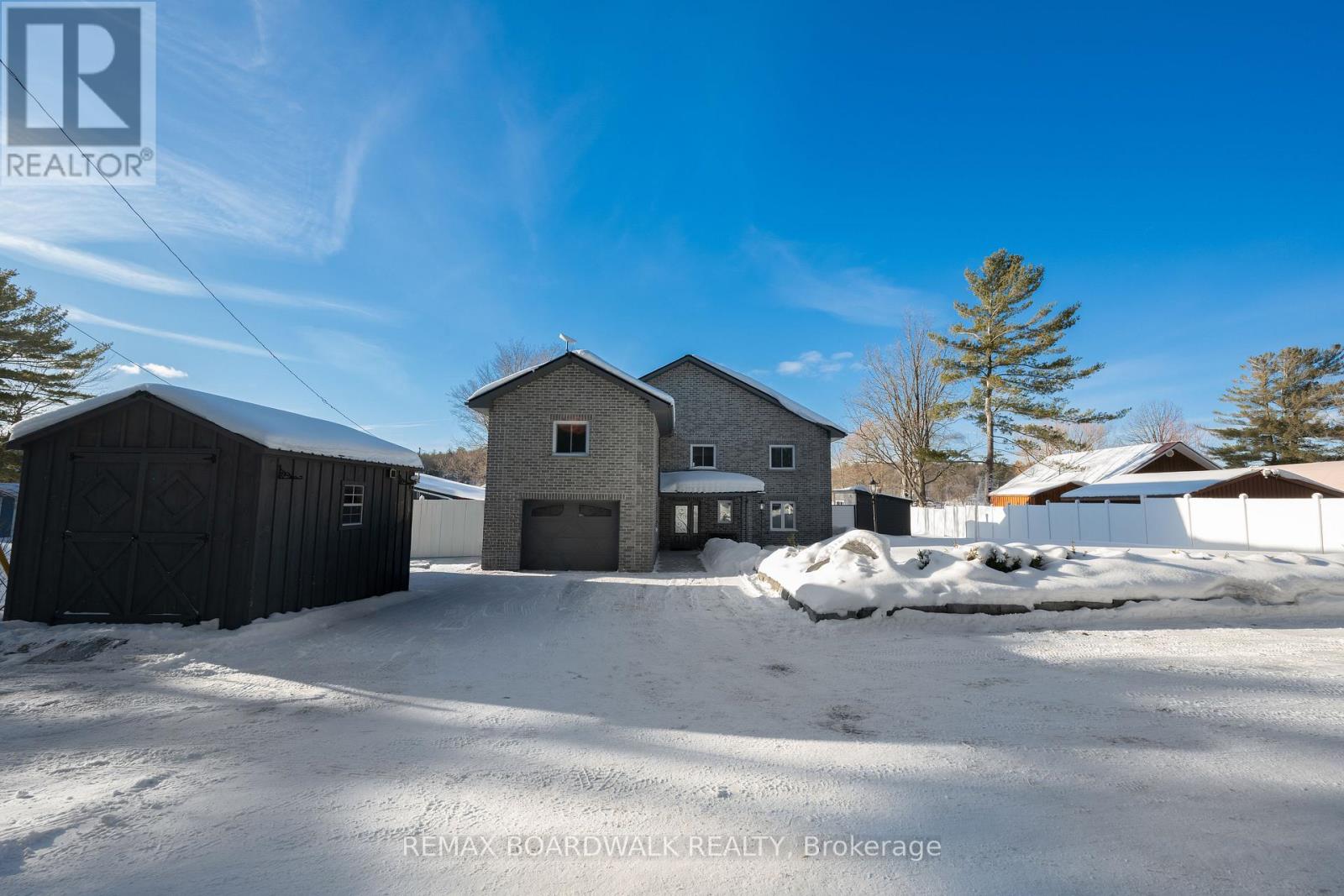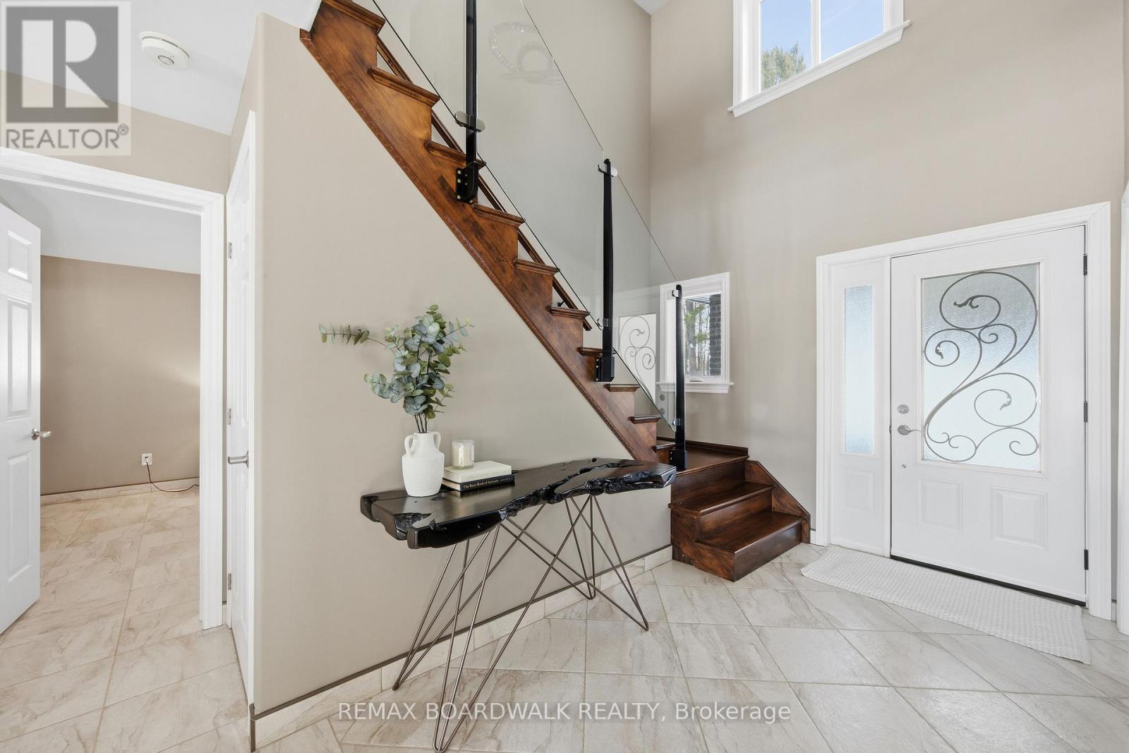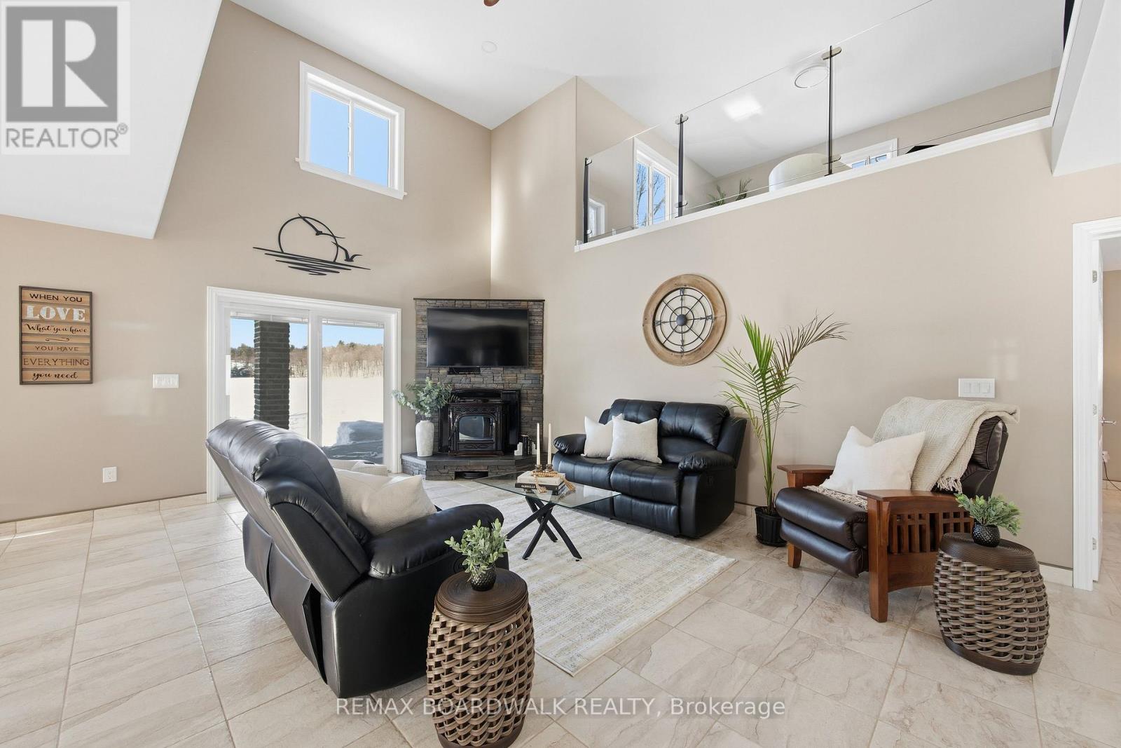 Welcome to this waterfront retreat on sought-after Graham Lake, where custom craftsmanship and luxury come together in perfect harmony. Built in 2018, this stunning full-brick residence with a steel roof has every detail carefully considered, with every finish selected for quality, comfort, and longevity. Step inside to an open-concept main floor highlighted by soaring two-story ceilings, engineered glass railings, and statement lighting that immediately sets the tone. The custom Hunt's kitchen is a showpiece, featuring hickory cabinetry, live-edge granite countertops with a life-proof seal, and premium finishes. The main-floor primary suite is a true sanctuary, offering a spa-inspired ensuite with a custom glass shower and soaker tub. Step directly outside to your hot tub, seamlessly connecting the indoors to your private outdoor area complete with your own personal sauna and relaxation room overlooking the lake, creating the ultimate space to unwind, recharge, and enjoy year-round wellness at home. Upstairs, you'll find three generous bedrooms, a three-piece bath, a bright den overlooking the main living space, and a versatile bonus room ideal for a home theatre, gym, or additional lounge. The home features radiant in-floor heating with individual room controls, an ICF foundation, premium insulation, on-demand hot water/boiler, a high-end water treatment system, and a fully automatic Generac generator. The heated garage offers hot & cold water, floor drains, and an automatic opener. Outdoors, enjoy pristine shoreline, a 24x10ft dock w/ swim platform & additional Seadoo dock. Thoughtfully designed exterior features include armor stone retaining wall and landscaping, a fire-pit area, power outlets for seasonal lighting, and expansive grounds perfect for entertaining or peaceful evenings by the water. This is more than a home-it's a lifestyle. A rare opportunity to own a waterfront property built to last, offering comfort, privacy, and unforgettable lakefront living. (id:64974)