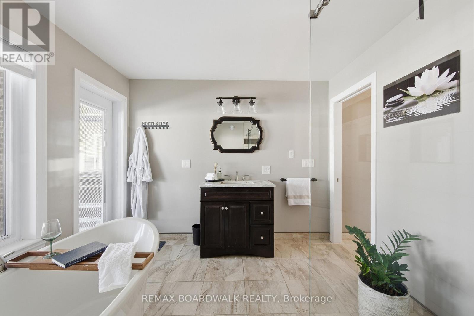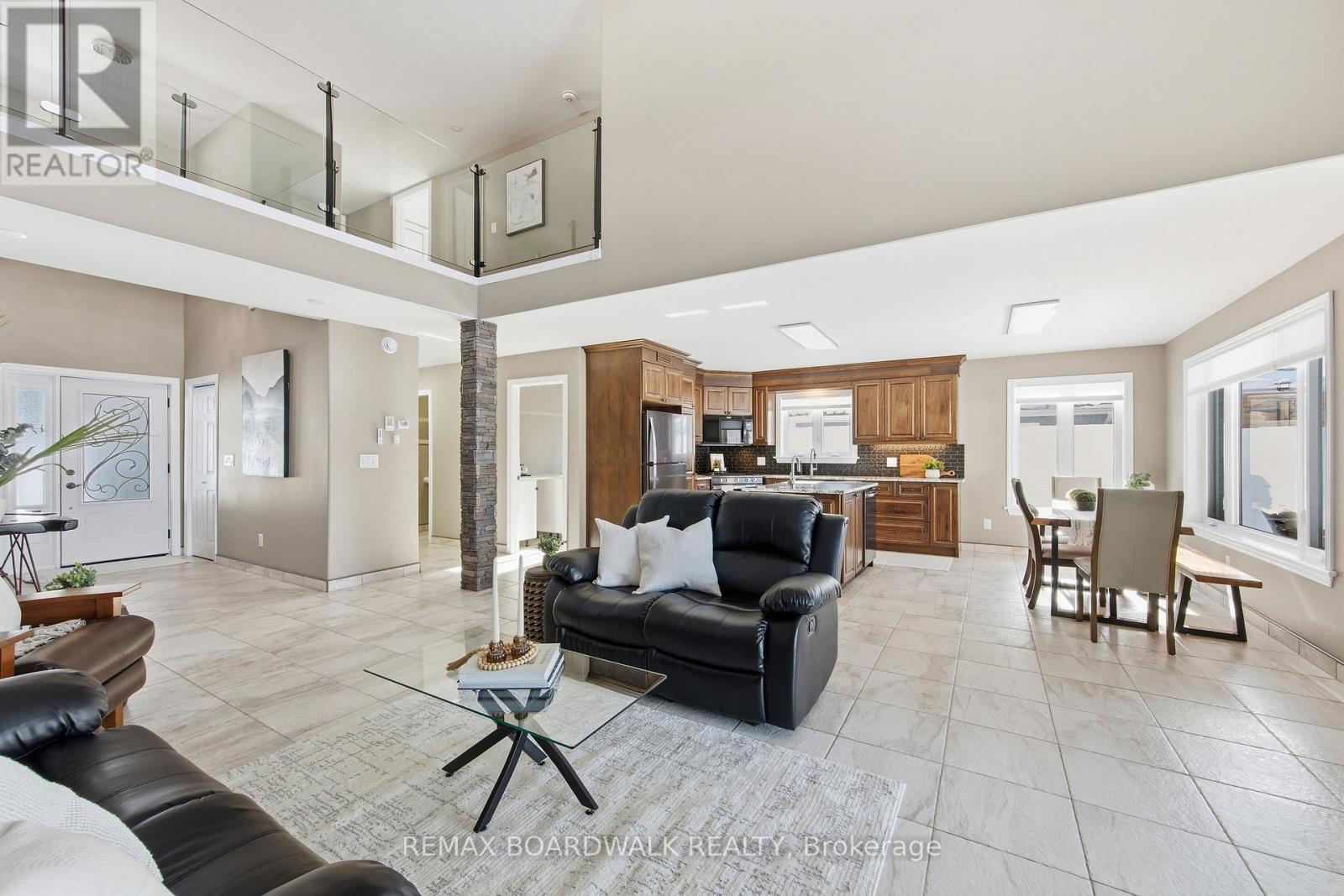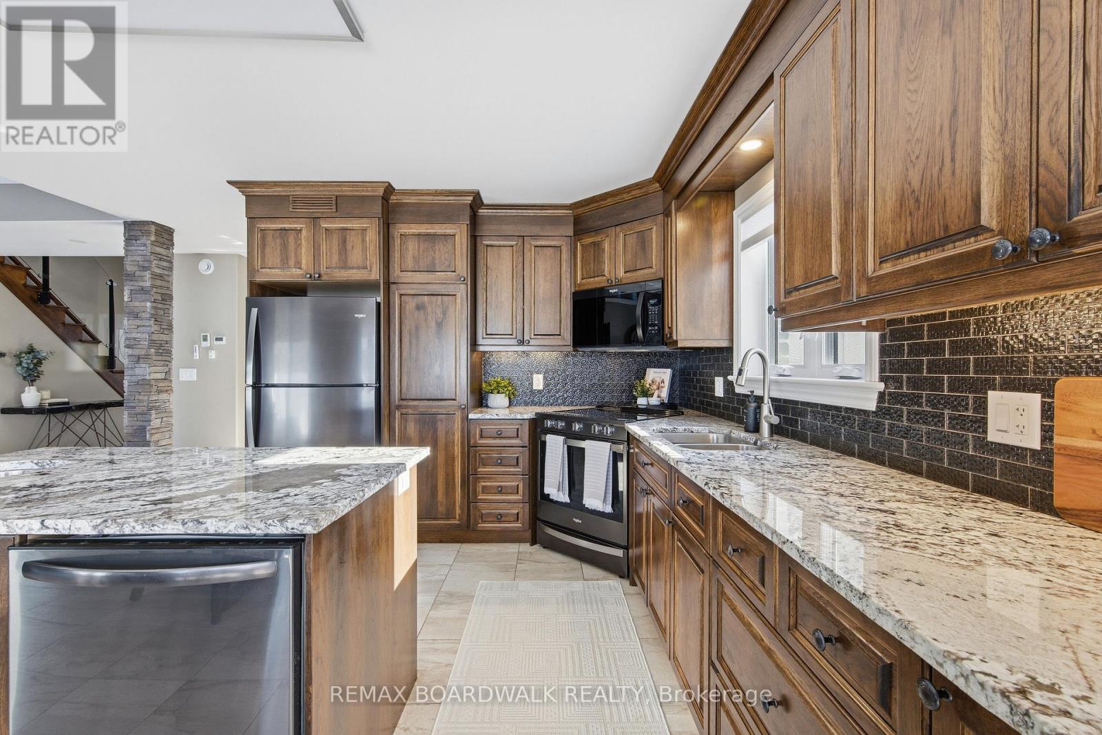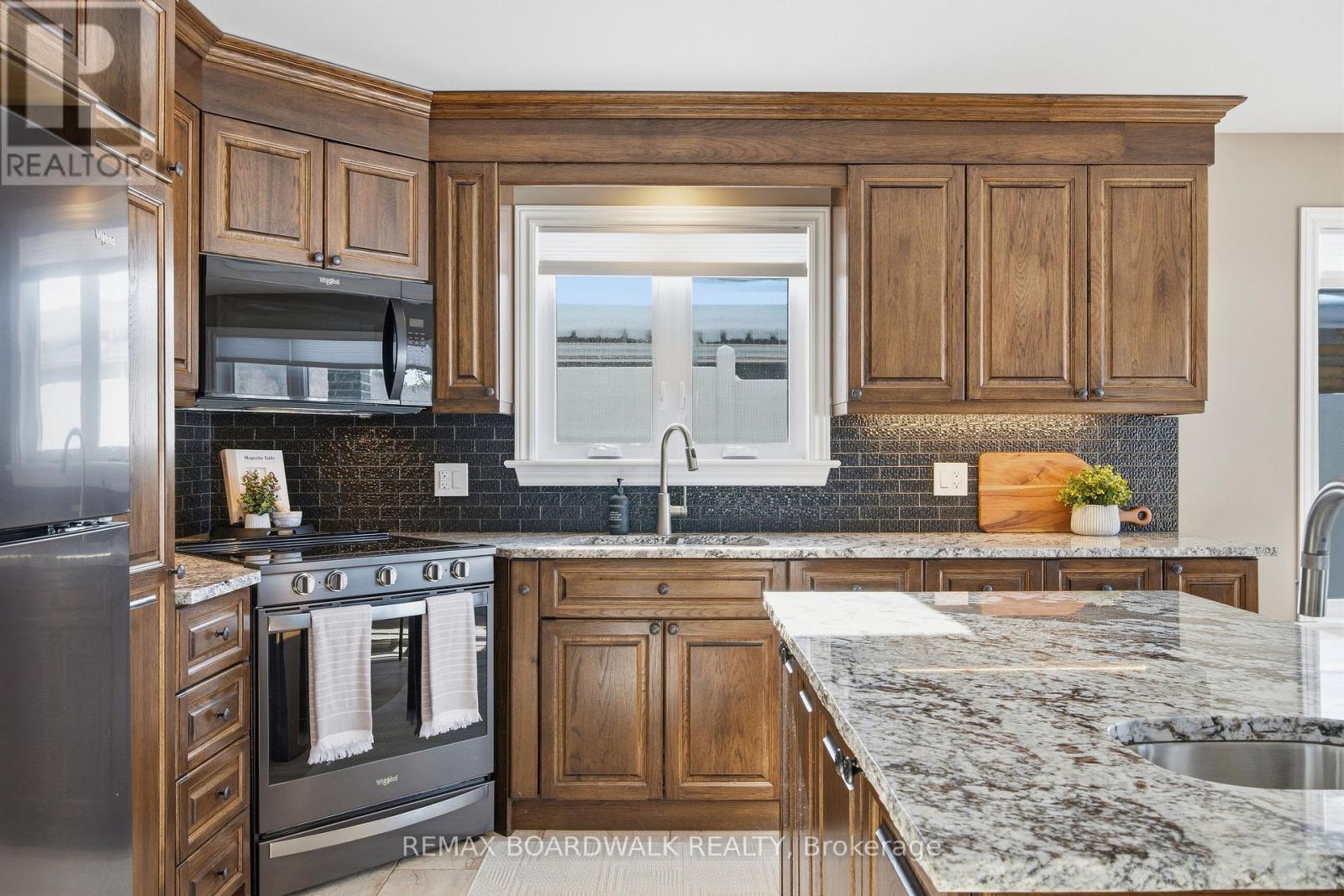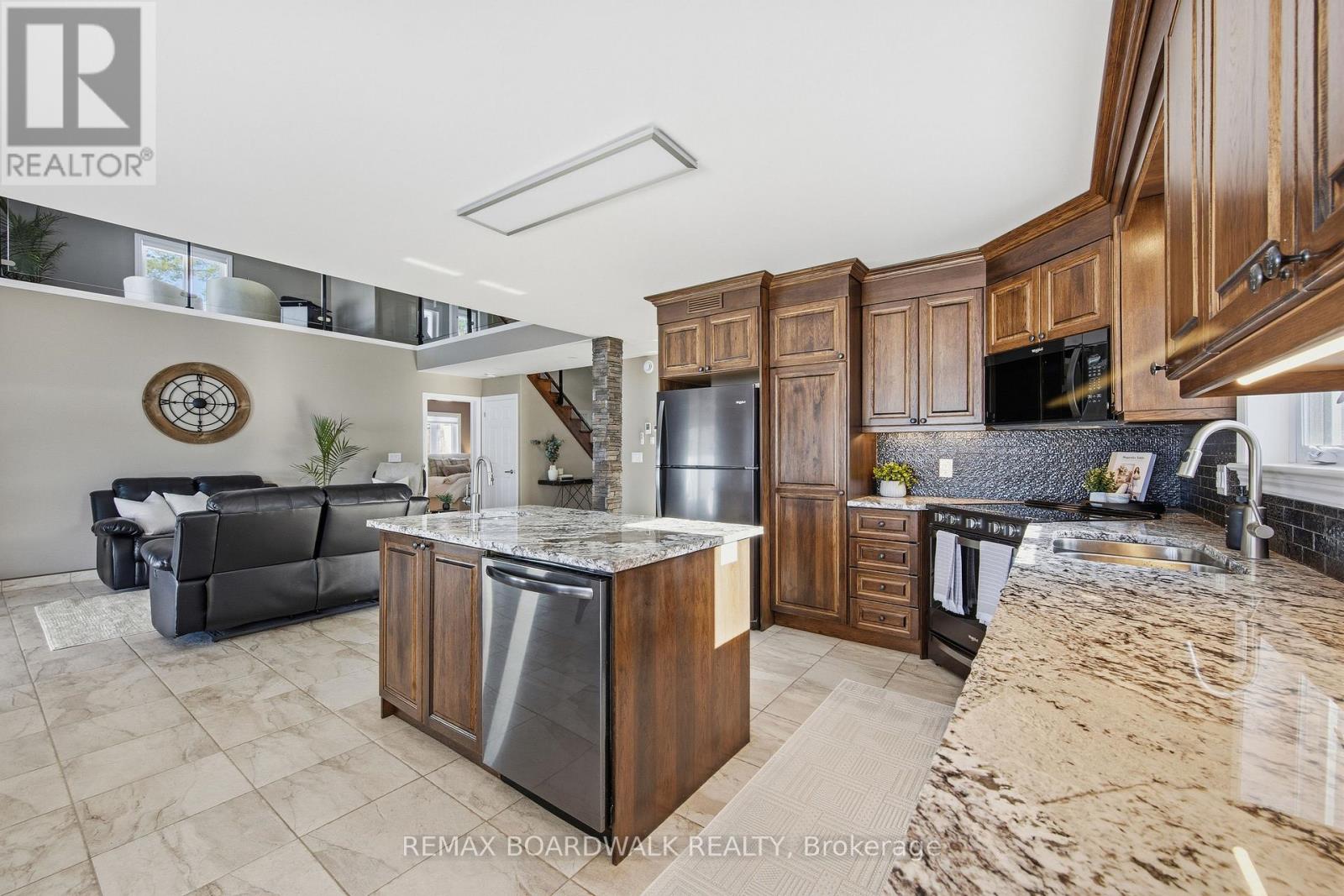 Welcome to this waterfront retreat on sought-after Graham Lake, where custom craftsmanship and luxury come together in perfect harmony. Built in 2018, this stunning full-brick residence with a steel roof has every detail carefully considered, with every finish selected for quality, comfort, and longevity. Step inside to an open-concept main floor highlighted by soaring two-story ceilings, engineered glass railings, and statement lighting that immediately sets the tone. The custom Hunt's kitchen is a showpiece, featuring hickory cabinetry, live-edge granite countertops with a life-proof seal, and premium finishes. The main-floor primary suite is a true sanctuary, offering a spa-inspired ensuite with a custom glass shower and soaker tub. Step directly outside to your hot tub, seamlessly connecting the indoors to your private outdoor area complete with your own personal sauna and relaxation room overlooking the lake, creating the ultimate space to unwind, recharge, and enjoy year-round wellness at home. Upstairs, you'll find three generous bedrooms, a three-piece bath, a bright den overlooking the main living space, and a versatile bonus room ideal for a home theatre, gym, or additional lounge. The home features radiant in-floor heating with individual room controls, an ICF foundation, premium insulation, on-demand hot water/boiler, a high-end water treatment system, and a fully automatic Generac generator. The heated garage offers hot & cold water, floor drains, and an automatic opener. Outdoors, enjoy pristine shoreline, a 24x10ft dock w/ swim platform & additional Seadoo dock. Thoughtfully designed exterior features include armor stone retaining wall and landscaping, a fire-pit area, power outlets for seasonal lighting, and expansive grounds perfect for entertaining or peaceful evenings by the water. This is more than a home-it's a lifestyle. A rare opportunity to own a waterfront property built to last, offering comfort, privacy, and unforgettable lakefront living. (id:64974)