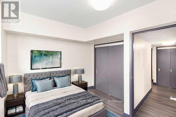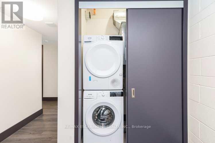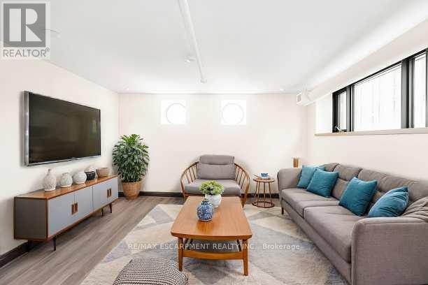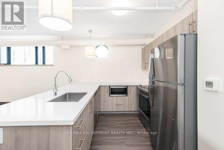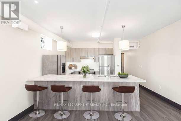 Downtown style at Gore Park lofts. Smack dab in the heart of Downtown Hamilton, this building brings together old-world charm and modern living. Great outdoor spaces surround you, with nearby parks, scenic bike trails and the lakeshore just a short jog away. Inside, the unit blends character with modern style. This spacious two-bedroom unit is carpet-free throughout! Enjoy the convenience of a gourmet kitchen with loads of counter space and a breakfast bar that flows into a large living space with tons of potential. A generous primary bedroom is complemented by a nicely sized second bedroom, room for all! There is a gleaming white four-piece bathroom with subway tiles, in-suite laundry and a storage locker perfect for all the things we tend to collect to round out this great apartment. Located in a vibrant neighborhood with shops, restaurants and entertainment, all within walking distance. Close to the GO station, HWY 403, McMaster University and Mohawk College. This home puts you in the middle of everything. Welcome home! RSA. (id:64974)