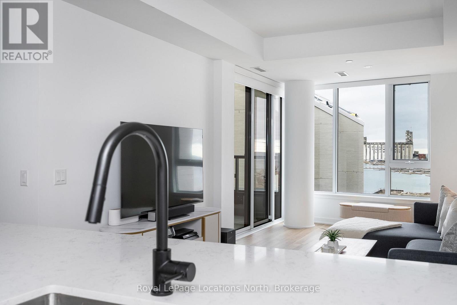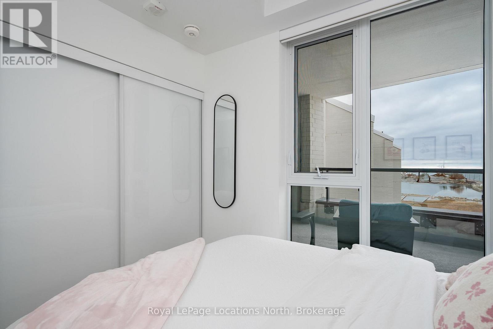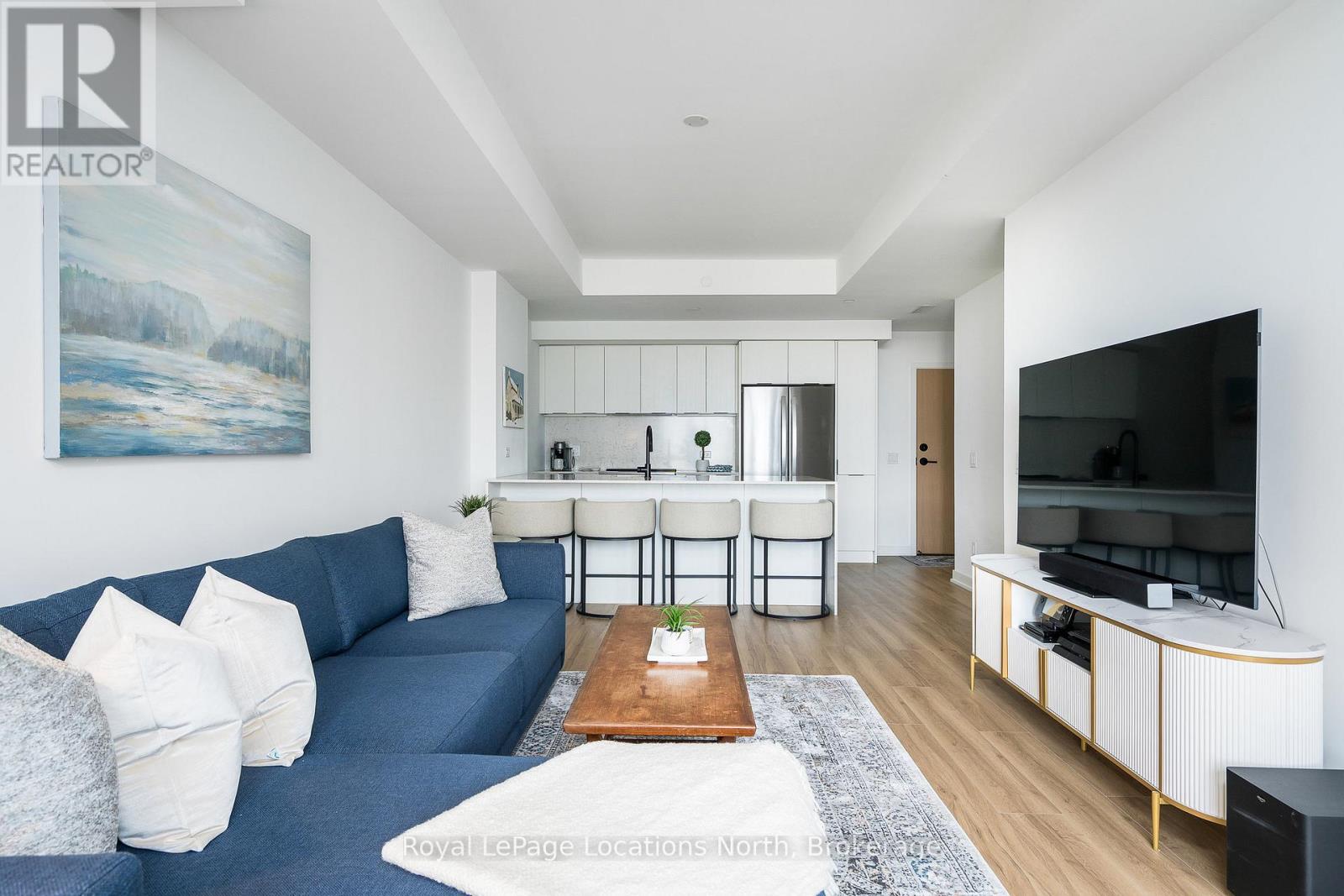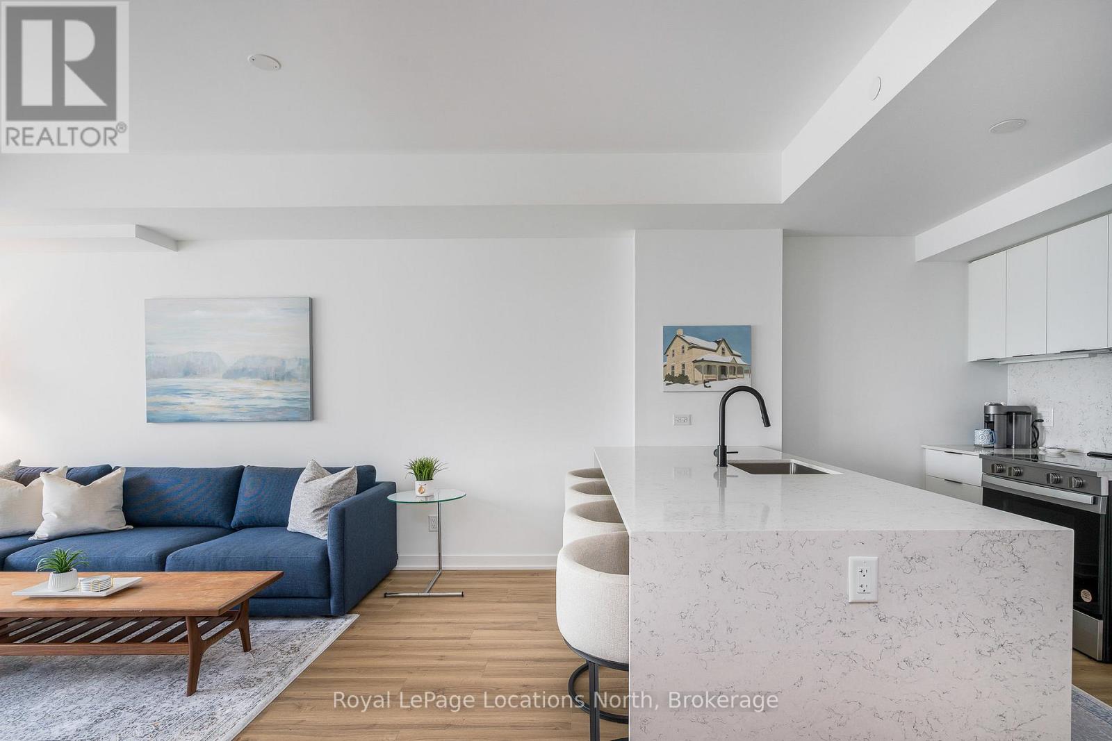 Welcome to Harbour House, Collingwood's premier new condominium address where contemporary design meets waterfront beauty. Perched on the 5th floor, this pretty suite offers stunning water views and a level of elegance that perfectly complements its coveted downtown location. Thoughtfully designed, this 2-bedroom, 2-bathroom condo features 910 sq. ft. of one-level living. The Scandinavian-inspired aesthetic is both serene and luxurious, with a modern open-concept layout that invites an effortless flow. Designer finishes and natural textures subtly echo the surrounding landscape, creating a warm atmosphere. The chef's kitchen offers a generous sit-up island with waterfall quartz counter and custom cabinetry with under-mount lighting, crafted for both beauty and function. The primary bedroom is a tranquil retreat with views of Georgian Bay. The private ensuite features a sleek glass walk-in shower. Extend the living space onto the 150 sq. ft. balcony where panoramic views of Georgian Bay and the Collingwood Terminals create a breathtaking backdrop for morning coffee or evening unwinding. This residence includes an exclusive underground parking spot and private storage locker. Harbour House's amenities elevate everyday living - enjoy a fully equipped fitness centre, dog & gear wash stations, guest suites for overnight company, secure fobbed entry and a rooftop party room & media lounge (to be completed) both with outdoor terraces overlooking Georgian Bay. All this within an architecturally stunning, nature-focused building. With shops, dining, and essentials just steps away, Harbour House offers a sophisticated lifestyle defined by comfort, convenience, and the timeless beauty of Georgian Bay. (id:64974)