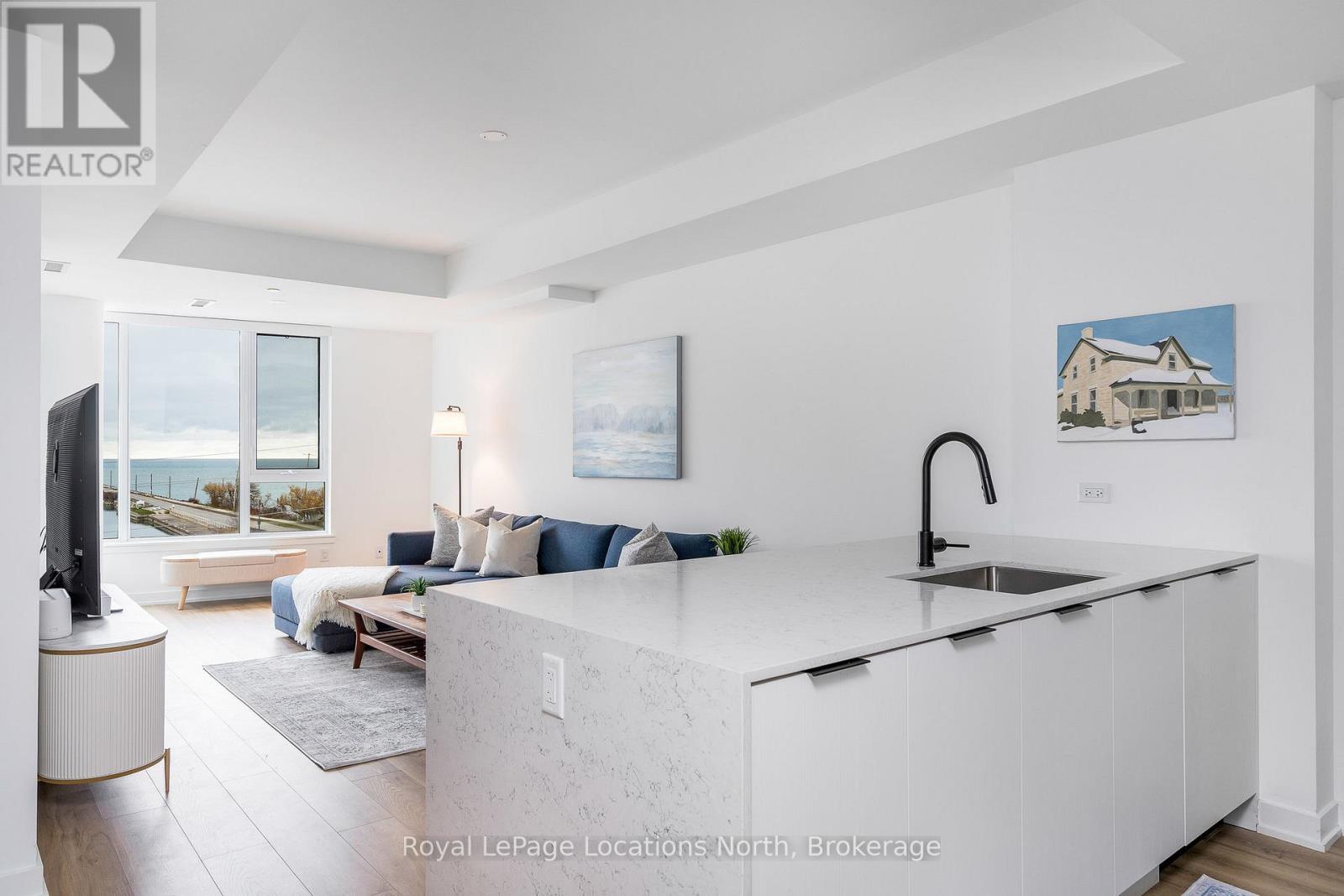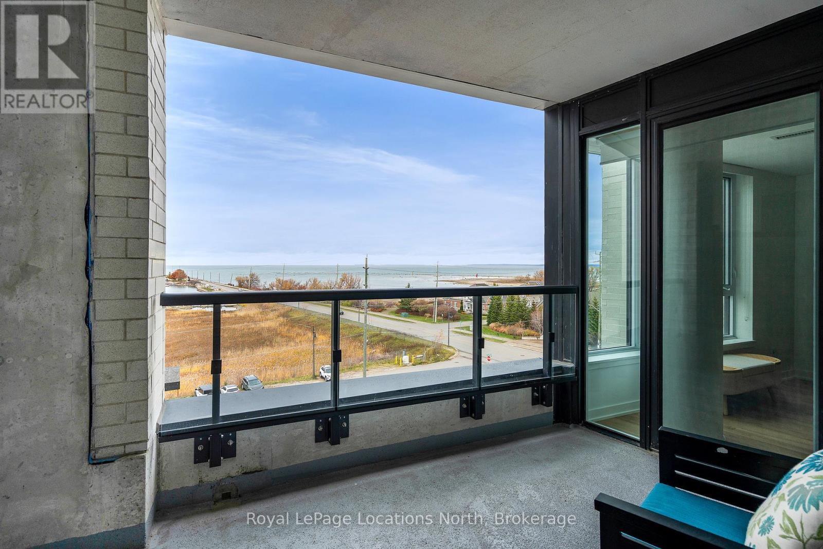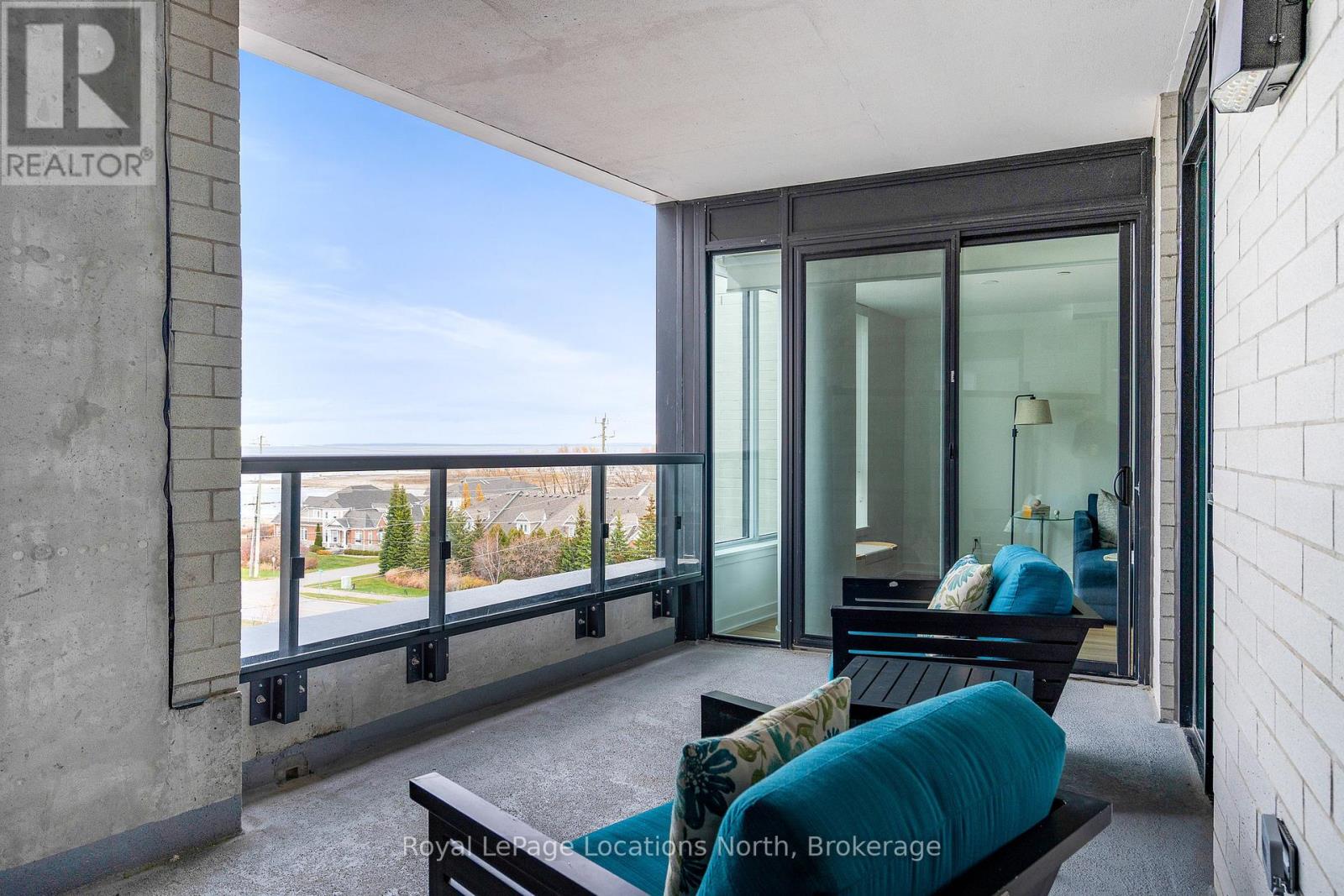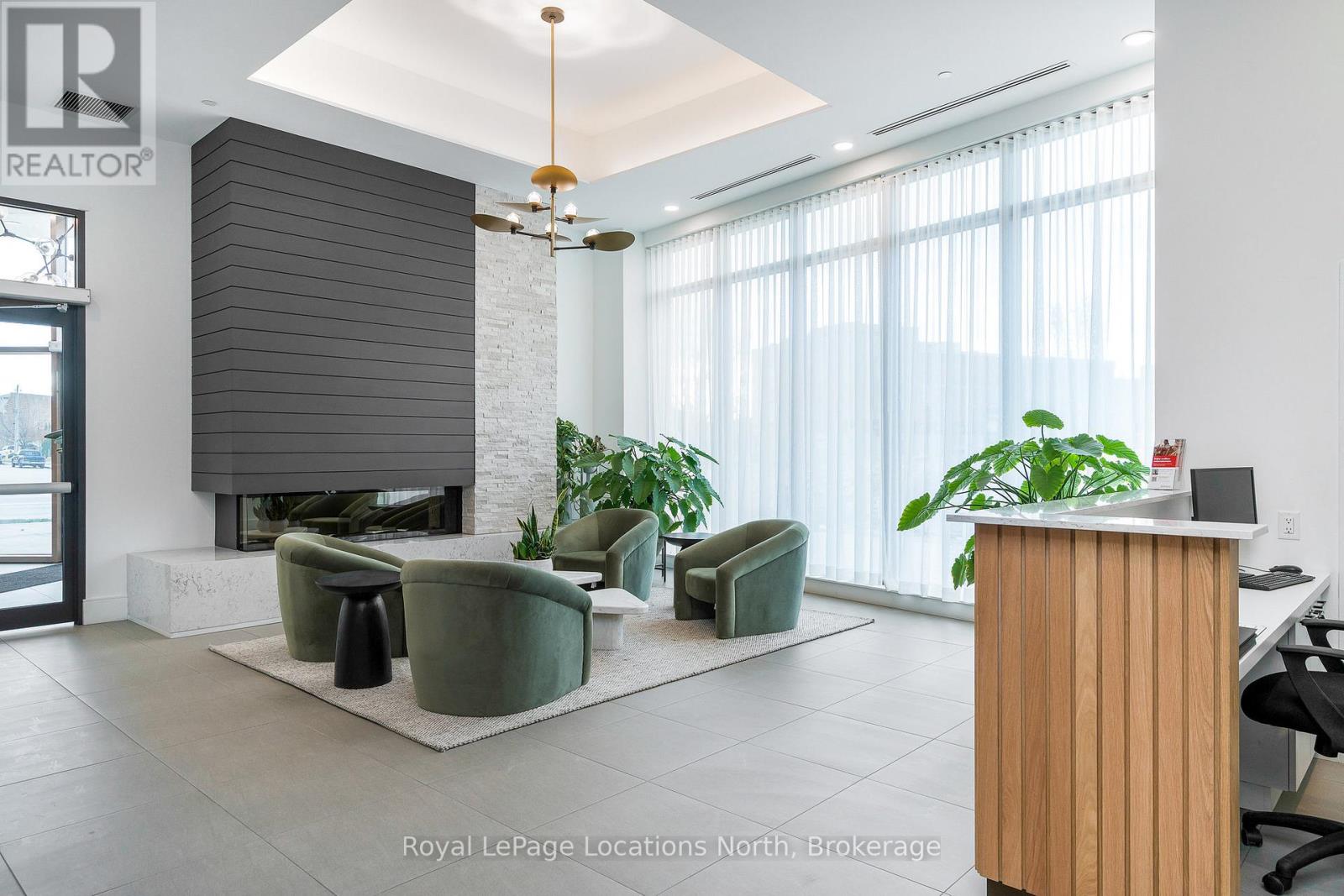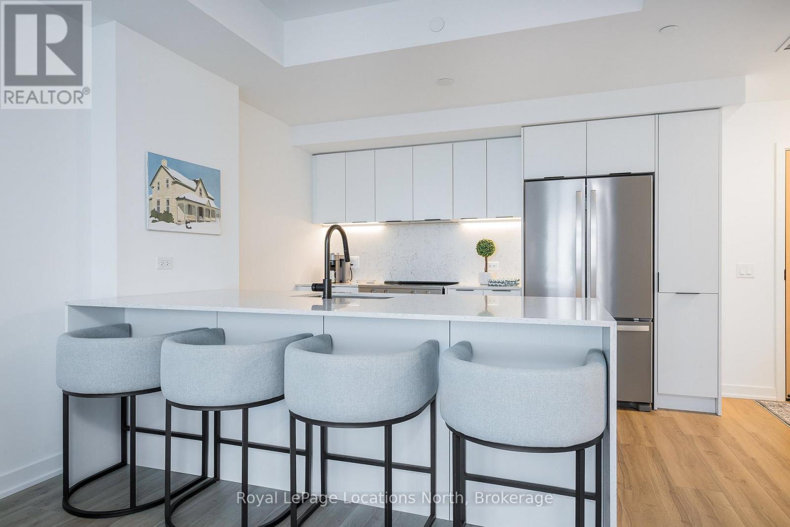 Welcome to Harbour House, Collingwood's premier new condominium address where contemporary design meets waterfront beauty. Perched on the 5th floor, this pretty suite offers stunning water views and a level of elegance that perfectly complements its coveted downtown location. Thoughtfully designed, this 2-bedroom, 2-bathroom condo features 910 sq. ft. of one-level living. The Scandinavian-inspired aesthetic is both serene and luxurious, with a modern open-concept layout that invites an effortless flow. Designer finishes and natural textures subtly echo the surrounding landscape, creating a warm atmosphere. The chef's kitchen offers a generous sit-up island with waterfall quartz counter and custom cabinetry with under-mount lighting, crafted for both beauty and function. The primary bedroom is a tranquil retreat with views of Georgian Bay. The private ensuite features a sleek glass walk-in shower. Extend the living space onto the 150 sq. ft. balcony where panoramic views of Georgian Bay and the Collingwood Terminals create a breathtaking backdrop for morning coffee or evening unwinding. This residence includes an exclusive underground parking spot and private storage locker. Harbour House's amenities elevate everyday living - enjoy a fully equipped fitness centre, dog & gear wash stations, guest suites for overnight company, secure fobbed entry and a rooftop party room & media lounge (to be completed) both with outdoor terraces overlooking Georgian Bay. All this within an architecturally stunning, nature-focused building. With shops, dining, and essentials just steps away, Harbour House offers a sophisticated lifestyle defined by comfort, convenience, and the timeless beauty of Georgian Bay. (id:64974)
