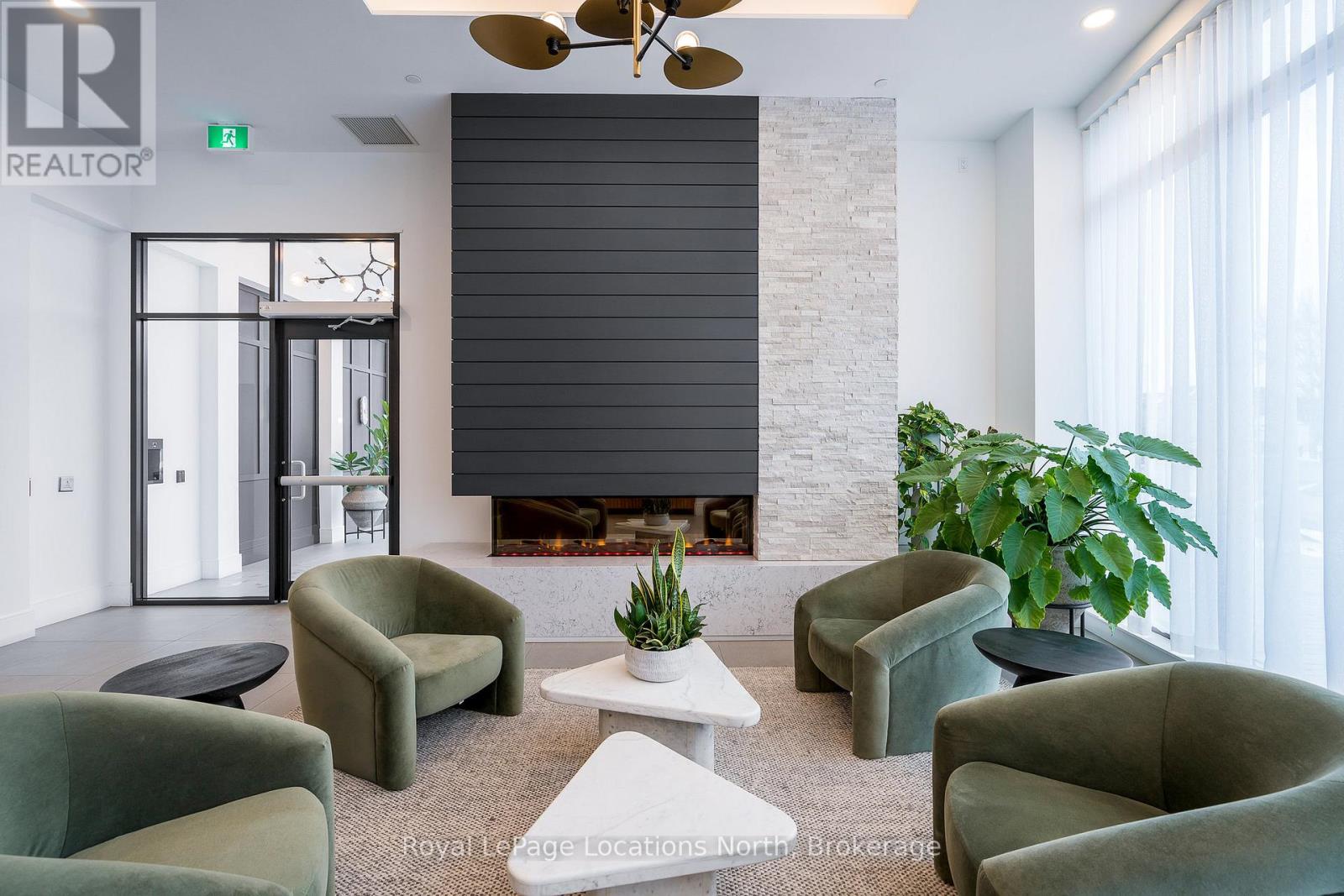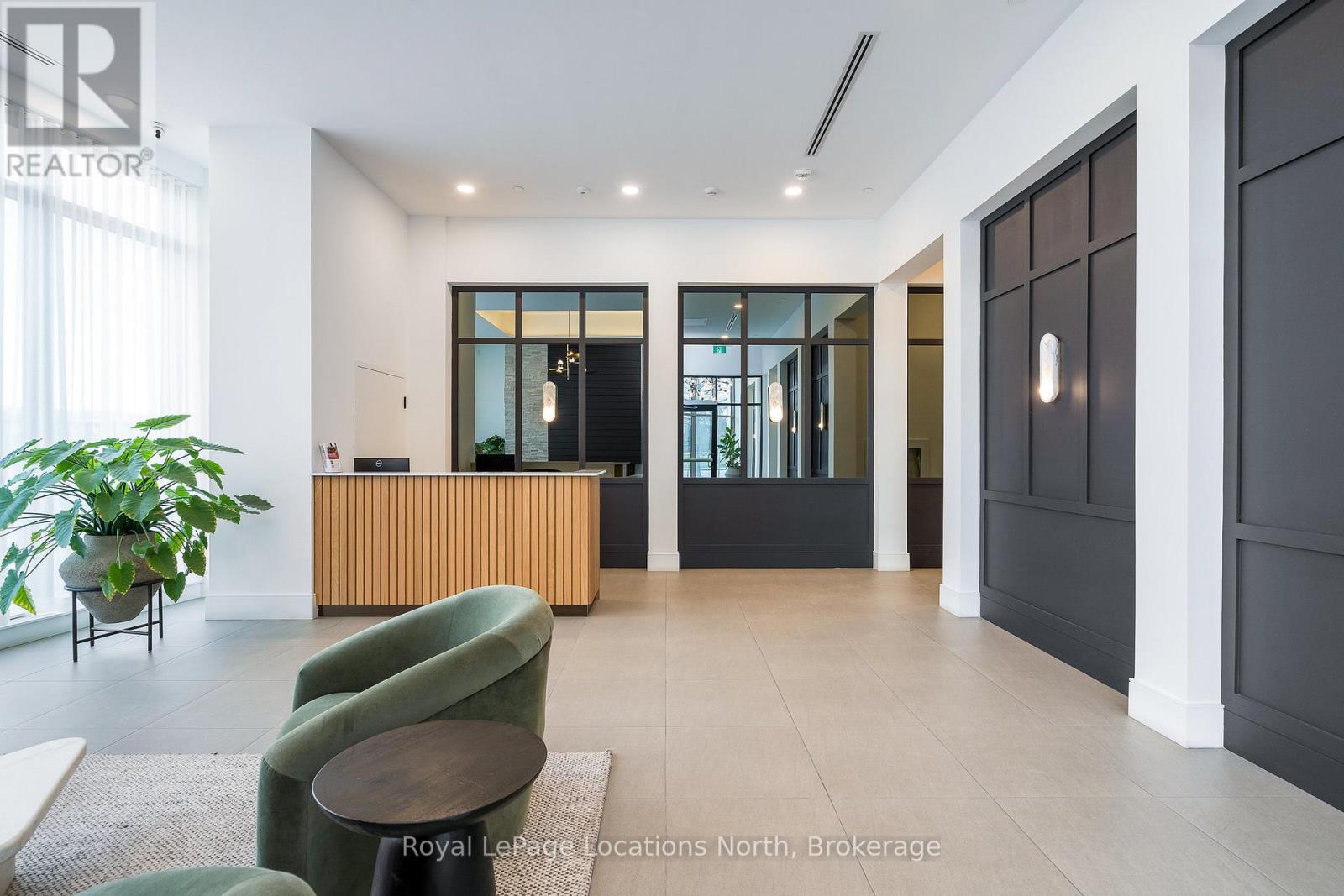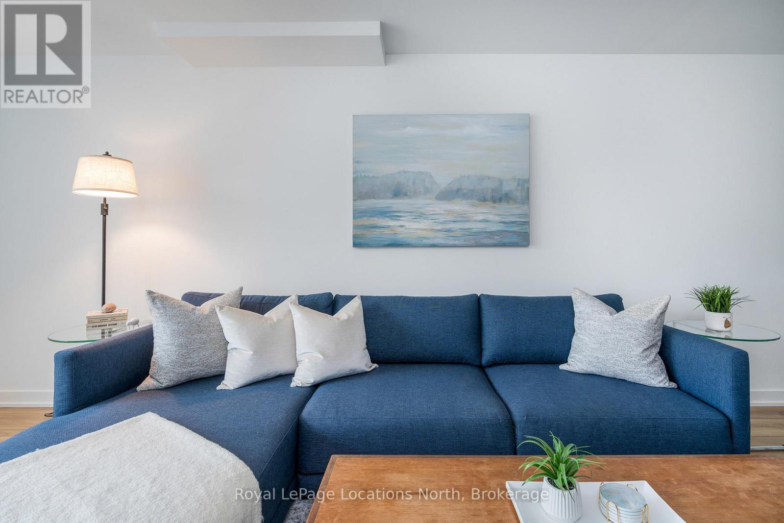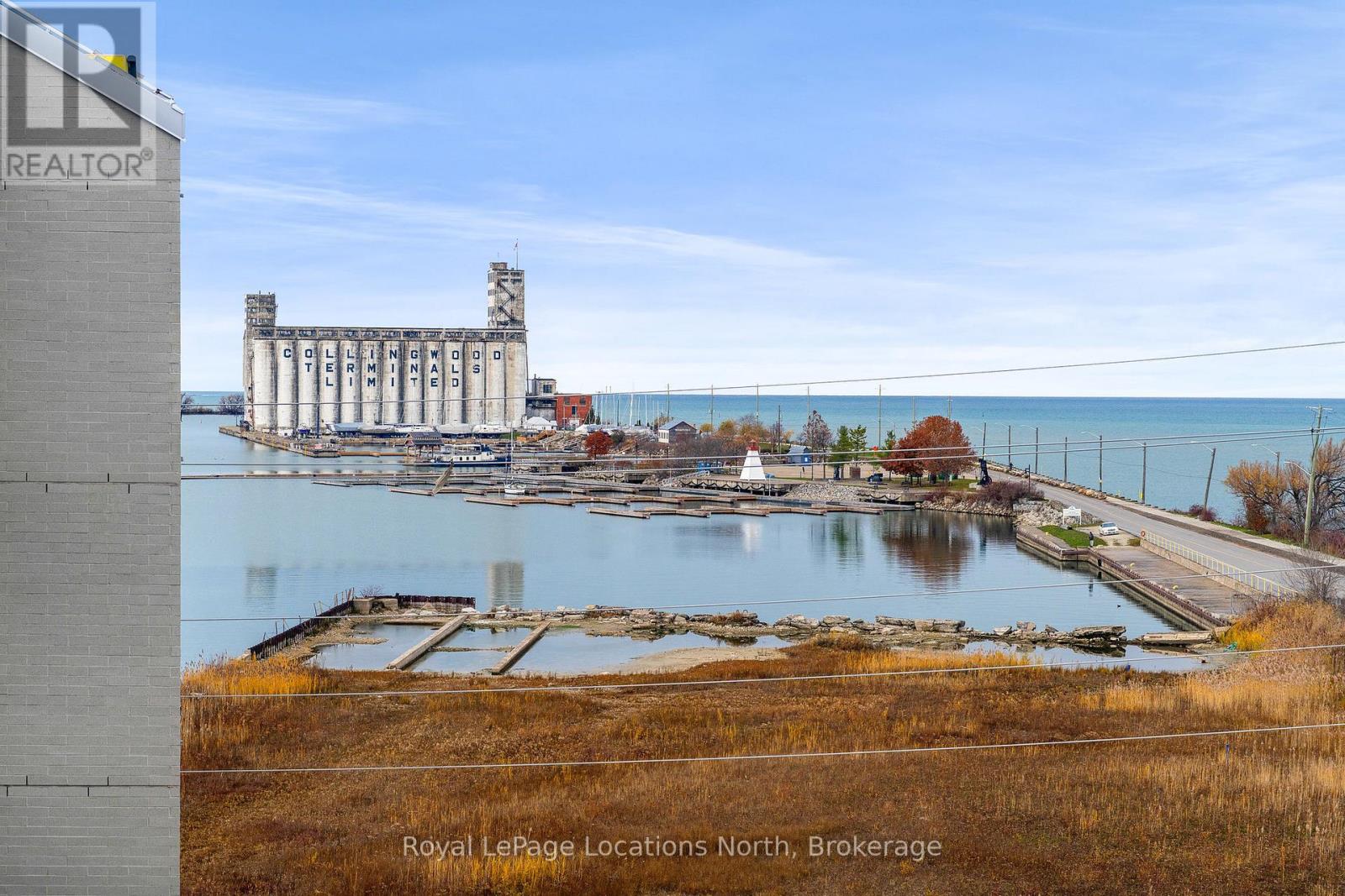 Welcome to Harbour House, Collingwood's premier new condominium address where contemporary design meets waterfront beauty. Perched on the 5th floor, this pretty suite offers stunning water views and a level of elegance that perfectly complements its coveted downtown location. Thoughtfully designed, this 2-bedroom, 2-bathroom condo features 910 sq. ft. of one-level living. The Scandinavian-inspired aesthetic is both serene and luxurious, with a modern open-concept layout that invites an effortless flow. Designer finishes and natural textures subtly echo the surrounding landscape, creating a warm atmosphere. The chef's kitchen offers a generous sit-up island with waterfall quartz counter and custom cabinetry with under-mount lighting, crafted for both beauty and function. The primary bedroom is a tranquil retreat with views of Georgian Bay. The private ensuite features a sleek glass walk-in shower. Extend the living space onto the 150 sq. ft. balcony where panoramic views of Georgian Bay and the Collingwood Terminals create a breathtaking backdrop for morning coffee or evening unwinding. This residence includes an exclusive underground parking spot and private storage locker. Harbour House's amenities elevate everyday living - enjoy a fully equipped fitness centre, dog & gear wash stations, guest suites for overnight company, secure fobbed entry and a rooftop party room & media lounge (to be completed) both with outdoor terraces overlooking Georgian Bay. All this within an architecturally stunning, nature-focused building. With shops, dining, and essentials just steps away, Harbour House offers a sophisticated lifestyle defined by comfort, convenience, and the timeless beauty of Georgian Bay. (id:64974)